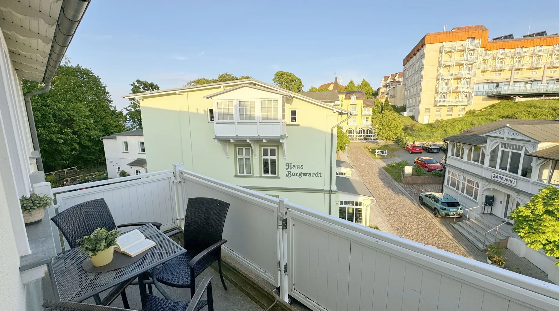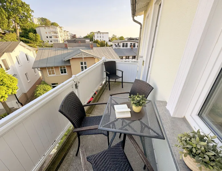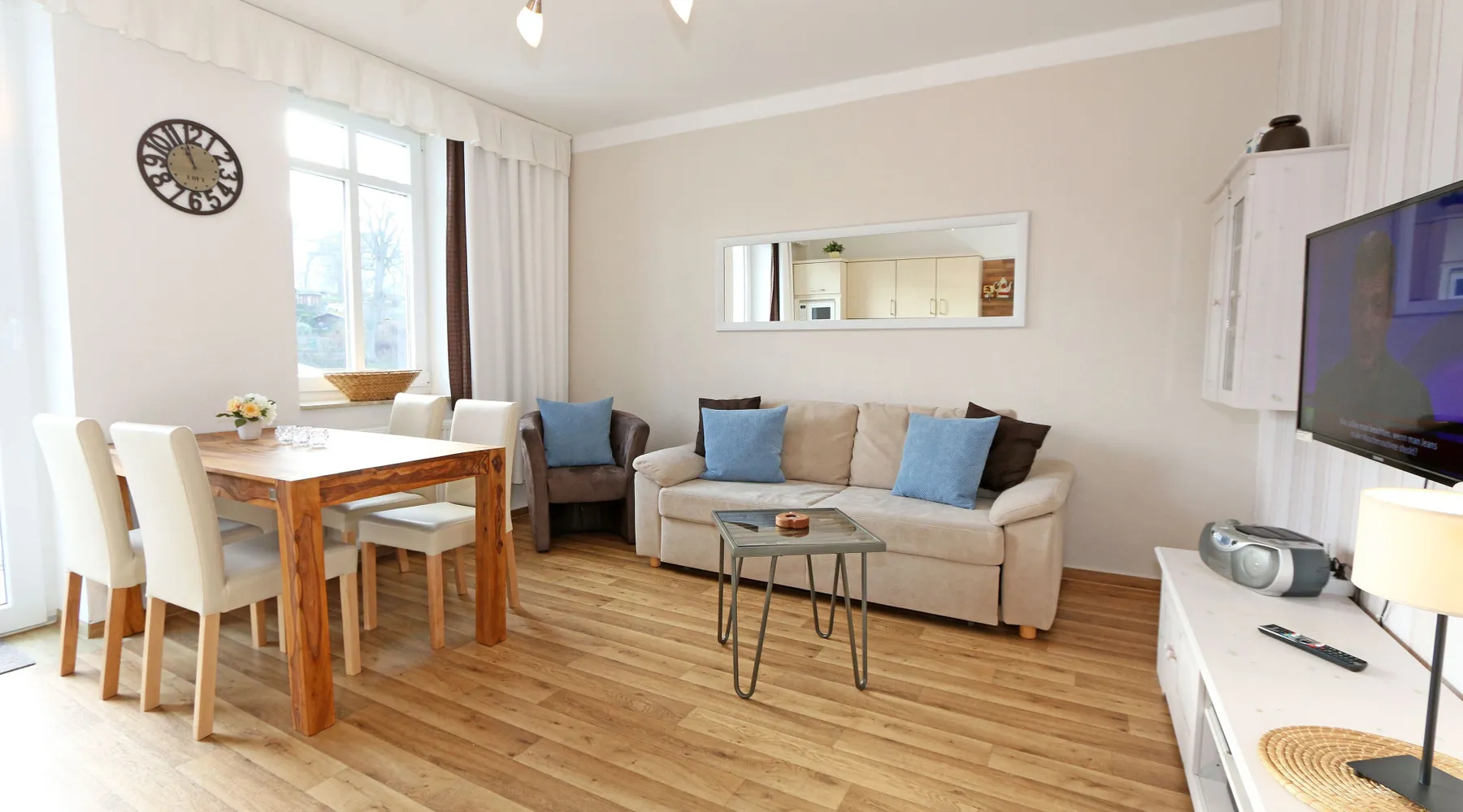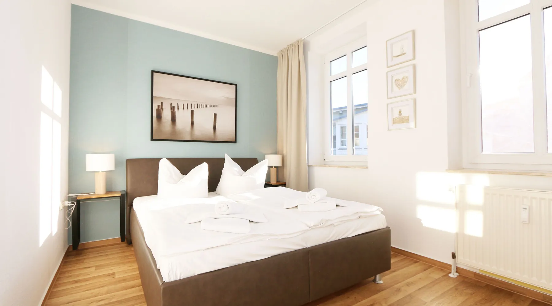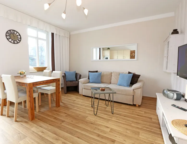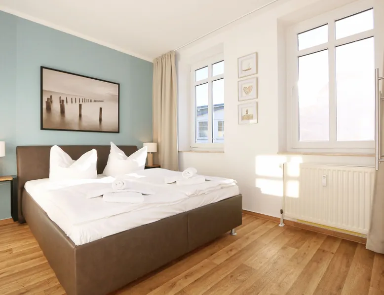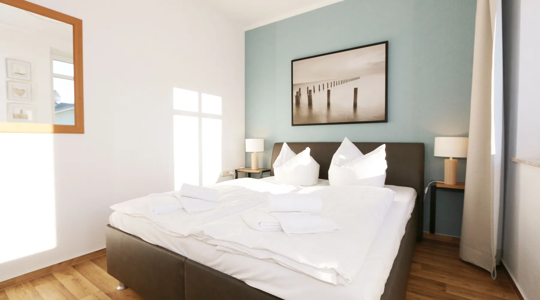 The apartment 09 house beach tent is a comfortable Non smoking apartment, which is. In the 2 Floor is. The 2-room apartment includes approximately 40m² so it has ample space for up to 4 people. It consists of a living area with a balcony, a bedroom, and finally the bathroom. The living area is lovingly and detailed furnished. In the light-filled room they find beside a chair and a coffee table, a comfortable sofa bed (1.40 mx 2.00 m), which is suitable as a bed for 2 persons. A flat-screen TV and a DVD player are allowing them to spend after an impressive day a cozy movie night with your loved ones. A radio with CD player and various readings for bookworms among them are to be found. On an Internet connection (WLAN), you need not do without. This is from March 2017 you included. The kitchenette in the selfsame room is equipped with a ceramic hob. It contains, in addition to an oven and a refrigerator with freezer, a dishwasher, a microwave, a kettle, a toaster, a coffee maker and various cooking utensils. Completing the living area by a table with four chairs and access to the balcony (south / east). This includes nearly 7 m² and was replanted in the fall 2016th Again, you will find a table with four chairs and a parasol. The balcony (south / east) is the side facing the sea and carry the trees at the end of the year no more leaves, so they have at least a wonderful view of the sea. The bedroom has a double bed (1,60 mx 2,00 m), fitted adjustable bed frames and a spacious wardrobe. Even a small mirror with a shelf is to be found. Like the living room, the bedroom is bright. However, if required, they can simply close the curtains and dark the room so completely. If they find that their clothing is wrinkled in the suitcase, they will find both a small ironing board and an iron in the bedroom. the room is rounded off by two bedside shelves, each with a lamp and decorative accents throughout the room. The bathroom consists of a shower, a wash basin, a toilet, a lighted mirror and a shelf. Even a hair dryer is available. Of course, is also thought to the little ones so that you will enjoy various toys, board games and children's books. In addition, you can find in the living area a bicycle helmet. A free and secure with a barrier parking space for your car is right at home. Pets are not allowed. The initial equipment of a linen package (complete bed linen, 1 towel, 2 small towels) you can book up to 14 days before arrival for 15.00 € per person or supplement by own. For packages booked for 2 or more you will receive 1 dish towel and 1 shower mat once. The well maintained villa "beach shelter" is located in a prime location of the seaside resort Göhren, just 100 meters from the beach. The Villa with 9 apartments is centrally located, yet in a quiet side street (Wilhelmstrasse). The apartment 09 is located in. 2 Upstairs. You will find a comfortable light-filled 2-room apartment, in the relaxing and can spend relaxing days. The apartment has a balcony where you can have breakfast undisturbed. The Göhren offers two fabulous beaches, numerous cafes and restaurants, shopping, cycling and walking paths.