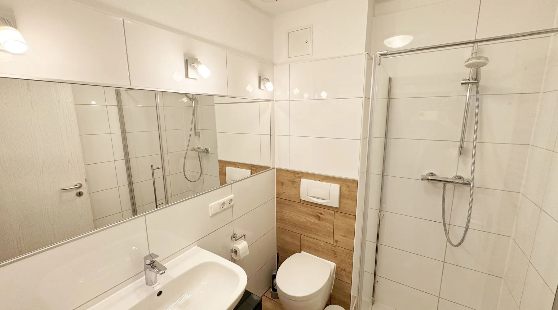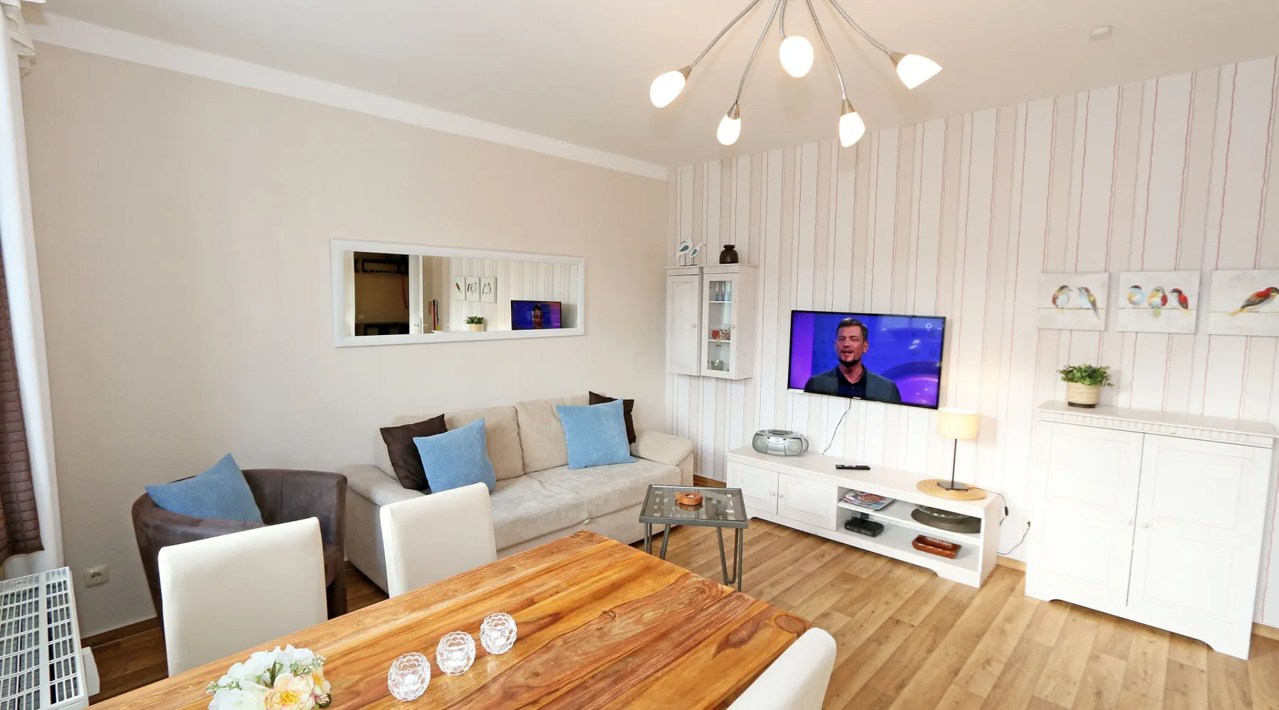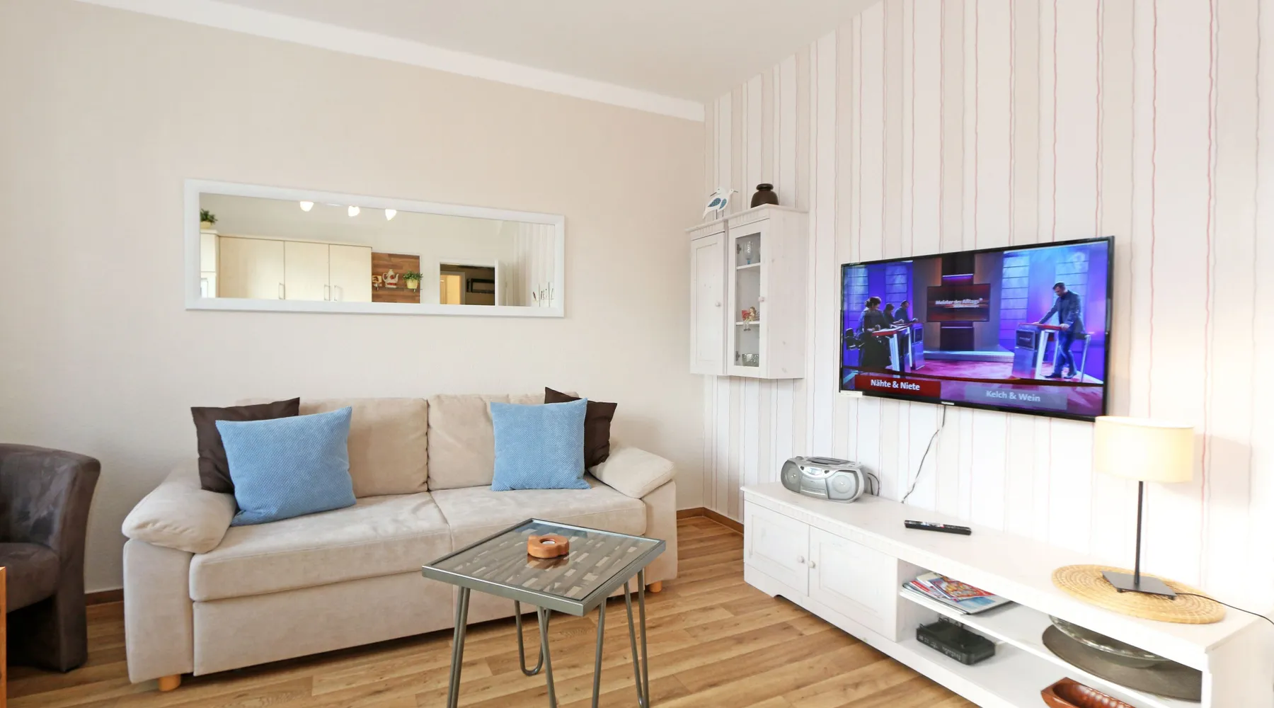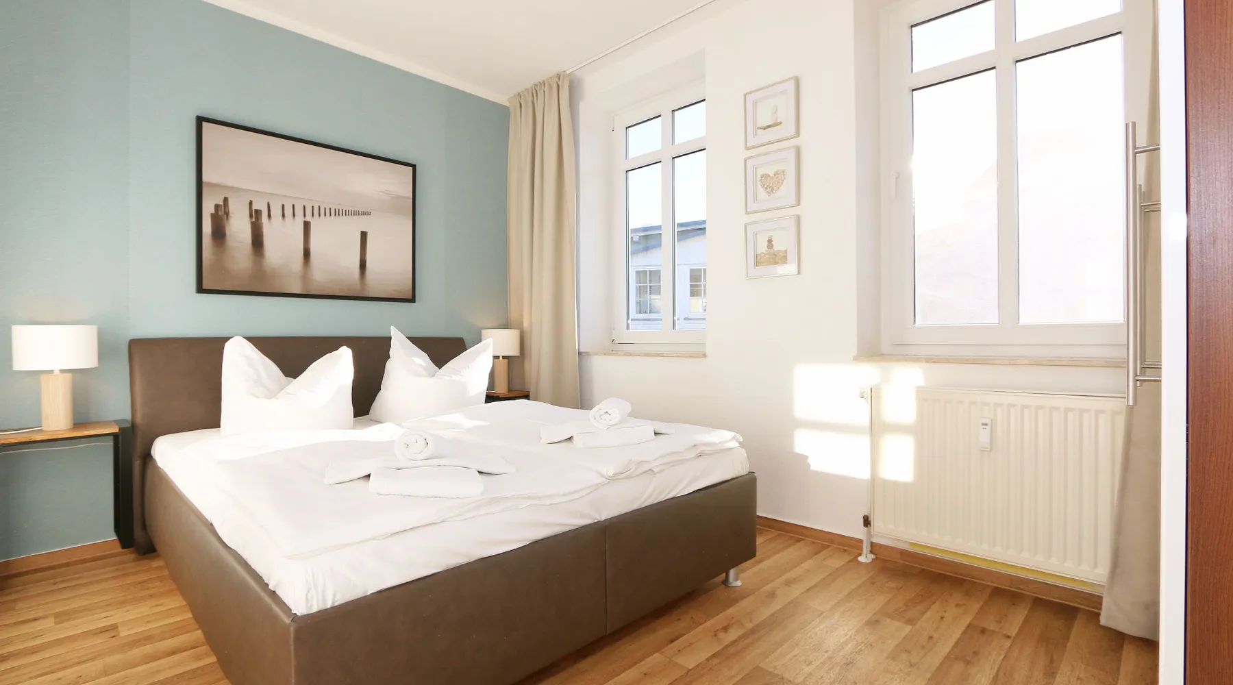 The apartment 09 house beach tent is a comfortable Non smoking apartment, which is. In the 2 Floor is. The 2-room apartment includes approximately 40m² so it has ample space for up to 4 people. It consists of a living area with a balcony, a bedroom, and finally the bathroom. The living area is lovingly and detailed furnished. In the light-filled room they find beside a chair and a coffee table, a comfortable sofa bed (1.40 mx 2.00 m), which is suitable as a bed for 2 persons. A flat-screen TV and a DVD player are allowing them to spend after an impressive day a cozy movie night with your loved ones. A radio with CD player and various readings for bookworms among them are to be found. On an Internet connection (WLAN), you need not do without. This is from March 2017 you included. The kitchenette in the selfsame room is equipped with a ceramic hob. It contains, in addition to an oven and a refrigerator with freezer, a dishwasher, a microwave, a kettle, a toaster, a coffee maker and various cooking utensils. Completing the living area by a table with four chairs and access to the balcony (south / east). This includes nearly 7 m² and was replanted in the fall 2016th Again, you will find a table with four chairs and a parasol. The balcony (south / east) is the side facing the sea and carry the trees at the end of the year no more leaves, so they have at least a wonderful view of the sea. The bedroom has a double bed (1,60 mx 2,00 m), fitted adjustable bed frames and a spacious wardrobe. Even a small mirror with a shelf is to be found. Like the living room, the bedroom is bright. However, if required, they can simply close the curtains and dark the room so completely. If they find that their clothing is wrinkled in the suitcase, they will find both a small ironing board and an iron in the bedroom. the room is rounded off by two bedside shelves, each with a lamp and decorative accents throughout the room. The bathroom consists of a shower, a wash basin, a toilet, a lighted mirror and a shelf. Even a hair dryer is available. Of course, is also thought to the little ones so that you will enjoy various toys, board games and children's books. In addition, you can find in the living area a bicycle helmet. A free and secure with a barrier parking space for your car is right at home. Pets are not allowed. The initial equipment of a linen package (complete bed linen, 1 towel, 2 small towels) you can book up to 14 days before arrival for 15.00 € per person or supplement by own. For packages booked for 2 or more you will receive 1 dish towel and 1 shower mat once. The well maintained villa "beach shelter" is located in a prime location of the seaside resort Göhren, just 100 meters from the beach. The Villa with 9 apartments is centrally located, yet in a quiet side street (Wilhelmstrasse). The apartment 09 is located in. 2 Upstairs. You will find a comfortable light-filled 2-room apartment, in the relaxing and can spend relaxing days. The apartment has a balcony where you can have breakfast undisturbed. The Göhren offers two fabulous beaches, numerous cafes and restaurants, shopping, cycling and walking paths.