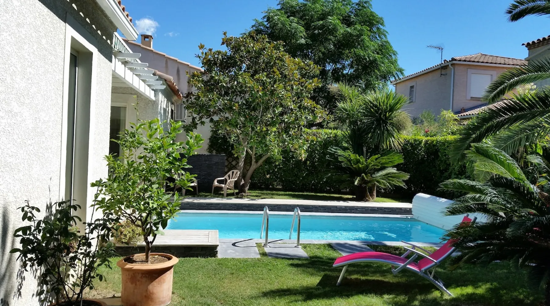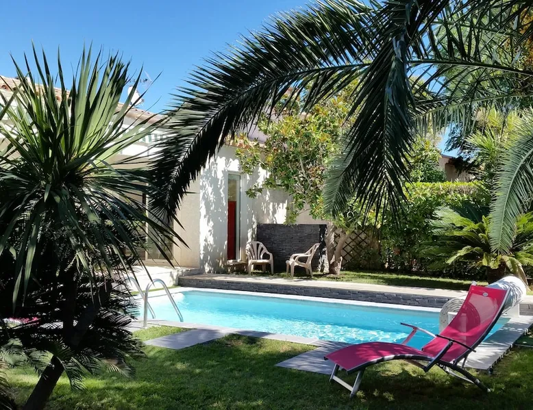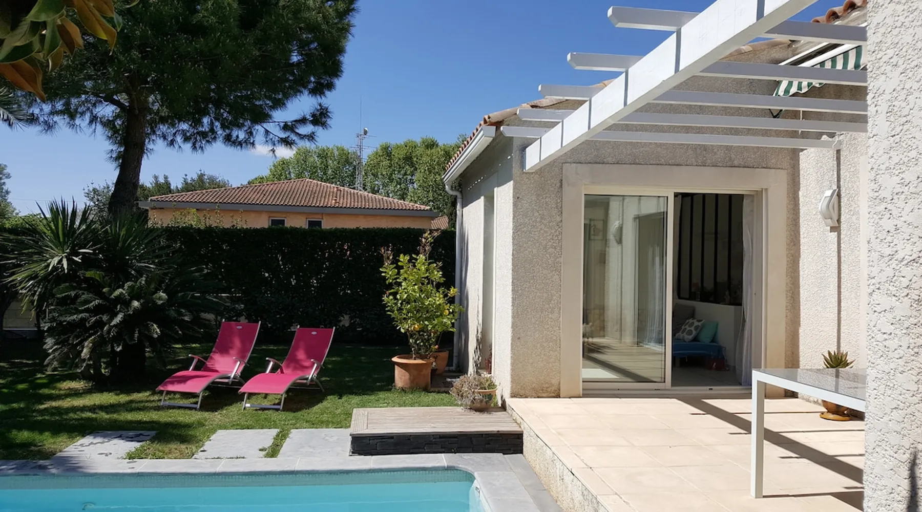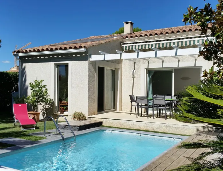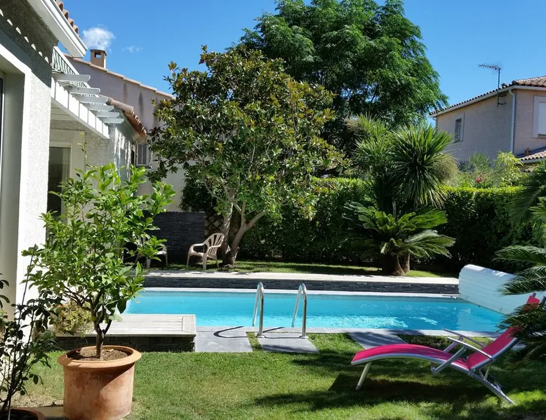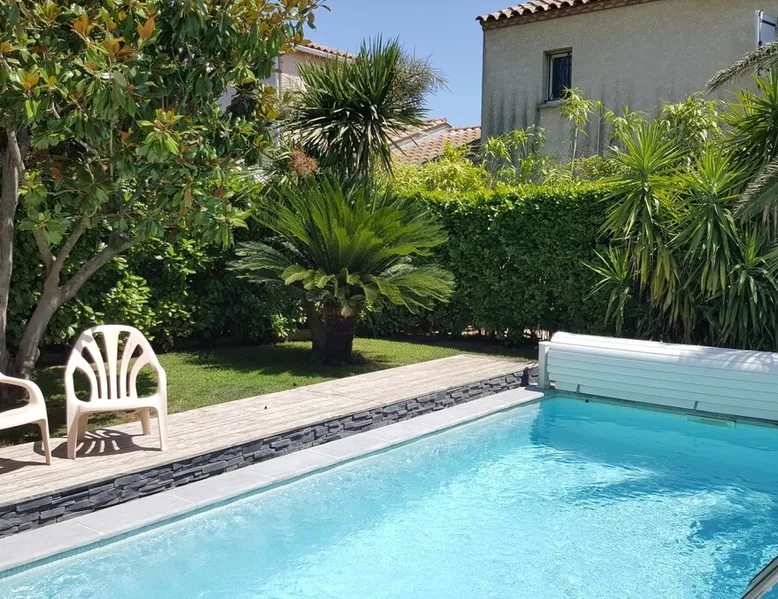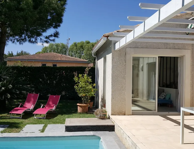 Very beautiful air-conditioned villa on one level with swimming pool, facing south, located in the heart of the village of Lattes in a secure residential area of the city center halfway between the sea and Montpellier close to the tram and all shops Ideal for 4 people - Possibility for 6 people (living room with sleeping area and 2 children's beds) The space Ideally located half way between Palavas and Montpellier (7 min drive) In the center of the village, in a small private subdivision of 9 villas, secured with entrance gate and access code. 2 minutes' walk from the beautiful Sunday market of Lattes and all shops (bakery, press, city crossroads, butcher shop, primeur...) 5 minutes' walk from the tram that will take you to Montpellier centre, train station, supermarkets... 1 minute from the cycling path which joins on one side Montpellier and on the other Palavas along the Méjean natural site and the ponds in 20 minutes of walking (2 bikes are at your disposal) Possibility to come by train: everything can be done on foot, by bike or by tram. Ideal for 4 people - Possibility of 6 people (sleeping area lounge with 2 children's beds) This house of about 100 m2 on its 500 m2 lot will seduce you with its very wooded exterior, its enclosed garden and its 6m×3m flat bottom swimming pool of 1m50 protected by an electric curtain. With its terrace and living room facing south, our ultra-light house, is composed of: -A 1st bedroom with a 160 bed and XL shower. -A second bedroom with a 160 bed with an Italian shower and toilet -A second toilet -A large open plan living room with kitchen, living room, office, office and a second living room that can be used as a 3rd sleeping area (2 60 cm benches): This space is separated from the rest of the room by a canopy and a curtain. 1 secure parking space is available in front of the house. Access to garage for bicycles Opposite a guest bedroom window of the neighbor very rarely occupied, see in photos. Amenities at your disposal: connected TV, Bluetooth smart speaker, electric barbecue, electric plancha, washing machine, dishwasher, freezer, wine cellar... Registration Details 3412900016415