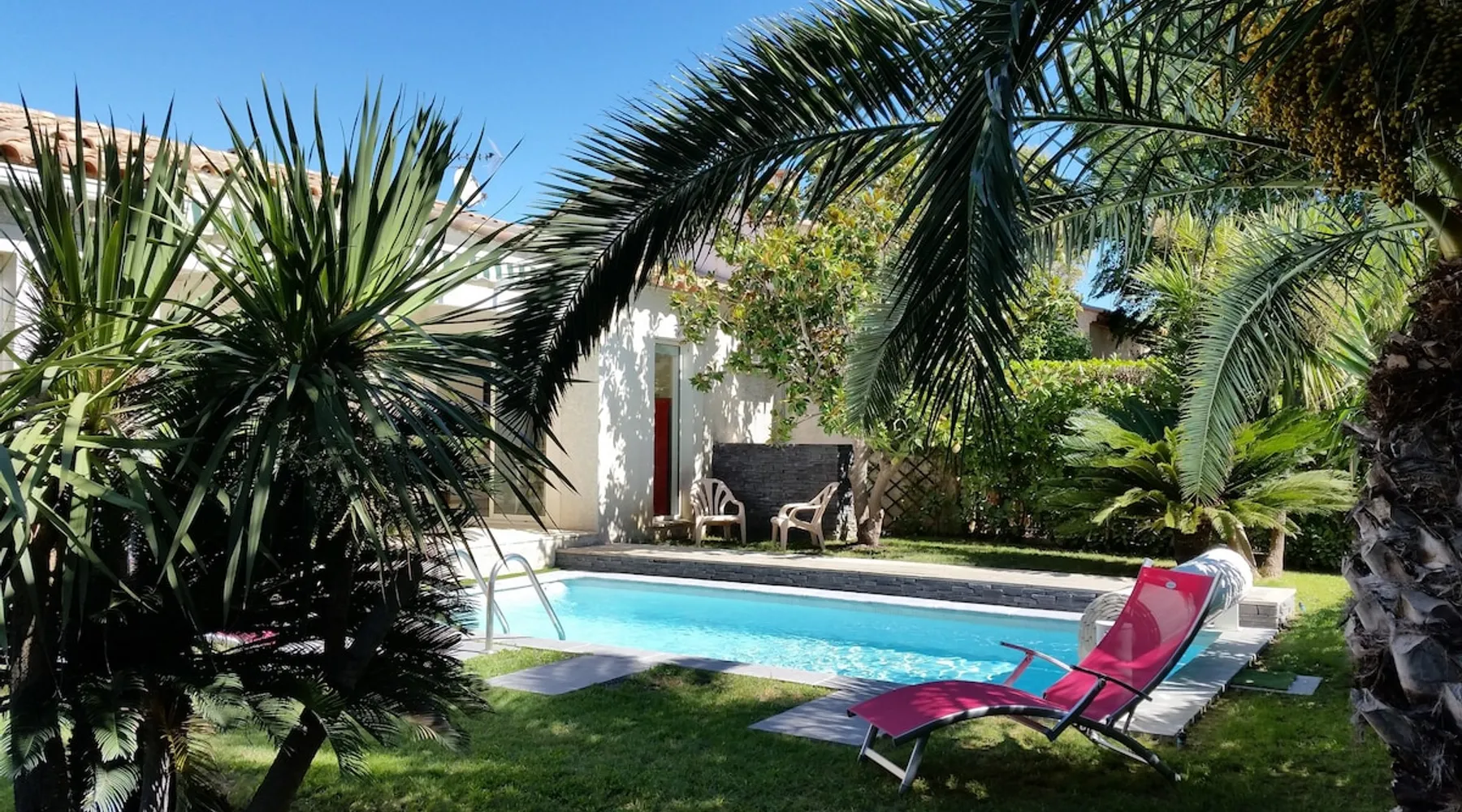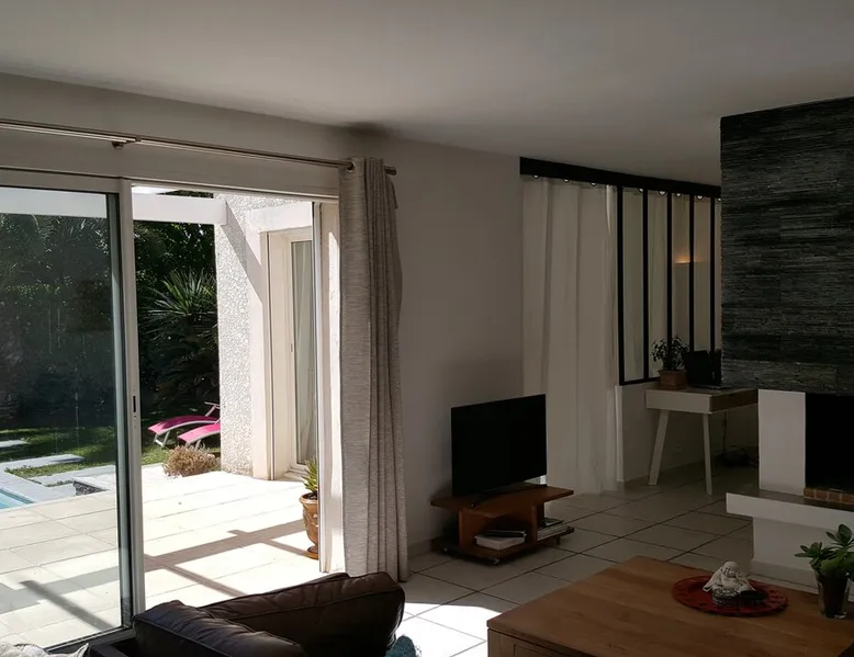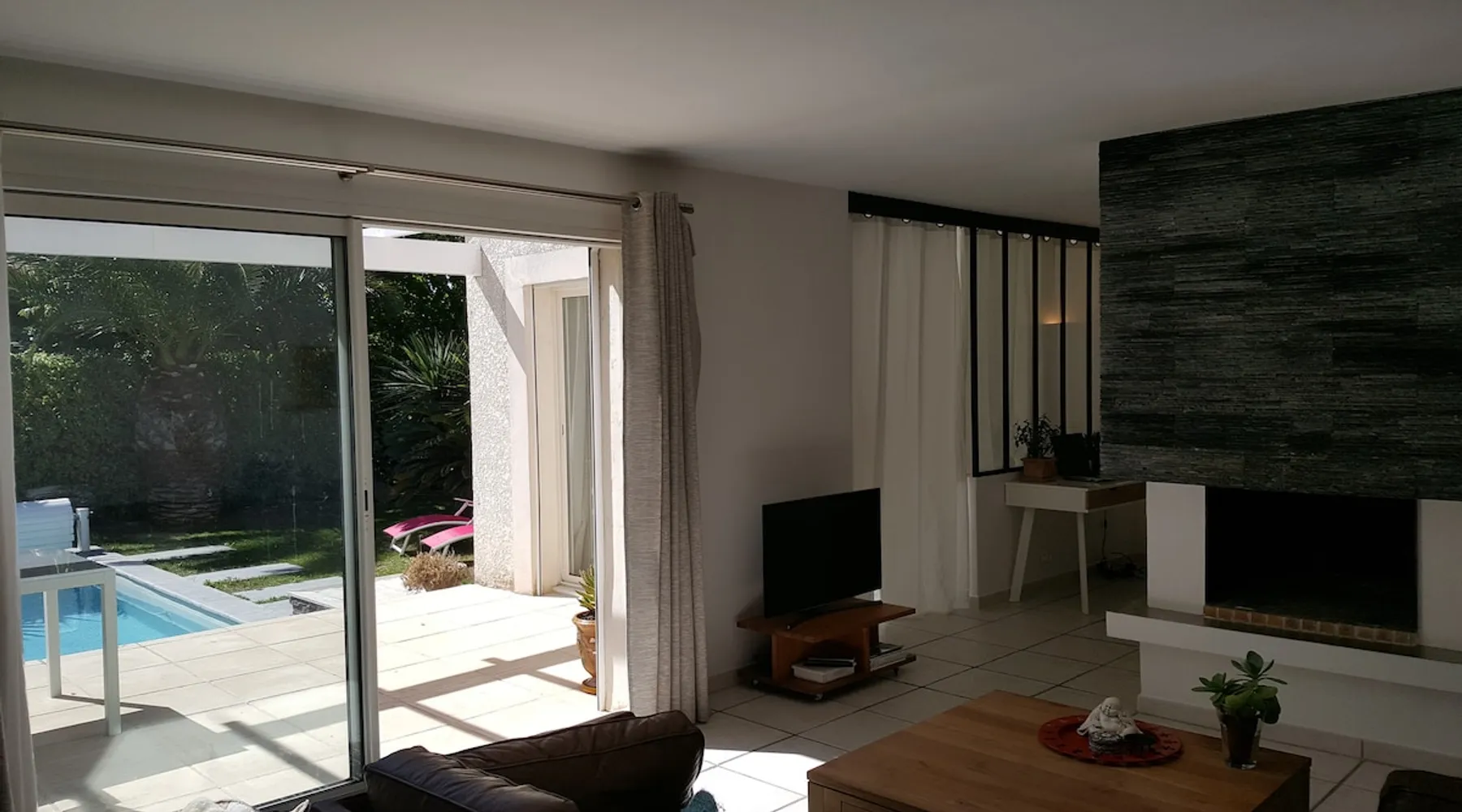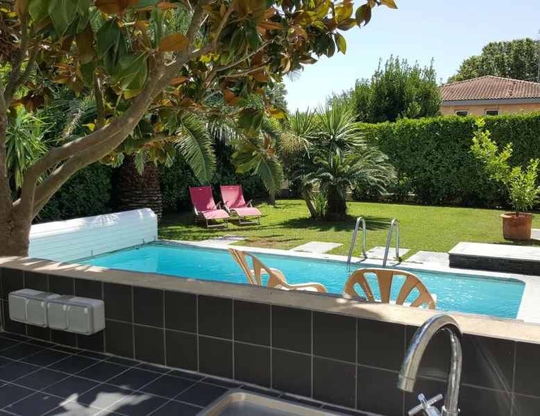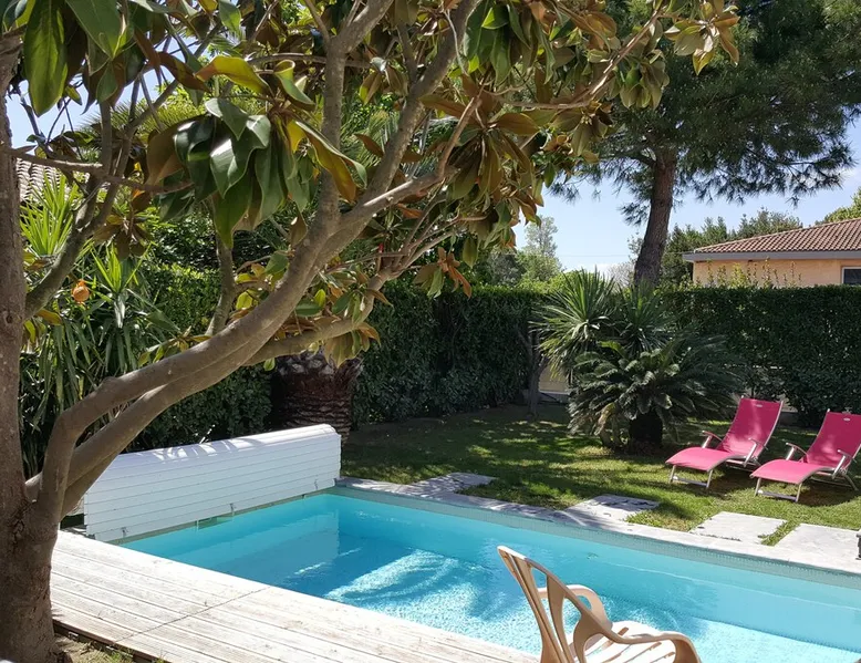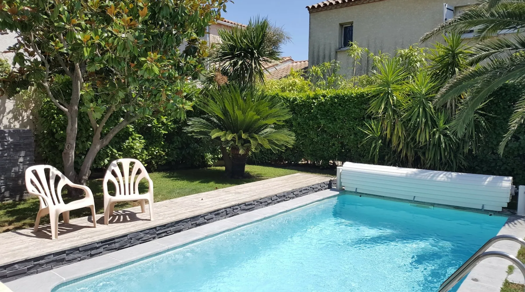 Very beautiful air-conditioned villa on one level with swimming pool, facing south, located in the heart of the village of Lattes in a secure residential area of the city center halfway between the sea and Montpellier close to the tram and all shops Ideal for 4 people - Possibility for 6 people (living room with sleeping area and 2 children's beds) The space Ideally located half way between Palavas and Montpellier (7 min drive) In the center of the village, in a small private subdivision of 9 villas, secured with entrance gate and access code. 2 minutes' walk from the beautiful Sunday market of Lattes and all shops (bakery, press, city crossroads, butcher shop, primeur...) 5 minutes' walk from the tram that will take you to Montpellier centre, train station, supermarkets... 1 minute from the cycling path which joins on one side Montpellier and on the other Palavas along the Méjean natural site and the ponds in 20 minutes of walking (2 bikes are at your disposal) Possibility to come by train: everything can be done on foot, by bike or by tram. Ideal for 4 people - Possibility of 6 people (sleeping area lounge with 2 children's beds) This house of about 100 m2 on its 500 m2 lot will seduce you with its very wooded exterior, its enclosed garden and its 6m×3m flat bottom swimming pool of 1m50 protected by an electric curtain. With its terrace and living room facing south, our ultra-light house, is composed of: -A 1st bedroom with a 160 bed and XL shower. -A second bedroom with a 160 bed with an Italian shower and toilet -A second toilet -A large open plan living room with kitchen, living room, office, office and a second living room that can be used as a 3rd sleeping area (2 60 cm benches): This space is separated from the rest of the room by a canopy and a curtain. 1 secure parking space is available in front of the house. Access to garage for bicycles Opposite a guest bedroom window of the neighbor very rarely occupied, see in photos. Amenities at your disposal: connected TV, Bluetooth smart speaker, electric barbecue, electric plancha, washing machine, dishwasher, freezer, wine cellar... Registration Details 3412900016415