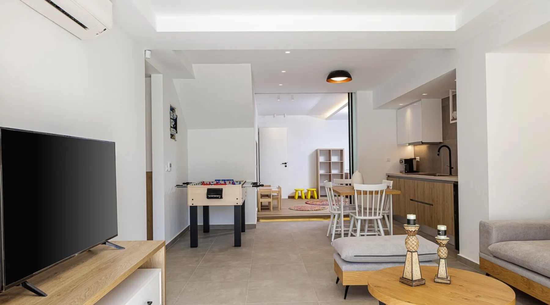 Oneiric Villas is approved by the Greek Tourism Organisation & managed by "etouri vacation rental management". Settled into the hillside overlooking Rethymno town and coastline, this complex of 3 villas lies in an envious spot with panoramic sea views. In a peaceful location, Oneiric Villas are ideally located just outside the cultural Rethymno town, and all amenities are nearby. Each stone-built villa offers a different facility that will delight families, couples, or groups alike. The space Expansive grounds with grass lawns give way to panoramic views of the sea and Rethymno town. Beautiful sunsets can be enjoyed from the pool terrace, and the house interiors will not disappoint with open plan living areas designed to a modern high spec. Each of Oneiric Villas also offers its own individuality with extra facilities such as a private swimming pool, outdoor children’s play area, along with an internal, autonomous apartment with a lounge area and kitchenette. Whether family, couple, or group, one of the Oneiric villas is sure to make your holiday dreams a reality. Layout Oneiric Villa III is set on a 1500 sq. m. plot and boasts a rolling lawned garden, wood built children’s play area and a private ‘infinity style’ viewpool. An open plan living area with modern furnishings opens up onto the pool terrace and the light stone walls are a theme throughout. The property is split over 3 levels with 2 bedrooms on the ground floor and one on each of the first and lower floors, accommodating 8 people in total. Ground Floor The open plan, stylish living area has sofa seating and a 65” Smart TV with Netflix. The contemporary kitchen has branded appliances and facilities, making holiday cooking a most pleasurable experience. A kitchen island holds the electric hob and high stools line its edge for sociable cooking and casual dining. For more formal dining, the dining table seats 8 in smart, metal backed chairs and takes prime position in front of the large patio doors which open onto the veranda and pool area, providing a seamless transition between the indoor and outdoor areas. Two bedrooms can be found on the ground floor, the first of which has an en-suite bathroom and contains a Queen size double bed (1,80 x 2,00), open wardrobe, 43” Smart TV and patio doors which lead onto a terrace. The second bedroom has twin beds (0,90x2,00) which can be made into a Queen (1,80x2,00), open wardrobe, 32” Smart TV and patio doors which open onto a private balcony with sea views. A separate bathroom is next to the bedroom, convenient for communal use and serving as bathroom for the second bedroom with a rainshower. First Floor Reached via a floating staircase, the first floor bedroom has an ensuite bathroom with rainshower. A Queen bedded room (1,80 x 2,00), it features an open wardrobe, 32”Smart TV and window with glorious views over the pool and out to sea. Lower Floor The large lower floor has an open plan area and features a playroom our young guests will love, featuring a foosball table, chalkboard, small tables and chairs, an egg chair and a comfortable sofa. The room has partition walls which can separate the area from the autonomous apartment featured on this level. This independent space has a kitchenette, sofa, 55” Smart TV with Netflix and Playstation 4, a further Queen bedded room (1,80x2,00) and separate bathroom, ideal for families or groups seeking personal space. An external door provides a separate entrance to the apartment and its terrace area houses a ping pong table.There is also a utility cupboard on this floor with a washer/dryer machine Outdoor Area The 1400 sq. m. outdoor area is beautifully landscaped with awned gardens framing the villa, providing the perfect space in which to play or relax. The outdoor facilities include: - 45 sq. m. private swimming pool (1,4 m depth) with children’s section (0.45) and step access. The pool can be heated upon advance request, for an additional daily charge, for the entire stay, and requires at least one week’s notice. - A 4 seater hot tub - Comfortable sunbeds with umbrellas and a day bed for luxurious poolside relaxation -An outdoor dining table is located under a pergola, next to the charcoal barbecue with sink, cupboards and preparation area. - Comfortable rattan sofa area near the lawn beyond the pool for relaxation while enjoying the sweeping sea views. - A further seating area - Large lawned garden by the pool area and at the side of the house featuring a children’s play structure with swings and slides. - Ping pong table on the terrace area at the back of the house. - Driveway that provides parking space for up to 6 cars. The villa has its own private entrance. **Accommodation cost Climate Resilience Tax. The amount for the accommodation type is set at €15 per night from April to October and €4 per night from November to March, payable upon check-in. Guest access Guests will have access to all areas indoors and outdoors! Other things to note This villa is under “etouri vacation rental management” which means: - We organised the villa down to every detail and check it annually. - Quick booking process and support in every step of your holidays. - A personal holiday advisor at your disposal for holiday organisation (free concierge service before and during stay). - Assistance in booking services and excursions. - Pre arrival service with detailed information of the area of the villa. SERVICES : Services included in the price: - Welcome pack including traditional Cretan treats - Shopping before arrival (cost of groceries not included) - Daily housekeeping 10:00-13:00 except Sunday & final cleaning - Towel & Linen change every 3 days - Pool and garden maintance Furthermore, the following services can be arranged with an additional fee, upon request: - Selection from our Mini bar (drinks and wines) - Daily shopping service with an additional charge of 5€ per day. In case your order costs more than 25€, the service