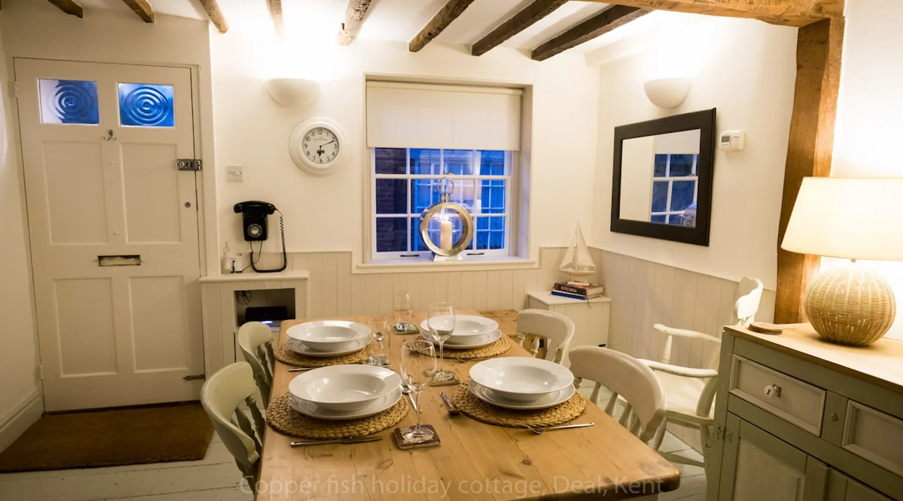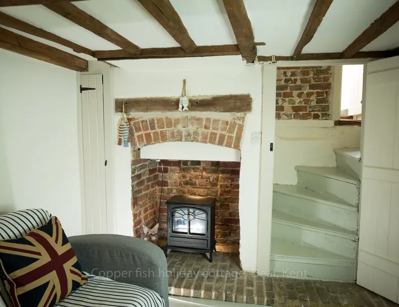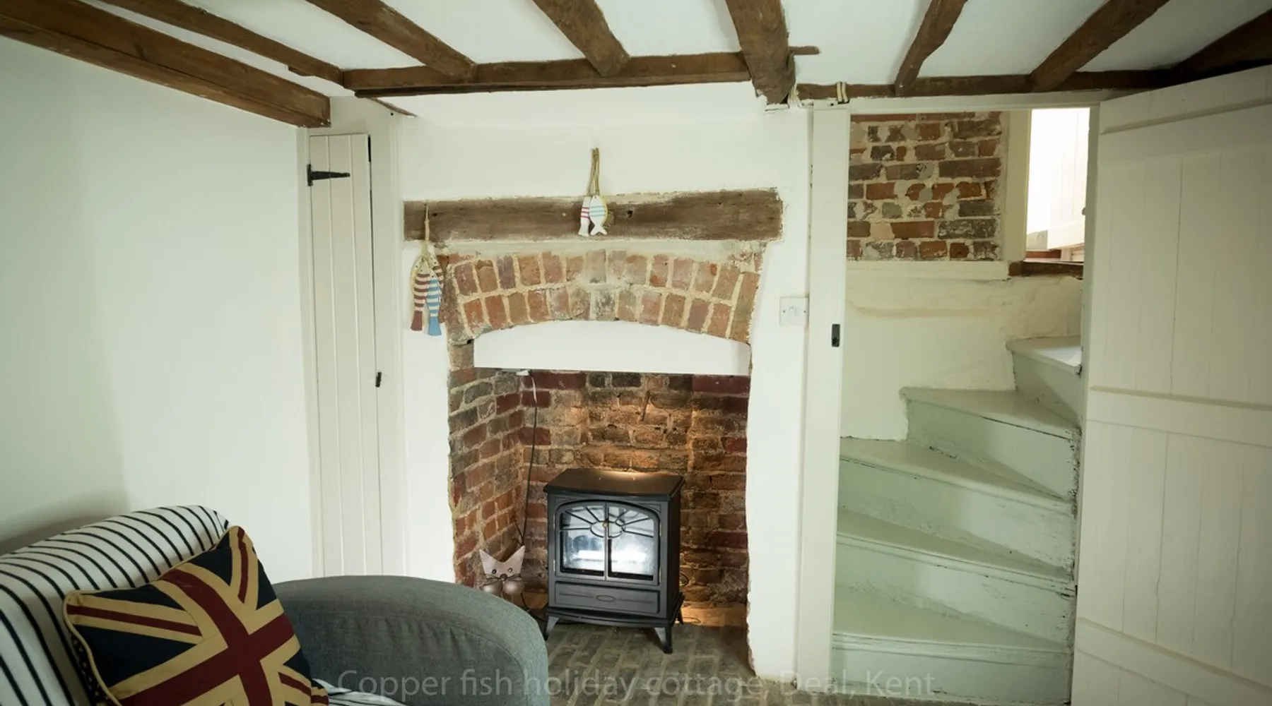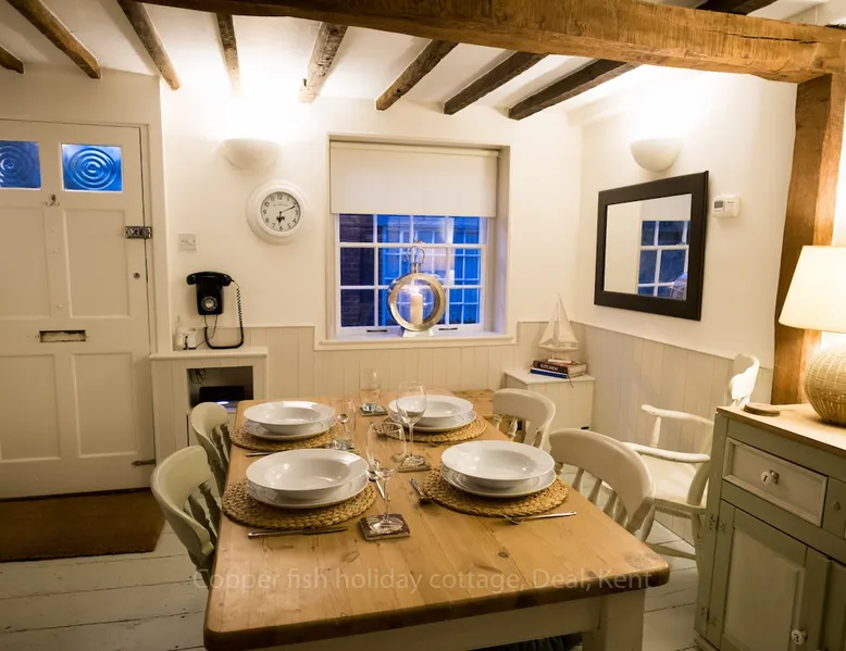 Copper fish delivers laid-back coastal charm, with a feast of original features and all the modern comforts of home - including Sky Sports TV and fibre max broadband. Built over 230 years ago 'Copper fish' is a listed former fisherman's cottage, 50 yards from the beach, in the heart of Deal's charming conservation area. Within a 5-minute stroll, you'll discover an award-winning high street with independent shops, cafes, art galleries, pubs, restaurants, and a pebble beach with a 1000 ft pier. The space Copper fish is an authentic fisherman's cottage circa 1770. It's set over four floors with lime render brickwork, exposed floorboards and original oak beams. It's atmospheric, cosy and fun. You and your guests (up to four people) have the use of the whole cottage and comprise of a dining room, sitting room, kitchen, bathroom, one double bedroom, one twin bedroom, and a small yard. Please note in places we have low beams and ceilings. The Cottage has a tight spiral staircase that may not suit everyone. Dining Room | Painted original floorboards with a rustic pine kitchen table, four chairs and a dresser. Sky fibre max broadband. Kitchen | Fully fitted and equipped galley style kitchen with gas hob and electric oven, integrated dishwasher, fridge, and microwave. Living Room (The Snug) | Four-piece corner sofa, curved Smart TV (access to Netflix, Amazon Prime etc), Sky TV with Sky Sports and a selection of traditional board games. Bedroom One (Driftwood) | Exposed lime and brick walls with exposed oak beams. Standard iron double bed with a feather duvet, Victorian Pine Wardrobe and Drawers. Anti-allergy pillows, Egyptian cotton bedding, and cotton towels. Wooden sea chest containing a synthetic duvet, and extra blankets. Bathroom | Very spacious and light with Victorian basin, toilet and bath with shower over. Airing cupboard with spare cotton towels, and anti-allergy pillows. Hotpoint Washing Machine with Tumble Dryer. Bedroom Two (Crow's Nest) | Tongue and groove-panelled walls with exposed oak beams and dormer window. Two standard single beds with synthetic duvets, Anti-allergy pillows, Egyptian cotton bedding, and cotton towels. Dressing table and stool. Clothes rail. Backyard | Bistro style table and two chairs, small out shed with Beach stuff and a BBQ to take. (BBQs and open fires are allowed on Deal and Walmer beaches) Guest access The whole of the cottage, two bedrooms, two reception rooms, good size bathroom, kitchen and back yard. *Staircase is steep and may not be suitable for the elderly and very young* Other things to note As the Cottage is all original, the ceiling in places is low - an average height in England 230 years ago was just over 5ft 6 inches, so you may bump your head once or twice. Also if you're over 6.2ft you won't be able to stand to your full height in the shower...we do have a bath though!