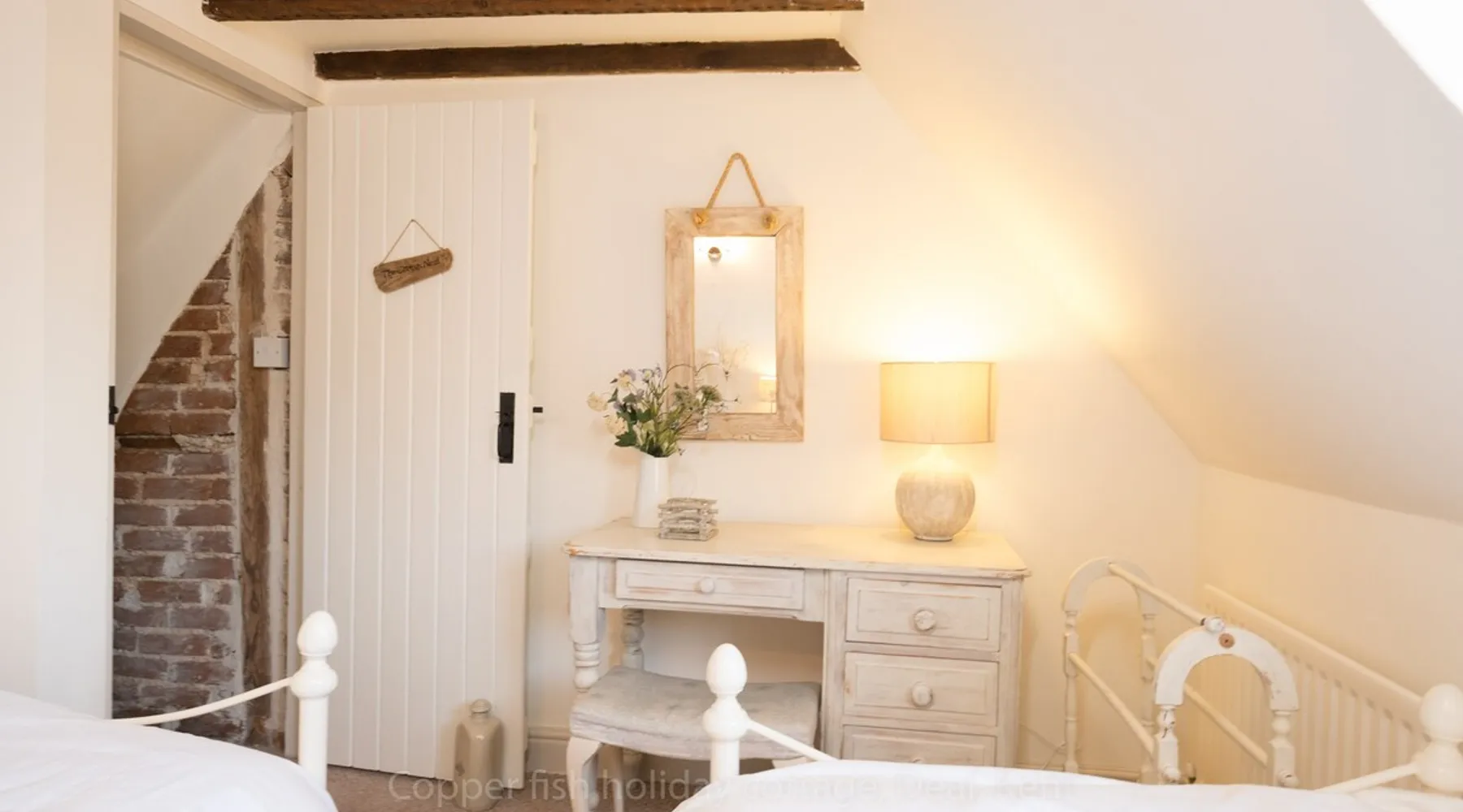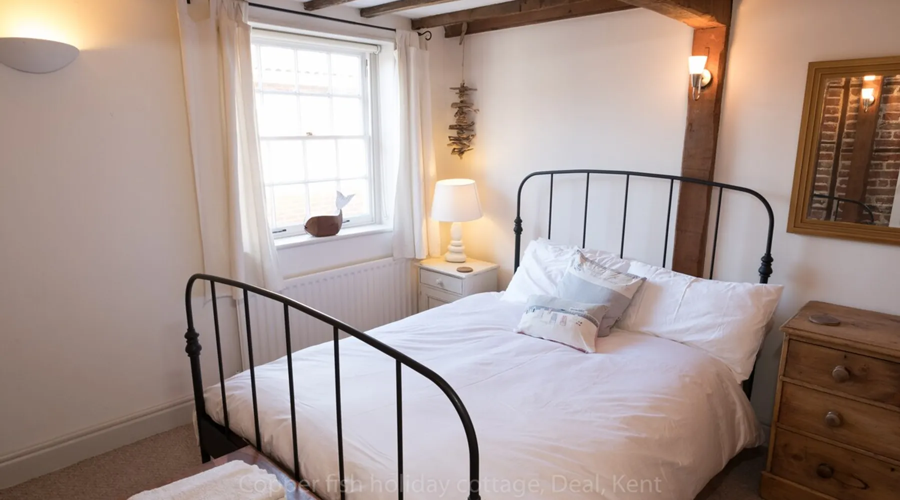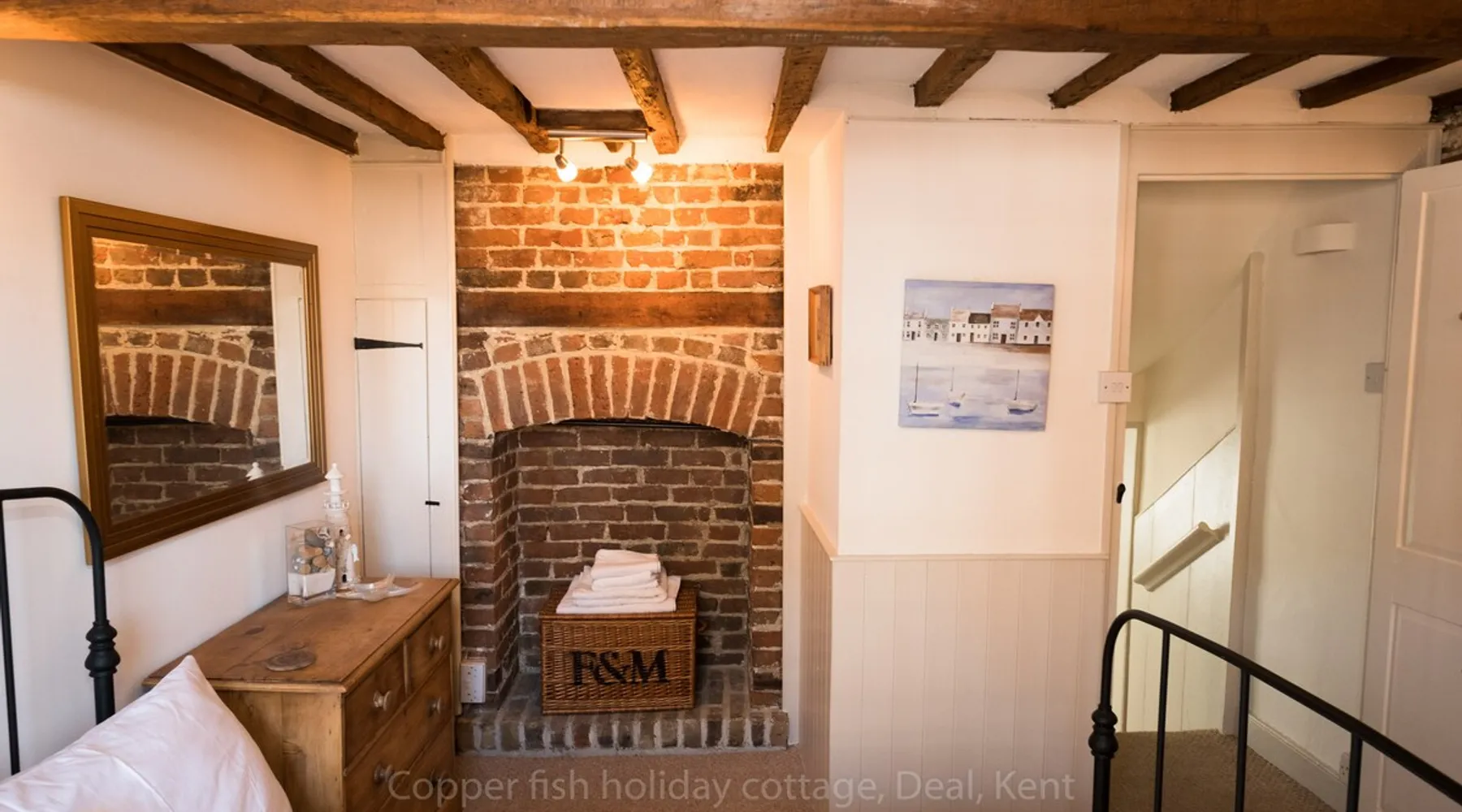 Copper fish delivers laid-back coastal charm, with a feast of original features and all the modern comforts of home - including Sky Sports TV and fibre max broadband. Built over 230 years ago 'Copper fish' is a listed former fisherman's cottage, 50 yards from the beach, in the heart of Deal's charming conservation area. Within a 5-minute stroll, you'll discover an award-winning high street with independent shops, cafes, art galleries, pubs, restaurants, and a pebble beach with a 1000 ft pier. The space Copper fish is an authentic fisherman's cottage circa 1770. It's set over four floors with lime render brickwork, exposed floorboards and original oak beams. It's atmospheric, cosy and fun. You and your guests (up to four people) have the use of the whole cottage and comprise of a dining room, sitting room, kitchen, bathroom, one double bedroom, one twin bedroom, and a small yard. Please note in places we have low beams and ceilings. The Cottage has a tight spiral staircase that may not suit everyone. Dining Room | Painted original floorboards with a rustic pine kitchen table, four chairs and a dresser. Sky fibre max broadband. Kitchen | Fully fitted and equipped galley style kitchen with gas hob and electric oven, integrated dishwasher, fridge, and microwave. Living Room (The Snug) | Four-piece corner sofa, curved Smart TV (access to Netflix, Amazon Prime etc), Sky TV with Sky Sports and a selection of traditional board games. Bedroom One (Driftwood) | Exposed lime and brick walls with exposed oak beams. Standard iron double bed with a feather duvet, Victorian Pine Wardrobe and Drawers. Anti-allergy pillows, Egyptian cotton bedding, and cotton towels. Wooden sea chest containing a synthetic duvet, and extra blankets. Bathroom | Very spacious and light with Victorian basin, toilet and bath with shower over. Airing cupboard with spare cotton towels, and anti-allergy pillows. Hotpoint Washing Machine with Tumble Dryer. Bedroom Two (Crow's Nest) | Tongue and groove-panelled walls with exposed oak beams and dormer window. Two standard single beds with synthetic duvets, Anti-allergy pillows, Egyptian cotton bedding, and cotton towels. Dressing table and stool. Clothes rail. Backyard | Bistro style table and two chairs, small out shed with Beach stuff and a BBQ to take. (BBQs and open fires are allowed on Deal and Walmer beaches) Guest access The whole of the cottage, two bedrooms, two reception rooms, good size bathroom, kitchen and back yard. *Staircase is steep and may not be suitable for the elderly and very young* Other things to note As the Cottage is all original, the ceiling in places is low - an average height in England 230 years ago was just over 5ft 6 inches, so you may bump your head once or twice. Also if you're over 6.2ft you won't be able to stand to your full height in the shower...we do have a bath though!