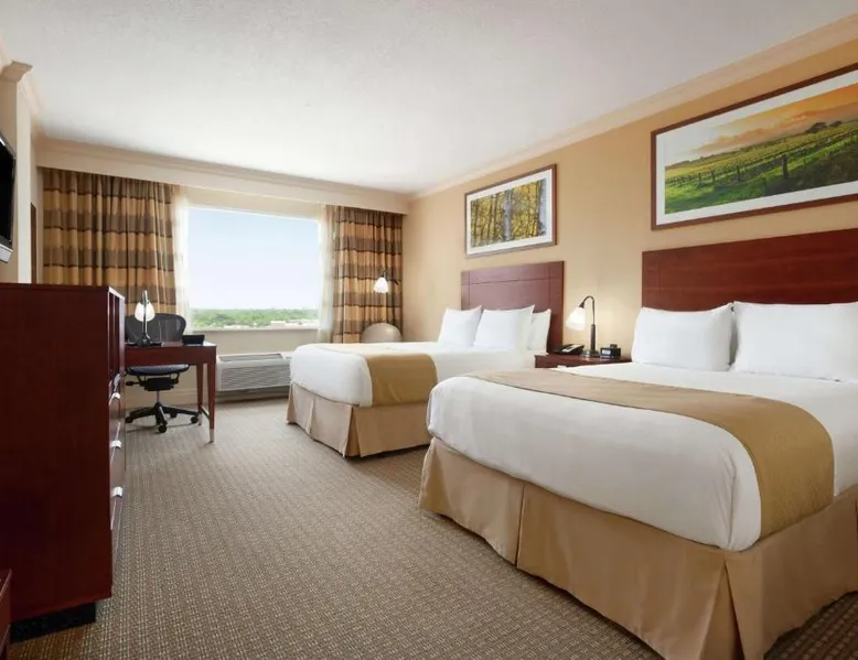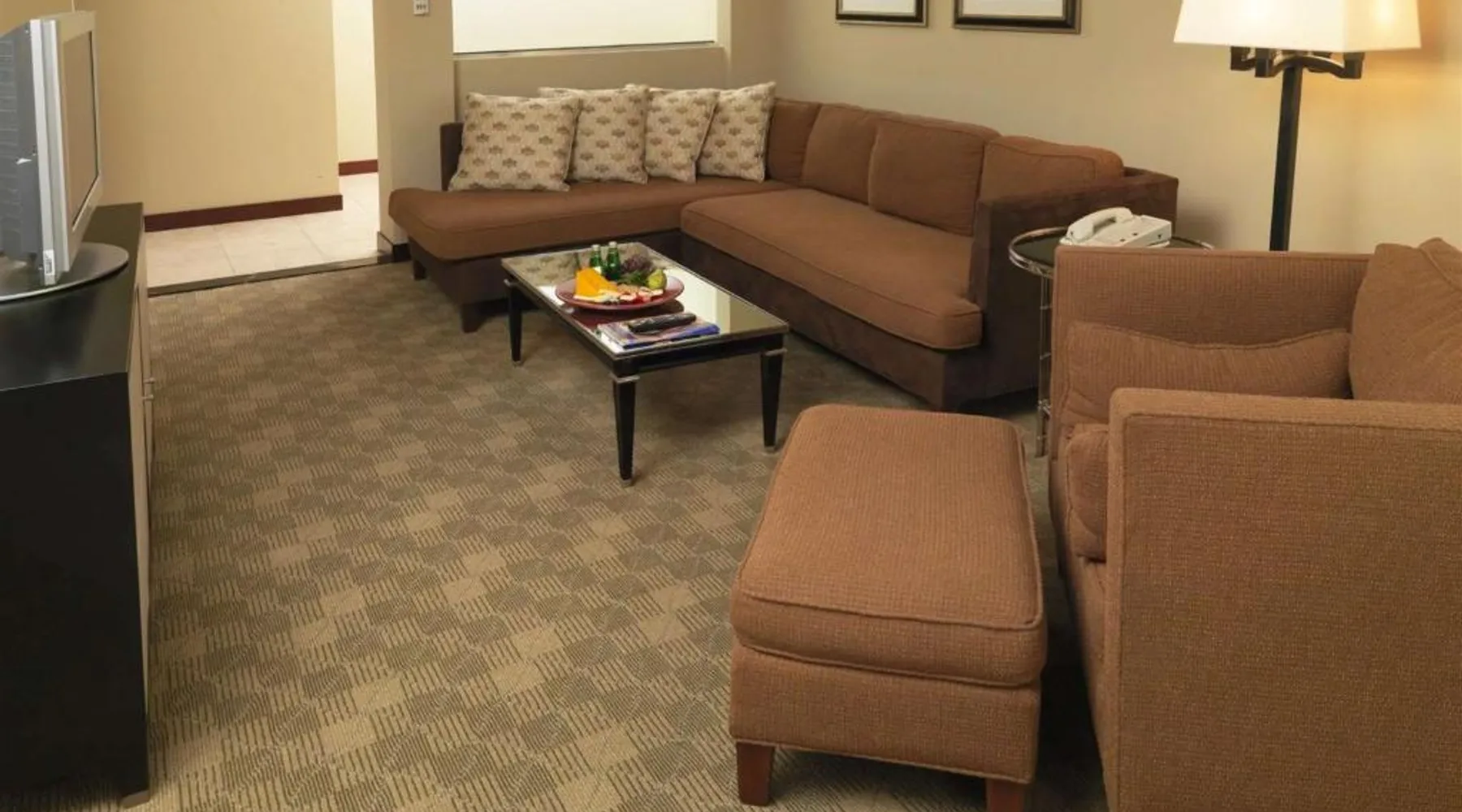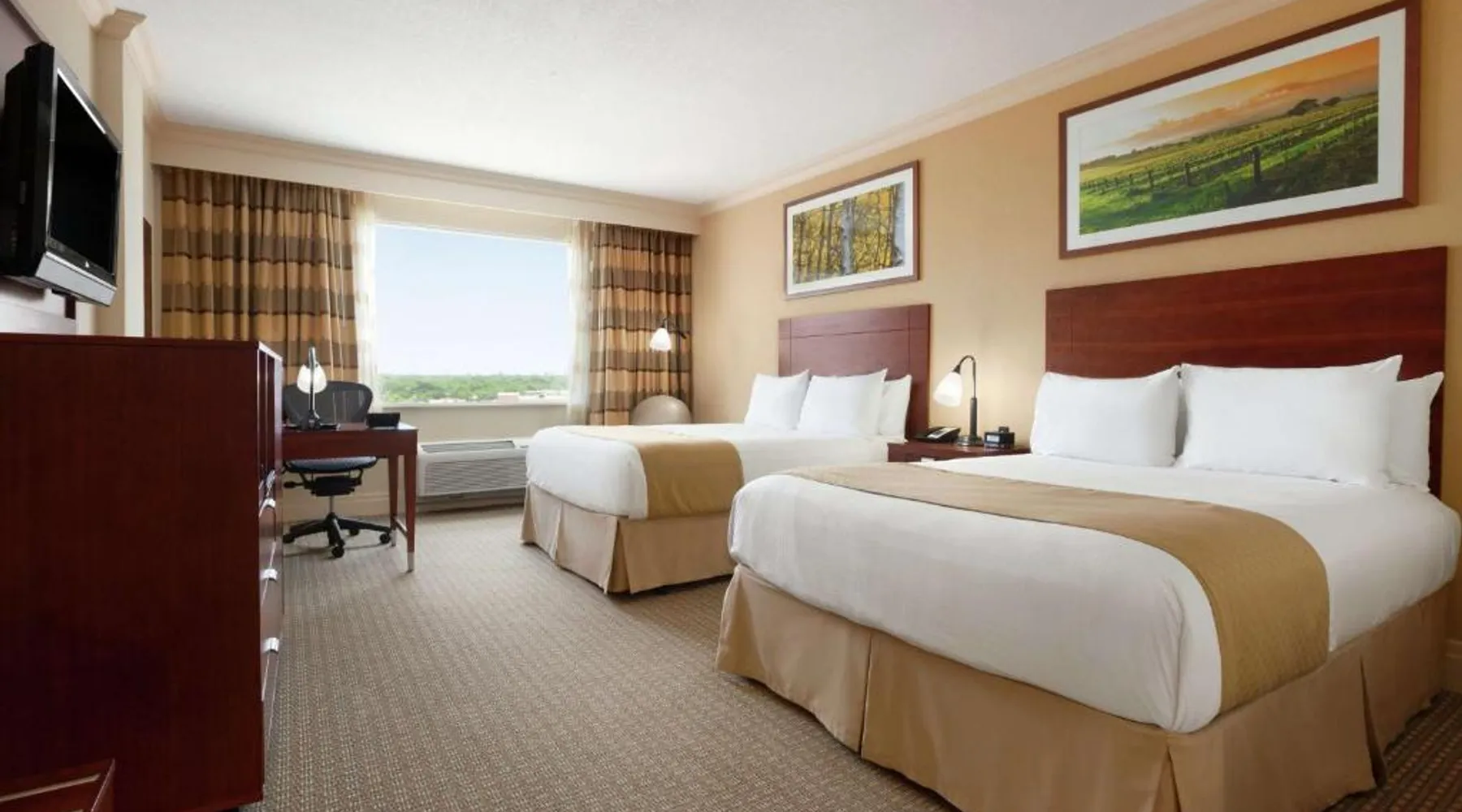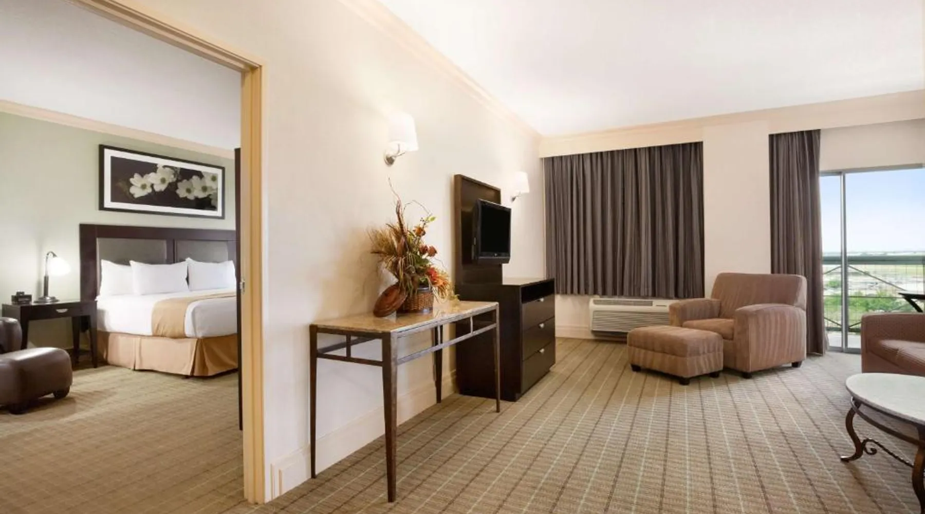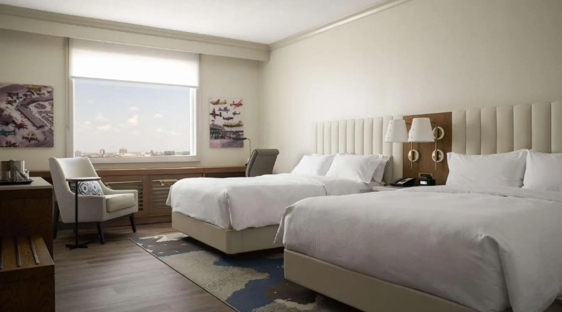 Comfortable Accommodations: DoubleTree by Hilton Hotel Dallas - Love Field in Dallas offers family rooms with air-conditioning, tea and coffee makers, hairdryers, refrigerators, and TVs. Each room includes a balcony, bathrobes, sofa beds, and seating areas. Exceptional Facilities: Guests enjoy a restaurant, bar, outdoor swimming pool, and free WiFi. Additional amenities include a fitness room, elevator, 24-hour front desk, and paid on-site private parking. Prime Location: Located a few steps from Dallas Love Field Airport, the hotel is near Highland Park Village (2.1 mi), Dallas World Trade Center and Meadows Museum (3.1 mi), and AT&T Performing Arts Center (5 mi). Guest Satisfaction: Highly rated for its connectivity to the airport, convenient location, and room comfort. This suite has air conditioning, a tea and coffee maker, a flat-screen TV and a balcony. The unit has 2 beds.