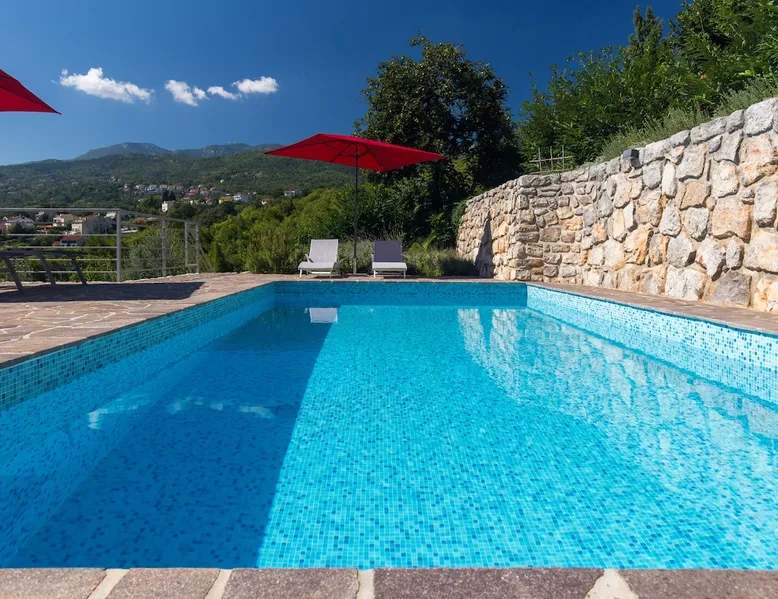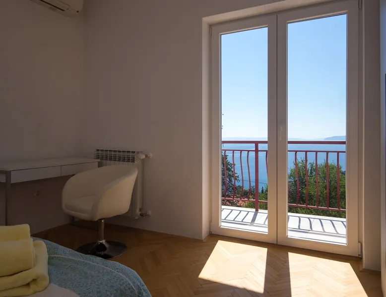 Villa Capra Verde, Opatija [Opetija] What a beautiful panoramic view of the sea - directly from your private pool! The distance as the crow flies to the sea is 150 m. Our green paradise (1,500 m) is a very quiet family property in Opatija-Icici with two separate living areas for exclusive use, an individually designed garden and modern amenities for a high quality standard. Rijeka Airport (RJK) is just 40 km away and Pula is 90 km away. The space In the lovingly and modernly furnished family villa in Opatija, young and old will feel comfortable. The upper floor consists of three bedrooms, two with double bed - with sea view directly from the bed = 4 people, one bedroom with two single beds = 2 people, bathroom, a guest toilet, kitchen, living room, a large terrace (30 m2) and a balcony (26 m2). Of course, the high-quality and modern furniture in both separate living areas includes a dishwasher, a fridge/freezer, satellite TV and Wi-Fi, air conditioning and towels, duvet covers, complete kitchen equipment and a baby cot. The separate ground floor consists of a bedroom with double bed = 2 people, bathroom and a kitchen with dining area. Outside there is the private pool (30m2) with large lounge areas (200m2) that invite you to sunbathe. The house is for your own use. There are no further guests or landlords in the cottage. On the 1,500 m² property grow conifers, palm trees, lavender and sage, olive and lemon trees. There is outdoor furniture, children's furniture, a covered outdoor shower and a barbecue. To stay fit, you can swim and splash in the private pool or play table tennis. In the immediate vicinity you will find a variety of leisure opportunities: For mountain hikers: Trekking or cycling in the Uckagebirge Nature Park (1400 m) or directly behind the villa, because here a high-altitude path even leads to the summit of the Učka Nature Park! You can play diving, parasailing, beach volleyball, charter boat trips or just swim to your heart's content on the large beach of the village or on the beautiful pebble beaches in the area. Of course, the region and especially the sophisticated seaside resort of Opatija offers a wide selection of restaurants, ranging from luxury to simple seafood restaurants and wine cellars to numerous shopping opportunities. Concerts and varied events enrich the famous place. The house is located on the slope (see photo of the balcony), on foot it is about 10 minutes downhill to the beach. Walking uphill about 20 to 25 minutes Opposite the beach is a grocery store for daily shopping. The large supermarkets such as Spar, Lidl etc. are about 3 km away in Opatija. Villa is about 500 km from Munich and 300 km from Graz. Welcome to "Villa Capra Verde" in Opatija! Guest access Our guests have access to the apartment on the first floor and the upper floor. Guests have the entire villa to themselves. Other things to note The pool is maintained once a week. For stays of 14 days, bed linens and towels will be changed after 7 nights and upon request.