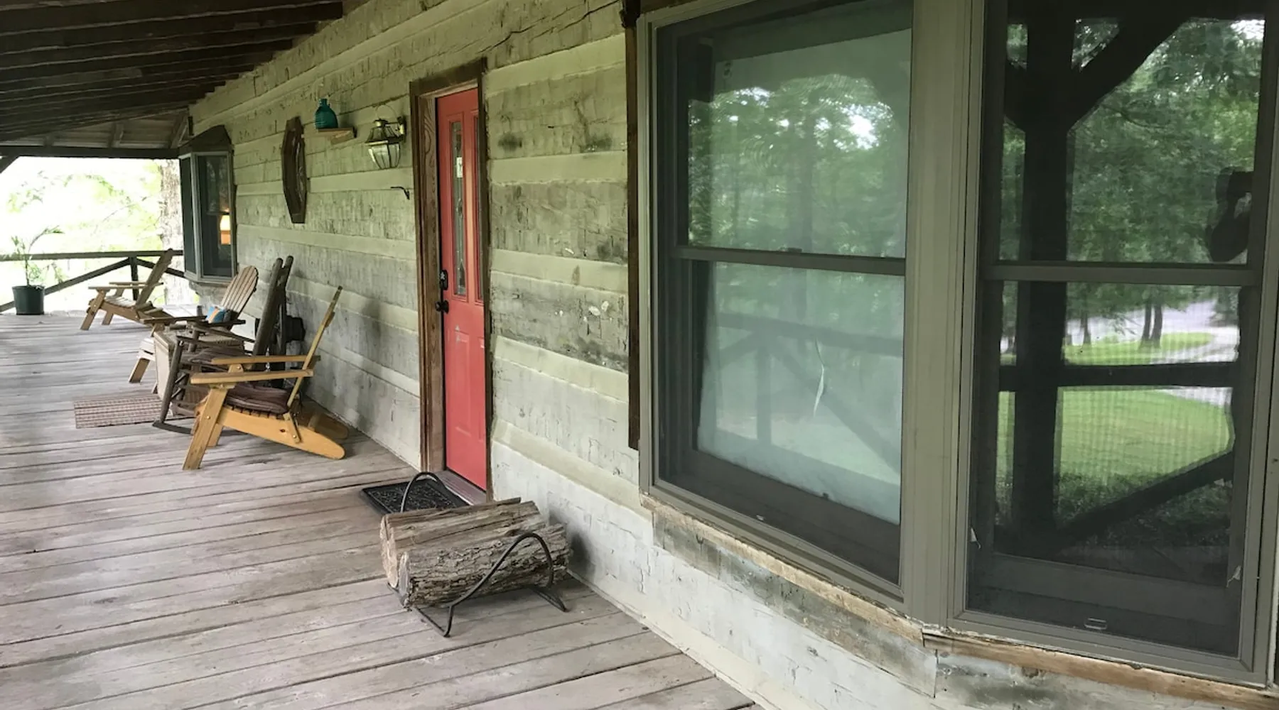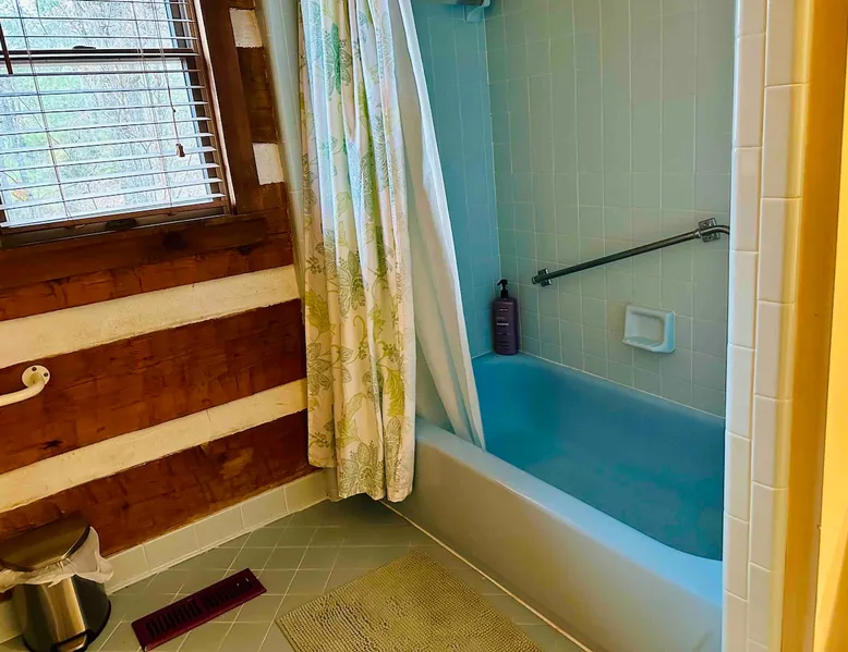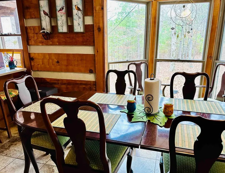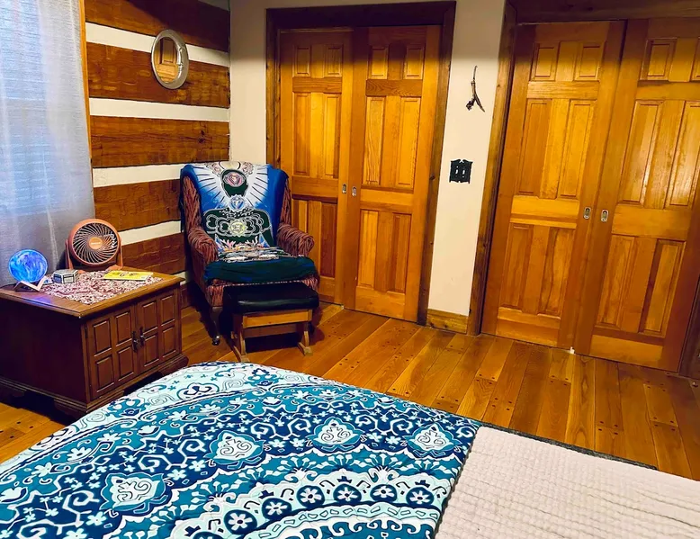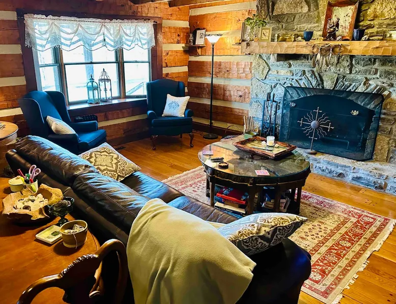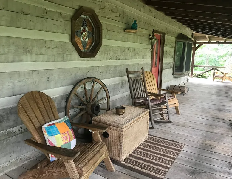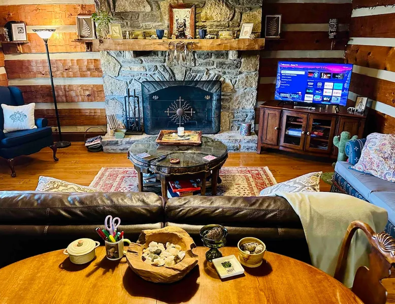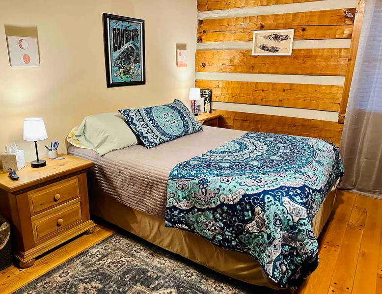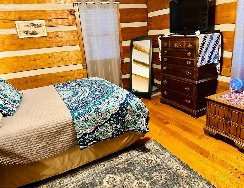 This small room with queen bed and large windows is in a charming 4 bedroom log house in the forest. It shares a bathroom with Room 2. Connect with nature. Walk down the hill to Lake Gratitude and its 6-acre lake and many trails. Home to turkey, moths, caterpillars and lots of wildlife! Hot tub -$50 set up fee. 2 friendly cats live here The space Nestled in an authentic hand-hewn log cabin, this first floor room overlooks the side yard. Shared living room and kitchen/diningroom are downstairs. Gorgeous old-time wraparound porch with rockers and view of the surrounding forest. Hiking trails accessible via nearby Big East Fork Retreat. You share the kitchen, living room and outdoor spaces with the other house guests. The house is surrounded by nature and its creatures (deer, osprey, hawk, possum, raccoon, etc). Guest access Upon arrival, you will receive a door code to the house and to your room. You'll have unrestricted access to the common areas as well as the outdoor spaces. To gain access to hiking trails and lake, Nerissa can assist with making your reservations and requests through the Center For Sustainable Stewardship (CSS). It is a member-driven non-profit that relies on memberships, day passes, and donations for its operations. CSS partners with the Fork Inn to provide Nature immersion experiences. Other things to note The price quoted is for Lodging only. If you are having an EVENT you must send a message to receive details and pricing. The internet is via cellular wifi hotspot. *There are two cats that live on the property. This room is not recommended for guests with cat allergies.