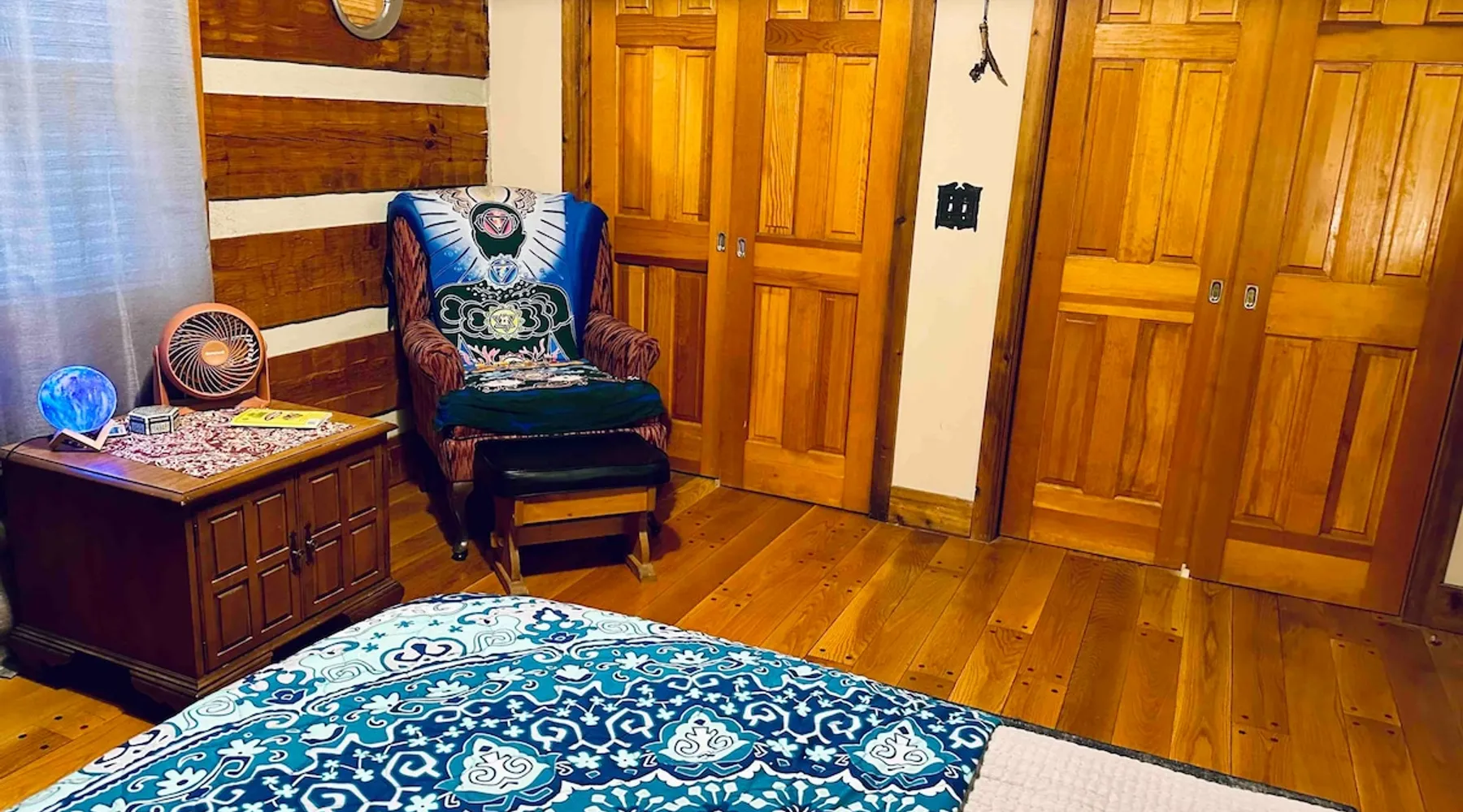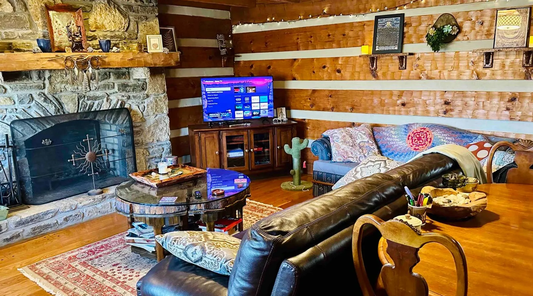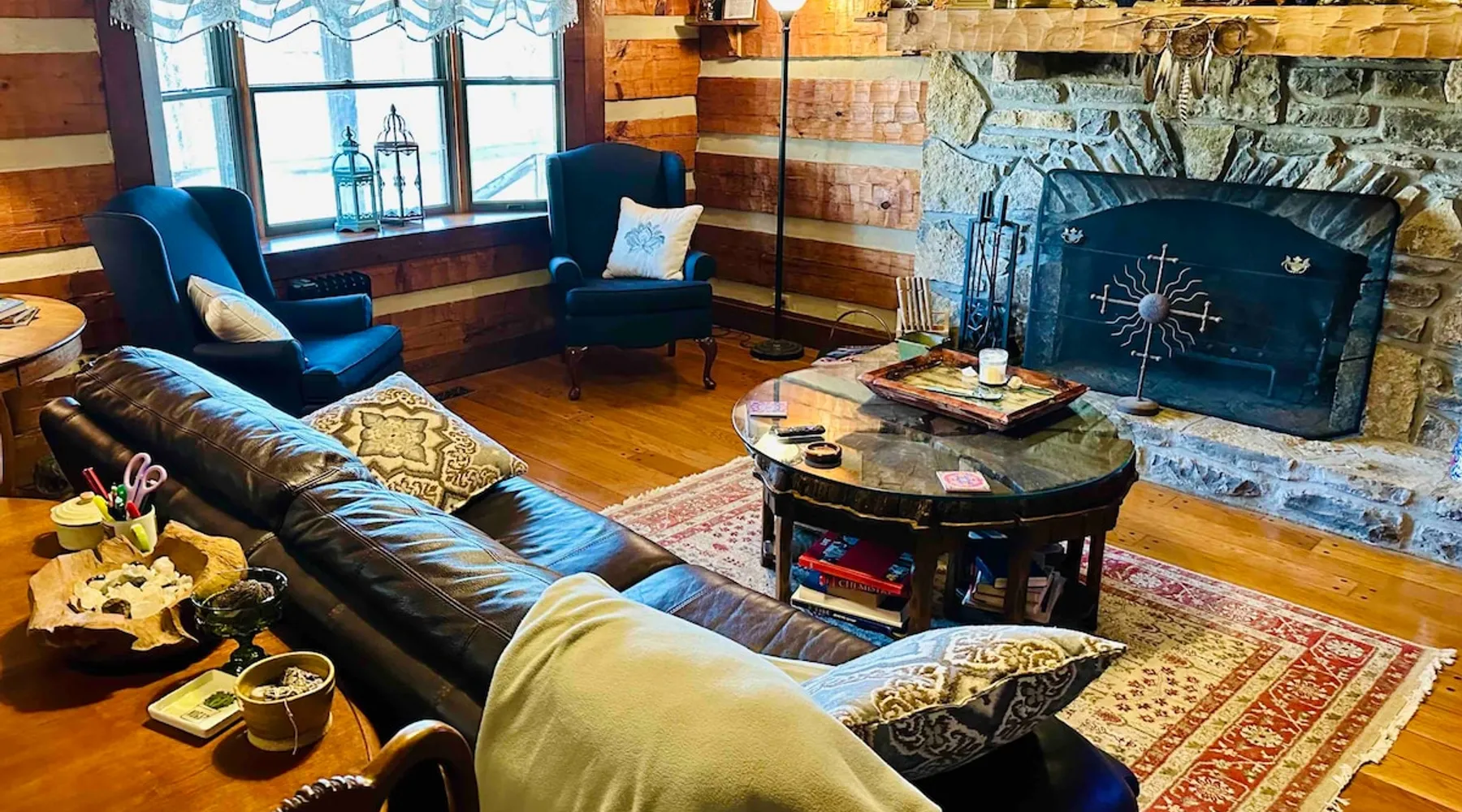 This small room with queen bed and large windows is in a charming 4 bedroom log house in the forest. It shares a bathroom with Room 2. Connect with nature. Walk down the hill to Lake Gratitude and its 6-acre lake and many trails. Home to turkey, moths, caterpillars and lots of wildlife! Hot tub -$50 set up fee. 2 friendly cats live here The space Nestled in an authentic hand-hewn log cabin, this first floor room overlooks the side yard. Shared living room and kitchen/diningroom are downstairs. Gorgeous old-time wraparound porch with rockers and view of the surrounding forest. Hiking trails accessible via nearby Big East Fork Retreat. You share the kitchen, living room and outdoor spaces with the other house guests. The house is surrounded by nature and its creatures (deer, osprey, hawk, possum, raccoon, etc). Guest access Upon arrival, you will receive a door code to the house and to your room. You'll have unrestricted access to the common areas as well as the outdoor spaces. To gain access to hiking trails and lake, Nerissa can assist with making your reservations and requests through the Center For Sustainable Stewardship (CSS). It is a member-driven non-profit that relies on memberships, day passes, and donations for its operations. CSS partners with the Fork Inn to provide Nature immersion experiences. Other things to note The price quoted is for Lodging only. If you are having an EVENT you must send a message to receive details and pricing. The internet is via cellular wifi hotspot. *There are two cats that live on the property. This room is not recommended for guests with cat allergies.