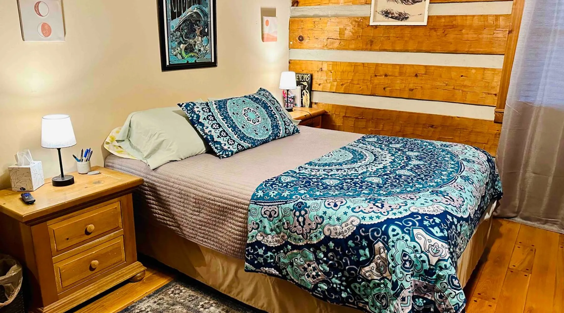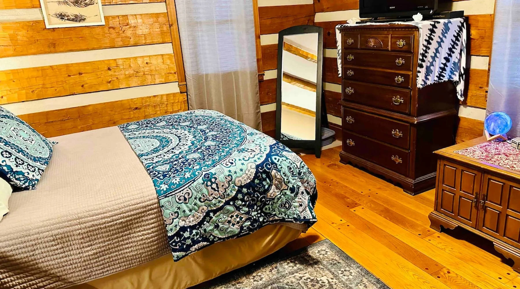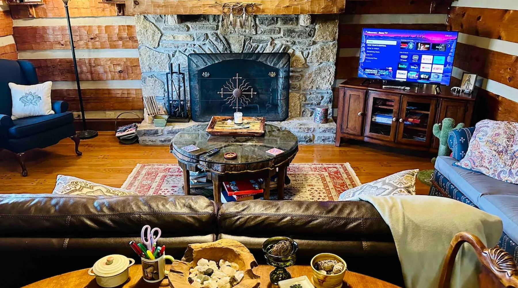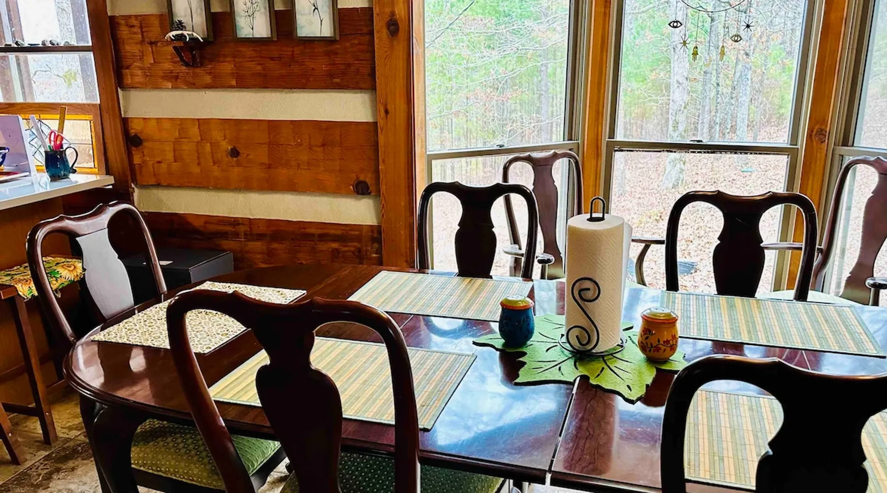 This small room with queen bed and large windows is in a charming 4 bedroom log house in the forest. It shares a bathroom with Room 2. Connect with nature. Walk down the hill to Lake Gratitude and its 6-acre lake and many trails. Home to turkey, moths, caterpillars and lots of wildlife! Hot tub -$50 set up fee. 2 friendly cats live here The space Nestled in an authentic hand-hewn log cabin, this first floor room overlooks the side yard. Shared living room and kitchen/diningroom are downstairs. Gorgeous old-time wraparound porch with rockers and view of the surrounding forest. Hiking trails accessible via nearby Big East Fork Retreat. You share the kitchen, living room and outdoor spaces with the other house guests. The house is surrounded by nature and its creatures (deer, osprey, hawk, possum, raccoon, etc). Guest access Upon arrival, you will receive a door code to the house and to your room. You'll have unrestricted access to the common areas as well as the outdoor spaces. To gain access to hiking trails and lake, Nerissa can assist with making your reservations and requests through the Center For Sustainable Stewardship (CSS). It is a member-driven non-profit that relies on memberships, day passes, and donations for its operations. CSS partners with the Fork Inn to provide Nature immersion experiences. Other things to note The price quoted is for Lodging only. If you are having an EVENT you must send a message to receive details and pricing. The internet is via cellular wifi hotspot. *There are two cats that live on the property. This room is not recommended for guests with cat allergies.