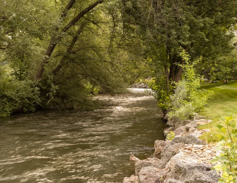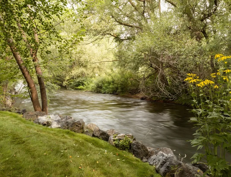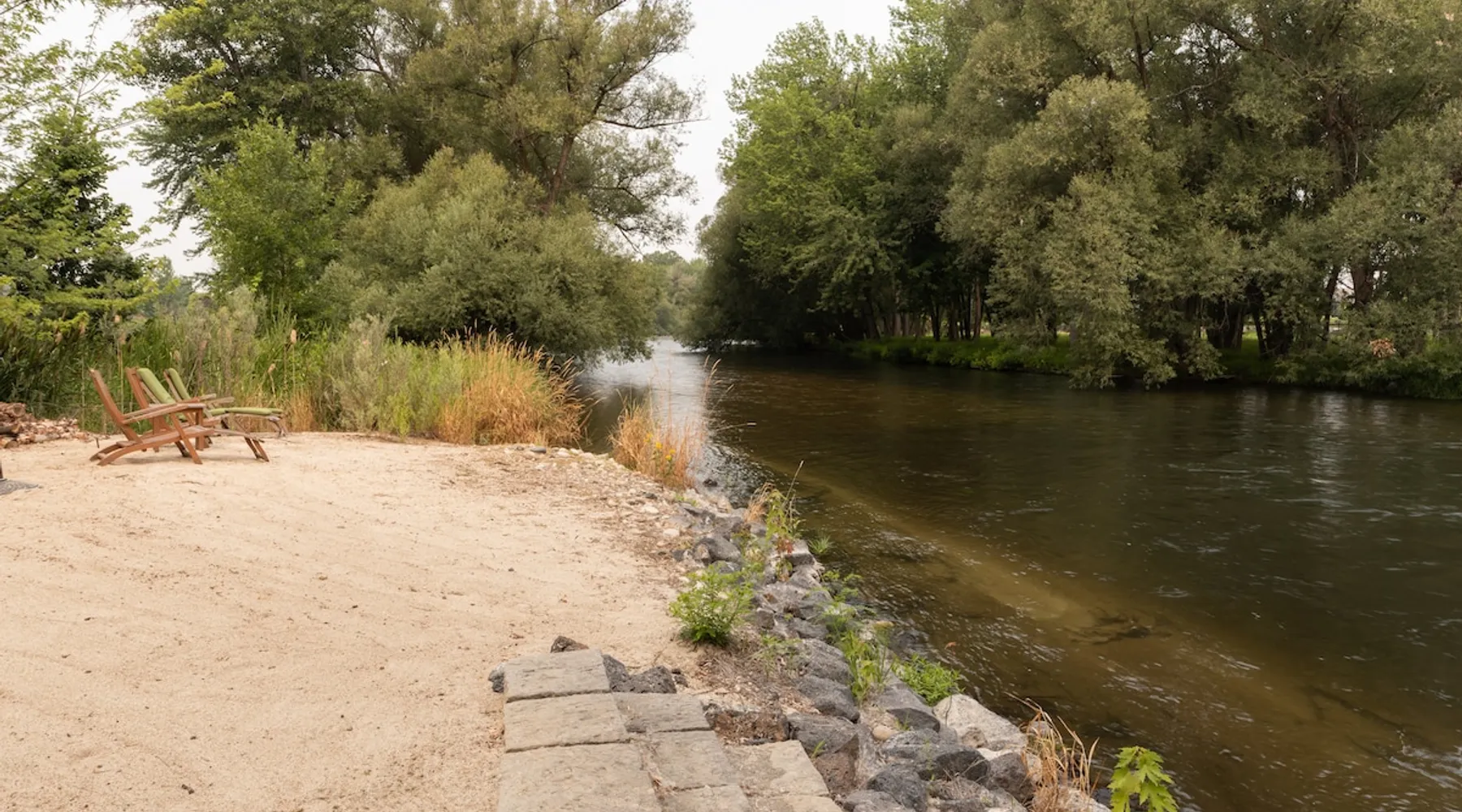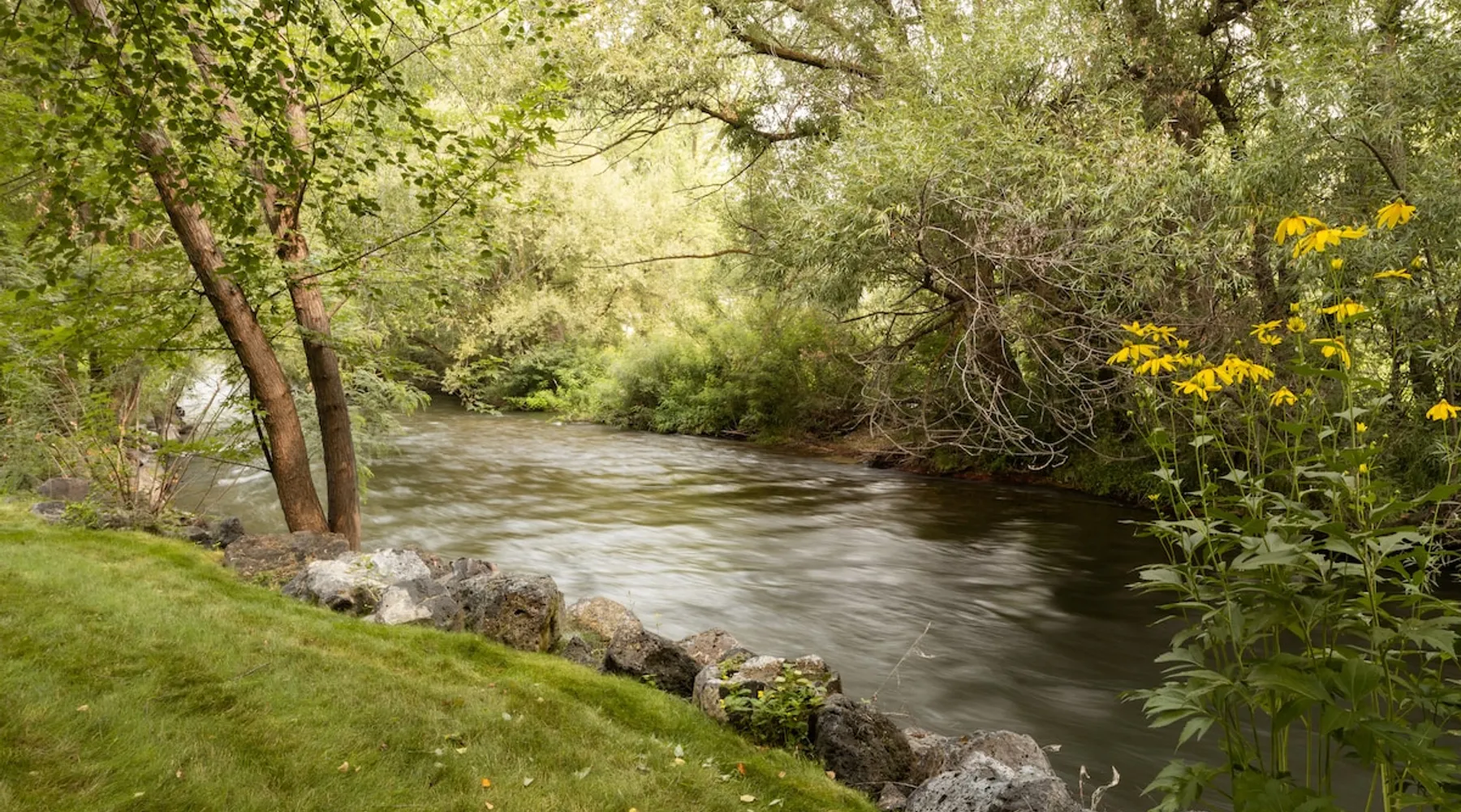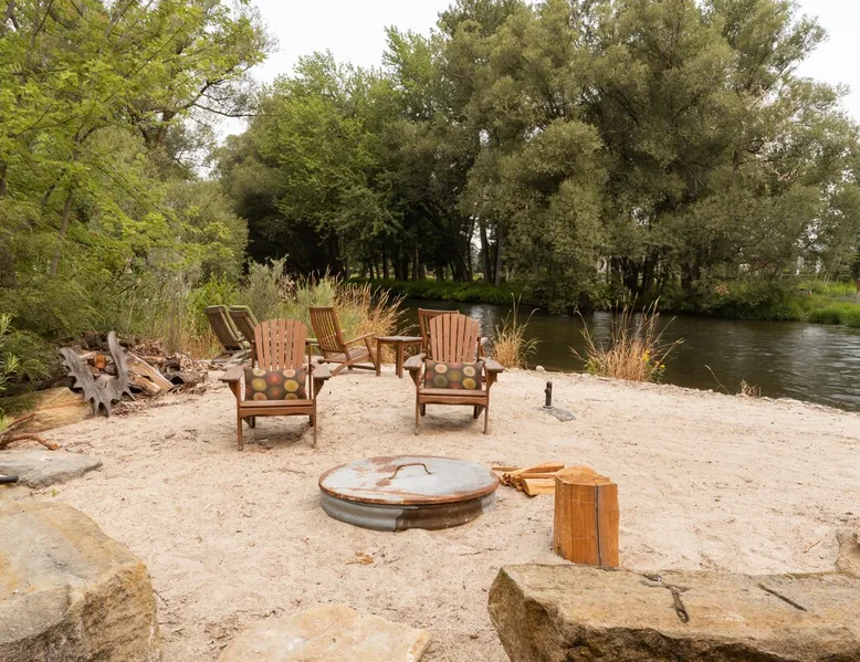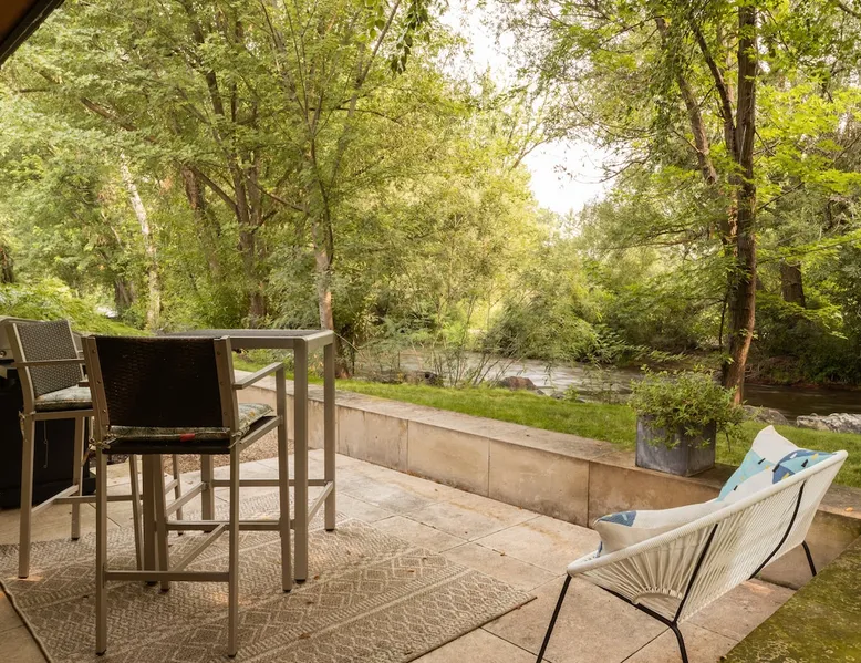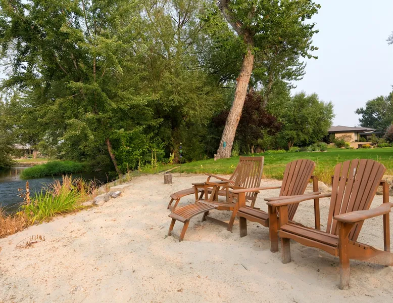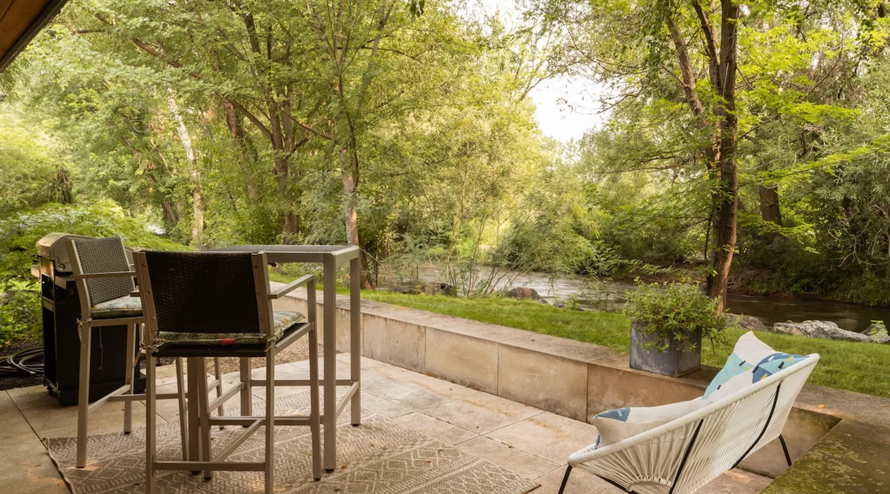 Come for the river view and stay for the relaxation. Our studio is a private, separate guesthouse just a few steps from the south channel of the Boise River. It overlooks the river, has private parking and a private entrance. This studio suite includes a king-size bed, a kitchenette, and a private outdoor patio on the river. The kitchenette includes a range, dishwasher, refrigerator, a portable washing machine, and dryer. The space This space is a private studio with a full bath that was originally designed for in-laws and guests and remodeled to include the kitchen and private patio with barbecue. It is a great place to stay for visiting locals, for exploring the Eagle/Boise/Treasure Valley area, and for travelers passing through Idaho. It has a tremendous view of the Boise river from the interior and the outside patio. Parking and entrance are completely separate from the main house. Guest access There is access to our surrounding gardens, pathway to a private beach on the river, hot tub and swimming pool. There are views of the river on one side of our property and views of a public golf course on the other side of the property. Our lot comprises a little over 1.5 acres. We allow the use of our swimming pool (June-September) and year-around hot tub, please do not adjust hot tub settings. We have an exercise/weight room in the main house that can be shared. Other things to note We frequently see wildlife along the river; especially birds of prey: Heron, Owls, Eagles and Osprey can often be seen fishing. Wild turkey may also wander through the yard. We often see deer and small mammals such as mink, muskrat and river otters. We have river access for guests that enjoy fishing. There is a small private beach a short walk from the guesthouse with chairs to enjoy the river. The river can be quite high during the spring run-off (March-June) and fishing is inaccessible during the high water.