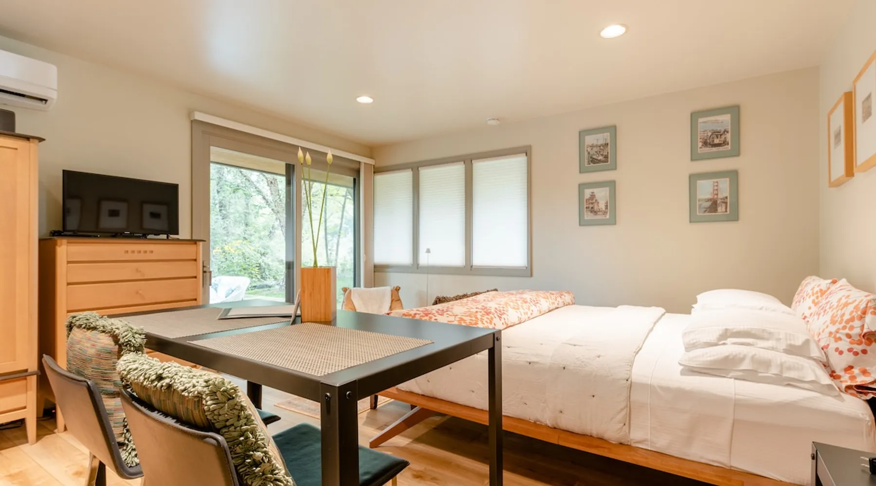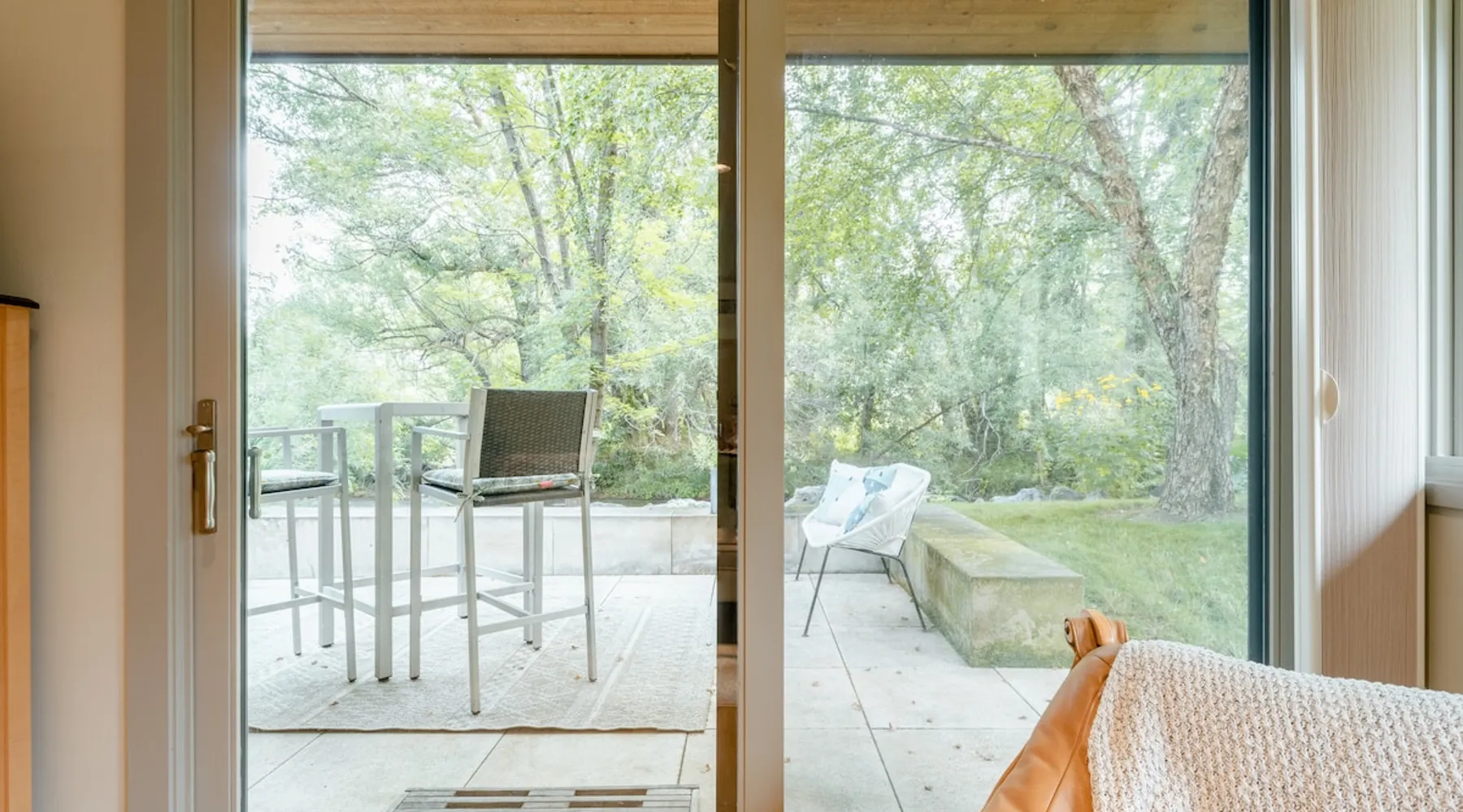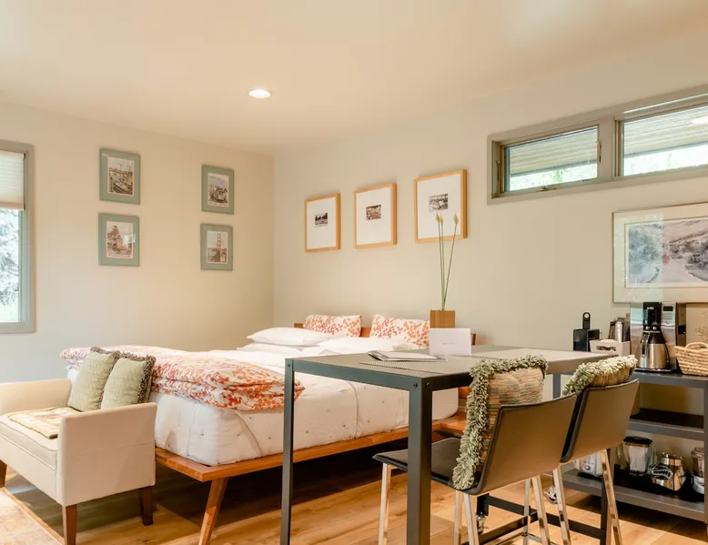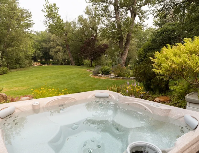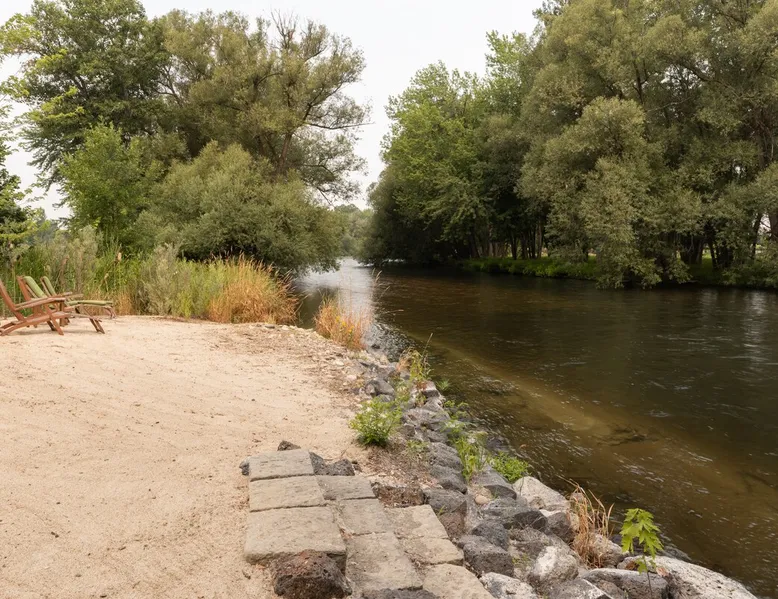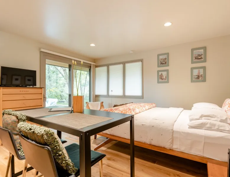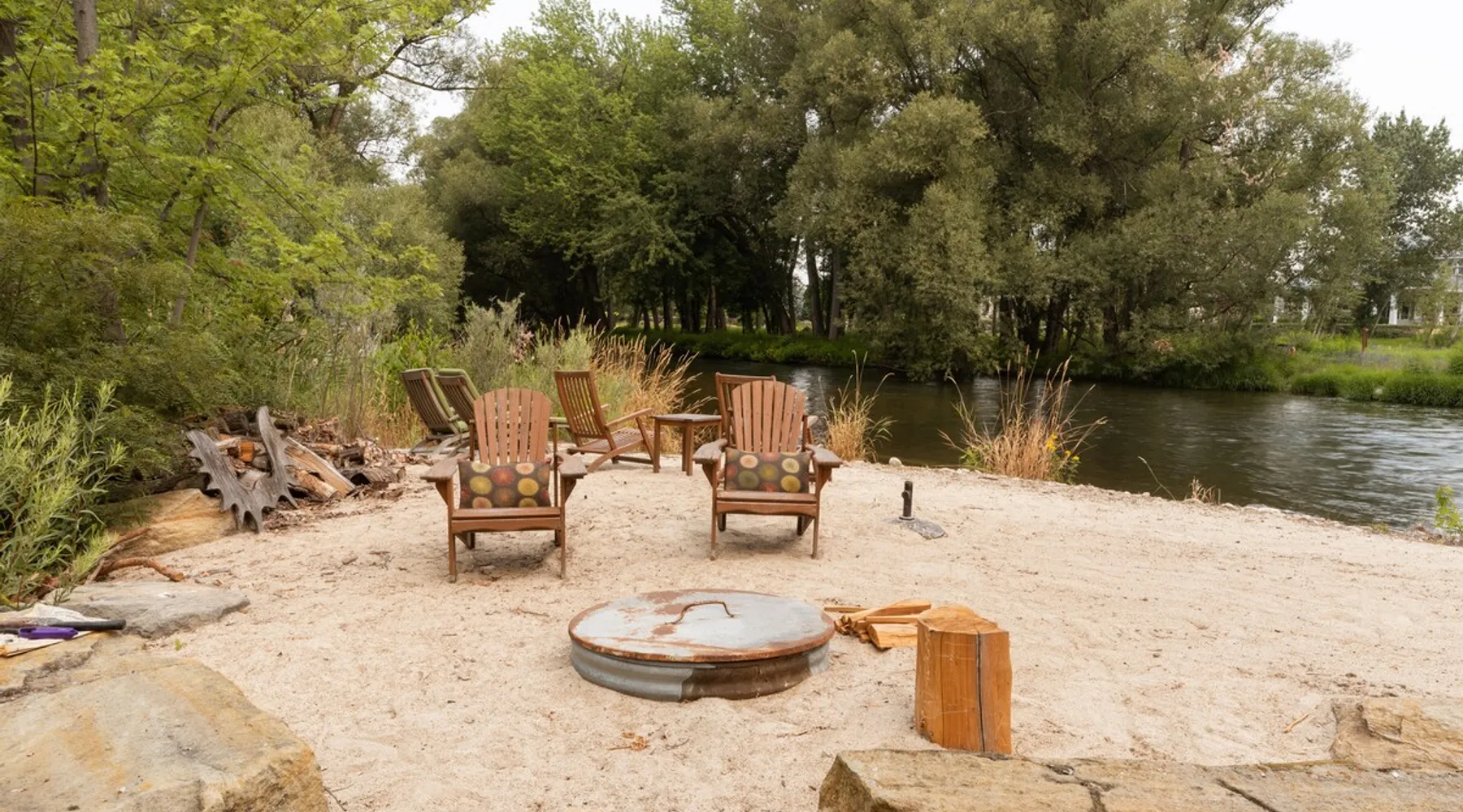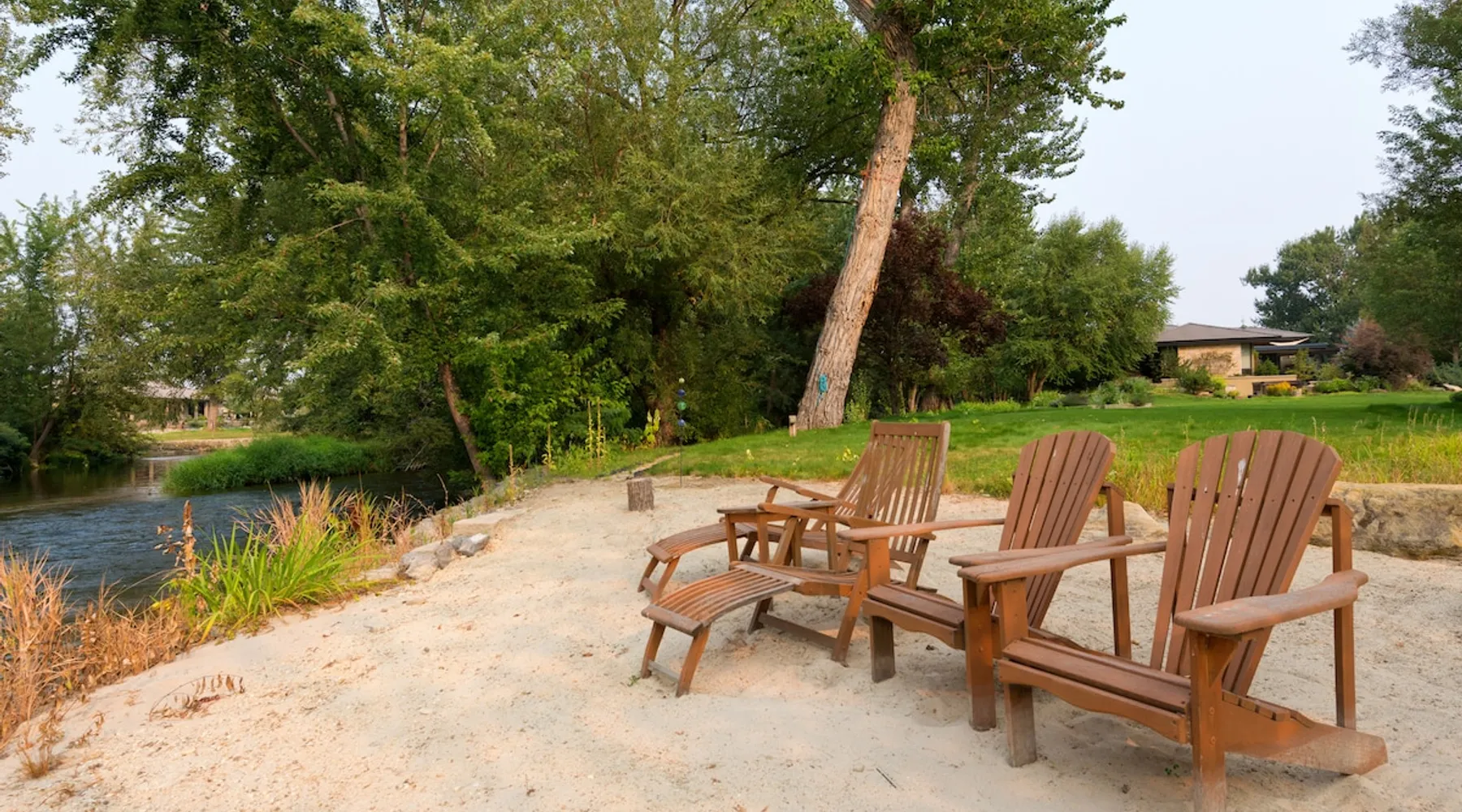 Come for the river view and stay for the relaxation. Our studio is a private, separate guesthouse just a few steps from the south channel of the Boise River. It overlooks the river, has private parking and a private entrance. This studio suite includes a king-size bed, a kitchenette, and a private outdoor patio on the river. The kitchenette includes a range, dishwasher, refrigerator, a portable washing machine, and dryer. The space This space is a private studio with a full bath that was originally designed for in-laws and guests and remodeled to include the kitchen and private patio with barbecue. It is a great place to stay for visiting locals, for exploring the Eagle/Boise/Treasure Valley area, and for travelers passing through Idaho. It has a tremendous view of the Boise river from the interior and the outside patio. Parking and entrance are completely separate from the main house. Guest access There is access to our surrounding gardens, pathway to a private beach on the river, hot tub and swimming pool. There are views of the river on one side of our property and views of a public golf course on the other side of the property. Our lot comprises a little over 1.5 acres. We allow the use of our swimming pool (June-September) and year-around hot tub, please do not adjust hot tub settings. We have an exercise/weight room in the main house that can be shared. Other things to note We frequently see wildlife along the river; especially birds of prey: Heron, Owls, Eagles and Osprey can often be seen fishing. Wild turkey may also wander through the yard. We often see deer and small mammals such as mink, muskrat and river otters. We have river access for guests that enjoy fishing. There is a small private beach a short walk from the guesthouse with chairs to enjoy the river. The river can be quite high during the spring run-off (March-June) and fishing is inaccessible during the high water.
