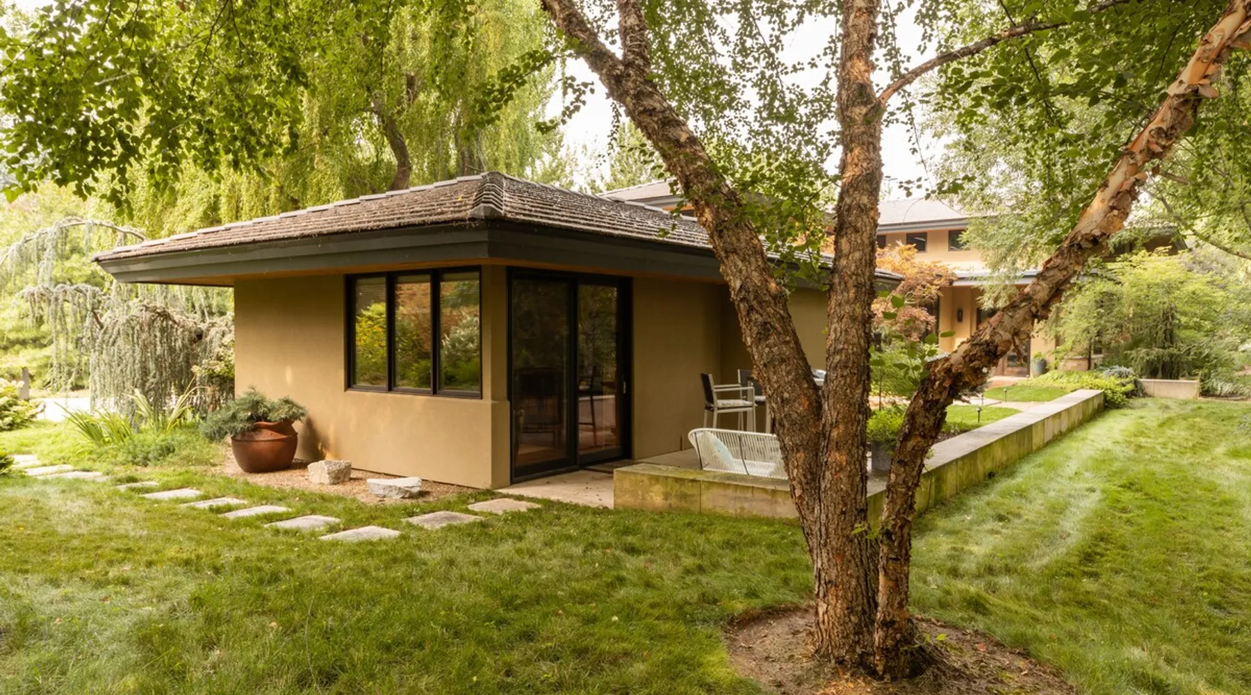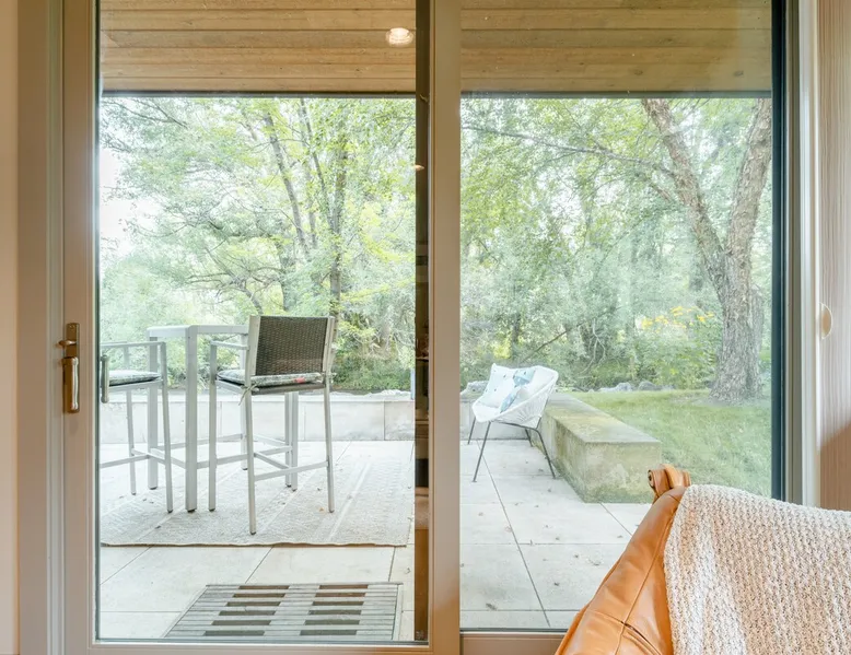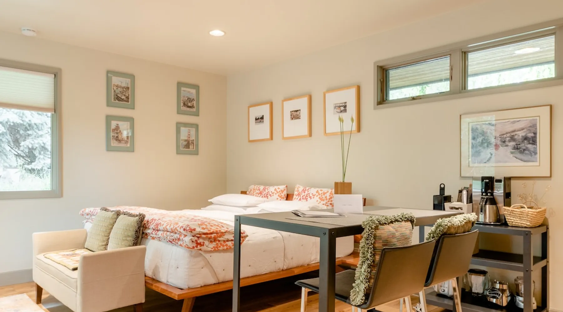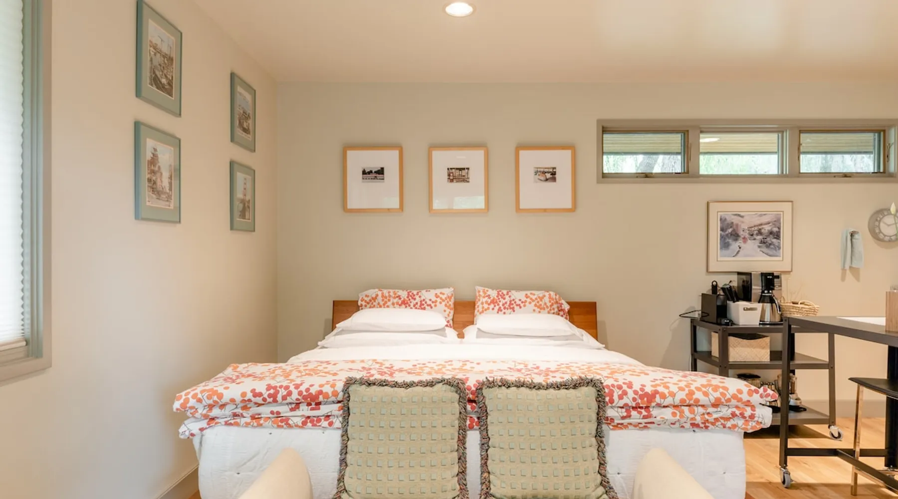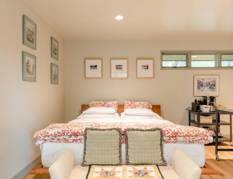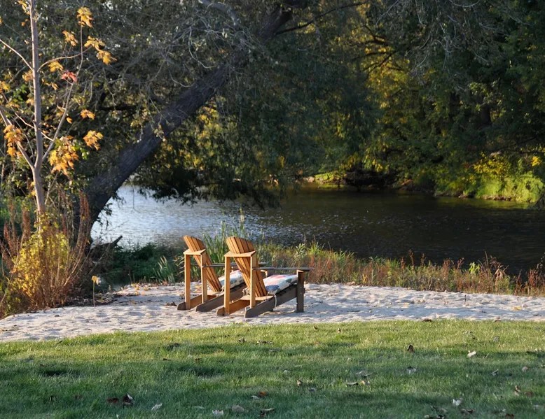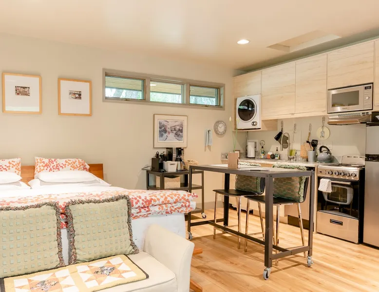 Come for the river view and stay for the relaxation. Our studio is a private, separate guesthouse just a few steps from the south channel of the Boise River. It overlooks the river, has private parking and a private entrance. This studio suite includes a king-size bed, a kitchenette, and a private outdoor patio on the river. The kitchenette includes a range, dishwasher, refrigerator, a portable washing machine, and dryer. The space This space is a private studio with a full bath that was originally designed for in-laws and guests and remodeled to include the kitchen and private patio with barbecue. It is a great place to stay for visiting locals, for exploring the Eagle/Boise/Treasure Valley area, and for travelers passing through Idaho. It has a tremendous view of the Boise river from the interior and the outside patio. Parking and entrance are completely separate from the main house. Guest access There is access to our surrounding gardens, pathway to a private beach on the river, hot tub and swimming pool. There are views of the river on one side of our property and views of a public golf course on the other side of the property. Our lot comprises a little over 1.5 acres. We allow the use of our swimming pool (June-September) and year-around hot tub, please do not adjust hot tub settings. We have an exercise/weight room in the main house that can be shared. Other things to note We frequently see wildlife along the river; especially birds of prey: Heron, Owls, Eagles and Osprey can often be seen fishing. Wild turkey may also wander through the yard. We often see deer and small mammals such as mink, muskrat and river otters. We have river access for guests that enjoy fishing. There is a small private beach a short walk from the guesthouse with chairs to enjoy the river. The river can be quite high during the spring run-off (March-June) and fishing is inaccessible during the high water.