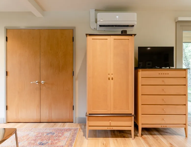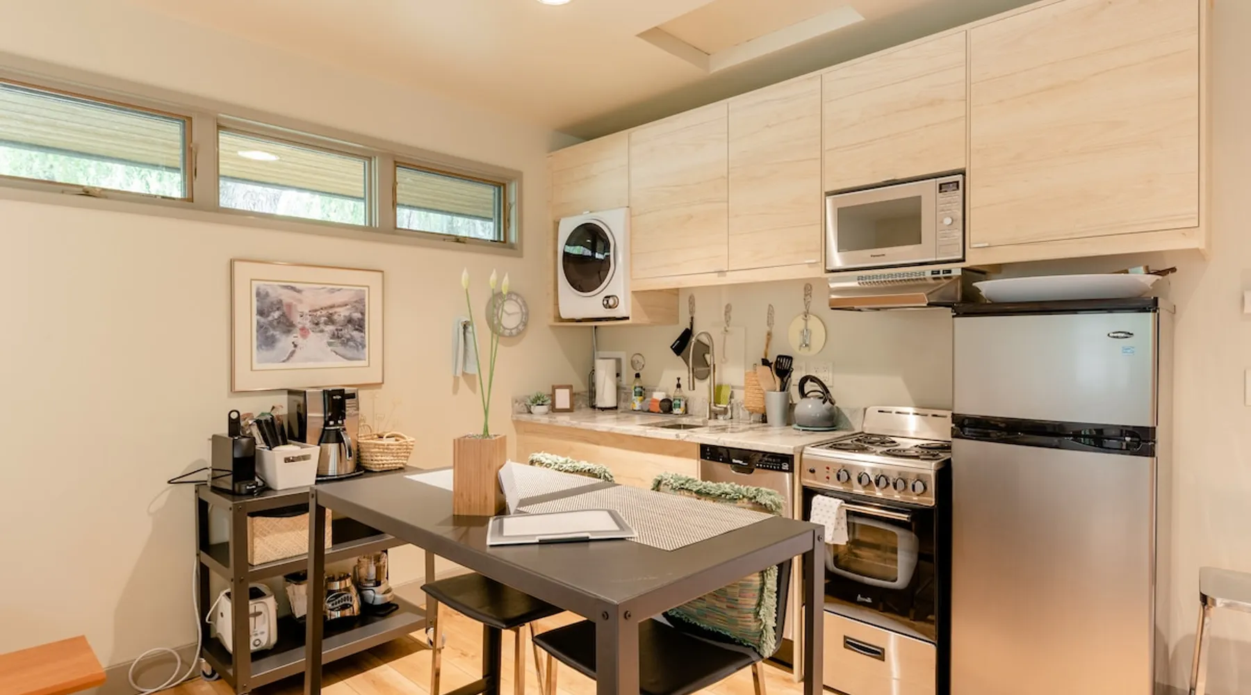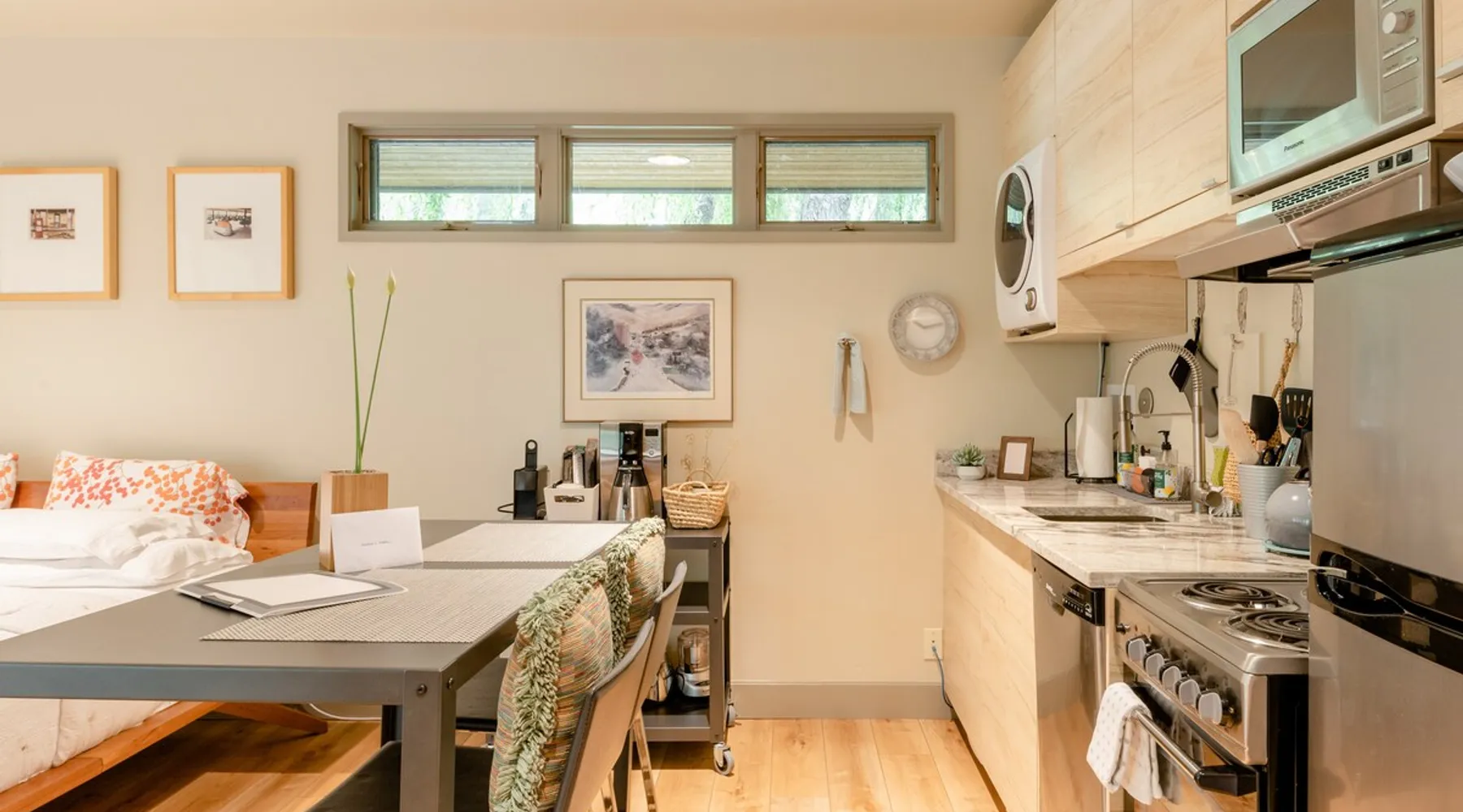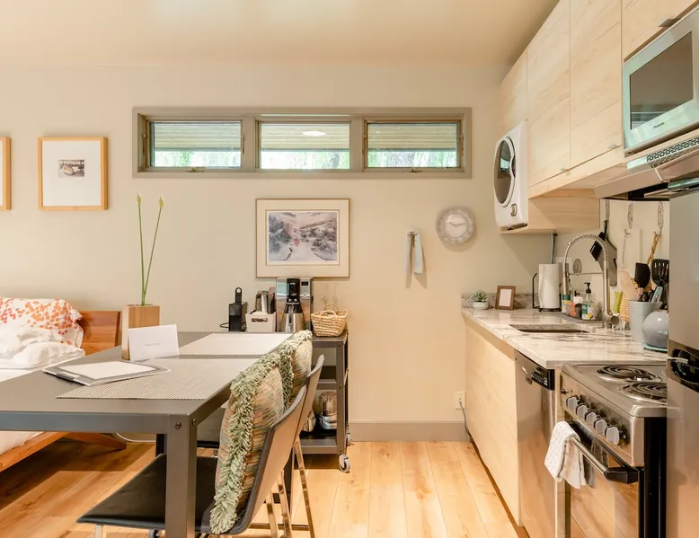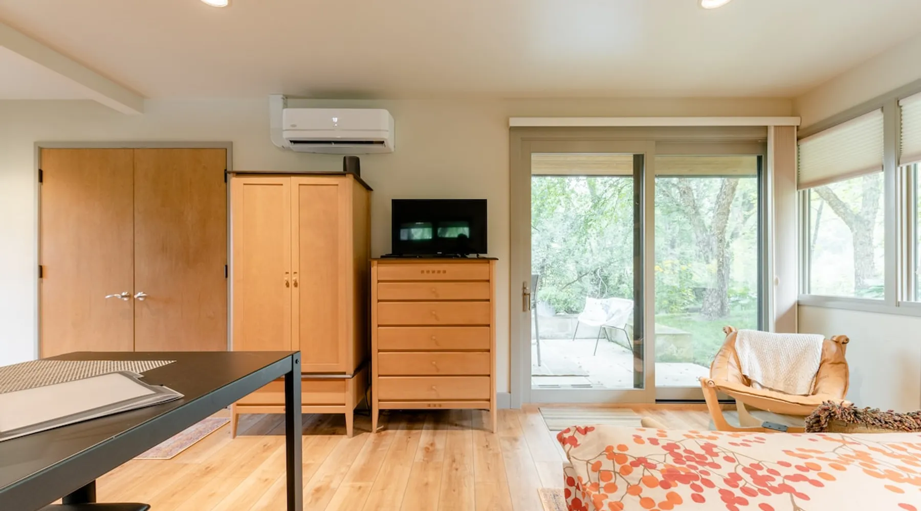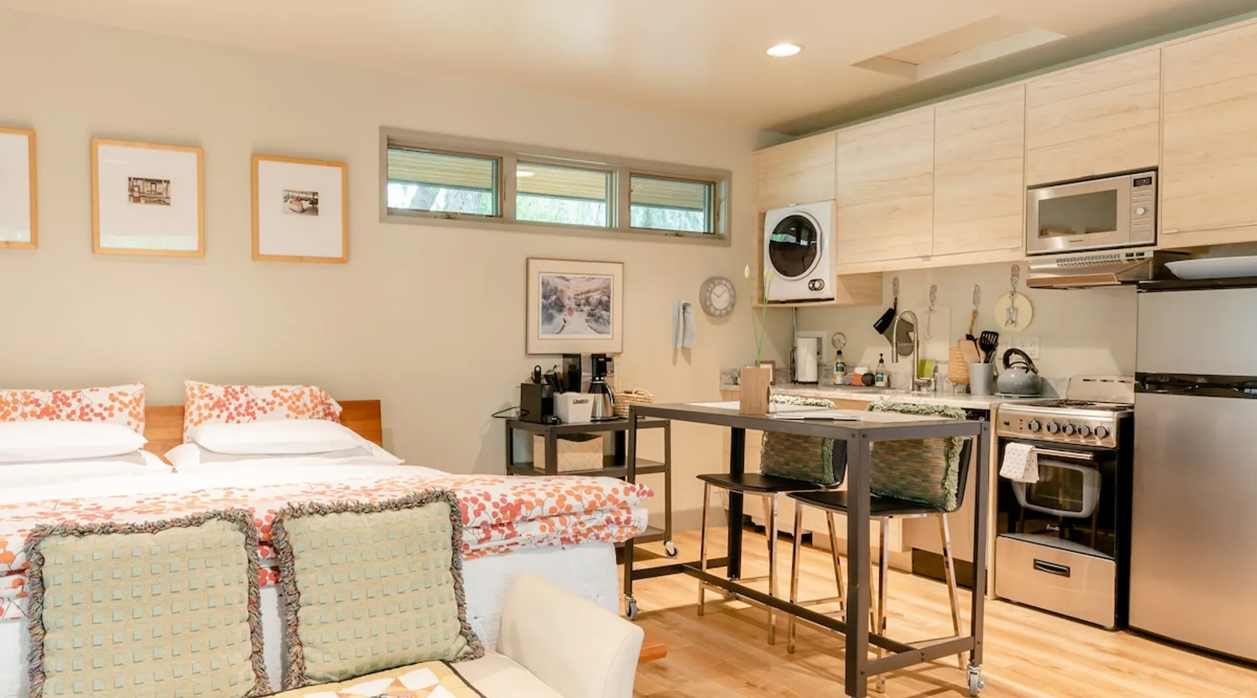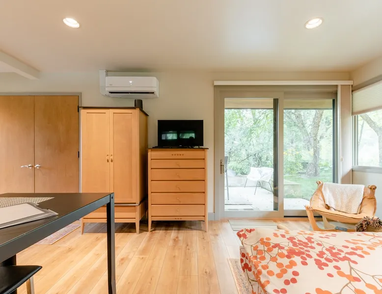 Come for the river view and stay for the relaxation. Our studio is a private, separate guesthouse just a few steps from the south channel of the Boise River. It overlooks the river, has private parking and a private entrance. This studio suite includes a king-size bed, a kitchenette, and a private outdoor patio on the river. The kitchenette includes a range, dishwasher, refrigerator, a portable washing machine, and dryer. The space This space is a private studio with a full bath that was originally designed for in-laws and guests and remodeled to include the kitchen and private patio with barbecue. It is a great place to stay for visiting locals, for exploring the Eagle/Boise/Treasure Valley area, and for travelers passing through Idaho. It has a tremendous view of the Boise river from the interior and the outside patio. Parking and entrance are completely separate from the main house. Guest access There is access to our surrounding gardens, pathway to a private beach on the river, hot tub and swimming pool. There are views of the river on one side of our property and views of a public golf course on the other side of the property. Our lot comprises a little over 1.5 acres. We allow the use of our swimming pool (June-September) and year-around hot tub, please do not adjust hot tub settings. We have an exercise/weight room in the main house that can be shared. Other things to note We frequently see wildlife along the river; especially birds of prey: Heron, Owls, Eagles and Osprey can often be seen fishing. Wild turkey may also wander through the yard. We often see deer and small mammals such as mink, muskrat and river otters. We have river access for guests that enjoy fishing. There is a small private beach a short walk from the guesthouse with chairs to enjoy the river. The river can be quite high during the spring run-off (March-June) and fishing is inaccessible during the high water.