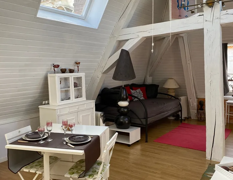 Chez Lancelot is an exceptional and bright loft of 80 square meters, located on the second and top floor of a 17th century house of character, in a private cul-de-sac. Art and heritage lovers will be seduced by this accommodation composed of a large bedroom (bathroom inside), a kitchen area and a very large living room with views of the cathedral. Ideal for a charming stay, or a studious getaway, quiet, in the heart of town, public parking is nearby The space Chez Lancelot is an exceptional and bright 80 square meter loft, located on the second and top floor of a 17th century character house, in a private cul-de-sac. Lovers of art and heritage will be charmed by this accommodation consisting of a large bedroom (en-suite bathroom inside) a kitchen and a very large living room with a breathtaking view of the cathedral. Ideal for a romantic stay, or a studious getaway, in a quiet area in the heart of the city. Other things to note No cleaning fees. No cleaning fees Pet accepted with fees: €15. Pets are welcomed with extra fees : 15€