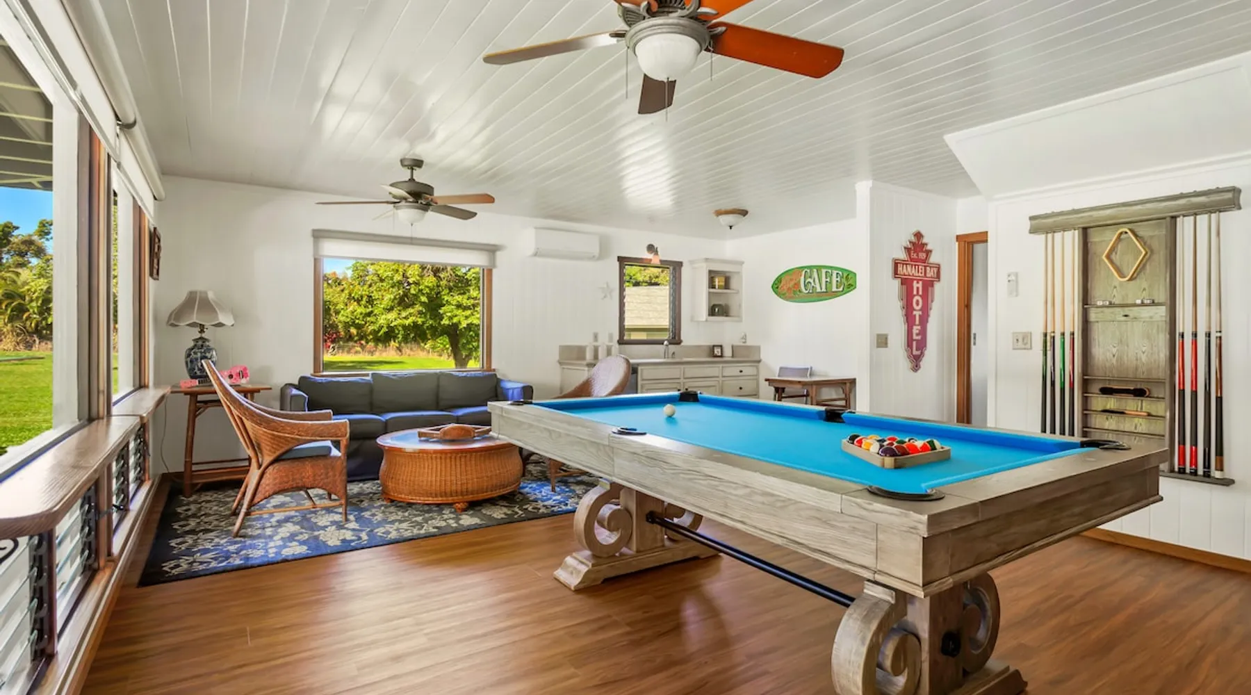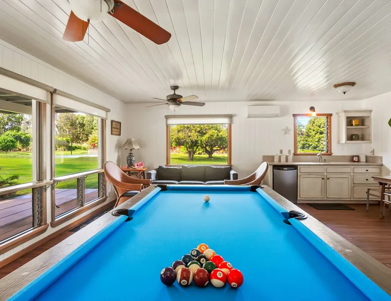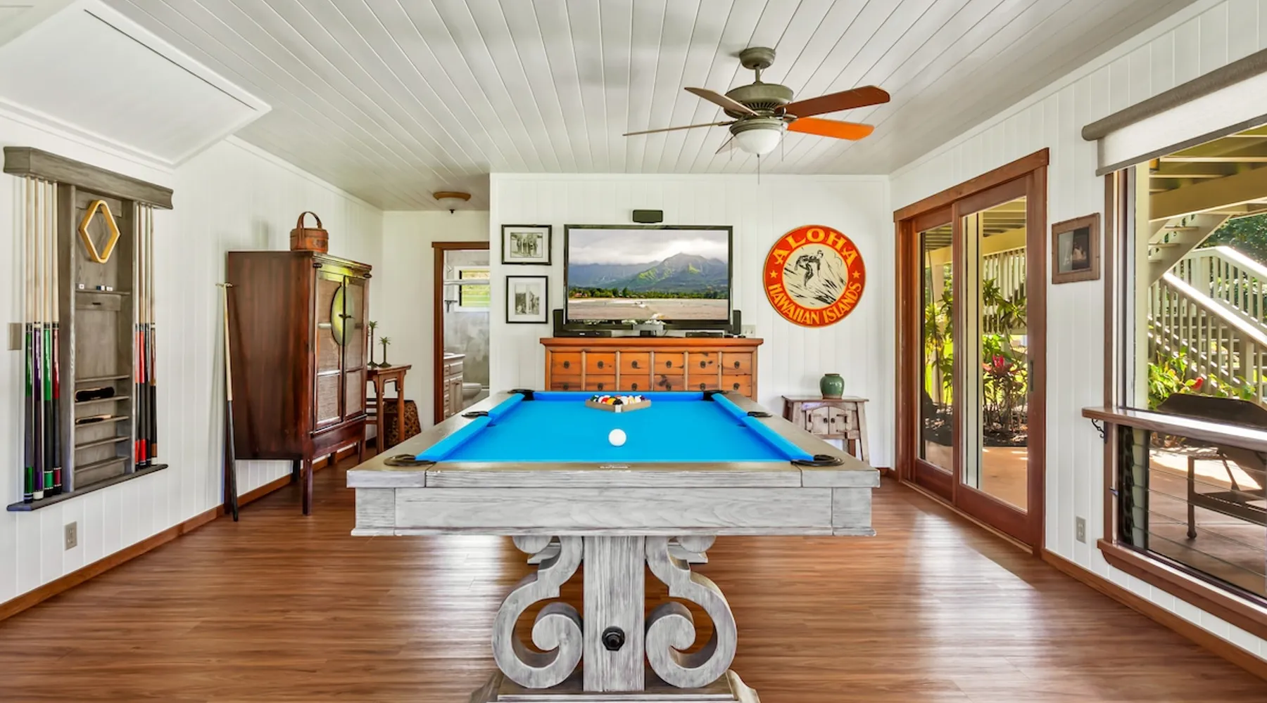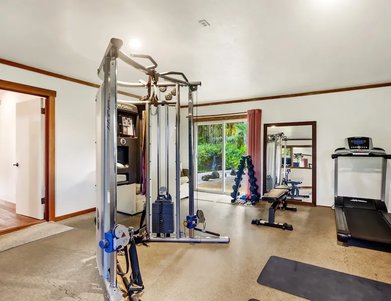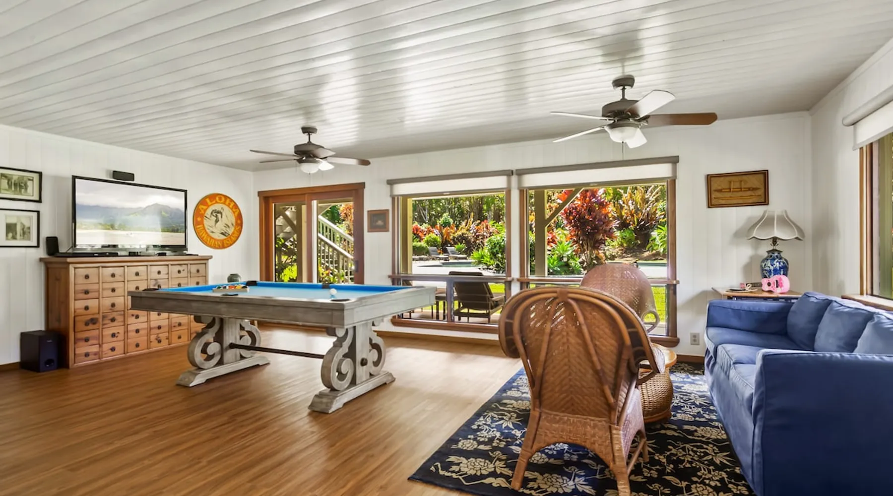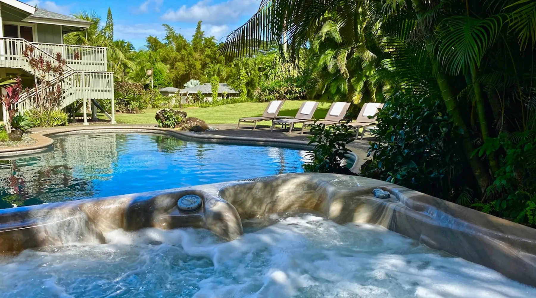 Kauai's #1 Rental for large groups. Huge Pool, Hot Springs Hot Tub, Full Private Gym, Peloton, Air Conditioning in Every Room, Pool Table, Ping Pong, 5 Acres, Fruit Trees, 5+ Bedrooms, Sleeps 10 - 15, Miles Of Trails Directly Behind Home...Minutes From Kalihiwai Bay, Secret Beach, Anini beach and Hanalei Bay. Exclusively Managed by "House Of Dreams Kauai" with over 60 FIVE STAR Reviews online. Look up House Of Dreams Kauai and read our many reviews. The space Because of the many features Ke Aloha offers, all guests that reserve Ke Aloha Estate on Airbnb must sign our rental agreement which indemnifies owners and agents and describes all terms and conditions governing this Kauai vacation home. Guest must also comply with all terms and conditions and supply House Of Dreams Kauai with the names of all occupants as well as a valid email address, on island phone contact and home address. Feel free to contact us prior to reserving if you wish to review the agreement. Rates are based on 10 guests. Additional fees are charged for larger groups. The fee is $75 per person, per night plus tax. Kauai’s #1 rental is now even better. The current photos do not show the newest upgrades, which include brand new multi-level decking with shaded areas, refinished pool decking, and resurfaced garage, kitchen renovation, 2 bathrooms converted to walk-in showers, new furniture, and new art provided by Aaron Feinberg Gallery in Hanalei. Photos should be coming soon. Peak Holiday and Summer Seasons have a 7 night minimum. We will consider shorter stays when it aligns with our calendar and surrounding reservations. Kauai County Requirements TVNC - 4267 - TA-105-498-4192-01 24/7 On Island PN-808-755,5869 Glenn **THIS HOME IS LOCATED IN A TSUNAMI ZONE** Ke Aloha is owned and managed by "House Of Dreams Kauai" rentals. Look us up so that you can read the many reviews we have about this home and our customer service. With 70 FIVE STAR reviews online, you will feel quite comfortable placing your trust in our hands. PRIVATE GYM with Peloton Bike, Precor/Icarian Smith Machine + 550 Pound Free Weights. Precor Icarian FTS Functional Training Workstation. These are the highest quality commercial machines available. From the moment you set foot on Ke Aloha's beautiful grounds, you will discover something truly special. Your five acres of paradise will envelop you in a warm embrace, inviting you to leave behind the hustle and bustle of everyday life and immerse yourself in the serenity of Kauai. In this private sanctuary, you will find the perfect backdrop for creating cherished memories together. The gentle sounds of the waterfall and the sight of Koi gracefully swimming in the pond will become the soundtrack to your days, while the breathtaking Namahana Mountain range serves as your backdrop. With each sunrise, you awaken in fully air-conditioned rooms, feeling like you were in a dream that you never wanted to end. The amenities are nothing short of extraordinary. The private gym, with Icarian Equipment, will become your invitation to stay active, while the spacious living areas provide the ideal setting for laughter and connection with loved ones. Whether a friendly game of ping pong and pool or a moment of stillness on the meditation platform, every corner of Ke Aloha Estate reverberates with joy and togetherness. As you explore the miles of hiking trails that seamlessly blend nature with adventure, you might feel invigorated and at peace. The Stone Dam and its stunning waterfall park will become a favorite retreat, where you can let your minds wander and reconnect with each other and the beauty of Kauai. A recent guest wrote the following. "Your estate has given us so much more than a place to stay; it has gifted us a sense of abundance and tranquility. You have created an oasis that serves as our “Home Away From Home,” providing a haven for our family to gather, celebrate, and simply be together, free from the crowded chaos of the outside world. As we reflect on our time spent within your magical embrace, we are filled with gratitude. Thank you for offering us a glimpse of the Aloha Spirit, for accommodating our every need, and for allowing us to make lasting memories in this special place. Your dedication to maintaining the highest standards shines through and is felt in every detail. We look forward to the day we can return to your enchanting paradise and continue our journey of love, laughter, and connection. Until then, we will carry the spirit of Ke Aloha in our hearts, reminding us of the beauty and abundance that awaits us." Ke Aloha's 5 acres provide everything you need to experience Kauai in your very own "Home Away From Home". We understand the importance of providing an alternative to crowded hotels or the risks of dining in jam-packed restaurants. What better way to travel safely than having your very own 5-acre private resort, pool, gym, pickleball, and miles of hiking trails, accessible from your very own backyard? Bedroom 1 - King and Ensuite Bathroom (Upstairs) Bedroom 2 - King Shared Full Bathroom with Bedroom 3 (Up) Bedroom 3 - King (Up) Additional Half Bath (Up) Bedroom 4 - Queen Shared Full Bathroom with Bedroom 5 (Lower) Bedroom 5 - Twin over Full Bunkbed (Lower) Additional Queen Bed in a separate area with adjacent Full Bathroom, extra queen sofa bed - Available By Request Only Outdoor Shower Larger groups of up to 16 may be considered pending owner approval. Additional fees apply. 7-night minimum peak & holiday • 5-night minimum all off-peak weeks WEDDINGS - For weddings, we require a 7-night rental. There is a $3500 site fee in addition to the rent. We allow weddings of up to 50 guests. Additional terms and conditions apply. POOL HEATING IS ADDITIONAL - Currently offered at $100 Per Day + Tax. A mid-stay cleaning at $50 per hour is required for stays over 8 nights. Mid-stay cleanings range between $140 to $280 + GET Tax. Fees are as follows... Hawaii State TAT/GET Taxes are 17.96% - 18.7
