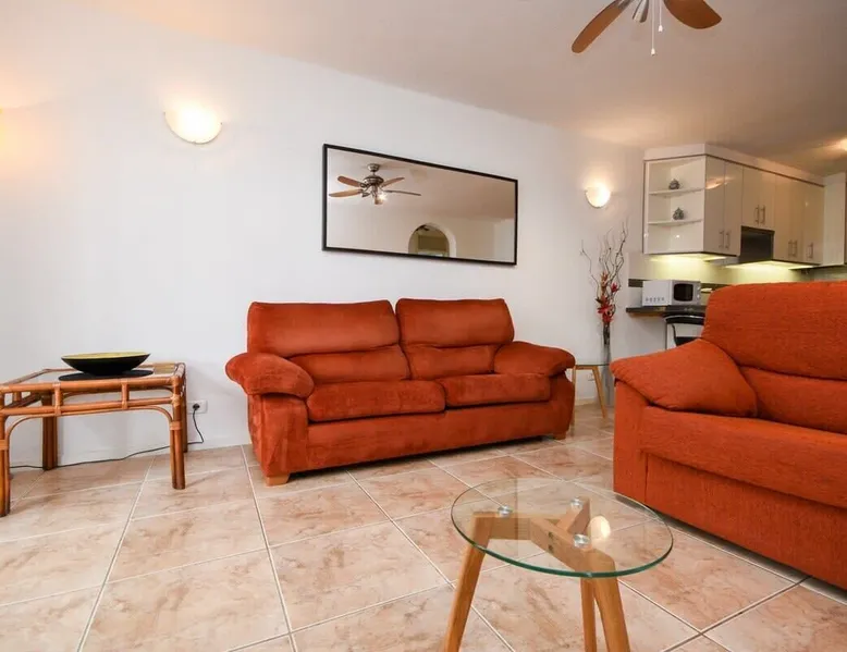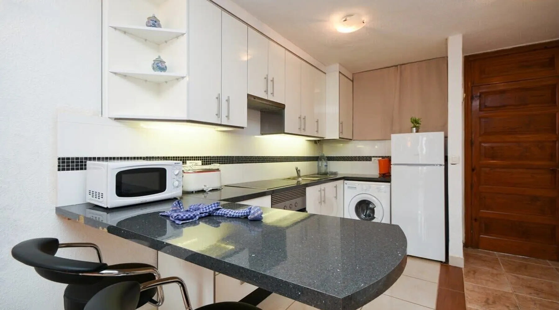 Summary: This two bedroom apartment is nice furnished and is situated on the popular Parque Santiago I complex in the Playa de las Americas resort in Tenerife. It is well equipped and includes a washing machine. The Space: Situated in Tenerife's Playa de las Americas resort, this fully refurbished two-bedroom apartment is located on the first floor of the Parque Santiago I complex. With its prime location, inviting pool area, and convenient amenities, guests can enjoy a memorable holiday experience in this vibrant and well-equipped complex. Inside the apartment the spacious living area offers a comfortable and airy ambiance with two sofas and a flat-screen satellite TV. Step through the patio doors onto the double balcony, furnished with a delightful patio table and chairs. The modern kitchen is fully equipped, including an oven, ceramic hob, tall fridge/freezer, washing machine, microwave, toaster, kettle, and a breakfast bar with stools. The master bedroom features a king-size double bed, bedside tables, lamps, and patio doors opening onto the double terrace. The second bedroom provides two single beds, accompanied by a bedside table and lamp. Please note that a z-bed is available for the 5th guest. The refurbished bathroom showcases a walk-in shower, wash hand basin, and WC. For added security, a safe is provided. Guests can enjoy the use of sun loungers around the pool, with a small charge applicable. A refundable security bond of 100 euros is required, which will be reimbursed at the end of the stay. WiFi routers are available for hire upon request.