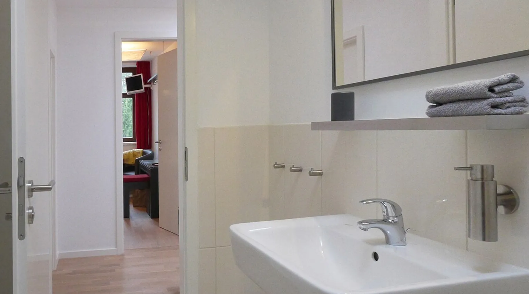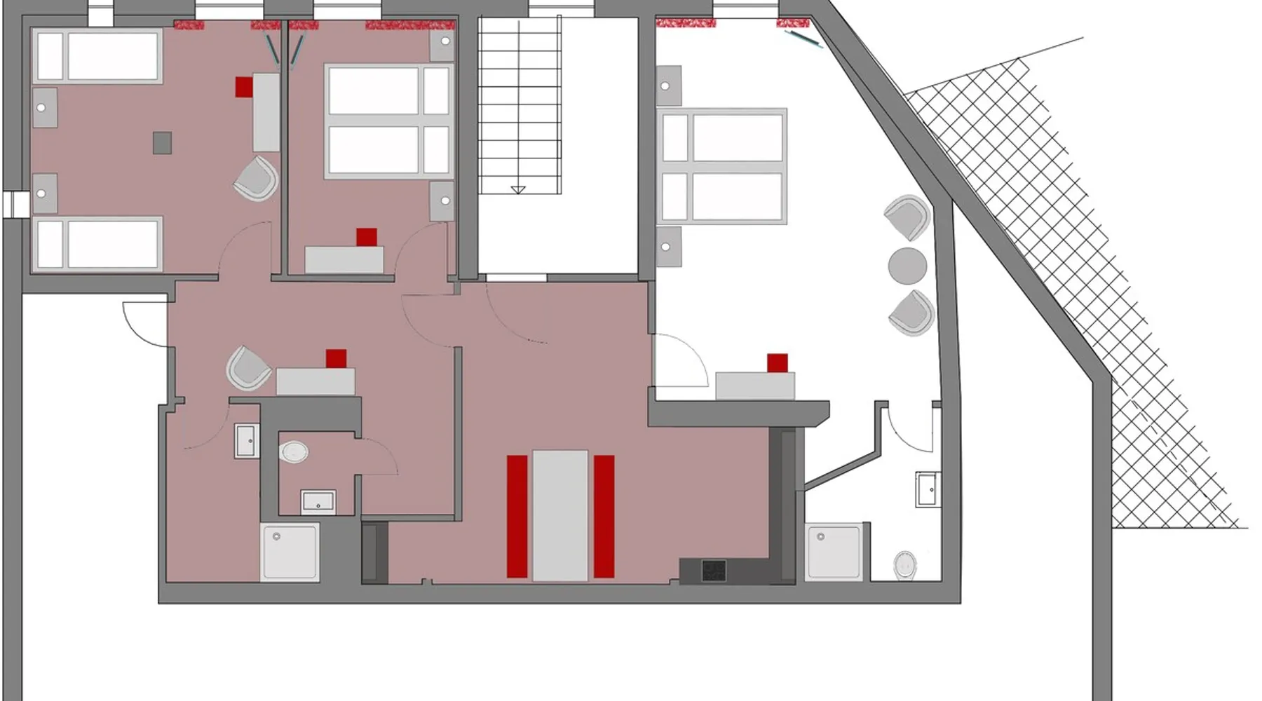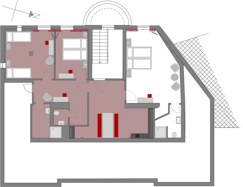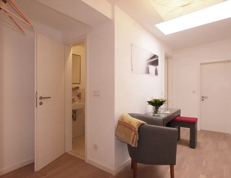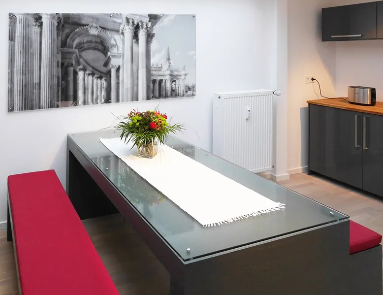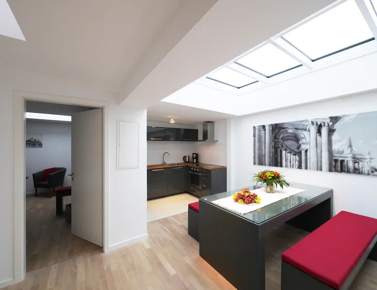 In the heart of Potsdam, located directly on the Heiligen See and the castle Cecilienhof, we offer apartments can be occupied by 2, 4 or even 6 people for a overnight stay or more overnight stays or more. All rooms have access to a full kitchen. The space Walking distance to the historic city center in 5 minutes and a huge park with lake access right across the street, these are the advantages of our apartments. Guest access Our apartments are located in the attic of the historic villa. The attic is divided into 120 m2 into three units. An overview gives you the photo with the map. This apartment is divided into a hallway and two separate bedrooms. In addition to a toilet room, the apartment of course has a spacious bathroom with shower. The modern kitchen is shared with a 2-person apartment, which is also located in the attic, but that is only if this is rented in parallel. Due to their interesting layout, the entire floor can also be used for up to 8 people. During your stay I am available for any questions.