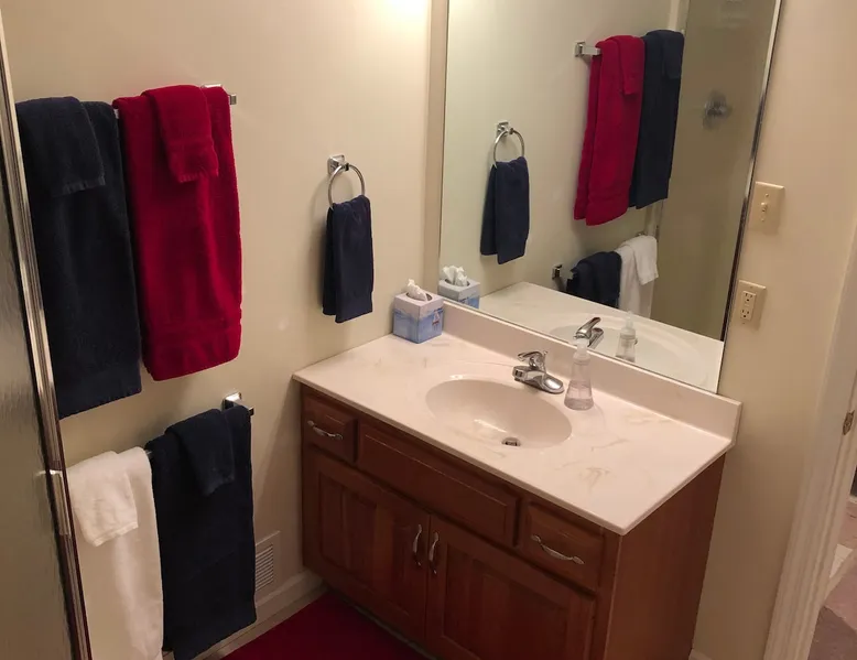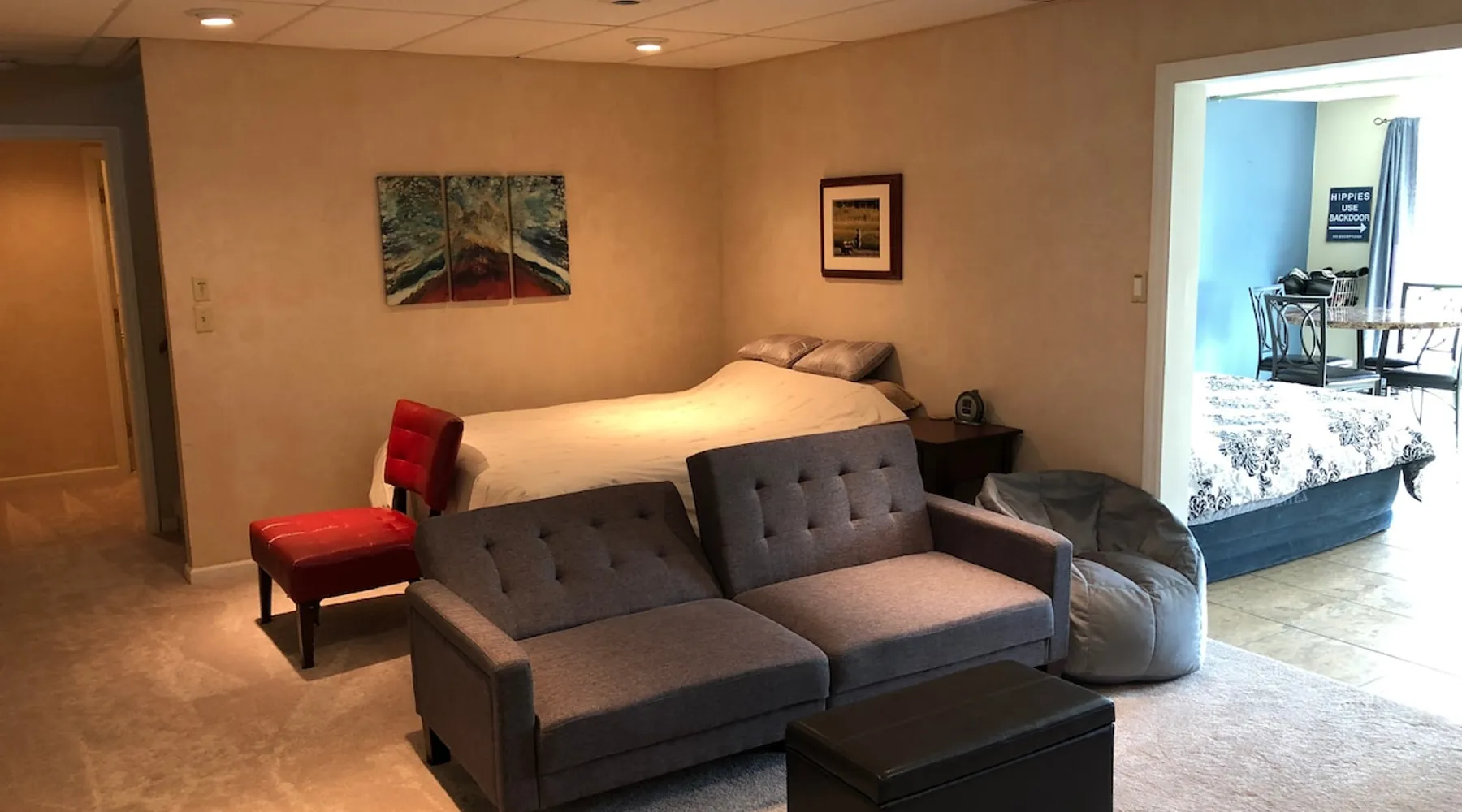 You get the entire lower level of a house in a nice neighborhood. Full use of the big, fenced-in backyard, including deck and patio. 2.5 miles to downtown or 3.3 miles to Beaver Stadium (straight line). Space includes 1 queen bed, 1 sofa bed, 1 premium bed-height queen air bed (if needing more than 1 bed). An additional air bed is available. The space The area is 2 very large rooms plus a full bathroom and closets. The space includes a queen bed, queen luxury pillowtop airbed, and sofabed along with seating areas, TV, games, and air hockey. Also elliptical machine if desired. Includes fridge, microwave, & Keurig. Coffee and coffee condiments included. Entire household is vaccinated. Guest access The entire lower level is all yours. You would share the backyard/BBQ with me and my family, including my dog; but we could keep clear for you to have it dedicated if you let me know when.