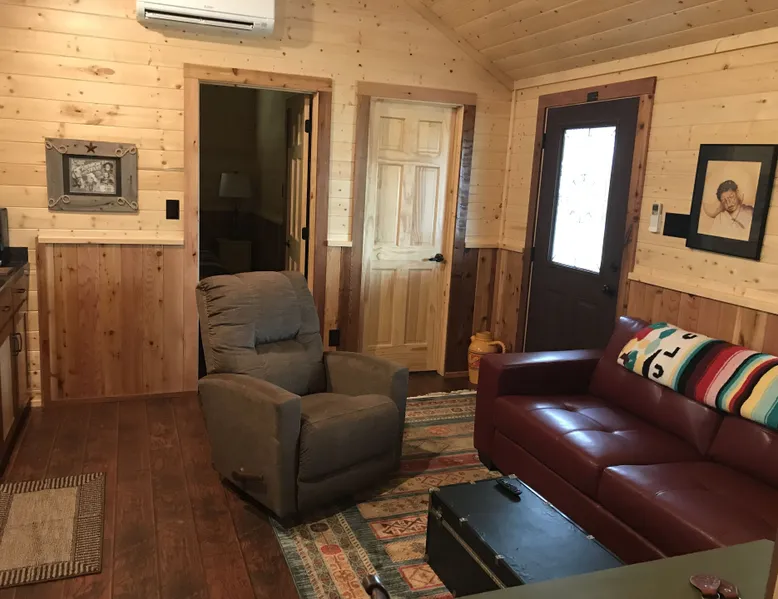 Quiet secluded cabin, on top of a hill, with view of Brazos River Valley. (Note, road leading to this cabin is steep and unpaved, so it might be daunting to guests not accustomed to country living.) Our home is at top of the hill and we have driven this road for 22 years - without 4-wheel drive. * Located on 38 acres with Brazos river access. There is a riverside patio and fishing deck just a quick car ride down the hill. When the river is low, there is also access to a nice beach great for children to play in shallow water, and hunting for fossils and arrowheads. Two queen bedrooms plus a sofa with linens provided for extra sleeping for a child or teen. All towels and linens provided. Children and pets welcome. Fully furnished kitchen - all you'll need to bring is your food. Direct TV, Wifi, propane grill, washer/dryer. Just 10 minutes from historic Glen Rose, and 20 minutes from Dinosaur Valley State Park, Fossil Rim Wildlife Park and Dinosaur World.