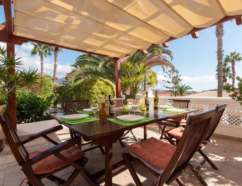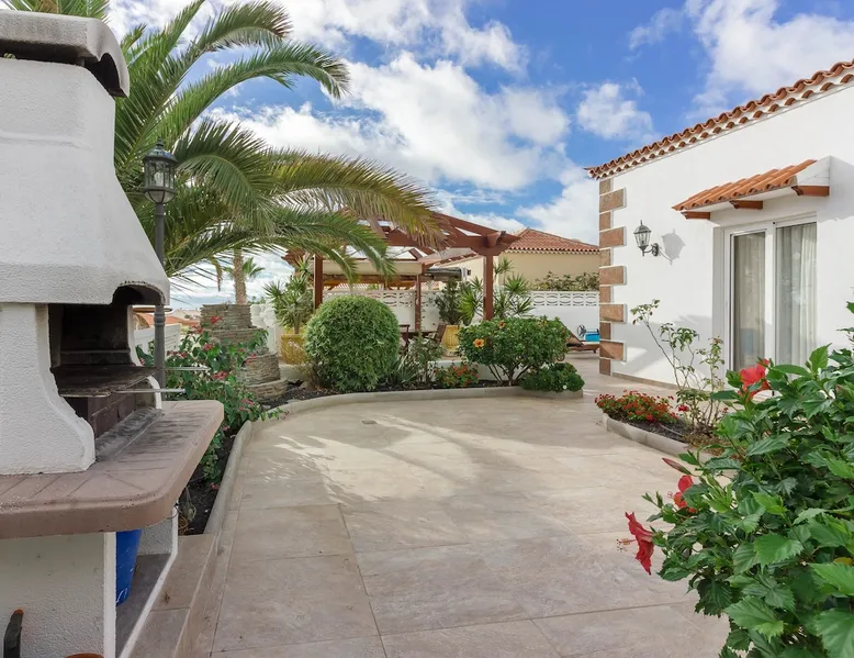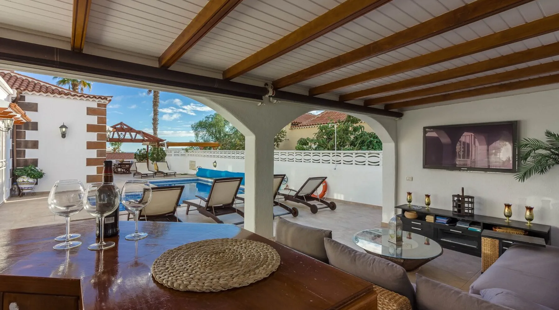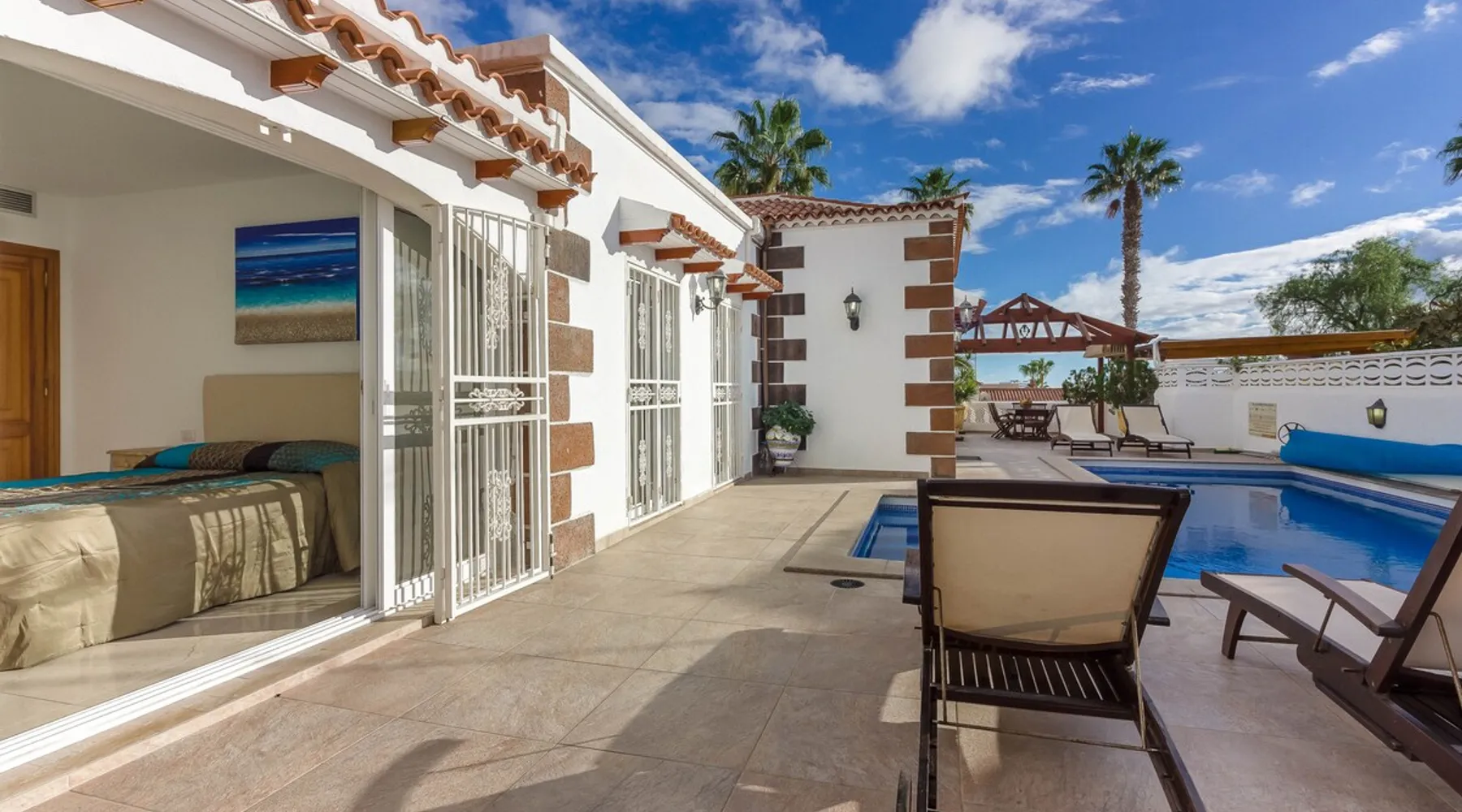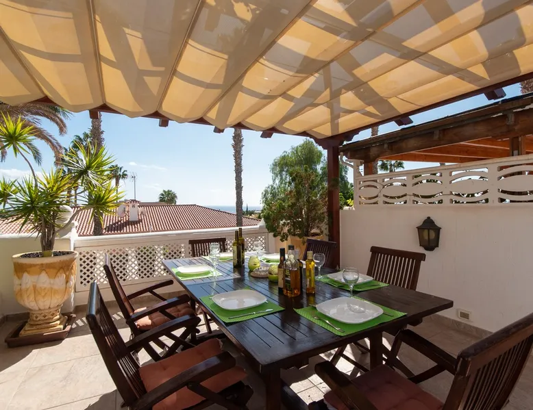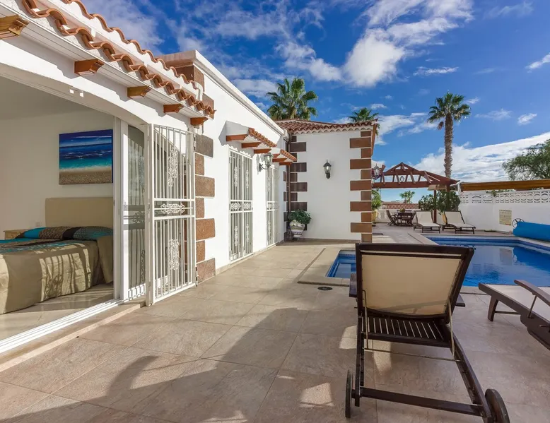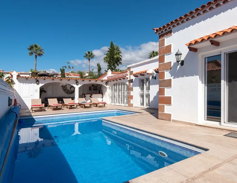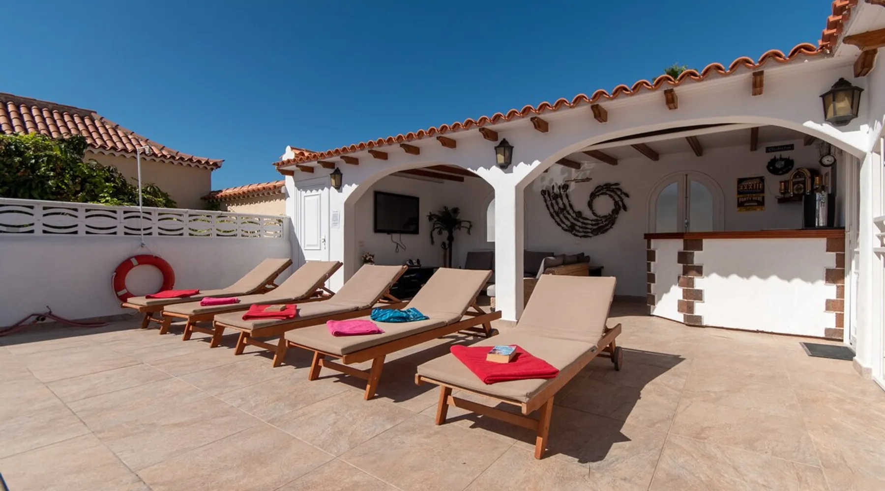 The holiday you’ve been dreaming of is waiting for you at this beautiful villa in Tenerife. Perfect for families or taking a group trip. You’ll have 4 large bedrooms all with air conditioning and 4 bathrooms, giving everyone the space they need to stretch out and relax after a day of fun. The space OUTDOOR BAR AREA NO LONGER HAS A TV! THIS HAS BEEN REPLACED WITH A PICTURE ON THE WALL! All on one level, the interior was carefully designed to ensure you have the pleasurable retreat you deserve. The kitchen offers an excellent modern motif with granite work tops, quality stainless steel appliances, and a convenient breakfast bar. A vaulted ceiling soars above the living room/dining room area with leather couches and a flat screen TV that offers UK channels. Outside on the terrace you’ll find a private place to enjoy the perfect weather Tenerife is known for. Settle in next to the heated L shaped pool on one of the many sun loungers and bask in the sun or enjoy an outdoor meal under the unique pergola with partial sea views. And the outdoor bar area with fridge includes sofas under shaded roof which is a great place to unwind with your fellow travelers. This peaceful home will rejuvenate your spirit when you need it most. Schedule your holiday today! This villa is maintained on a regular basis to a high standard and the property manager is very hands on if any problems arise. Due to popular demand we charge a small additional fee for school half term holiday weeks, if you process a booking over a school half term holiday week you will be notified of this fee. We require all young groups to contact us before making a booking. Also make sure you contact us before you wish to make a booking over the New Year period without the Christmas day period being booked first. Facilities: General: iron with board, bathroom towels, pool towels, linen, hair dryer Kitchen: oven/hob, american fridge/freezer, dishwasher, coffee machine, kettle, microwave, toaster, breakfast bar for 4, granite worktops Utility: washing machine, tumble dryer Diner: dining table for 6, air conditioning Lounge: 3 seater sofas (x3), 42 inch flat screen TV, offers all UK channels + sky, air conditioning, patio doors to terrace (x3) Bedrooms: Bedroom 1: king size bed, fitted wardrobes, air conditioning, ensuite, patio doors to rear terrace Bedroom 2: king size bed, fitted wardrobes, air conditioning, ensuite, patio doors to pool terrace Bedroom 3: king size bed, air conditioning, ensuite, patio doors to pool terrace Bedroom 4: single beds (x2), fitted wardrobes, air conditioning, patio doors to pool terrace (x2) Bathroom: Bathroom: toilet, sink, shower cubicle En suite (bedroom 1): toilet, sinks (x2), shower cubicle En suite (bedroom 2): toilet, sink, bath with shower attachment En suite (bedroom 4): toilet, sink, shower cubicle Exterior: several terraces, dining table for 6, bar area with fridge including comfortable sofas, shaded pergola (x2), purpose built BBQ, gardens, shower room, sun loungers, Pool: private heated pool size: 8 x 3 meters, constant depth: 1.2 Disabled friendly: yes – but 10 steps from pavement to villa Other things to note Please note: Pool heating is included in the price between the months of November to April unless stated. Pool heating outside these months may be included but can be confirmed upon request. If you require pool heating outside these months this can be arranged at a small cost upon request. Registration Details Canary Islands - Regional registration number VV-38-4-0103851