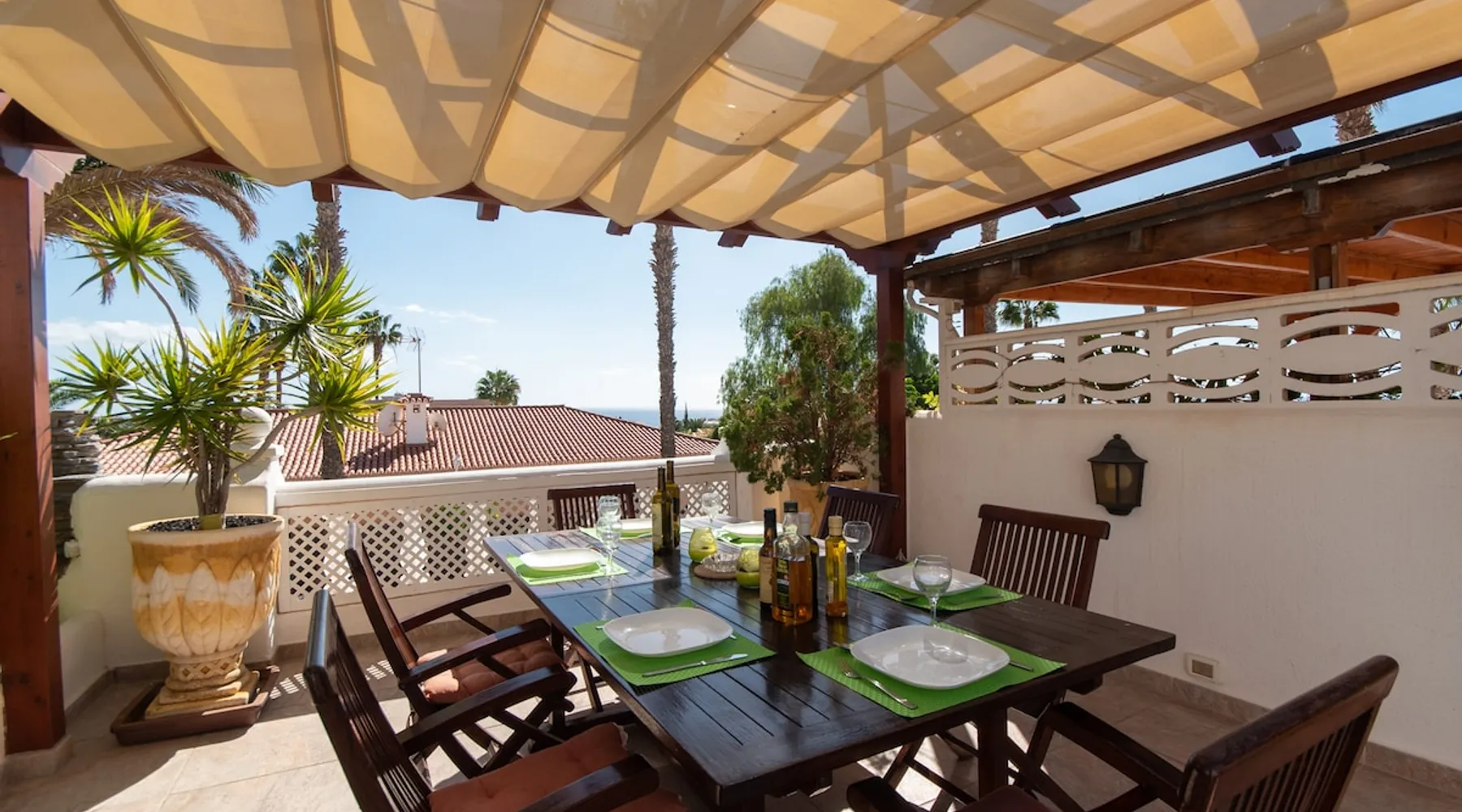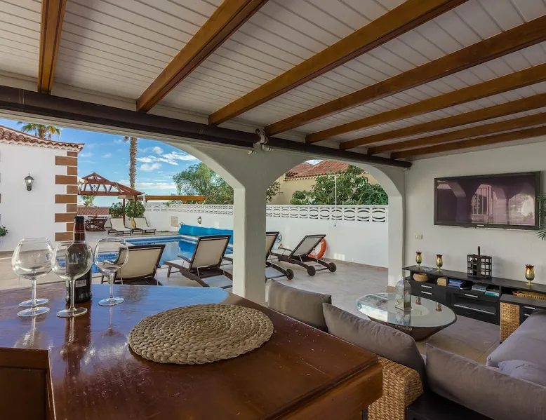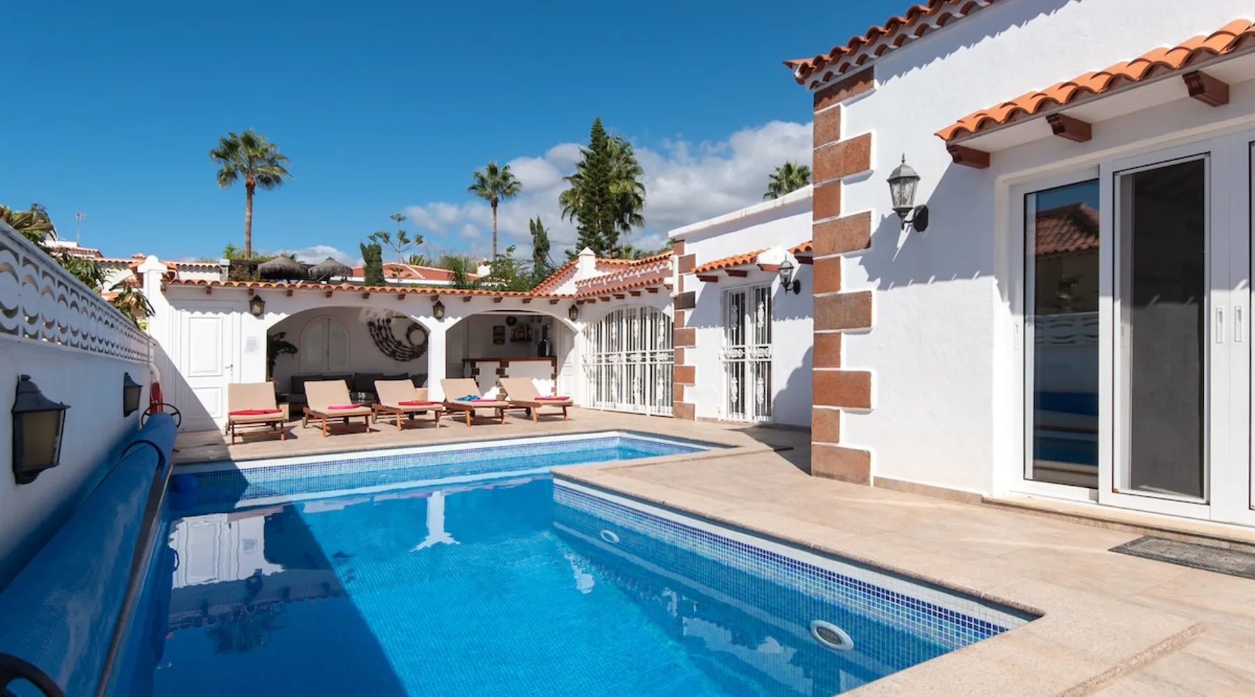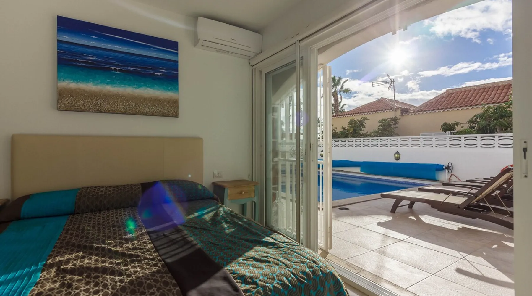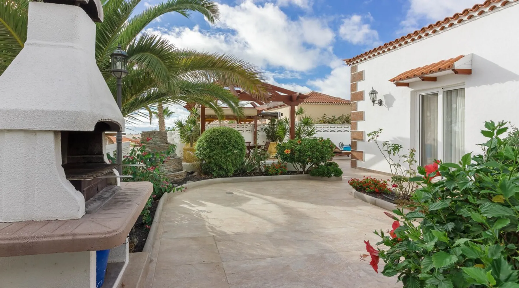 The holiday you’ve been dreaming of is waiting for you at this beautiful villa in Tenerife. Perfect for families or taking a group trip. You’ll have 4 large bedrooms all with air conditioning and 4 bathrooms, giving everyone the space they need to stretch out and relax after a day of fun. The space OUTDOOR BAR AREA NO LONGER HAS A TV! THIS HAS BEEN REPLACED WITH A PICTURE ON THE WALL! All on one level, the interior was carefully designed to ensure you have the pleasurable retreat you deserve. The kitchen offers an excellent modern motif with granite work tops, quality stainless steel appliances, and a convenient breakfast bar. A vaulted ceiling soars above the living room/dining room area with leather couches and a flat screen TV that offers UK channels. Outside on the terrace you’ll find a private place to enjoy the perfect weather Tenerife is known for. Settle in next to the heated L shaped pool on one of the many sun loungers and bask in the sun or enjoy an outdoor meal under the unique pergola with partial sea views. And the outdoor bar area with fridge includes sofas under shaded roof which is a great place to unwind with your fellow travelers. This peaceful home will rejuvenate your spirit when you need it most. Schedule your holiday today! This villa is maintained on a regular basis to a high standard and the property manager is very hands on if any problems arise. Due to popular demand we charge a small additional fee for school half term holiday weeks, if you process a booking over a school half term holiday week you will be notified of this fee. We require all young groups to contact us before making a booking. Also make sure you contact us before you wish to make a booking over the New Year period without the Christmas day period being booked first. Facilities: General: iron with board, bathroom towels, pool towels, linen, hair dryer Kitchen: oven/hob, american fridge/freezer, dishwasher, coffee machine, kettle, microwave, toaster, breakfast bar for 4, granite worktops Utility: washing machine, tumble dryer Diner: dining table for 6, air conditioning Lounge: 3 seater sofas (x3), 42 inch flat screen TV, offers all UK channels + sky, air conditioning, patio doors to terrace (x3) Bedrooms: Bedroom 1: king size bed, fitted wardrobes, air conditioning, ensuite, patio doors to rear terrace Bedroom 2: king size bed, fitted wardrobes, air conditioning, ensuite, patio doors to pool terrace Bedroom 3: king size bed, air conditioning, ensuite, patio doors to pool terrace Bedroom 4: single beds (x2), fitted wardrobes, air conditioning, patio doors to pool terrace (x2) Bathroom: Bathroom: toilet, sink, shower cubicle En suite (bedroom 1): toilet, sinks (x2), shower cubicle En suite (bedroom 2): toilet, sink, bath with shower attachment En suite (bedroom 4): toilet, sink, shower cubicle Exterior: several terraces, dining table for 6, bar area with fridge including comfortable sofas, shaded pergola (x2), purpose built BBQ, gardens, shower room, sun loungers, Pool: private heated pool size: 8 x 3 meters, constant depth: 1.2 Disabled friendly: yes – but 10 steps from pavement to villa Other things to note Please note: Pool heating is included in the price between the months of November to April unless stated. Pool heating outside these months may be included but can be confirmed upon request. If you require pool heating outside these months this can be arranged at a small cost upon request. Registration Details Canary Islands - Regional registration number VV-38-4-0103851