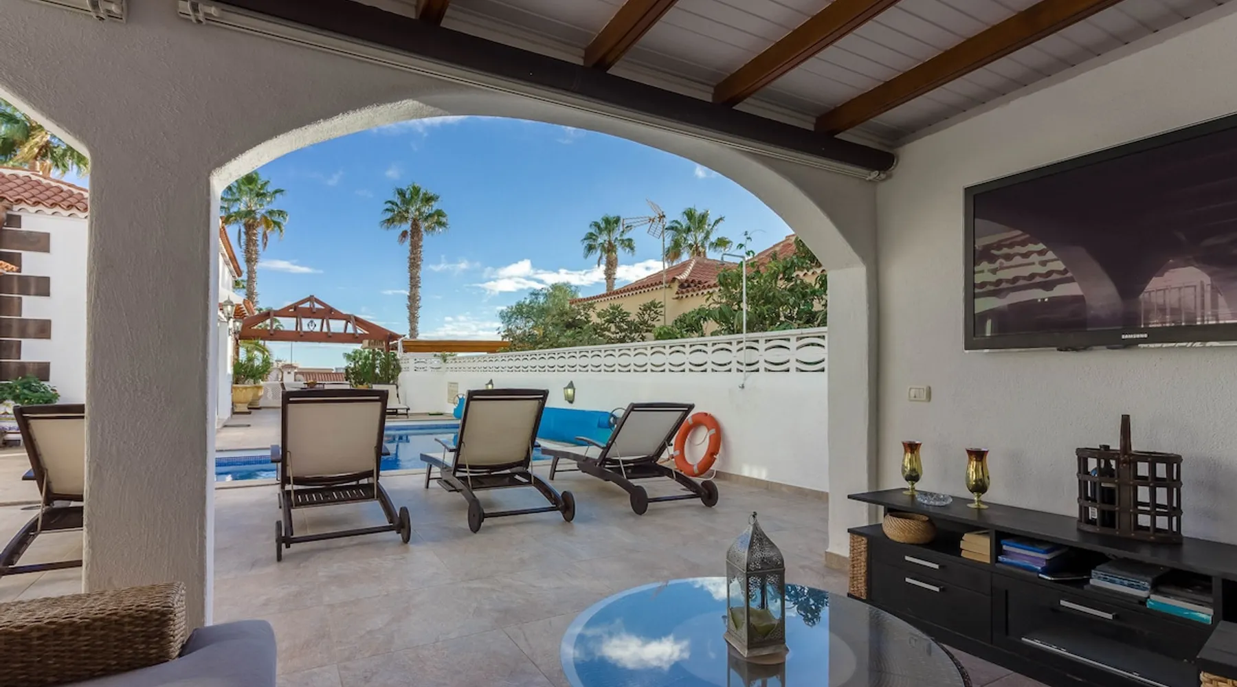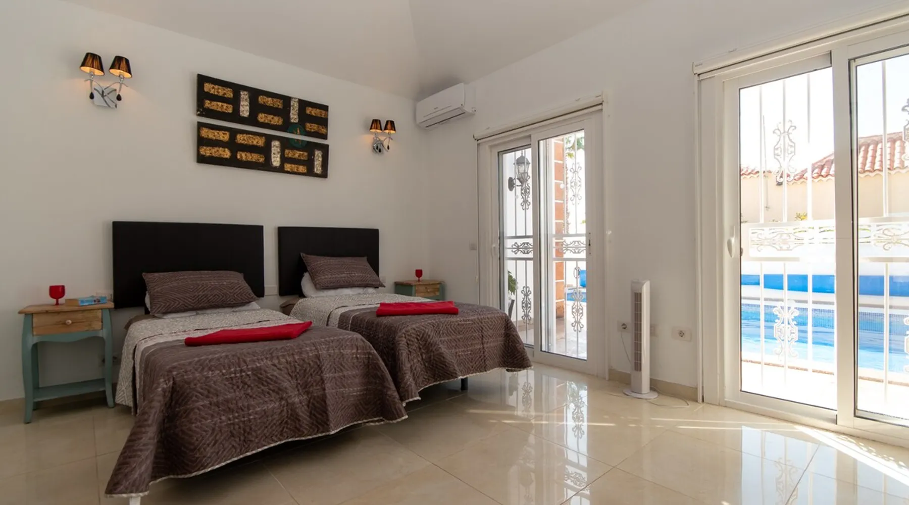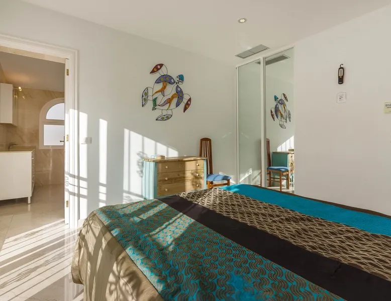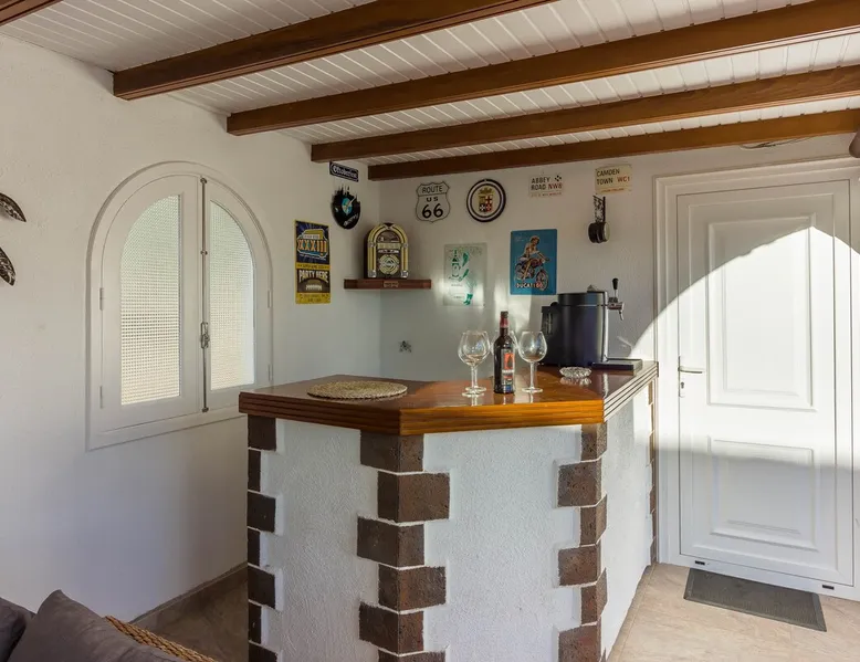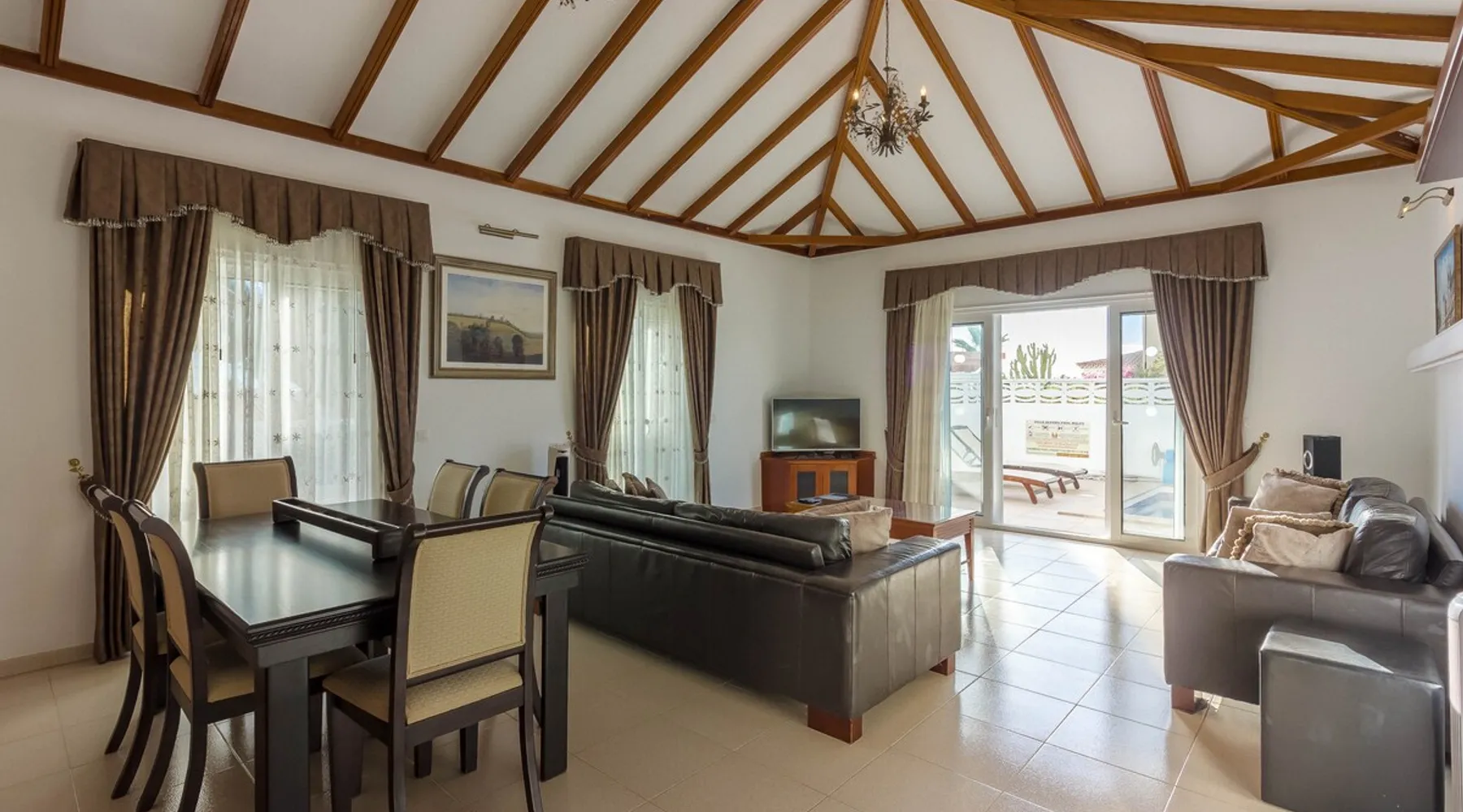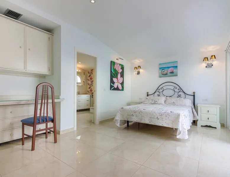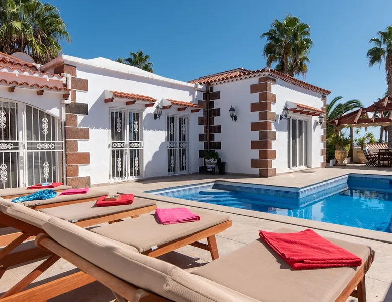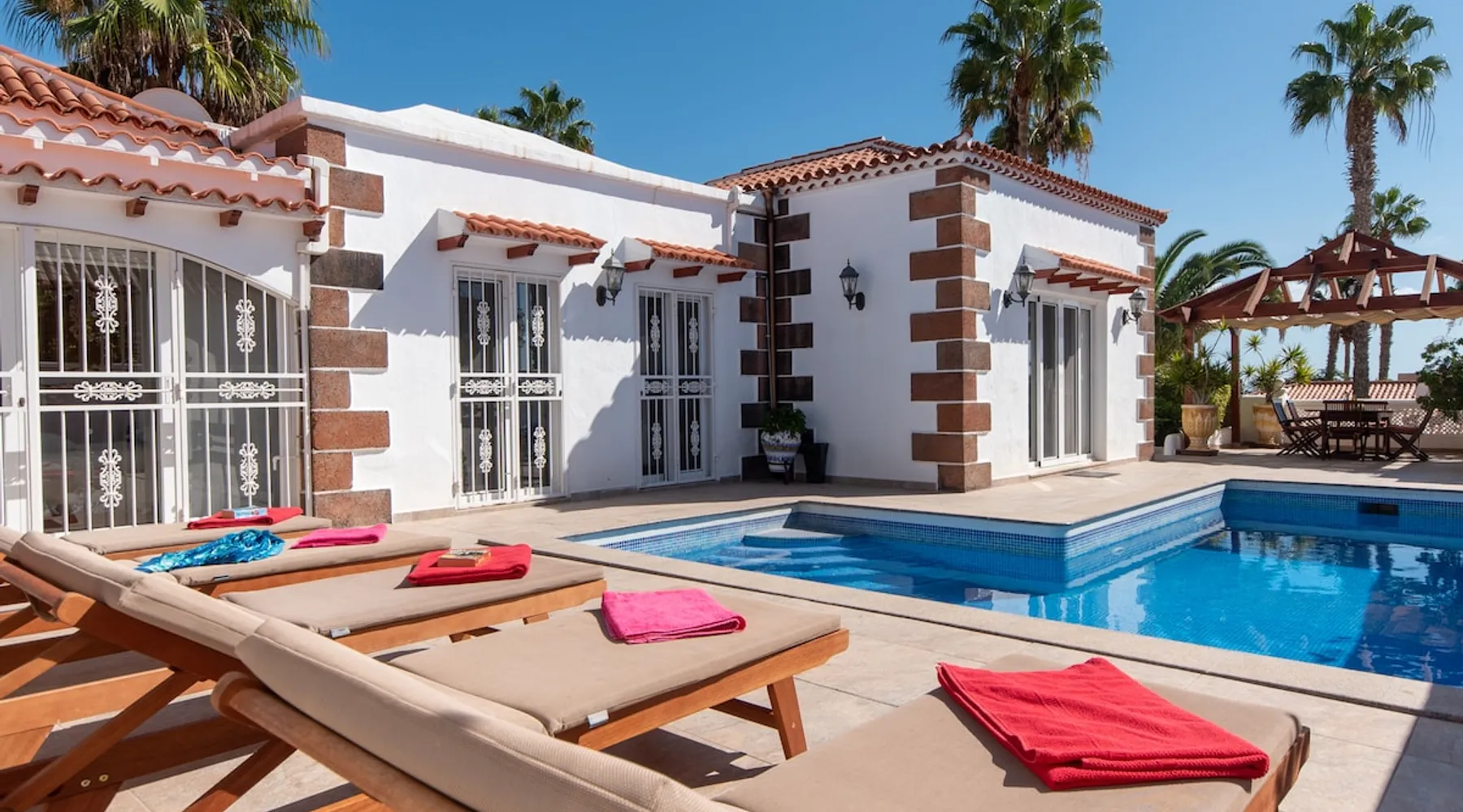 The holiday you’ve been dreaming of is waiting for you at this beautiful villa in Tenerife. Perfect for families or taking a group trip. You’ll have 4 large bedrooms all with air conditioning and 4 bathrooms, giving everyone the space they need to stretch out and relax after a day of fun. The space OUTDOOR BAR AREA NO LONGER HAS A TV! THIS HAS BEEN REPLACED WITH A PICTURE ON THE WALL! All on one level, the interior was carefully designed to ensure you have the pleasurable retreat you deserve. The kitchen offers an excellent modern motif with granite work tops, quality stainless steel appliances, and a convenient breakfast bar. A vaulted ceiling soars above the living room/dining room area with leather couches and a flat screen TV that offers UK channels. Outside on the terrace you’ll find a private place to enjoy the perfect weather Tenerife is known for. Settle in next to the heated L shaped pool on one of the many sun loungers and bask in the sun or enjoy an outdoor meal under the unique pergola with partial sea views. And the outdoor bar area with fridge includes sofas under shaded roof which is a great place to unwind with your fellow travelers. This peaceful home will rejuvenate your spirit when you need it most. Schedule your holiday today! This villa is maintained on a regular basis to a high standard and the property manager is very hands on if any problems arise. Due to popular demand we charge a small additional fee for school half term holiday weeks, if you process a booking over a school half term holiday week you will be notified of this fee. We require all young groups to contact us before making a booking. Also make sure you contact us before you wish to make a booking over the New Year period without the Christmas day period being booked first. Facilities: General: iron with board, bathroom towels, pool towels, linen, hair dryer Kitchen: oven/hob, american fridge/freezer, dishwasher, coffee machine, kettle, microwave, toaster, breakfast bar for 4, granite worktops Utility: washing machine, tumble dryer Diner: dining table for 6, air conditioning Lounge: 3 seater sofas (x3), 42 inch flat screen TV, offers all UK channels + sky, air conditioning, patio doors to terrace (x3) Bedrooms: Bedroom 1: king size bed, fitted wardrobes, air conditioning, ensuite, patio doors to rear terrace Bedroom 2: king size bed, fitted wardrobes, air conditioning, ensuite, patio doors to pool terrace Bedroom 3: king size bed, air conditioning, ensuite, patio doors to pool terrace Bedroom 4: single beds (x2), fitted wardrobes, air conditioning, patio doors to pool terrace (x2) Bathroom: Bathroom: toilet, sink, shower cubicle En suite (bedroom 1): toilet, sinks (x2), shower cubicle En suite (bedroom 2): toilet, sink, bath with shower attachment En suite (bedroom 4): toilet, sink, shower cubicle Exterior: several terraces, dining table for 6, bar area with fridge including comfortable sofas, shaded pergola (x2), purpose built BBQ, gardens, shower room, sun loungers, Pool: private heated pool size: 8 x 3 meters, constant depth: 1.2 Disabled friendly: yes – but 10 steps from pavement to villa Other things to note Please note: Pool heating is included in the price between the months of November to April unless stated. Pool heating outside these months may be included but can be confirmed upon request. If you require pool heating outside these months this can be arranged at a small cost upon request. Registration Details Canary Islands - Regional registration number VV-38-4-0103851