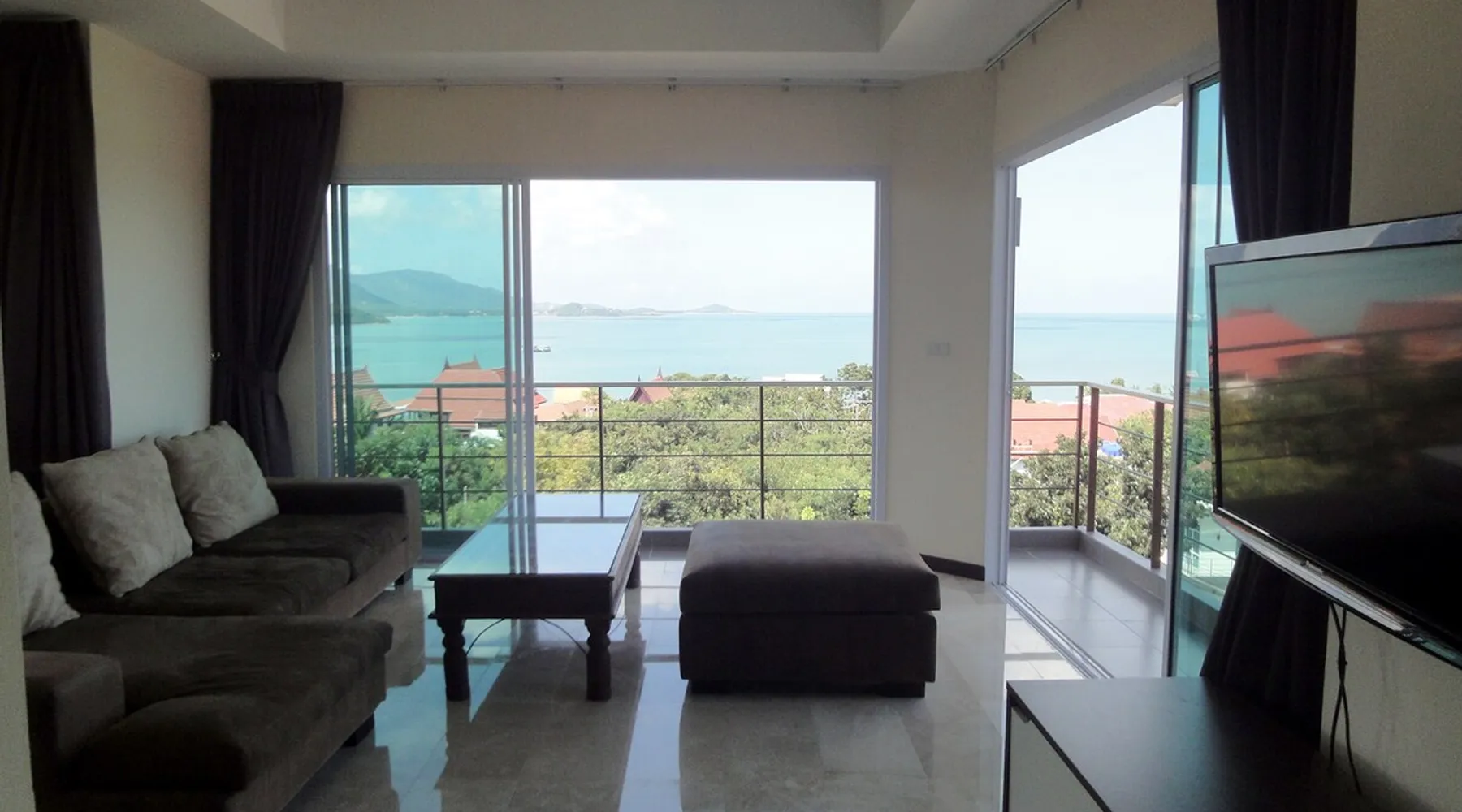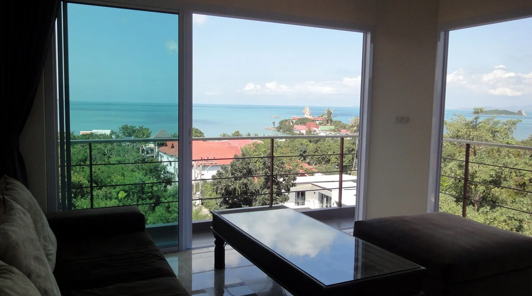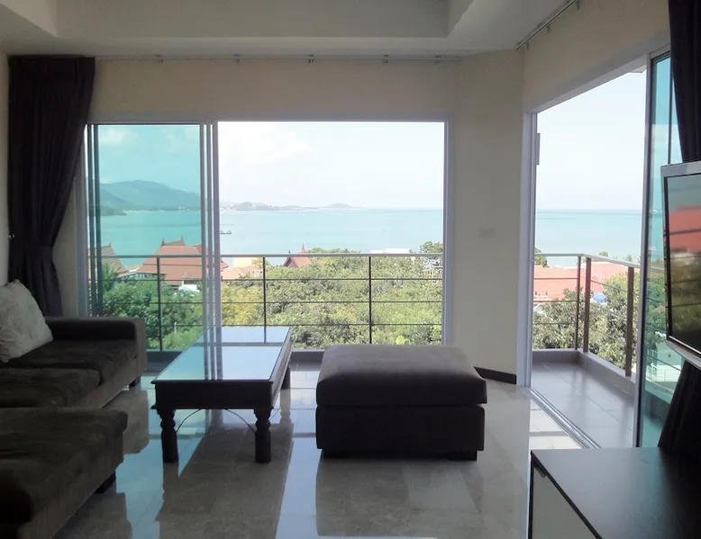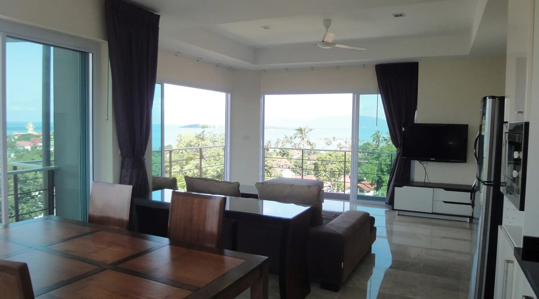 This 130 Sq.m. 2-Bedroom Apartment is a part of Anam Cara. It is situated on the 3rd floor where you can enjoy a spectacular ocean views over Bophut bay, big buddha, and Koh Phangan. It comprises 2 spacious bedrooms, living room and dinning space. The space All room has the balcony. It's has also a kitchen which is equipped with modern appliances and stocked with cooking utencils. Guests will have a welcome fruit basket and daily DIY breakfast (Bread, Coffee/tea, Milk, Egg, ect.). It is also included free wifi internet, flat screen TV etc. The location is ideal, 500m from Seafood Market & Pier to Koh Phangan (for the famous Full-moon Party), just a moment drive to Cheong Mon Beach, and 10 minutes drive to Fisherman's Village & Chaweng Beach Guest access Swimming pool, internet, car parking Other things to note - Daily room cleanning from 11am - 2pm. (excluded kitchenware cleanning) - Sheets and towels change every 3 days