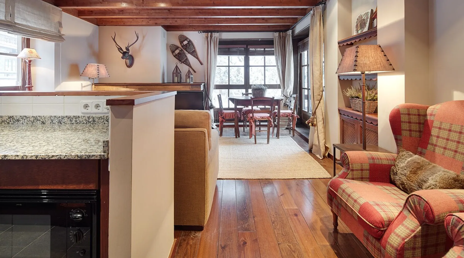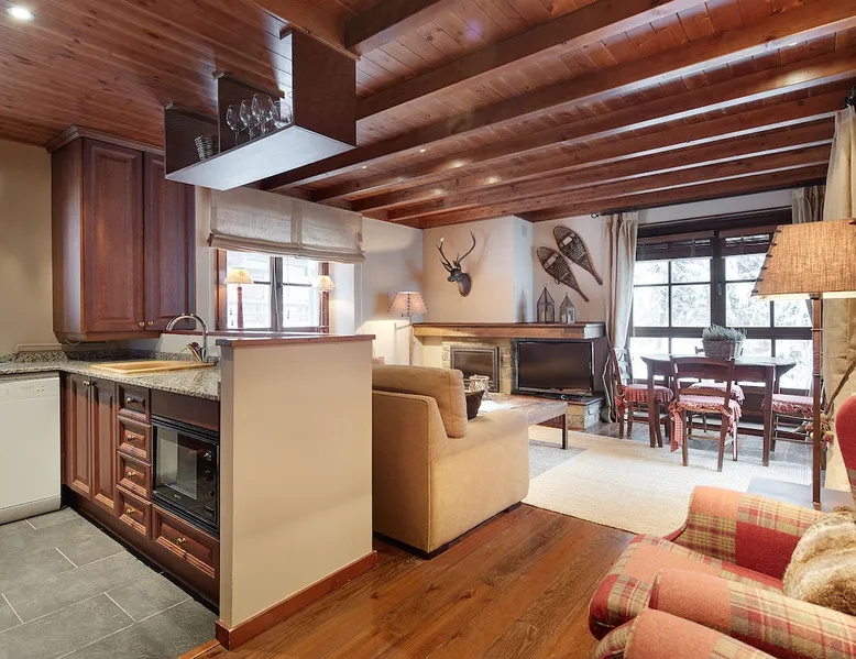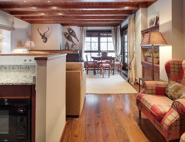 The Val de Ruda Luxe 65 apartment is part of the Val de Ruda residential complex, located at the foot of the slopes at the 1,500-meter level of Baqueira. Situated right next to the gondola lift, access to the ski slopes is therefore unbeatable. The space Val de Ruda Luxe 65 features a cozy living-dining room with an open-plan kitchen, two bedrooms, and two full bathrooms. It is decorated in a traditional Pyrenean style, with exposed stone, warm wooden floors and ceilings, and high-quality furnishings. In the living area, there is a comfortable corner sofa facing the fireplace. The kitchen is open to the living room and fully equipped with all kinds of appliances and complete kitchenware. The dining area is located between the kitchen and the large windows that lead out to the balcony. The master bedroom has a spacious double bed and an en-suite bathroom with a bathtub. The second bedroom includes two bunk beds and a third single bed. The second bathroom is equipped with a shower. The Val de Ruda Luxe 65 apartment also includes Wi-Fi, a parking space, and a heated ski storage area (all services included in the price). You can find other apartments managed by FeelFree in the best locations in the valley, perfect for enjoying the Baqueira Beret ski resort, as well as mountain and hiking routes in the Aran Valley. Rental Registration Number (NRA): ESFCTU0000250090003557370000000000000HUTVA-051672-445 Other things to note To access your apartment, it is mandatory to complete the online check-in with the details of all travelers over 14 years old and provide a credit card to the host. Registration Details Catalonia - Regional registration number HUTVA-051672