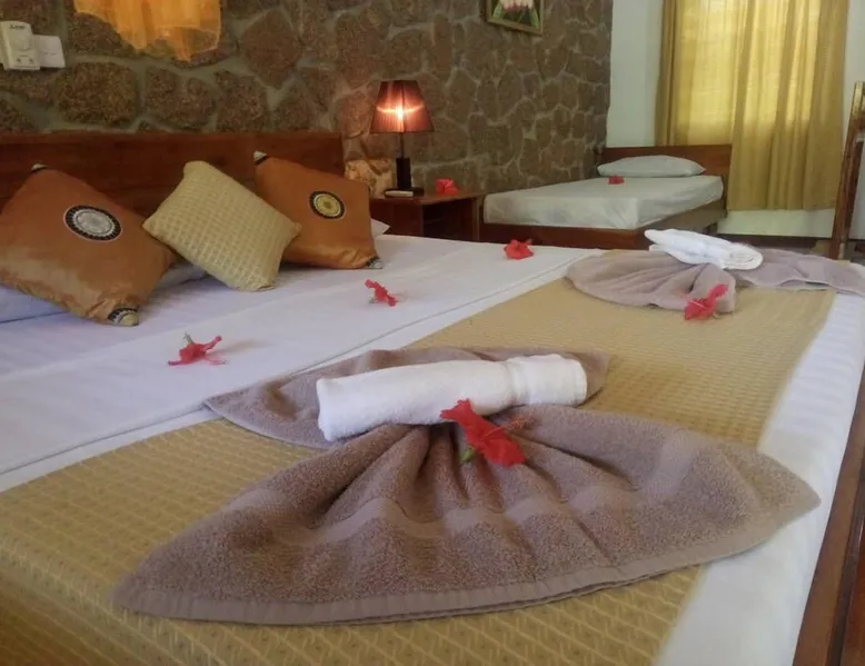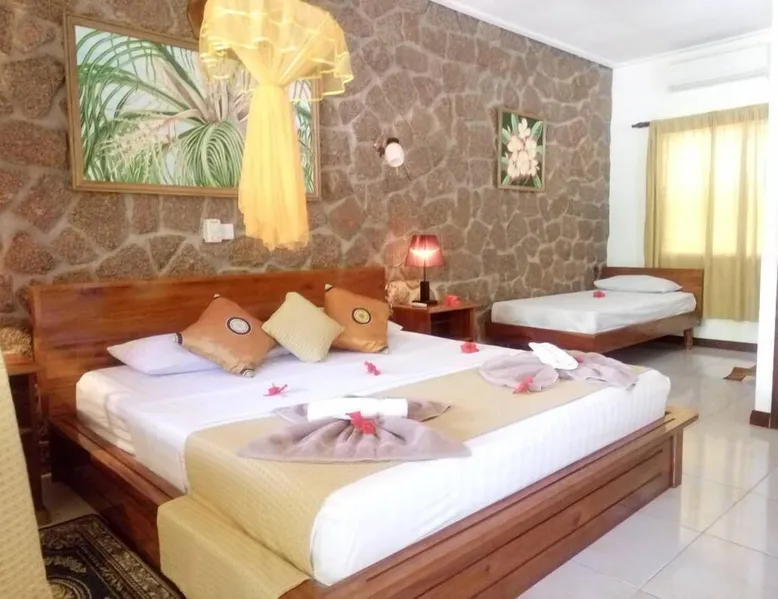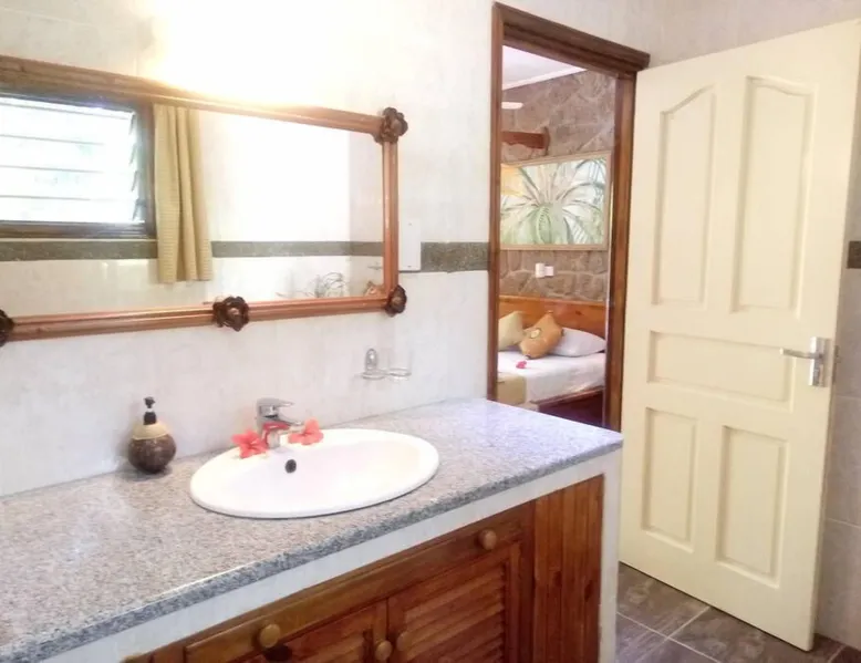 Housed in the heart of La Digue, luxury bungalow at KOKO FLER Coco the Rock is part of a set of 4 double bungalows situated in a tropical garden with many species: Coconut, papaya, banana to name just edible! One of the most secret places of the island, perfect for romantic holidays. A special welcome is reserved for honeymooners. You will have a space of 54m² with 20m² private terrace without any opposite, entirely turned towards the garden. The bungalow is air-conditioned. The decoration is particularly good with exotic woodwork. The paintings adorning the rooms are very tasteful, made by a local artist. Enjoy easy access by bike or on foot (no path of sand) as well as the beaches of Anse Anse Severe meeting or 5 minutes by bike. MEALS optional (served to you at the bungalow) - Breakfasts (brunch): 13. 00 euros (15. 00 euros if only one) - Creole Dinner: 25. 00 euros per person. Directed by Verena with fish caught that day and local products. Adaptable according to your request (in case of allergy for example) BENEFITS: • Woodwork • Equipped kitchen • Air conditioning • King-size beds and excellent bedding • Wifi (5 euros for 00 200mb) • Bike rental: 100 SCR / day / person • Luggage storage • Baby sitting (charge) • Dry cleaning service (paid) THE SITUATION • Centre of La Passe and Anse Réunion beach: 5 minutes • Beaches Anse Severe and Anse Source d'Argent: 10mn • Beach Grande Anse: 15mn OUR SMALL CAUTIONS FOR YOU: • Tea and coffee available in the rooms • Special welcome "honeymoon" • Safe at reception • Toiletries • Cots and children / highchair • Organization, consulting and reservation of your island activities The owners Stephan and Verena are available at the reception located at the entrance area to learn or access to your every desire ... a real private concierge service! A charming place ...