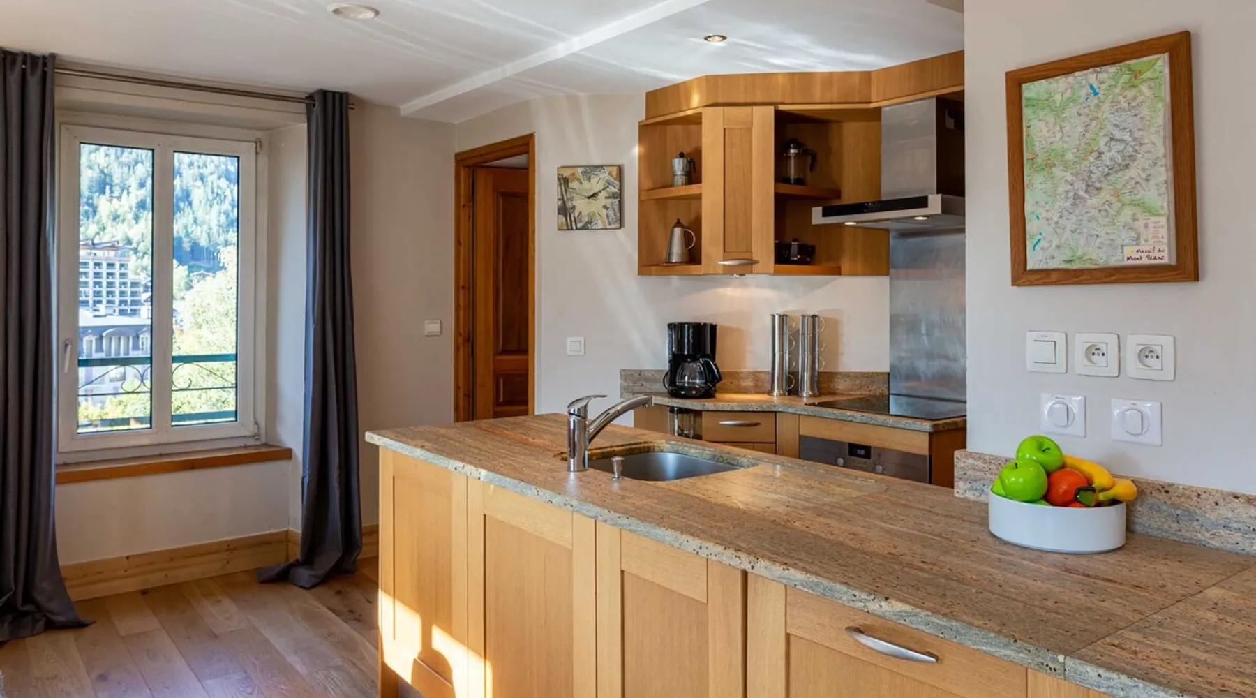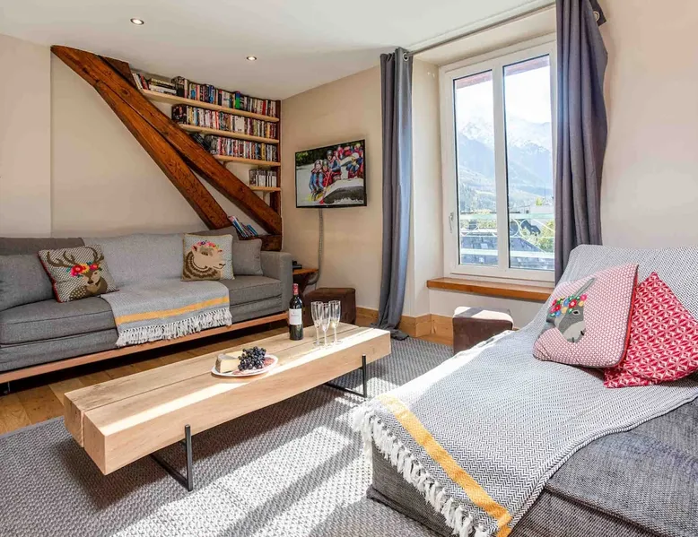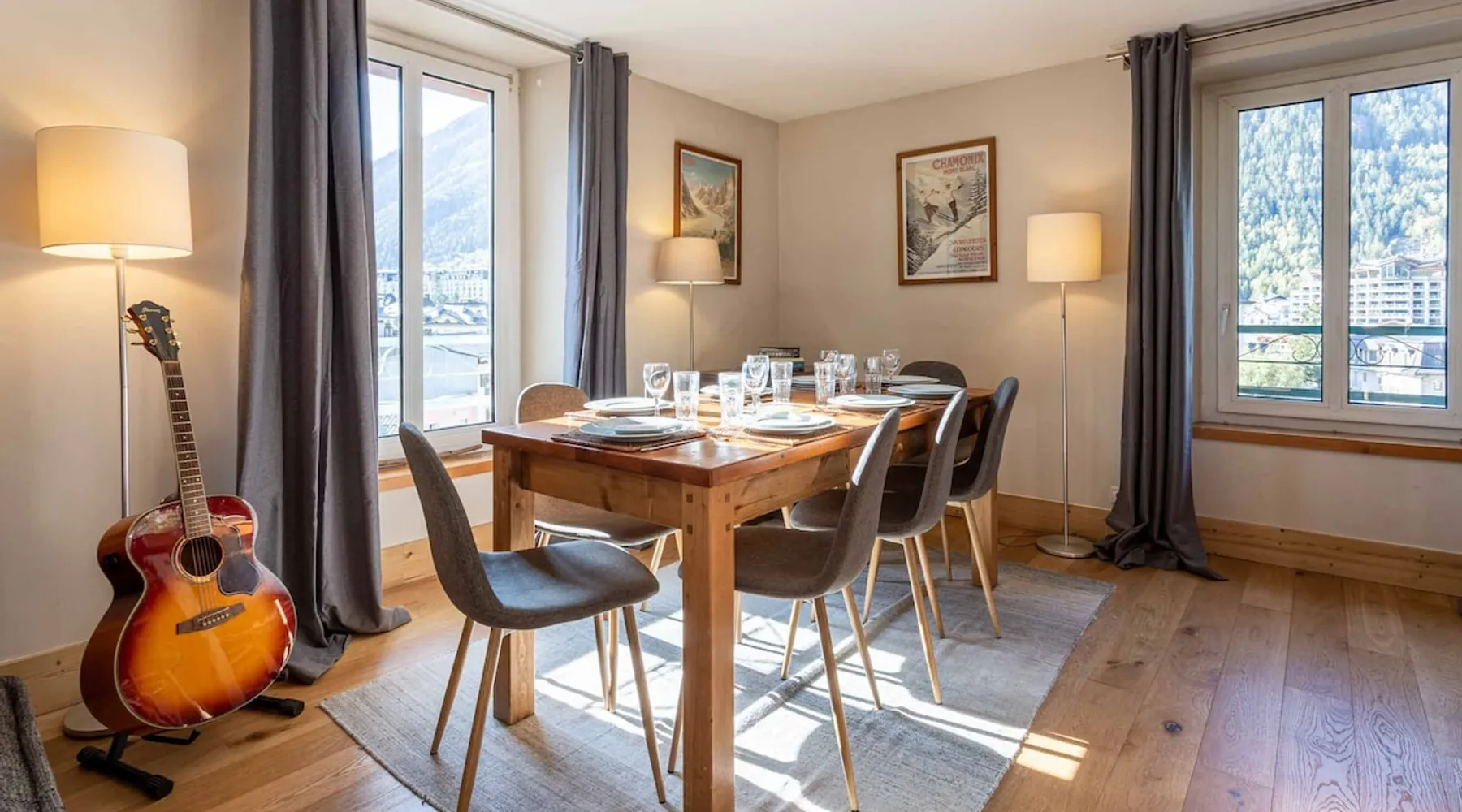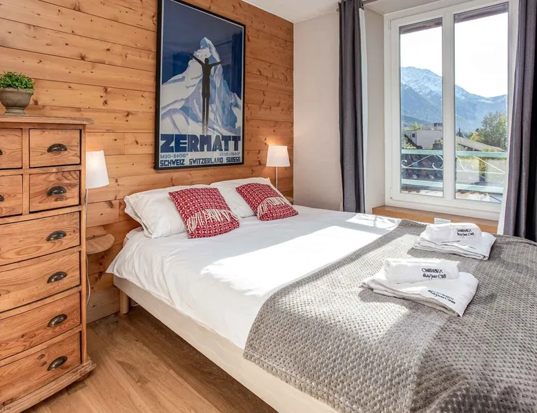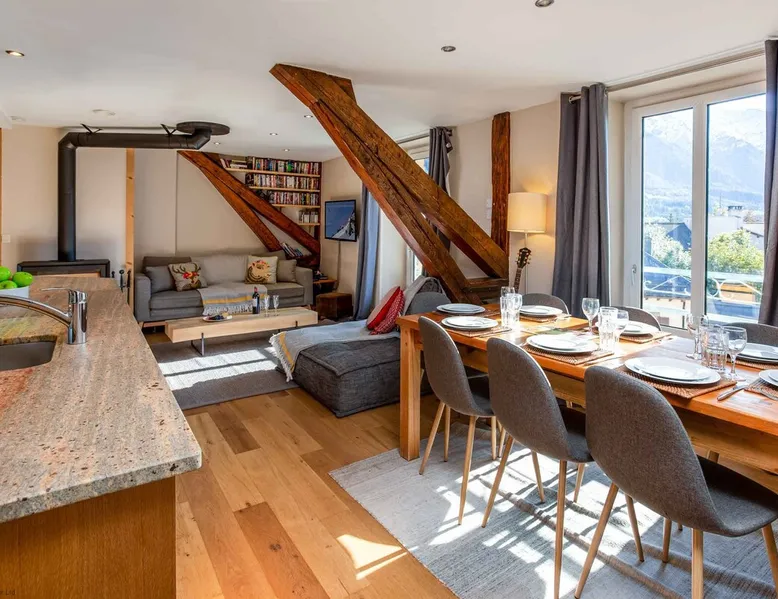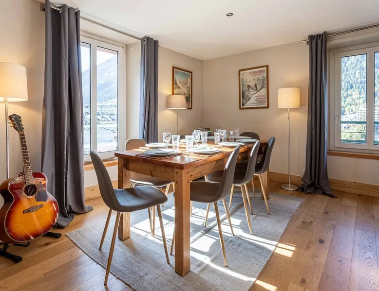 The Belle Epoque apartment is a modern, airy 3 bedroom 2 bathroom Chamonix holiday rental in the center of Chamonix. Sleeps 8 with sofa bed, fireplace, Wi-Fi, parking, dishwasher, washing machine. The La Belle Epoque apartment is modern and spacious with 3 bedrooms and 2 bathrooms, this Chamonix vacation rental is in the heart of the city center. It accommodates up to 8 people with sofa bed, fireplace, Wi-Fi, parking, dishwasher and washing machine. The space La Belle Epoque apartment is a Chamonix holiday rental located right in the heart of the town centre, opposite Chamonix's main train station. This apartment is located on the top floor of a traditional Chamonix building, meaning it benefits from spectacular Mont Blanc views as well as a lovely airy feeling thanks to the large and newly fitted triple glazed windows. With three bedrooms and a sofabed, as well as 2 bathrooms, La Belle Epoque can accommodate 6-8 people, with many facilities to make your stay more enjoyable. The living area at La Belle Epoque apartment has comfortable sofas, a wood burning stove, a flatscreen TV with French channels and Blueray DVD player while there is also a large dining table with seating for 8 people and a modern, well-equipped kitchen. There is wifi internet throughout and La Belle Epoque apartment also benefits from private underground parking, washing machine and dishwasher. La Belle Epoque apartment has one master bedroom which can be made up as double or twin beds. The master bedroom benefits from an ensuite bathroom with WC, bath and handheld shower too. The 2nd bedroom has a double bed and the 3rd bedroom has full-size bunk beds. The second bathroom is just off the 3rd bedroom and has a shower, plus there is also a separate WC. Key Features 3 bedrooms, 2 bathrooms Sleeps 6-8 65m2 Master bedroom with double or twin beds and ensuite bath 2nd bedroom with double bed 3rd bedroom with full-size bunk beds Shared bathroom with shower and WC Triple glazed windows Wifi internet access Wood burning stove TV, Blueray Library of DVDs and games Mont Blanc & panoramic mountain views Dishwasher, microwave, oven / grill Washing machine & tumble dryer Ski locker Underground parking Other things to note Check-in times Normal check-in time is from 5pm, if you are arriving after 10pm please let us know in advance. Check-out times Normal check-out time is by 10am. Flexible check-in / check-out times If these times don’t suit your holiday arrangements, you can book our flexible early check-in / late check-out service (subject to availability). This must be booked with us in advance, and may be subject to a fee of 40€ for apartments and 80€ for chalets so that we can prepare the property in time. Late check-in after hours Check-in is possible until midnight, but please try to arrive before 9pm. For those arriving after 9pm there is a 40€ late check-in fee, which must be paid on arrival at your Chamonix Accommodation. Children Travel cots & high chairs / booster seats can be hired through us for 35€ to include cot mattress, bed linen and a towel. You can add this to your booking at the time of booking. What's included One set of bed linen and towels is provided at your accommodation for your stay. If you are staying for 2 weeks or more you will have a mid-stay linen change. Tourist guest cards will be left in the property for you on arrival to give you free travel on the local train and buses and more. End of stay cleaning is included at your accommodation, but we do expect you to follow our check out instructions on departure. If you prefer you can book an additional cleaning service. Chamonix All Year Resort Shop Order everything you need for your Chamonix holiday now via our Chamonix Resort Shop: Geneva Airport transfers Chamonix lift passes Discounted ski hire Additional Accommodation Details Bike Storage Bikes can be stored in the underground parking area on the private parking space allocated to the apartment. Pets Pets are welcome at this property but permission must be obtained in advance and a charge will be applied at time of booking. The additional fee is 40€. Parking Bear in mind that the underground parking has restricted height, so we don't recommend coming with a large 4x4 or roof box. If your car is too tall for the car park, our Resort Team can advise on the closest free and payable parking options. Lift access The lift goes from the ground floor up to the apartment; the basement for ski locker and parking is accessed via the staircase. Registration Details 74056002191C4
