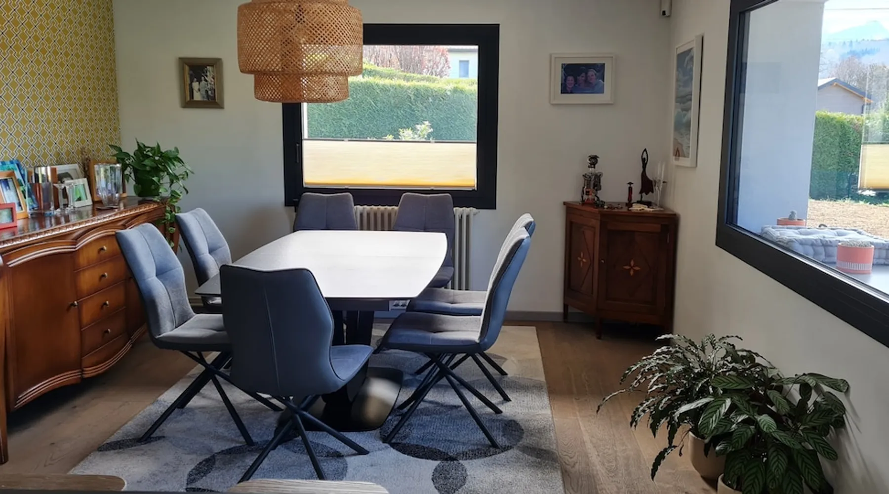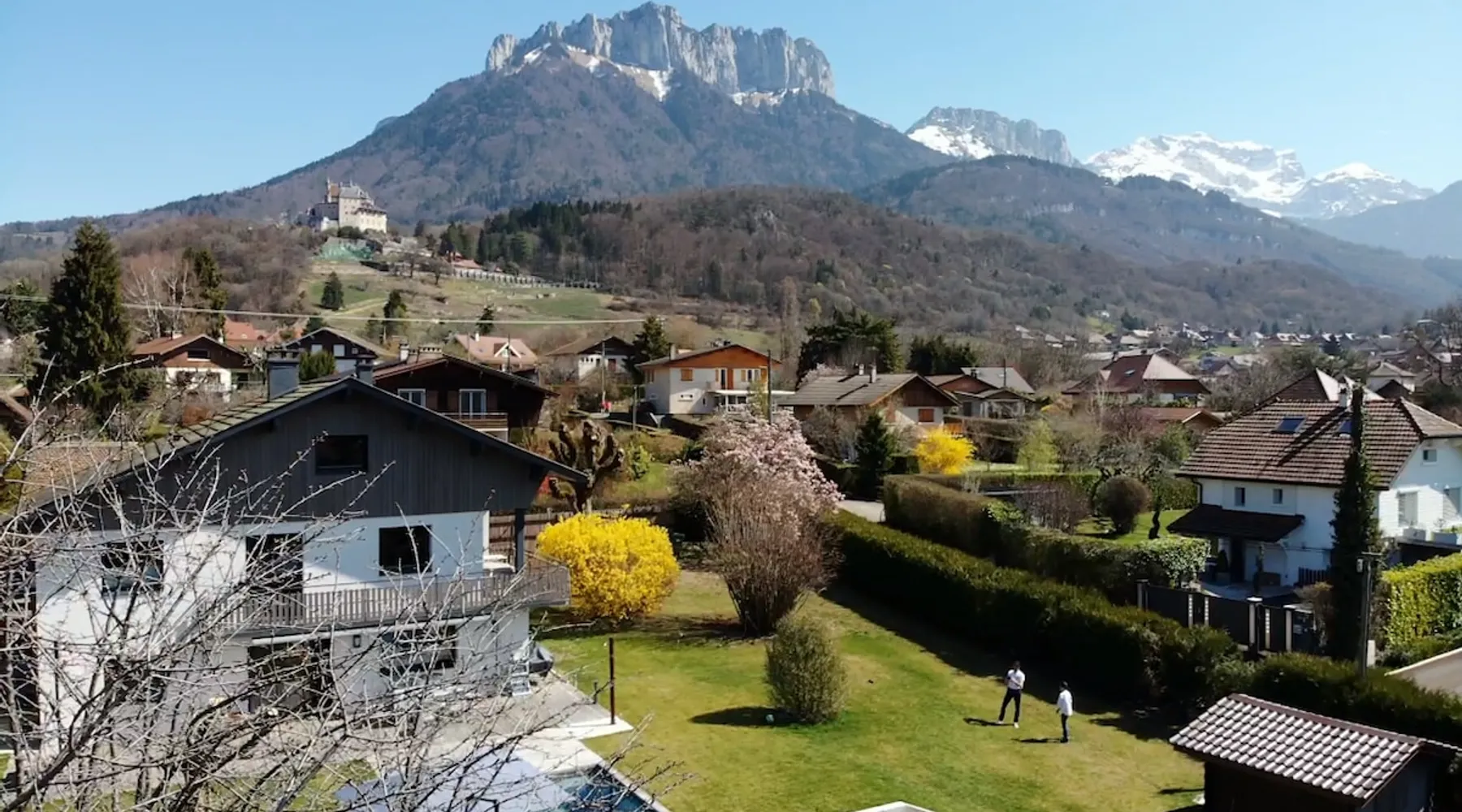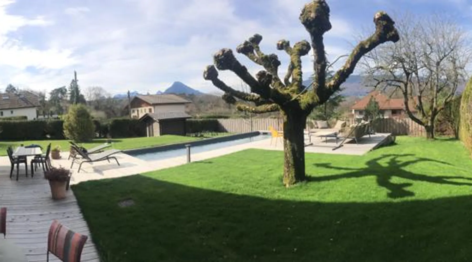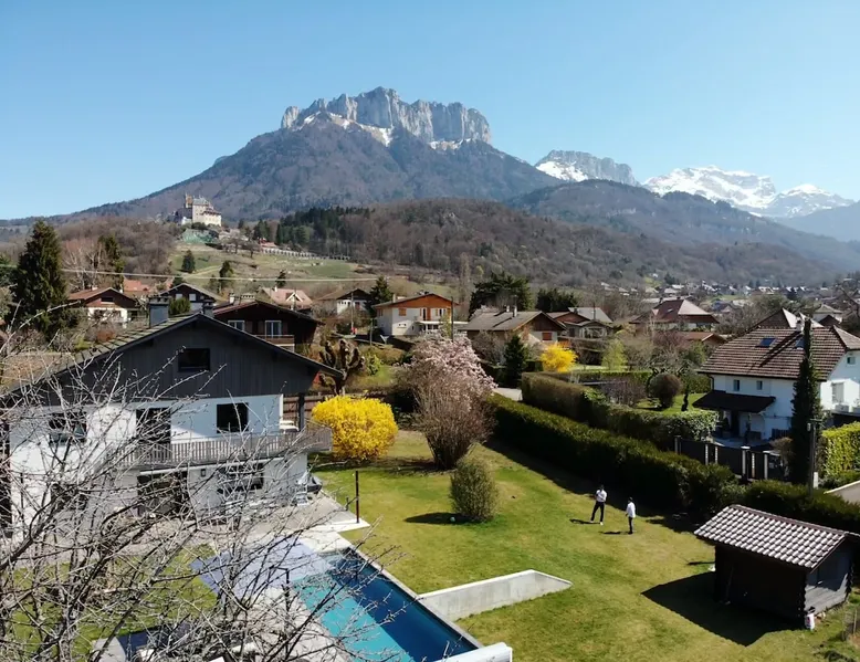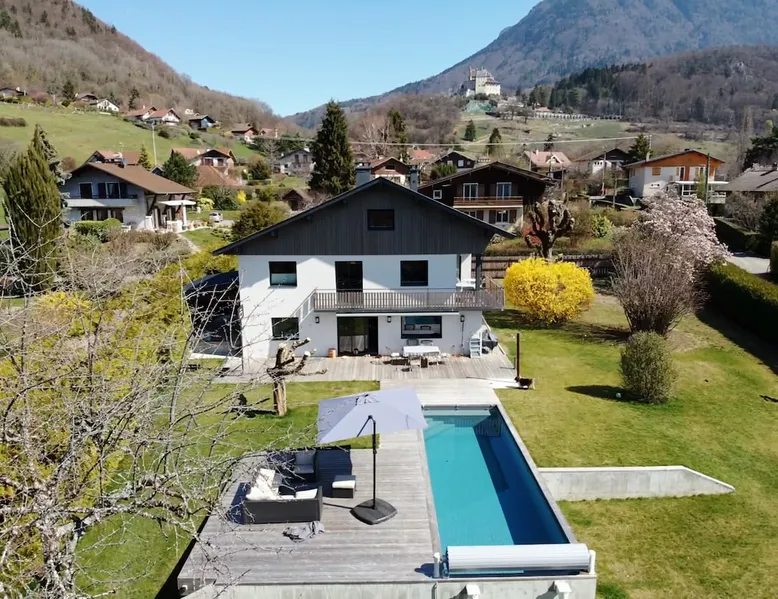 House on 3 levels, with terrace, beautiful swimming pool 10x3 meters, very beautiful view, charm, contemporary and refined decoration. Balcony with views of Menthon Castle. Very quiet and pleasant place, beautiful garden with trees giving shade nooks. Kitchen overlooking the pool, making pleasant moments for aperitifs and meals. Garden furniture with outdoor sofas and umbrella. The house is air-conditioned. City center and lake 5 and 7 minutes walk. The space Fully renovated high-end house. Proximity lake (8min walk), center of Menthon (5min walk). Stunning views of the mountains and Menthon Castle. Kitchen and dining room overlooking pool of 10x3 meters Guest access All spaces are accessible except the garage and attic Registration Details 74176000149PA