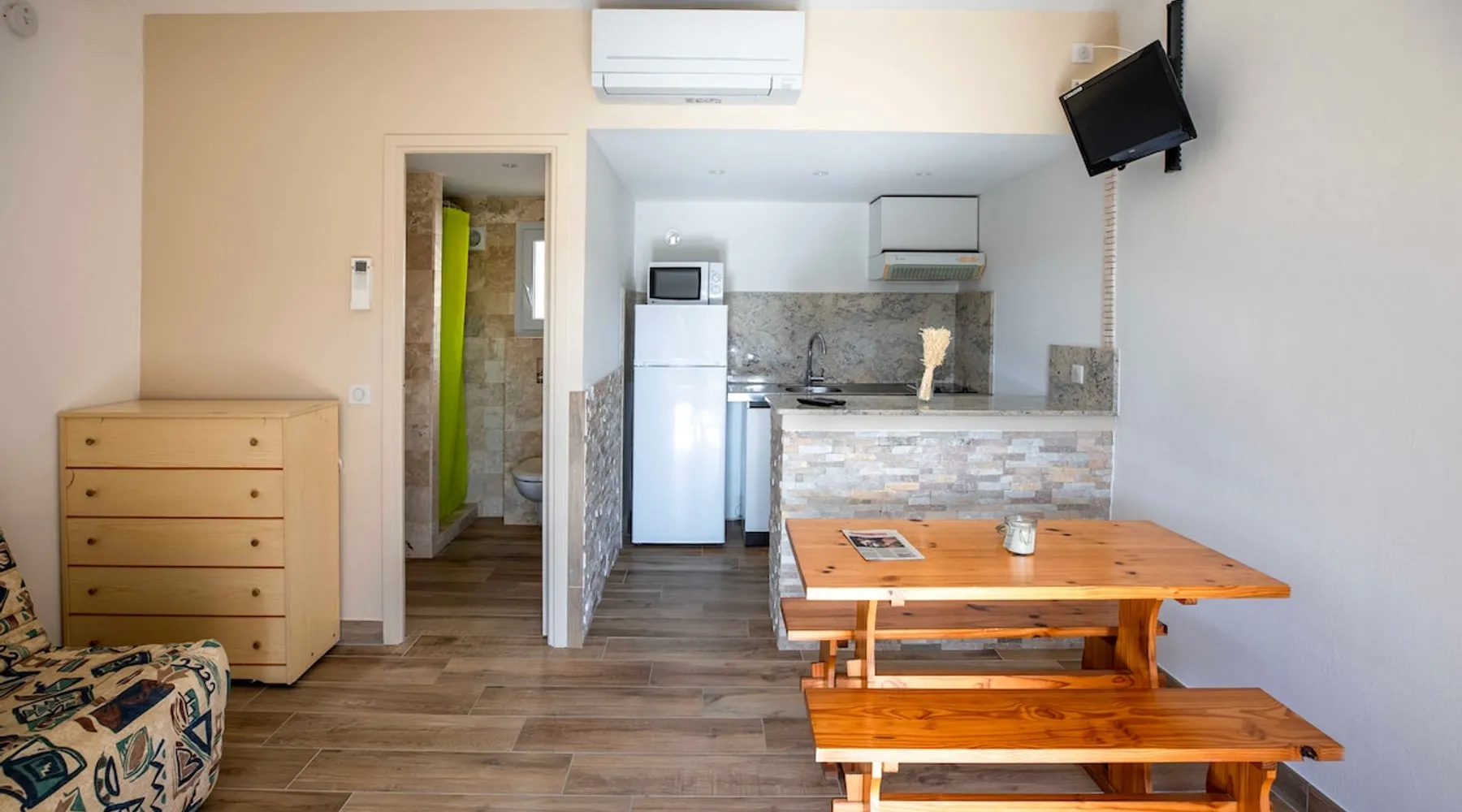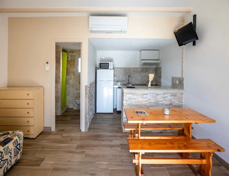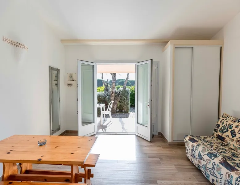 Located at the crossroads of the Corsican maquis and the majestic Santa Giulia (3.1 km). Our studios are located within the Sole d'Oro residence, close to the beautiful city of Porto-Vecchio (2.8 km). They feature a spacious living room, equipped kitchen, bathroom with walk-in shower, sofa bed and single folding bed. There is also an equipped terrace with a barbecue The space Our bungalows are 22 m² plus a pleasant terrace with barbecue. They have a spacious living room as well as an equipped kitchen area, fridge, TV facing the sofa, spacious wardrobe for storing a lot of things and a modern bathroom with walk-in shower Guest access A motorized vehicle is necessary in Corsica Registration Details 2A247001430A2