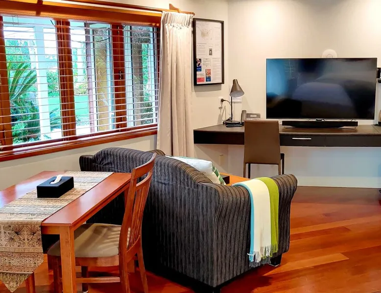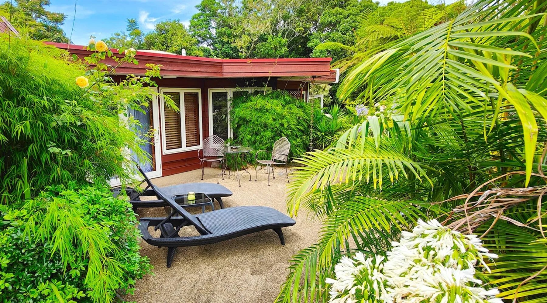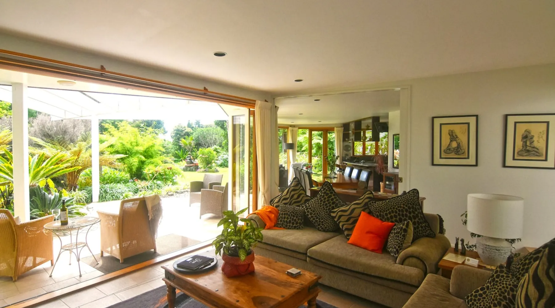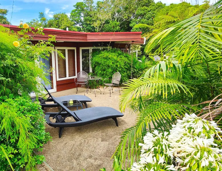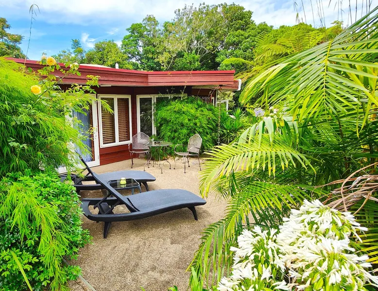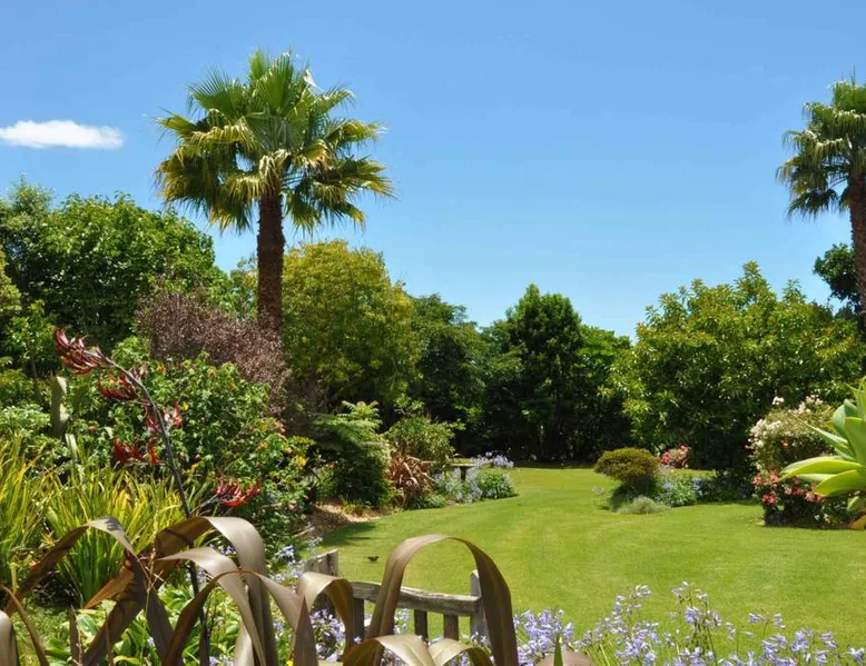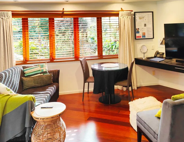 Moon Gate Villa is an elegant country lodge built just outside Kerikeri township amongst traditional orchard hedges. The grounds feature 1.5 acres of open lawns and lush, tropical gardens with hidden destinations to relax and enjoy this private retreat. We are only 4 minutes walk to the weekend markets, and close to many restaurants and cafes. The space Accommodation is either in the spacious villa guest rooms with large windows and doors overlooking the gardens, or the traditional orchard cottage in a private corner and garden area. All guests have access to our public spaces; a large guest lounge and terrace, our solar heated lagoon swimming pool and garden spaces. Dedicated, off-street parking is available to all guests. Guest access The "Writer's Retreat" is our most special room, with views over the terrace ponds and gardens. It has a walk in wardrobe, and a full size marble bathroom with a deep soaker bath. A huge super-king size double bed with a luxury topper and quality linens ensures a brilliant night's sleep. The suite has private outside and inside living/dining areas complete with large smart TV, surround sound and complimentary Netflix, Amazon Prime and Disney TV. A mini bar area has a bar fridge, microwave, glassware & dishes. Complimentary tea and coffee area replensihed daily. Other things to note Unless specified, breakfast and daily rooms servicing is included in your rates: there are no extra fees. Note that the main villa kitchen is used to prepare our guest breakfast and is not available for guest use for health and safety reasons.