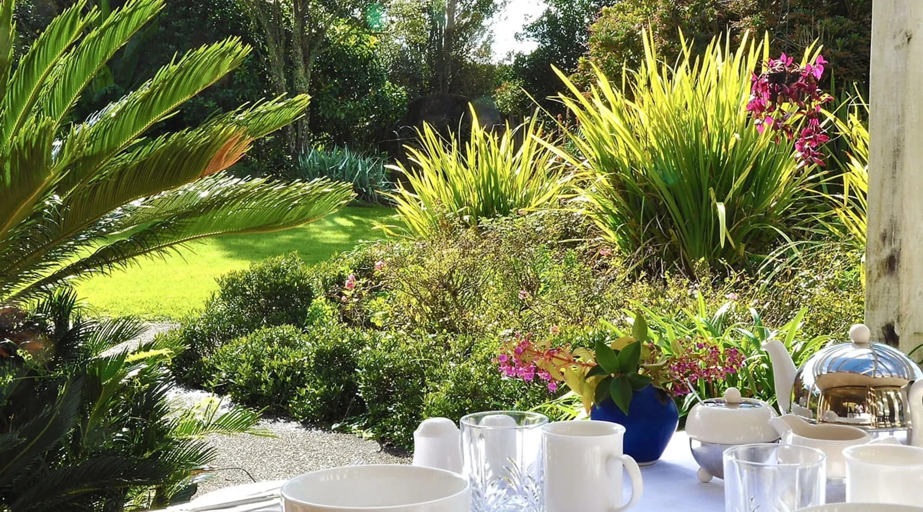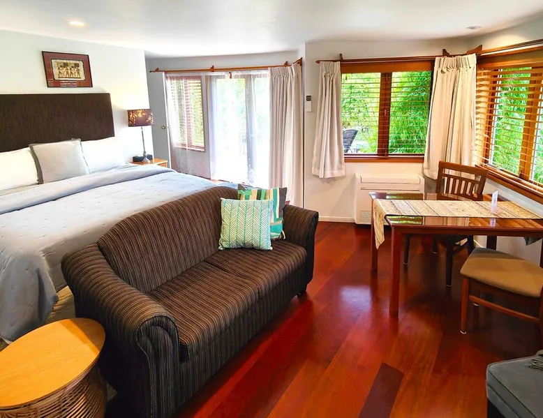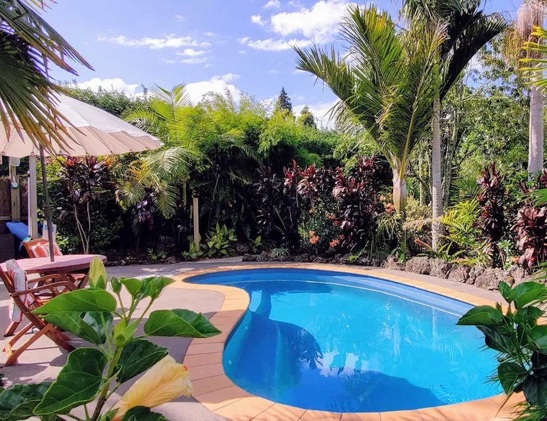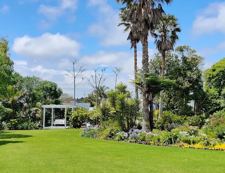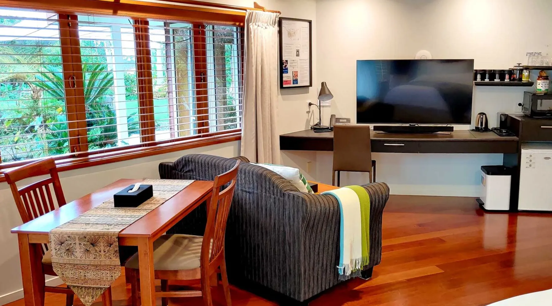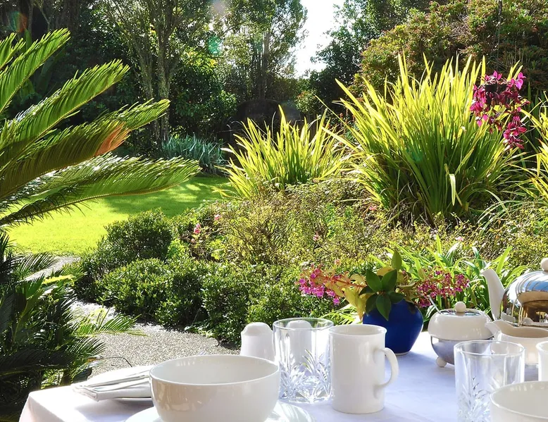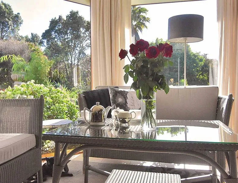 Moon Gate Villa is an elegant country lodge built just outside Kerikeri township amongst traditional orchard hedges. The grounds feature 1.5 acres of open lawns and lush, tropical gardens with hidden destinations to relax and enjoy this private retreat. We are only 4 minutes walk to the weekend markets, and close to many restaurants and cafes. The space Accommodation is either in the spacious villa guest rooms with large windows and doors overlooking the gardens, or the traditional orchard cottage in a private corner and garden area. All guests have access to our public spaces; a large guest lounge and terrace, our solar heated lagoon swimming pool and garden spaces. Dedicated, off-street parking is available to all guests. Guest access The "Writer's Retreat" is our most special room, with views over the terrace ponds and gardens. It has a walk in wardrobe, and a full size marble bathroom with a deep soaker bath. A huge super-king size double bed with a luxury topper and quality linens ensures a brilliant night's sleep. The suite has private outside and inside living/dining areas complete with large smart TV, surround sound and complimentary Netflix, Amazon Prime and Disney TV. A mini bar area has a bar fridge, microwave, glassware & dishes. Complimentary tea and coffee area replensihed daily. Other things to note Unless specified, breakfast and daily rooms servicing is included in your rates: there are no extra fees. Note that the main villa kitchen is used to prepare our guest breakfast and is not available for guest use for health and safety reasons.