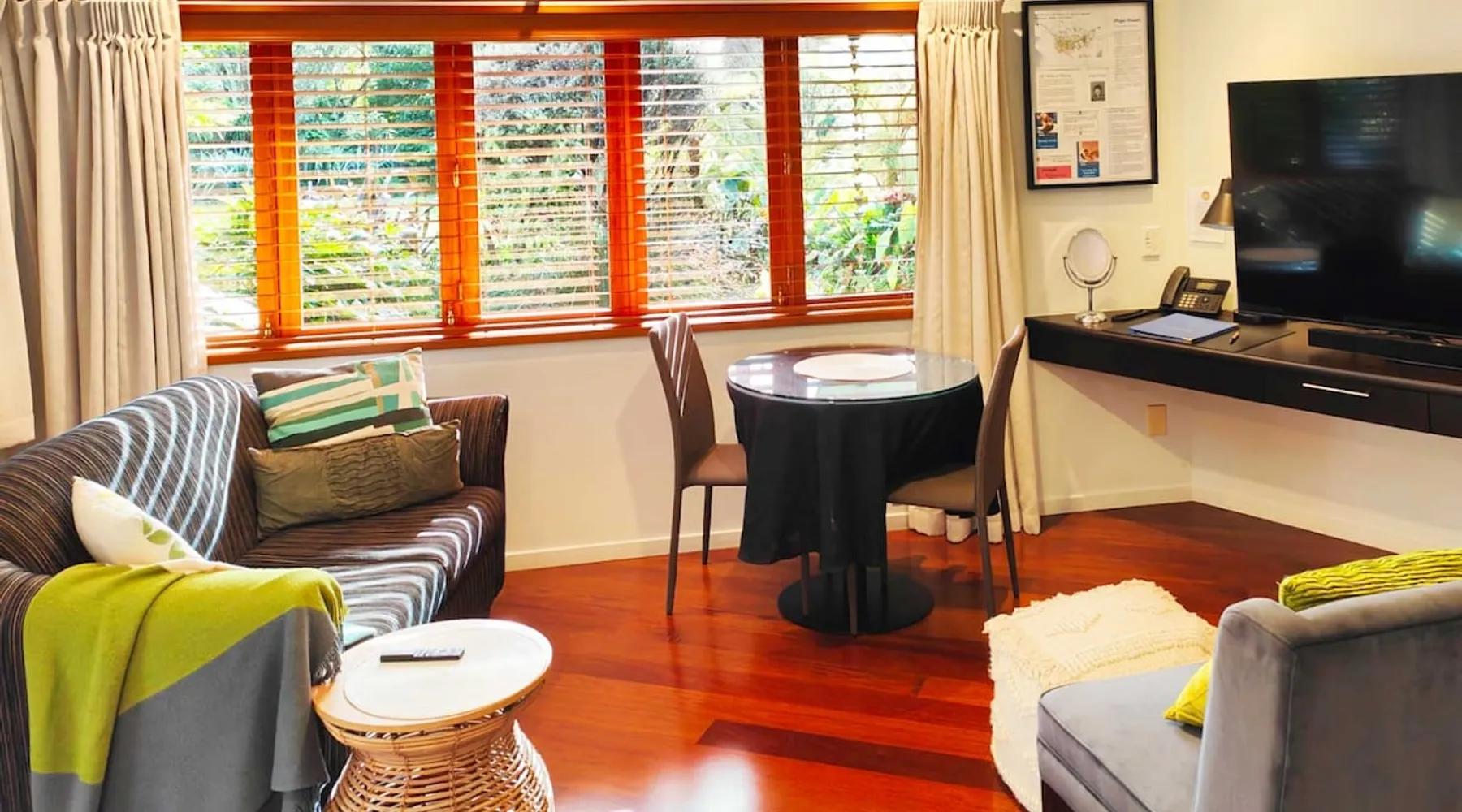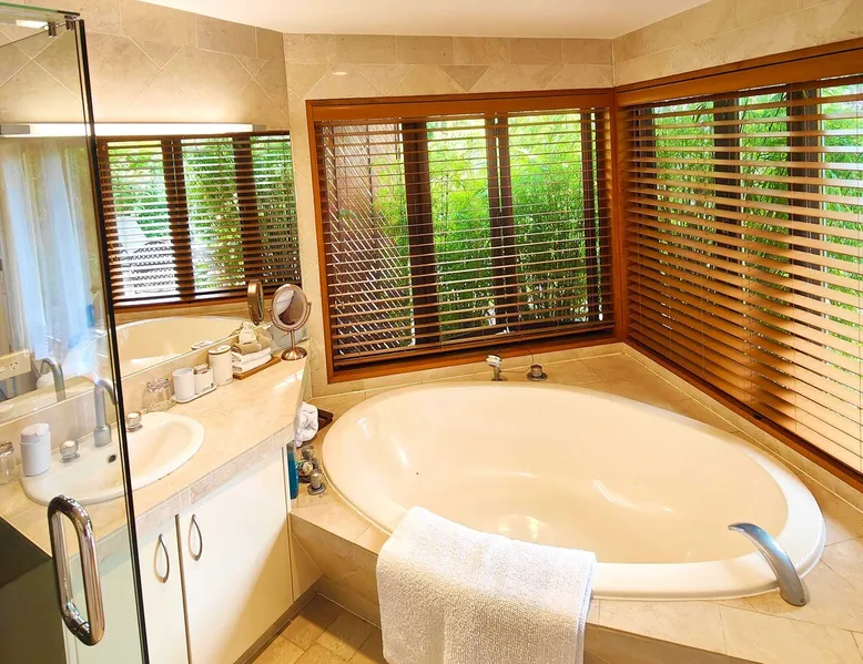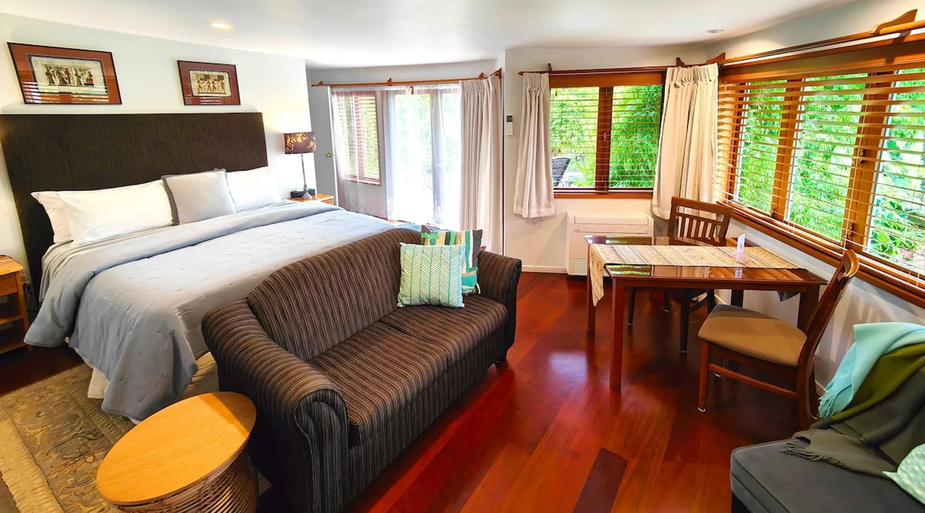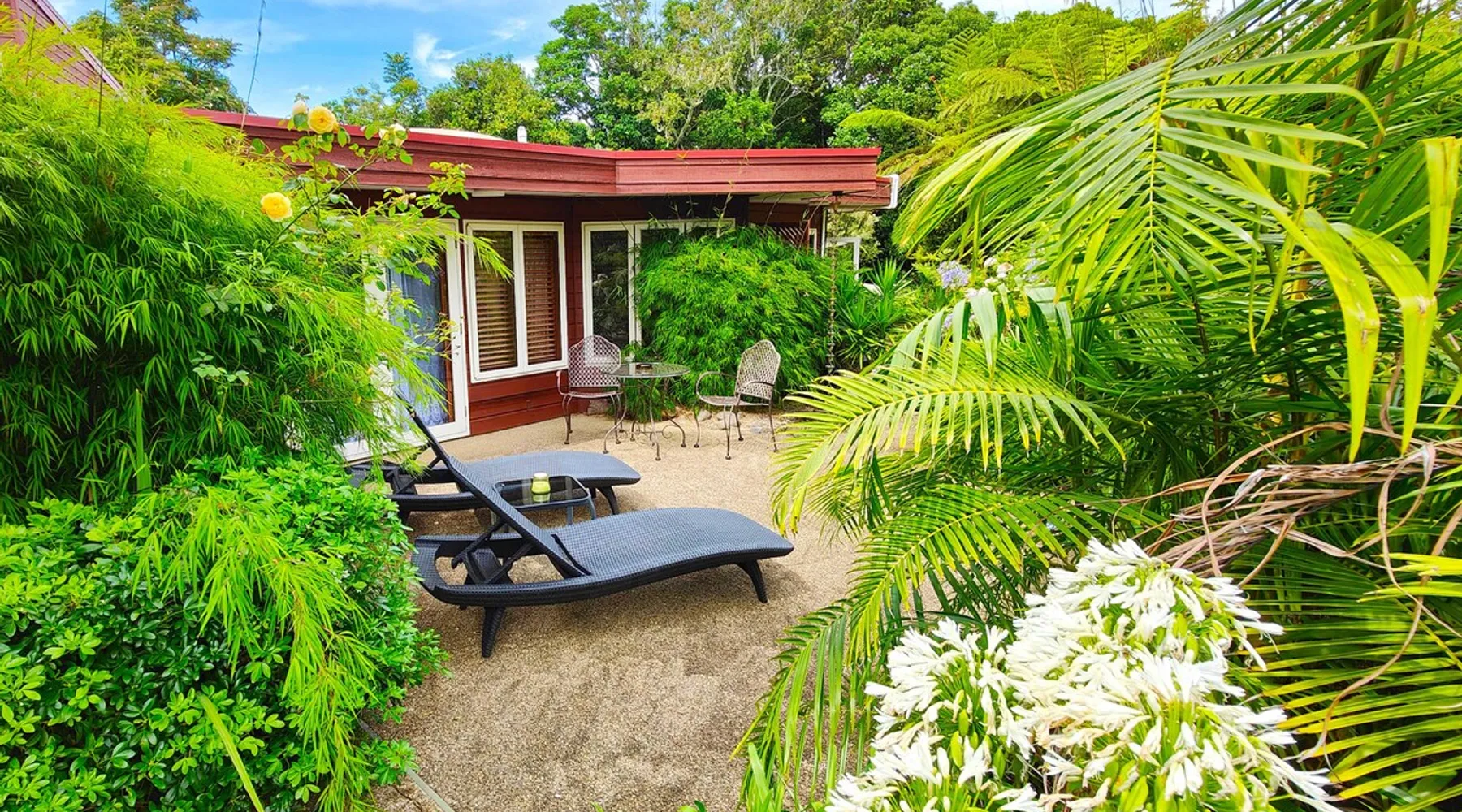 Moon Gate Villa is an elegant country lodge built just outside Kerikeri township amongst traditional orchard hedges. The grounds feature 1.5 acres of open lawns and lush, tropical gardens with hidden destinations to relax and enjoy this private retreat. We are only 4 minutes walk to the weekend markets, and close to many restaurants and cafes. The space Accommodation is either in the spacious villa guest rooms with large windows and doors overlooking the gardens, or the traditional orchard cottage in a private corner and garden area. All guests have access to our public spaces; a large guest lounge and terrace, our solar heated lagoon swimming pool and garden spaces. Dedicated, off-street parking is available to all guests. Guest access The "Writer's Retreat" is our most special room, with views over the terrace ponds and gardens. It has a walk in wardrobe, and a full size marble bathroom with a deep soaker bath. A huge super-king size double bed with a luxury topper and quality linens ensures a brilliant night's sleep. The suite has private outside and inside living/dining areas complete with large smart TV, surround sound and complimentary Netflix, Amazon Prime and Disney TV. A mini bar area has a bar fridge, microwave, glassware & dishes. Complimentary tea and coffee area replensihed daily. Other things to note Unless specified, breakfast and daily rooms servicing is included in your rates: there are no extra fees. Note that the main villa kitchen is used to prepare our guest breakfast and is not available for guest use for health and safety reasons.