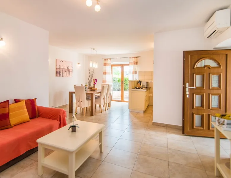 Beautiful stone house for 4 persons, completely fenced, WiFi, A/C The space Beautiful stone house for 4 persons, completely fenced, WiFi, A/C. The holiday house consists of open living room, kitchen and dining area. In front there is covered terrace with dining table for 4 persons and barbeque. Two double bedrooms with double beds have bathroom with shower and toilet. One bedroom has access to the balcony. Kitchen is fully equipped with stove, dishwasher, microwave, kettle, coffee machine, freezer and fridge. There is also smart TV, free internet, washing machine. Smoking is not allowed in the house. Pets are welcome. Holiday home has its own garage. It is surrounded by wonderful nature and is ideal for relaxing. The wonderful house was completed in 2014 and is therefore a new and very cozy holiday house. It is surrounded by wonderful nature and is ideal for relaxing. In front of the house is a courtyard with parking space. The friendly hosts are always at your disposal. Additional free offerings: Ironing board, Cable/Satellite TV, Shower, Separate WC, Children are welcomed, Smoking allowed outside, Private Garden, Bed, Property, Seating area, Dining area, Living area, Electricity, Water, Pets on Airbnb