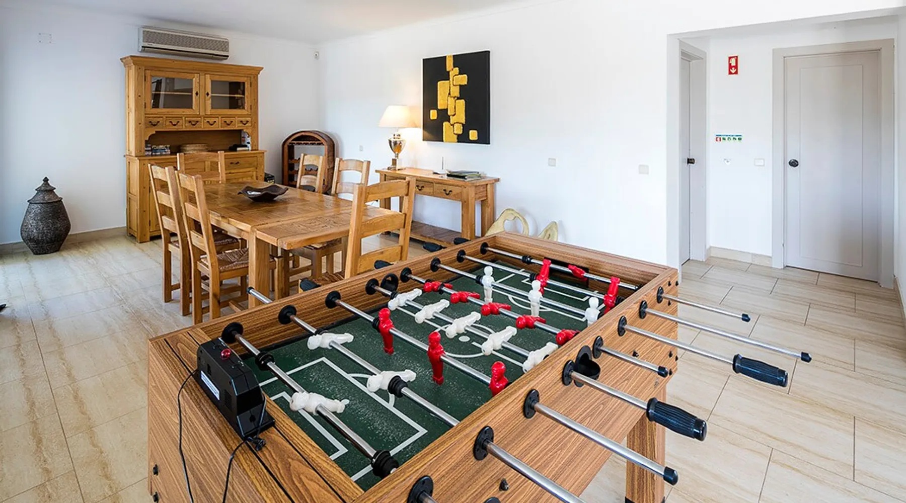 Ideally located property in the Salgados area, this six bedroom, five bathroom property truly caters for all family needs, with special emphasis on relaxation and a convivial social environment. Less than ten minutes drive from the centre of the bustling town of Albufeira, walking distance to the stunning Salgados golf course, and within a few minutes drive of a choice of beaches, some small and others than you can literally walk for kilometres, building up an appetite for an evening meal at one The space Vivenda Salgados is far from a typical rental property, more like an extremely well appointed family home, with ample areas for guests of all ages to relax and enjoy a truly memorable holiday. All needs have been meticulously thought out. This fantastic six bedroom, five bathroom fully alarmed property is set in a large walled and fenced plot accessed by electric gates with more than adequate parking and surrounded by gardens on all sides of the property. The walls, additional hedging and trees offer plenty of privacy, yet only a very short walk to the nearest restaurants. Salgados is about ten minutes drive from the centre of the bustling towns of Albufeira and Armação de Pêra. Guia, the capital of chicken piri-piri is only about five minutes away as well as Zoomarine and Algarve Shopping commercial centre. Salgados golf course, is only five minutes walk from the villa. Horse riding is available at Quinta da Saudade a couple of minutes drive away. Beaches and supermarkets are a 2 minute drive. The main living area consists of a huge 120m2 open plan, air-conditioned living area with doors looking out to the terraces. A large leather sofa offers plenty of seating as well as an internal dining area and further leather sofas in the snug complete with a large plasma tv, satellite, Playstation, a perfect space for the kids to escape from the hot sun. Adjacent is a football table and a separate guest w/c. There is a large, modern and fully equipped kitchen with breakfast bar and stools, complimented by an american style fridge freezer, microwave, Dolce Gusto coffee machine, double oven, dishwasher, washing machine and a 5 ring halogen hob with extractor, making it a pleasure preparing food, be it breakfast, lunch, dinner or just a simple barbecue for family and friends! The six very spacious bedrooms comprise of the following. On the ground floor, 1 double room (yellow) with ensuite bath, toilet and washbasin. 1 twin bedroom with ensuite shower room and 1 double bedroom (grey) with ensuite shower room. On the first floor we have the master bedroom with and ensuite shower room. 1 kingsize bedroom (cream woodgrain) and 1 double bedroom, both with private terraces, and sharing a large family bathroom with twin washbasins. Given that outside living is of paramount importance for holidaying guests, great care has been taken to ensure that this is extremely well taken care of and to provide all the things that we don’t easily find at home. On a lower level, a large 12 x 6m main swimming pool, connected to a kiddy pool, totalling 16m long (with optional pool heating at 250 GBP per week) is surrounded by a large patio area with sun loungers and lawned borders. Overlooking the pool level there are extensive terraces. One area contains a large chill and seating area with modern rattan furniture where one can read a book, or everyone can get together for some enjoyable pre or post dinner drinks. On the other side of this terrace, a large covered dining terrace can be found, perfect to enjoy a prolonged evening meal in great company! Parents can keep an eye on the children, playing table tennis, football or having fun in the pool without having to leave the table, thus completing to full family entertainment relaxation and, most importantly, peace of mind! Please contact us about other possible changeover days. Between Saturday 27th July and Thursday 8th of August 2019 we would be happy to accept a 12 night booking. Should you require airport transfers or car hire and we will put you directly in contact with our chosen partners. Please contact us directly regarding our "Winter Special Offers" rates. 18407/AL - Casa Salgados Registration details 18407/AL