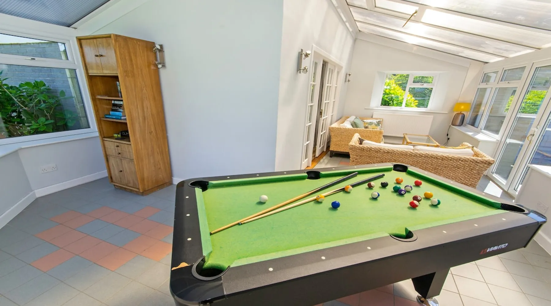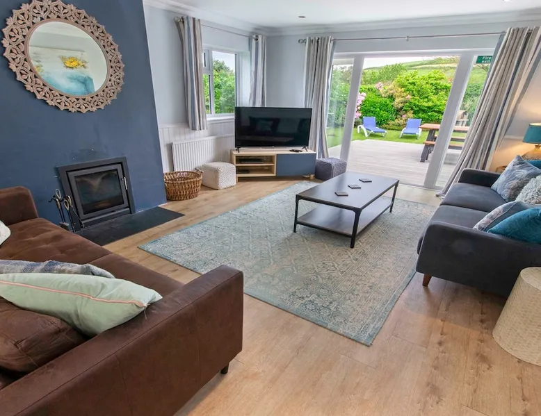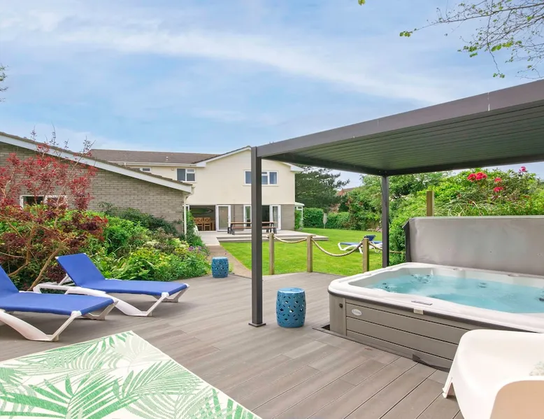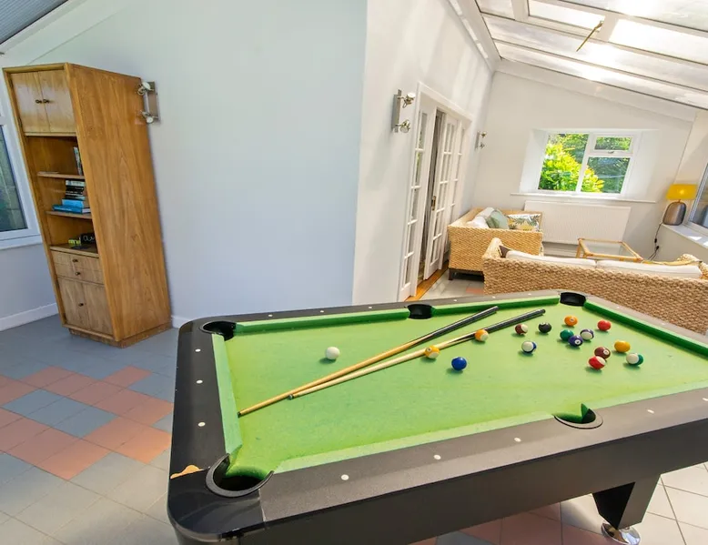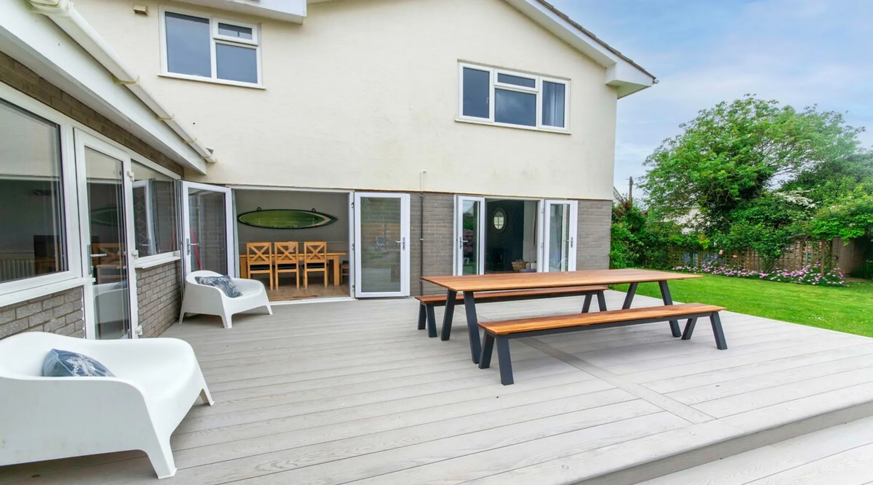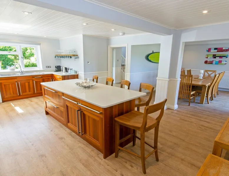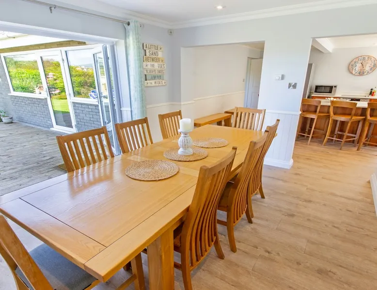 Introducing LADYWELL by CROYDEHOLIDAYS - Designed with family life in mind, this detached cottage that sleeps 12 is a stylish property offering something for everyone. Children will enjoy exploring the large enclosed garden, pool table and cinema room, with games console, whilst parents enjoy al fresco dining with the use of the pizza oven or the bubbles of the *hot tub. The space Inside, the house is finished to a beautifully high standard, you will discover a SKY Q Multiroom TV with sports and Netflix and a pool table. Ladywell makes the perfect place to dine and enjoy long leisurely meals made easy with the well equipped kitchen to cook up a culinary masterpiece and the dining room comfortably seats twelve so you can gather the group for that catch up dinner at last. For those days that are all about the beach enjoy a leisurely short stroll along the footpath to Croyde beach, that offers great surfing opportunities and time to unwind before returning home to relax. If you are looking for the perfect family holiday cottage that sleeps 12 with hot tub and that added dash of luxury, Ladywell is the choice for you. (Hot tub charges apply) PROPERTY Living room provides comfortable leather seating with log burner and a large flat screen SKY TV (sky package plus sports) Features include; Netflix movies with log in supplied, DVD player, selection of books, DVDS and iPod dock. French doors lead out onto the decked terrace and garden. Doors at the other end of the living room lead to the sunny L shaped conservatory with additional seating, board games and a large football table. Open plan kitchen, breakfast/dining room is well equipped for a large family and offers; 2 electric ovens, ceramic hob, dishwasher, DAB radio, toaster, coffee machine and large fridge. The centre island is a breakfast bar with 4 bar stools and opens into a beach themed dining room with large table and seating for 12. The utility room houses an under counter freezer, washing machine, tumble dryer and additional sink. Separate W.C and washbasin. The TV room with a large blue corner sofa, LCD flat screen TV with a DVD player and a Wii console with games and board games! • Bedroom Six - Superking sized bed (Twin on request) located on the ground floor. En-suite shower room with WC and washbasin. FIRST FLOOR; • Bedroom Two - Kingsize bed and beautiful views over the countryside. • Bedroom Three - Twin beds with bedside unit and built in wardrobe. • Bedroom Four – Bunk bed • Bedroom Five - Twin beds with bedside unit and chest of drawers. • Master bedroom - Super kingsized bed in a generously sized room with views over the countryside. En-suite with w.c, washbasin and shower cubicle. Family bathroom with a white bathroom suite; bath with shower over, W.C, washbasin, heated towel rail and mirror. Shower room with a white bathroom suite with a large shower cubicle, w.c, washbasin and mirror. OUTSIDE SPACE Large enclosed lawned garden which wraps around the side of the property with well-maintained shrubs and flowers. Enjoy 2 decked terraces with a selection of tables, chairs and sun loungers for 'al-fresco' dining with a built in BBQ or try your pizza skills with the brick built pizza oven! An outside shower for washing off after a day spent at the beach and storage for boards/bikes.For those more lazy afternoons relax in the jacuzzi hot tub*! PROPERTY NOTES: • Driveway parking for 4 cars • Hot tub not to be used after 10.30 PM • We regret we are unable to accept bookings that are; all adult groups under 23 years of age. • To comply with Health & Safety hot tubs are emptied and re-filled. Therefore, we are unable to provide any guarantees that the hot tub will be up to full working temperature until the morning after arrival. • We would respectfully ask that dog(s) are not permitted on furniture, in bedrooms, left unattended nor to cause a disturbance to neighbours. INCLUDED: • Heating, Electric and water • Bed linen (2 Super king size, 1 kingsize & 6 singles) • Bath mats, Tea towels and Ovenglove • Bath towels (Per person) (Max 12) • Hand towel per bathroom (5) • High Chair • Stair Gate • Travel Cot (Excludes linen) BOOKING DETAILS: It is not possible to add extras when booking via an advertising channel like this one, therefore the costs of any extras will not be included within the price shown, these must be requested at the time of booking and paid for directly with Croyde Holidays Agency. By making a booking via this channel we will require some extra booking details from you, this will be requested via email at the time of booking in order for us to finalize your provisional booking request. HOLIDAY EXTRAS • Pet Charge - £40 per dog per week/short break (Max 4) • Hot Tub Usage - £200 (4-7 nights) • Hot Tub Usage - £150 (short breaks 2-3 nights) • Late Departure (6pm) - £120 (short breaks departing on a Sunday) • Twin Beds - Request ground floor king into twin beds