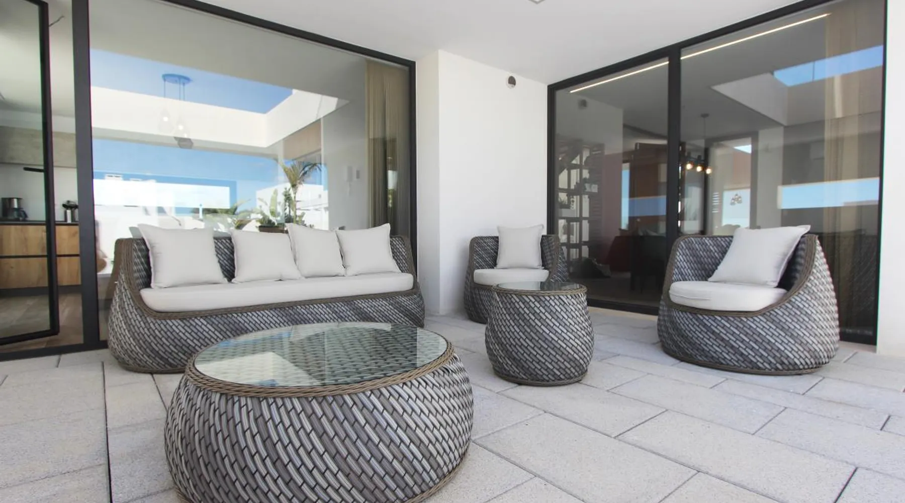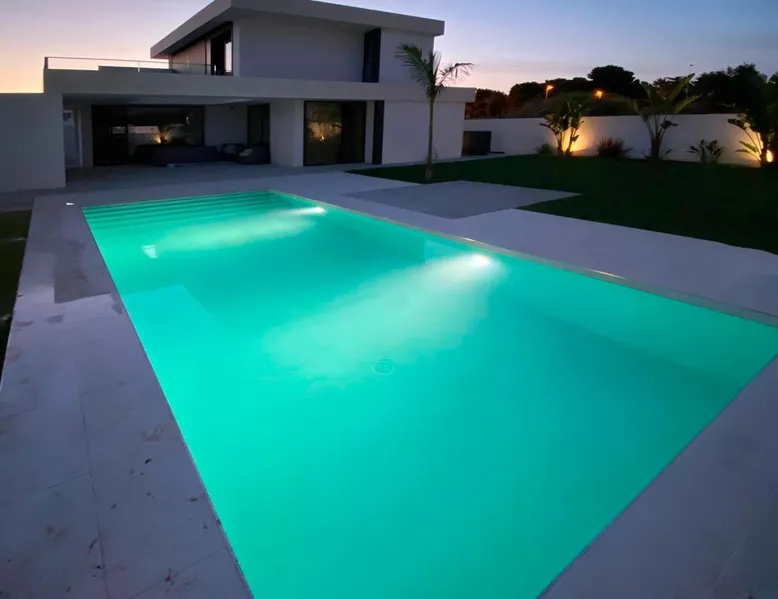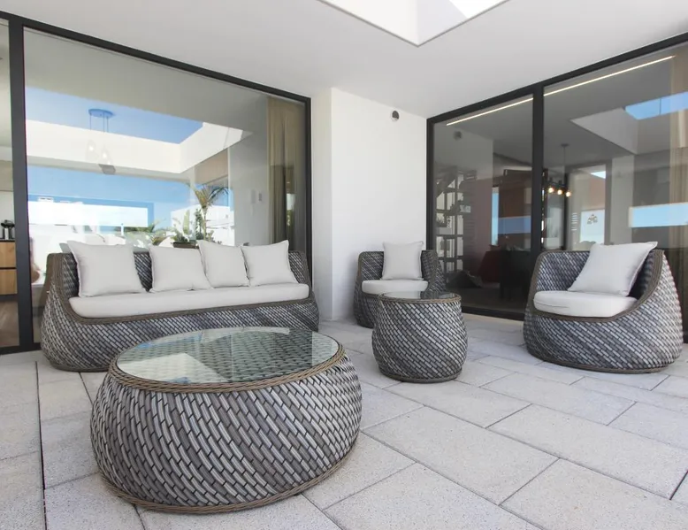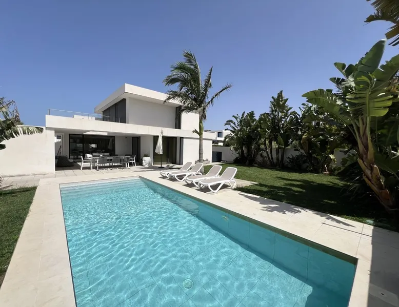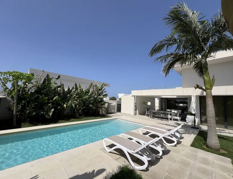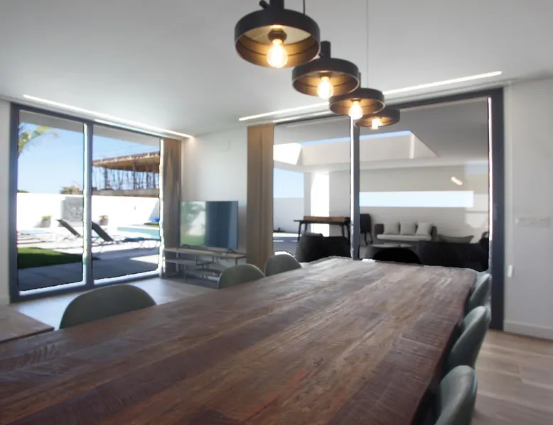 Luxury holiday home for up to 10 pax with private pool close to the beach Casa Haizea is a new house in a class of its own and is ideal for large or 2-3 small families with its 5 bedrooms. The house is located between Conil and the district of Fuente del Gallo close to the beach, so you don't really need the car. It was finished in the summer of 2021 and is very modern and tastefully furnished. On the ground floor you will find the large living room, which is open to the dining area and the The space kitchen. Large windows and patio doors allow the terrace to merge with the living space in summer. The kitchen is fully equipped and when cooking on the cooking island you look out over the elongated pool. On this floor there is also a bedroom with two single beds and its own shower room and terrace. There is also a guest toilet. On the first floor there are two beautiful bedrooms with fantastic sea views. They are each equipped with a double bed and ensuite bathrooms. The refined architecture allows sea view showers in both bathrooms and both bedrooms have access to a beautiful sea view terrace. In the basement, which has floor-to-ceiling windows in all areas, there is space for another family: there is one bedroom with two beds and one with three beds, as well as a shower room. The large living room with a huge sofa and recreation area is especially attractive for children when the weather is not so good. Here is also a utility room with washing machine with integrated dryer. All bedrooms and the living room have air conditioning (cold/warm), so that the house offers pleasant temperatures all year round. a special detail is the sophisticated lighting in the outdoor area and in the bedrooms. In front of the kitchen and living room is the terrace with dining table and lounge furniture. It has a beautiful view over the pool in to the Buddha. Around the 9x3 m pool there are several sunbeds and a very beautifully landscaped garden. vft/ca/12120 Other things to note Prices include: All taxes - All utility costs - Internet access (wifi) - bedding, towels (for bath and pool) - Intermediate cleaning for bookings of 14 days and more - final cleaning Registration Details Spain - National registration number ESFCTU0000110260001882300000000000000000VFT/CA/121208