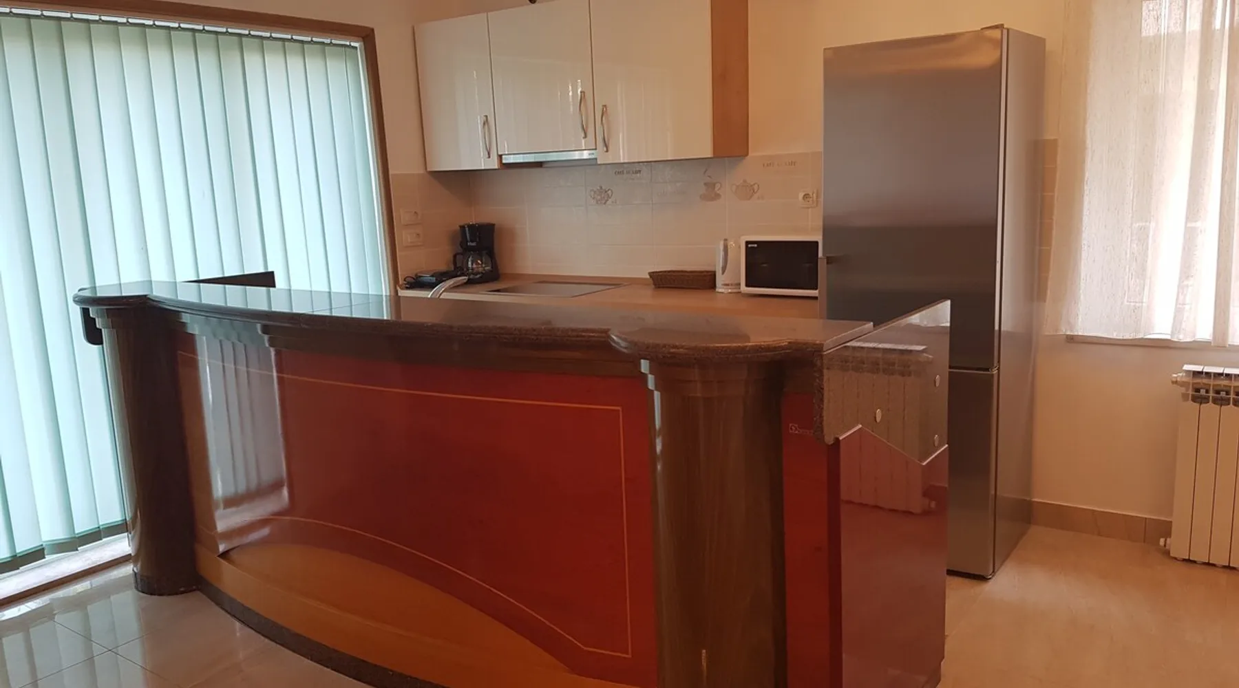 The apartment has 120 m2 and is located on the ground floor of a house. It consists of 2 large rooms, 2 bathrooms, a kitchen, living room and dining room. It has 2 large terraces. The beach is a 5-10 min walk from the property. The apartment is fully equipped with all the necessary appliances, linens, and air conditioning. Free WIFI and SAT SMART TV is also available. The space Near the apartment there are 2 markets, a bakery and a restaurant.