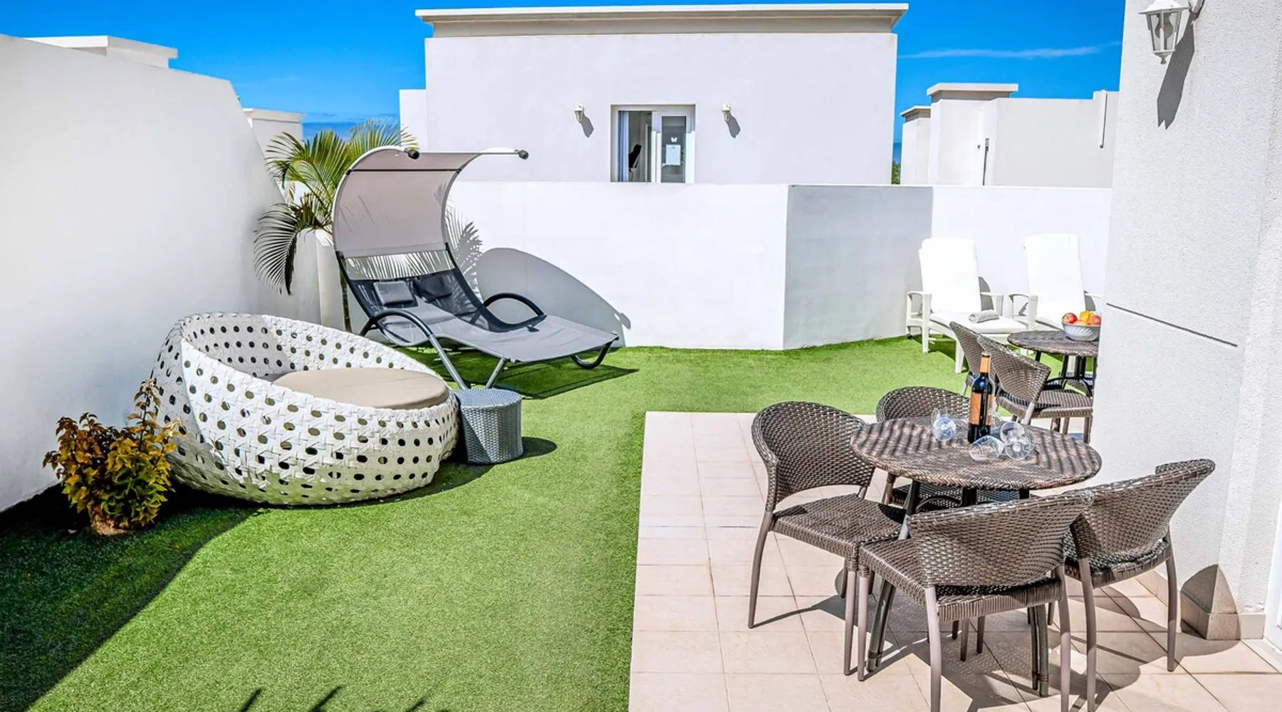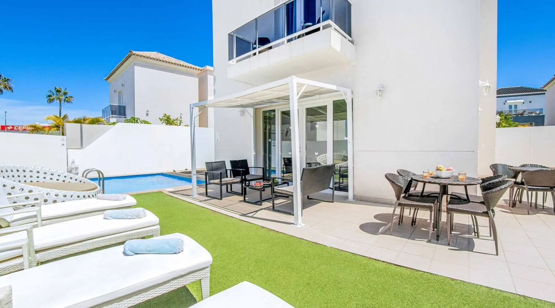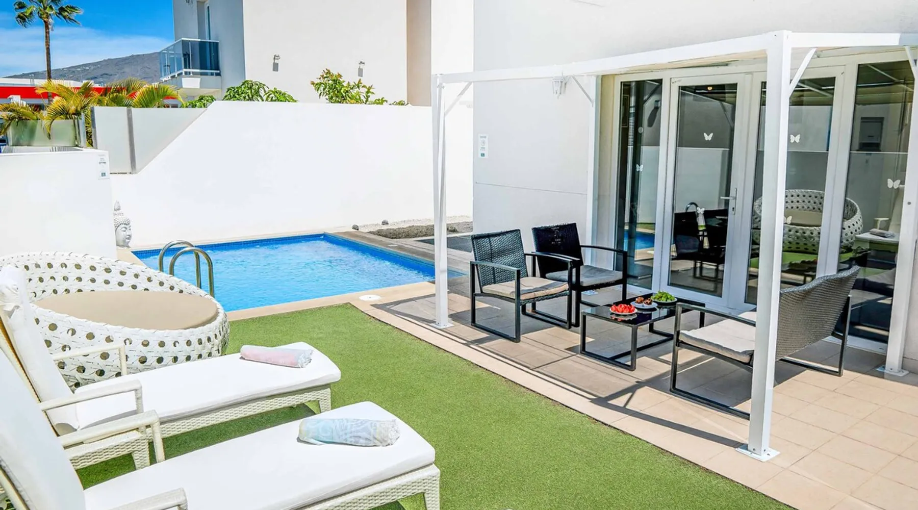 Villa Acacia is one of four exclusive villas for Solmar Villas located in the popular area of Fanabe in Costa Adeje. Set in a gated community, this detached whitewashed villa is designed over three levels and is ideal for those not wanting to drive whilst on holiday. On the ground floor, there's a modern fully equipped kitchen and a spacious lounge with comfortable seating and dining facilities. The space The first floor consists of a double bedroom and a twin bedroom that share a shower room and the master bedroom with an ensuite bathroom. Stairs lead down from the ground floor to the lower ground floor where there is another double bedroom with air-conditioning and a separate utility area. The lounge and all bedrooms have air-conditioning for your comfort and WiFi is also included. From this level you can access your underground garage for those with a hire car. Patio doors from the lounge lead out to your outdoor living area with private swimming pool which has electric heating* and sun loungers with comfortable mattresses. An open terrace with dining table is positioned near a BBQ for lazy days dining alfresco with family and friends. A large supermarket can be found a short walk away at the nearby shopping centre and Fanabe beach with a wide range of restaurants can be reached within 15 minutes’ walk from the villa. Please note, an internal staircase leads to the garage on the lower ground floor. Access to the bedroom, shower room and utility is off the garage. Accessibility - To access the villa there is a path which is 97cm wide and one step. The front door has a width of 100cm. The width of the door leading to the pool terrace is 83cm wide, whilst the terrace and pool are open plan, with tiles and artificial grass. The pool itself has ladder access. Inside, there are no bedrooms on the ground floor. There are 17 steps to the first floor, where all bedrooms and bathrooms have a door width of 60cm. The steps leading to the first floor are steep and turn at sharp right angles. The door into the kitchen/dining area is 70cm wide, whilst the door to the lounge is 110cm wide. *Please note that although every effort has been made to ensure the information provided is accurate, errors can occur and if you need to find out more specific information about the villa, please do not hesitate to contact us. Registration Details Canary Islands - Regional registration number VV-38-4-0097331
