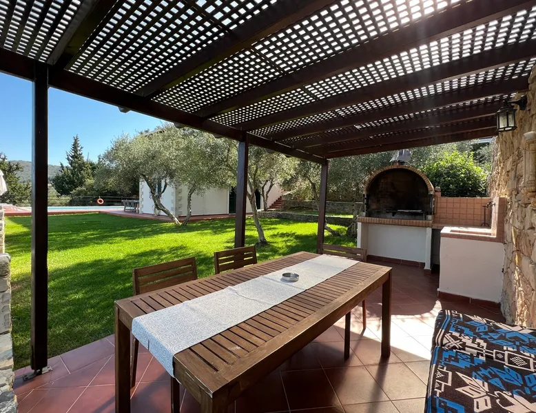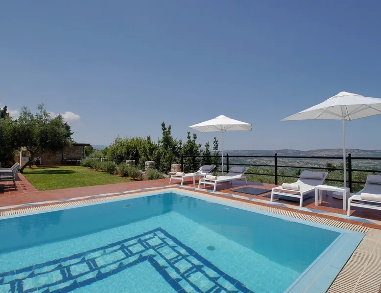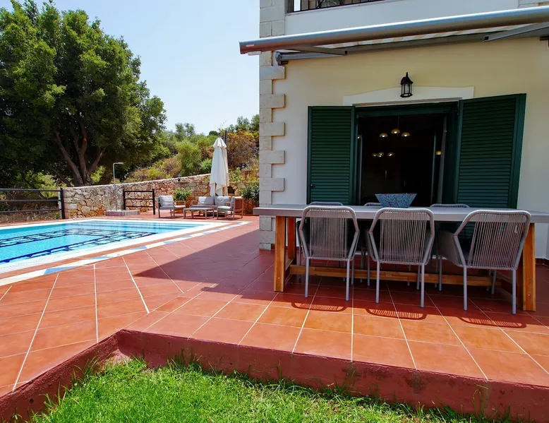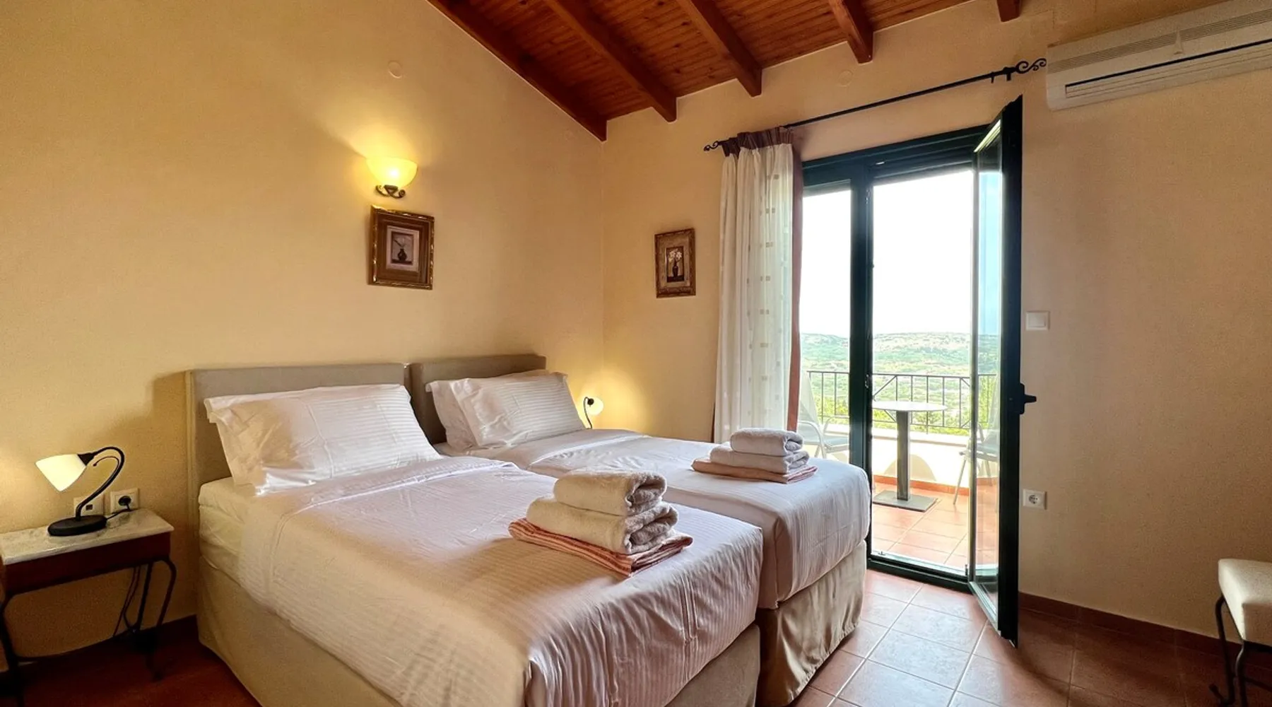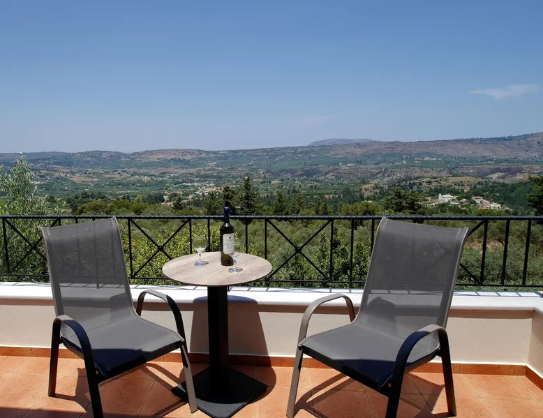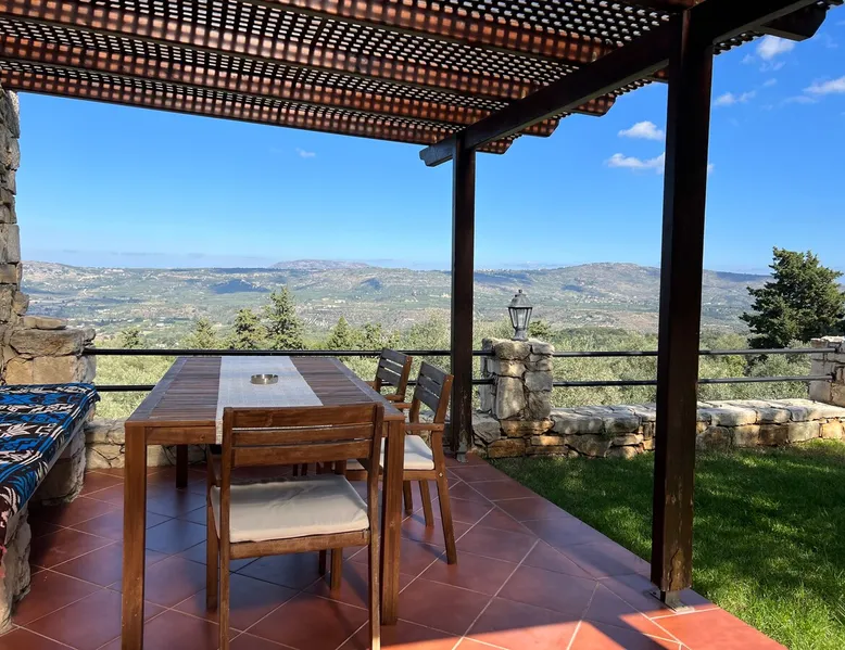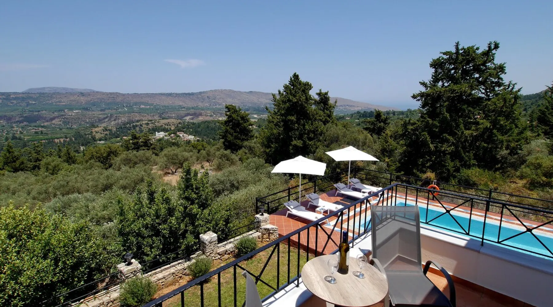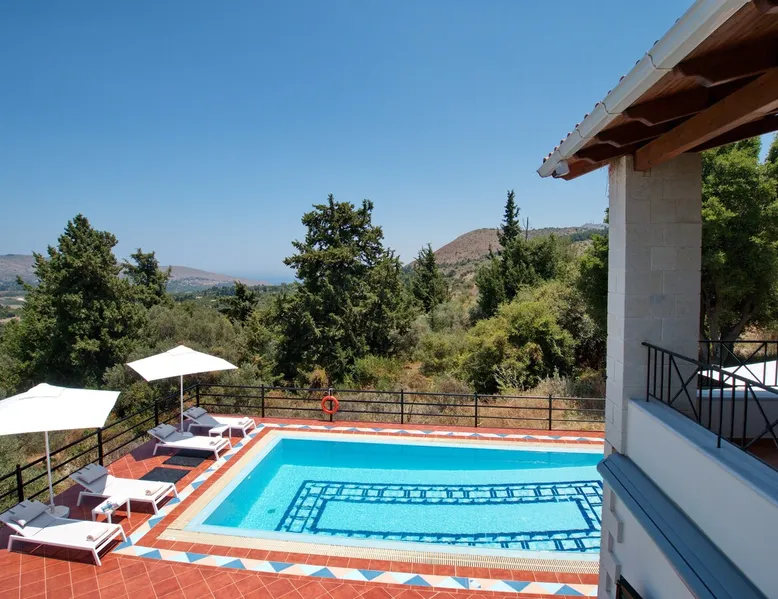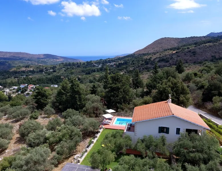 "Stunning, spacious villa with fantastic views & easy reach of the beach" The space Villa Artemis, Vrisses, Crete Built on three levels, Villa Artemis provides ideal accommodation for larger families with a generous living area and air conditioning in all five bedrooms. Each of the first floor bedrooms has its own balcony, providing a little privacy along with the stunning views. Sitting on a terraced hillside in a remarkably peaceful setting, near the tiny village of Maza, Villa Artemis enjoys superb, panoramic views over green and verdant olive groves and rolling wooded countryside to the distant vivid blue sea. Location Vrisses, just 3kms away has a good choice of minimarkets, a renowned baker, and tempting Greek pastry shop as well as a choice of tavernas where you can dine beside the little gushing stream which runs down the leafy valley. In the tiny village of Maza just 1.3km down the hill, Costas Taverna has become quite an institution in Crete and is very well reviewed on tripadvisor and a long term favourite with guests staying in Villa Artemis. The pretty small resort of Georgioupolis with its wonderful long sandy beach and a huge selection of tavernas is approximately 15 mins drive. Outside Villa Artemis Swimming pool - 9m x 4m swimming pool with roman step entry, 0.60cm then sloping down to depth of 1.80m. Sunbathing terrace - sunbeds, rattan sofa set, shower. Garden - Lawn area, terraces of olive trees with steps to front entrance and terraced flower beds with sloped access to pool area and rear entrance. Covered Dining Terrace - table and chairs. Barbecue House - BBQ, sink with tap, table and chairs. 3 first floor balconies - each first floor bedroom has a balcony furnished with chairs and table. Inside Villa Artemis Open Plan Ground floor Living area Sitting area – Two comfy sofas and easy chairs, plasma TV with satellite, DVD player, french doors opening to the covered dining terrace and garden. Air Con Unit. Dining Area - Wooden table and seating for six, Cretan sofa, entrance door to terraced garden. Kitchen Area - Wooden fitted cupboards, double sink, electric oven with ceramic hob, microwave, dishwasher and fridge freezer. Window above the sink to the garden. Single bedroom 1 - Single bed, fitted wardrobes, high windows to side. Air con unit. Shower room 1 - Walk-in shower, hand basin and WC. First Floor Double bedroom - 1 double bed, fitted wardrobe, double doors to balcony with table and chairs and views of pool and down the valley to the sea. Air con unit. Twin bedroom – 2 single beds, fitted wardrobes and double doors to a balcony with table and chairs and views of the pool and down the valley to the sea. Air con Unit. Double bedroom - 1 double bed, fitted wardrobe and double doors to balcony with table and chairs and views over the olive terracing, window to the view down the valley to the sea. Air con Unit. Family bathroom - Bath with shower over, hand basin, WC and washing machine. Second Floor Double bedroom - in the eaves of the Villa, with curtained doorway, low level double bed, easy chair, low level circular windows down the valley to the sea. Air con unit. Parking - There is ample parking space next to the Villa off the lane. Welcome Pack - on arrival you will find a few drinks and snacks to begin your holiday. Wifi access - free of charge. Essential Information: Sleeps (Max) 9 Bedrooms 5 Shower Rooms 2 Maid Service Included Pool Private 9m x 4m A/CIncluded Floor Area m² 150 Booking Information: Check-In Any day (after 16:00) Check-Out Any day (before 10:00) Minimum stay 5 nights Local Facilities: Beach 8 km Tavernas 3 km Mini Market 3 km Distances: Chania Airport 45 km Heraklion Airport 112 km Villa Equipment: DVD TV Satellite TV Dish Washer Washing Machine Hair Dryer Toaster Kettle Sun Lounger Microwave WiFi Connection Safe Fan BBQ Filter Coffee Machine Iron & Board Pool Towels Fridge Freezer Hob Cooking Utensils Guest access The whole villa and pool is for your private use only, as well as the garden. Bed linen & towels are provided as well as pool towels. The cleaner will come in during your stay & change them, depending on how many days you are staying. All of this is included in the price. Other things to note Housekeeping Your Villa will be prepared for you on arrival with fresh bath and hand towels and all beds made up. For stays of 7 nights or more - house towels will be changed every 3 - 4 days. For stays of 14 nights or more - bed linen will be changed every 7 days. Pool/beach towels - one per person for the duration of your stay. If you need a baby cot or high chair, please request when booking so we can have it in the villa for you ready. Optional chargeable services: - Second High Chair - Second Cot Note that this is a professionally run rental villa which as been licensed by the Greek National Tourist Organization, EOT, which is required by the Greek law. This license allows the property owners to legally rent their accommodation to holiday makers, so that they comply to a set of standards and specific conditions for the safety & comfort of it's paying customers. Registration Details 1237306