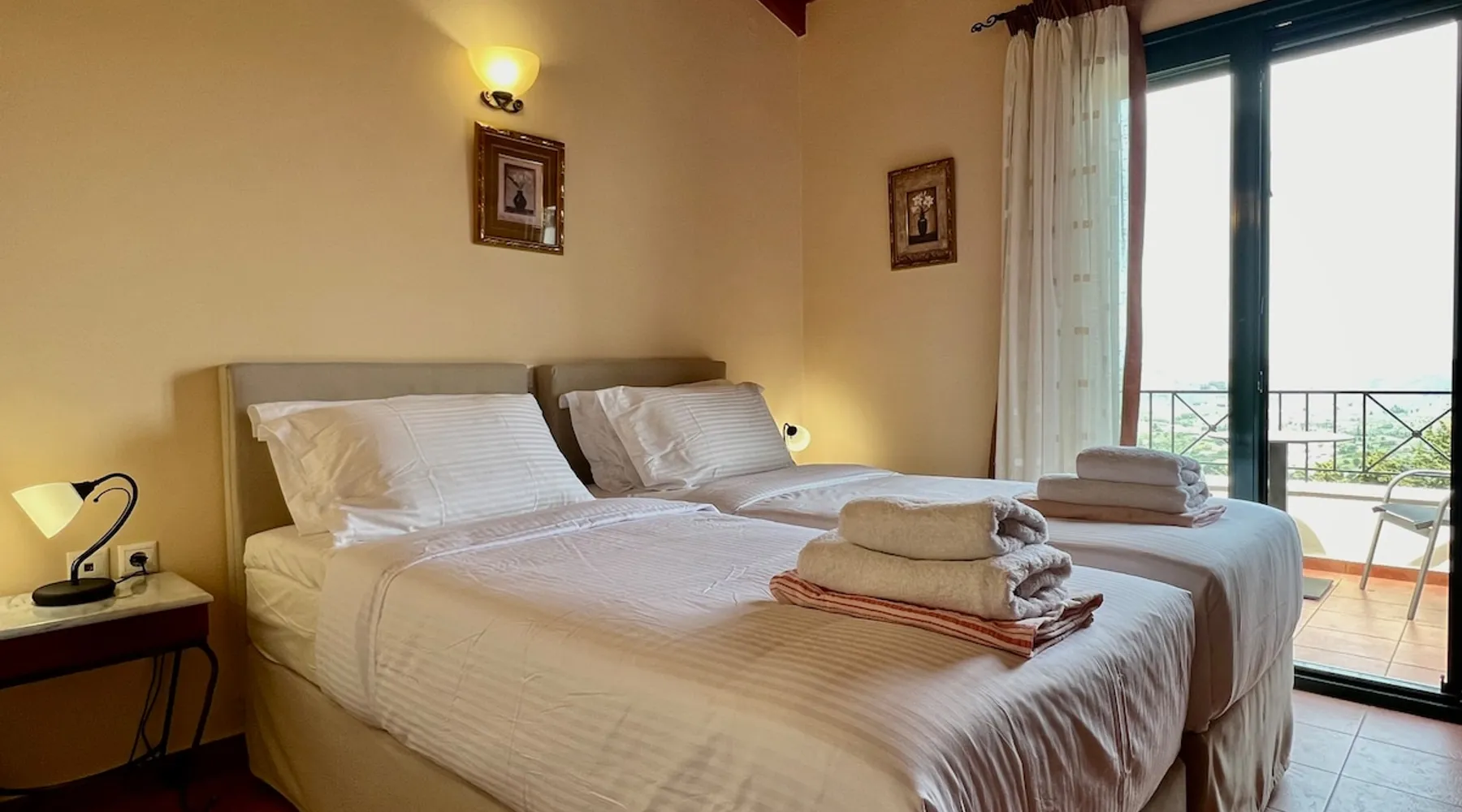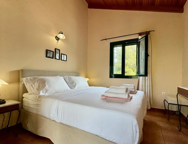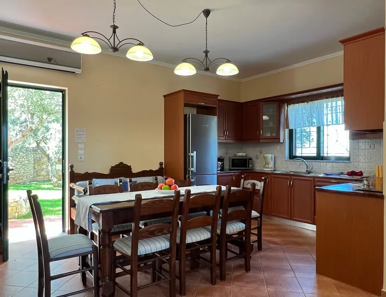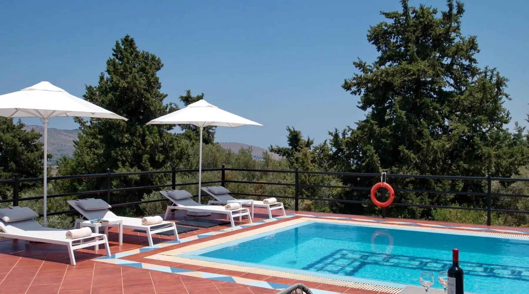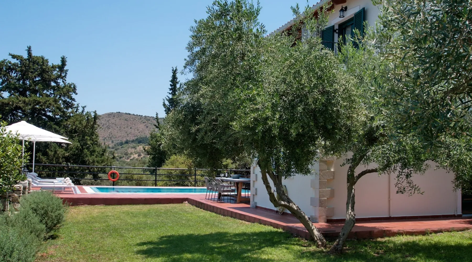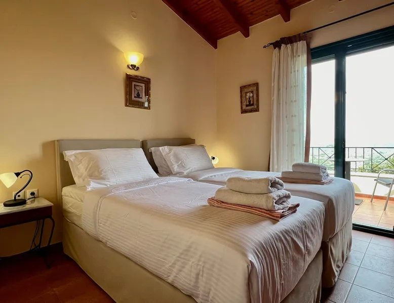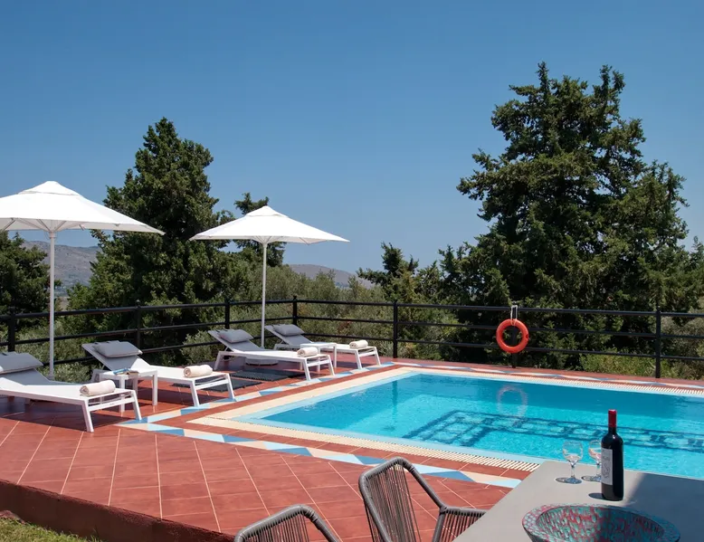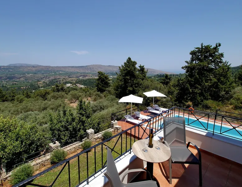 "Stunning, spacious villa with fantastic views & easy reach of the beach" The space Villa Artemis, Vrisses, Crete Built on three levels, Villa Artemis provides ideal accommodation for larger families with a generous living area and air conditioning in all five bedrooms. Each of the first floor bedrooms has its own balcony, providing a little privacy along with the stunning views. Sitting on a terraced hillside in a remarkably peaceful setting, near the tiny village of Maza, Villa Artemis enjoys superb, panoramic views over green and verdant olive groves and rolling wooded countryside to the distant vivid blue sea. Location Vrisses, just 3kms away has a good choice of minimarkets, a renowned baker, and tempting Greek pastry shop as well as a choice of tavernas where you can dine beside the little gushing stream which runs down the leafy valley. In the tiny village of Maza just 1.3km down the hill, Costas Taverna has become quite an institution in Crete and is very well reviewed on tripadvisor and a long term favourite with guests staying in Villa Artemis. The pretty small resort of Georgioupolis with its wonderful long sandy beach and a huge selection of tavernas is approximately 15 mins drive. Outside Villa Artemis Swimming pool - 9m x 4m swimming pool with roman step entry, 0.60cm then sloping down to depth of 1.80m. Sunbathing terrace - sunbeds, rattan sofa set, shower. Garden - Lawn area, terraces of olive trees with steps to front entrance and terraced flower beds with sloped access to pool area and rear entrance. Covered Dining Terrace - table and chairs. Barbecue House - BBQ, sink with tap, table and chairs. 3 first floor balconies - each first floor bedroom has a balcony furnished with chairs and table. Inside Villa Artemis Open Plan Ground floor Living area Sitting area – Two comfy sofas and easy chairs, plasma TV with satellite, DVD player, french doors opening to the covered dining terrace and garden. Air Con Unit. Dining Area - Wooden table and seating for six, Cretan sofa, entrance door to terraced garden. Kitchen Area - Wooden fitted cupboards, double sink, electric oven with ceramic hob, microwave, dishwasher and fridge freezer. Window above the sink to the garden. Single bedroom 1 - Single bed, fitted wardrobes, high windows to side. Air con unit. Shower room 1 - Walk-in shower, hand basin and WC. First Floor Double bedroom - 1 double bed, fitted wardrobe, double doors to balcony with table and chairs and views of pool and down the valley to the sea. Air con unit. Twin bedroom – 2 single beds, fitted wardrobes and double doors to a balcony with table and chairs and views of the pool and down the valley to the sea. Air con Unit. Double bedroom - 1 double bed, fitted wardrobe and double doors to balcony with table and chairs and views over the olive terracing, window to the view down the valley to the sea. Air con Unit. Family bathroom - Bath with shower over, hand basin, WC and washing machine. Second Floor Double bedroom - in the eaves of the Villa, with curtained doorway, low level double bed, easy chair, low level circular windows down the valley to the sea. Air con unit. Parking - There is ample parking space next to the Villa off the lane. Welcome Pack - on arrival you will find a few drinks and snacks to begin your holiday. Wifi access - free of charge. Essential Information: Sleeps (Max) 9 Bedrooms 5 Shower Rooms 2 Maid Service Included Pool Private 9m x 4m A/CIncluded Floor Area m² 150 Booking Information: Check-In Any day (after 16:00) Check-Out Any day (before 10:00) Minimum stay 5 nights Local Facilities: Beach 8 km Tavernas 3 km Mini Market 3 km Distances: Chania Airport 45 km Heraklion Airport 112 km Villa Equipment: DVD TV Satellite TV Dish Washer Washing Machine Hair Dryer Toaster Kettle Sun Lounger Microwave WiFi Connection Safe Fan BBQ Filter Coffee Machine Iron & Board Pool Towels Fridge Freezer Hob Cooking Utensils Guest access The whole villa and pool is for your private use only, as well as the garden. Bed linen & towels are provided as well as pool towels. The cleaner will come in during your stay & change them, depending on how many days you are staying. All of this is included in the price. Other things to note Housekeeping Your Villa will be prepared for you on arrival with fresh bath and hand towels and all beds made up. For stays of 7 nights or more - house towels will be changed every 3 - 4 days. For stays of 14 nights or more - bed linen will be changed every 7 days. Pool/beach towels - one per person for the duration of your stay. If you need a baby cot or high chair, please request when booking so we can have it in the villa for you ready. Optional chargeable services: - Second High Chair - Second Cot Note that this is a professionally run rental villa which as been licensed by the Greek National Tourist Organization, EOT, which is required by the Greek law. This license allows the property owners to legally rent their accommodation to holiday makers, so that they comply to a set of standards and specific conditions for the safety & comfort of it's paying customers. Registration Details 1237306