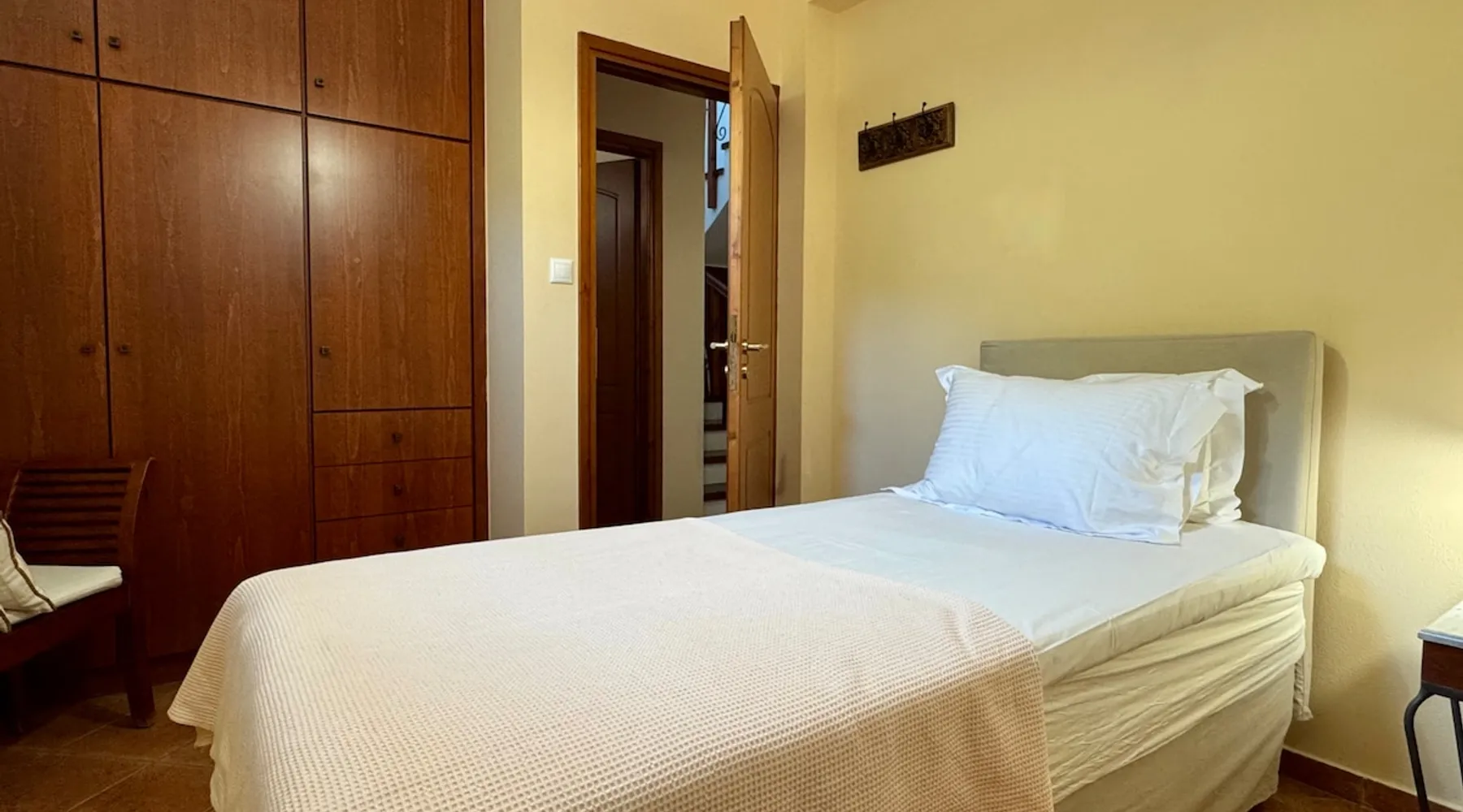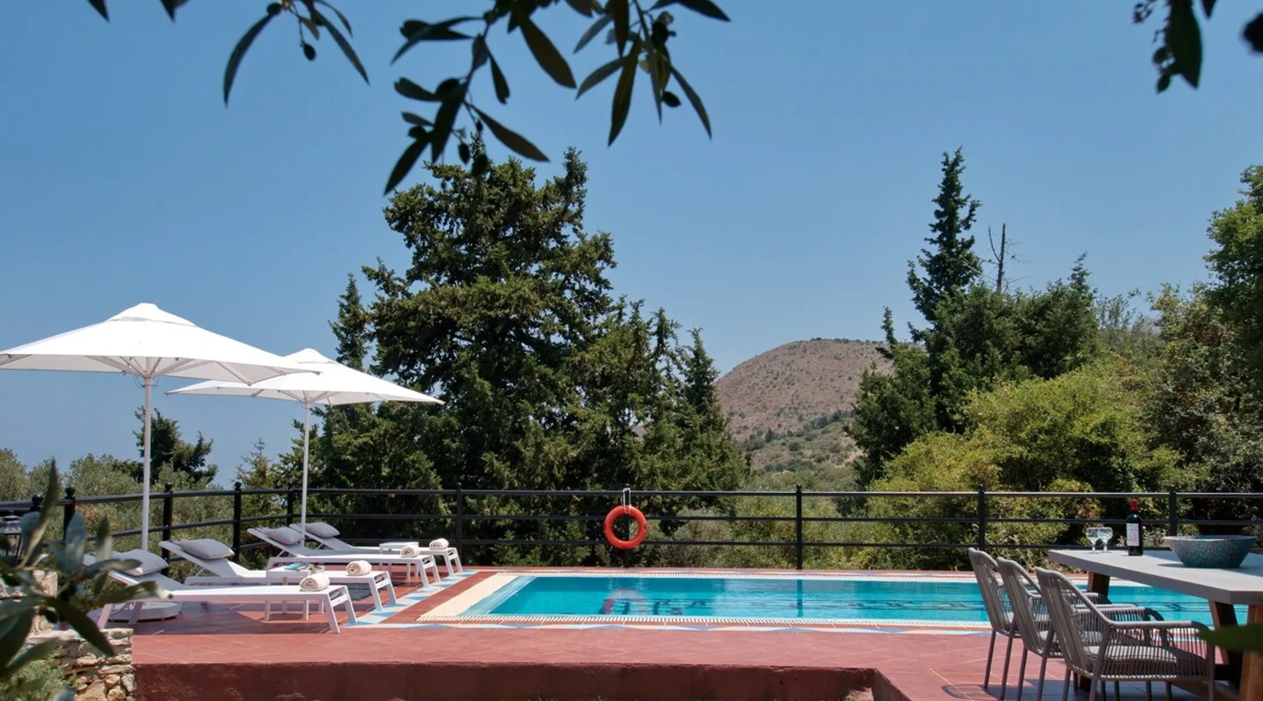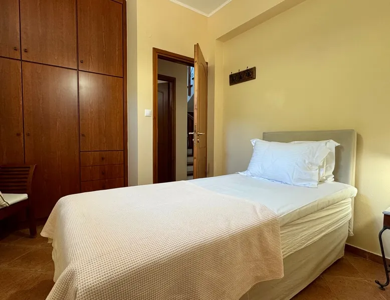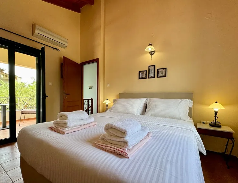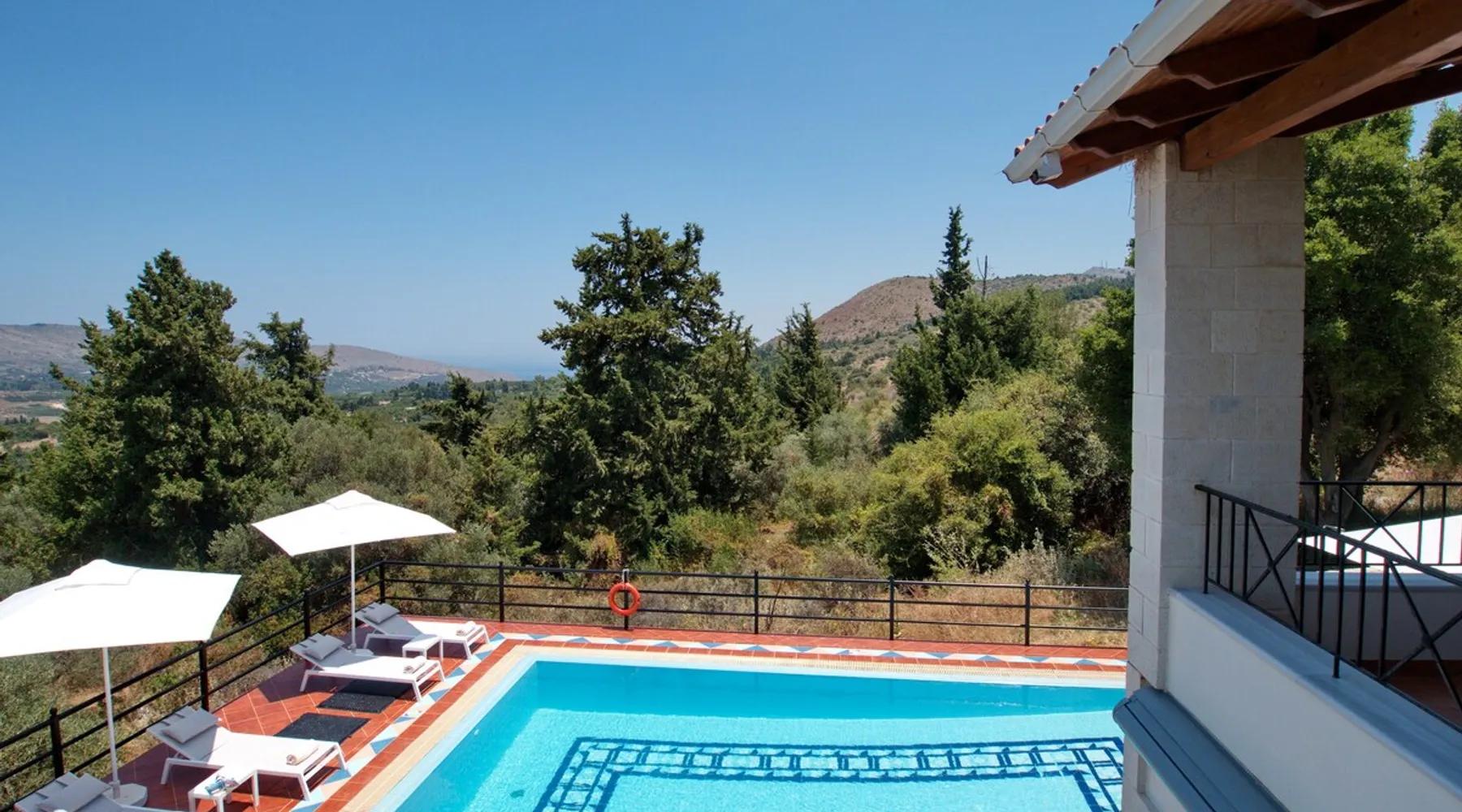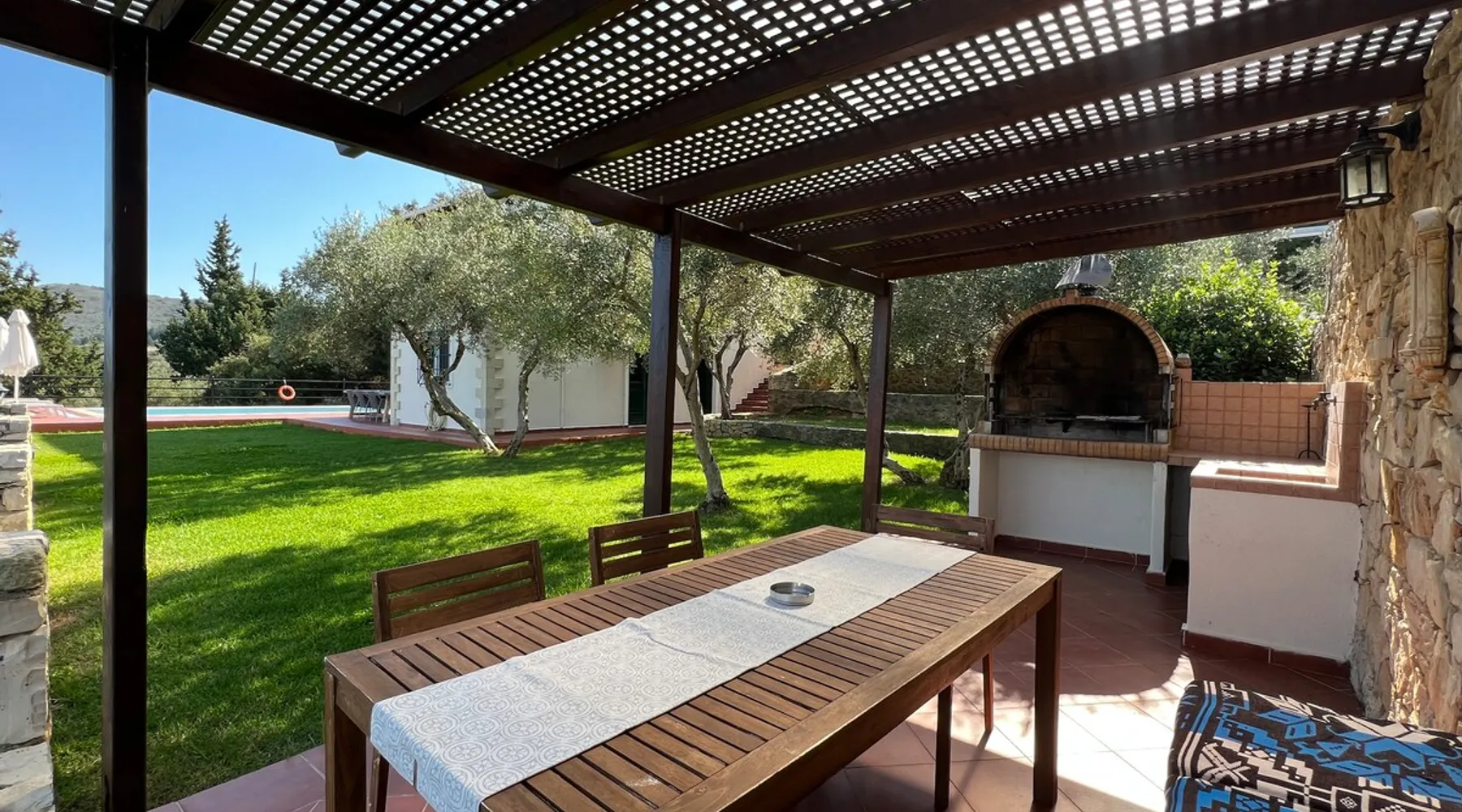 "Stunning, spacious villa with fantastic views & easy reach of the beach" The space Villa Artemis, Vrisses, Crete Built on three levels, Villa Artemis provides ideal accommodation for larger families with a generous living area and air conditioning in all five bedrooms. Each of the first floor bedrooms has its own balcony, providing a little privacy along with the stunning views. Sitting on a terraced hillside in a remarkably peaceful setting, near the tiny village of Maza, Villa Artemis enjoys superb, panoramic views over green and verdant olive groves and rolling wooded countryside to the distant vivid blue sea. Location Vrisses, just 3kms away has a good choice of minimarkets, a renowned baker, and tempting Greek pastry shop as well as a choice of tavernas where you can dine beside the little gushing stream which runs down the leafy valley. In the tiny village of Maza just 1.3km down the hill, Costas Taverna has become quite an institution in Crete and is very well reviewed on tripadvisor and a long term favourite with guests staying in Villa Artemis. The pretty small resort of Georgioupolis with its wonderful long sandy beach and a huge selection of tavernas is approximately 15 mins drive. Outside Villa Artemis Swimming pool - 9m x 4m swimming pool with roman step entry, 0.60cm then sloping down to depth of 1.80m. Sunbathing terrace - sunbeds, rattan sofa set, shower. Garden - Lawn area, terraces of olive trees with steps to front entrance and terraced flower beds with sloped access to pool area and rear entrance. Covered Dining Terrace - table and chairs. Barbecue House - BBQ, sink with tap, table and chairs. 3 first floor balconies - each first floor bedroom has a balcony furnished with chairs and table. Inside Villa Artemis Open Plan Ground floor Living area Sitting area – Two comfy sofas and easy chairs, plasma TV with satellite, DVD player, french doors opening to the covered dining terrace and garden. Air Con Unit. Dining Area - Wooden table and seating for six, Cretan sofa, entrance door to terraced garden. Kitchen Area - Wooden fitted cupboards, double sink, electric oven with ceramic hob, microwave, dishwasher and fridge freezer. Window above the sink to the garden. Single bedroom 1 - Single bed, fitted wardrobes, high windows to side. Air con unit. Shower room 1 - Walk-in shower, hand basin and WC. First Floor Double bedroom - 1 double bed, fitted wardrobe, double doors to balcony with table and chairs and views of pool and down the valley to the sea. Air con unit. Twin bedroom – 2 single beds, fitted wardrobes and double doors to a balcony with table and chairs and views of the pool and down the valley to the sea. Air con Unit. Double bedroom - 1 double bed, fitted wardrobe and double doors to balcony with table and chairs and views over the olive terracing, window to the view down the valley to the sea. Air con Unit. Family bathroom - Bath with shower over, hand basin, WC and washing machine. Second Floor Double bedroom - in the eaves of the Villa, with curtained doorway, low level double bed, easy chair, low level circular windows down the valley to the sea. Air con unit. Parking - There is ample parking space next to the Villa off the lane. Welcome Pack - on arrival you will find a few drinks and snacks to begin your holiday. Wifi access - free of charge. Essential Information: Sleeps (Max) 9 Bedrooms 5 Shower Rooms 2 Maid Service Included Pool Private 9m x 4m A/CIncluded Floor Area m² 150 Booking Information: Check-In Any day (after 16:00) Check-Out Any day (before 10:00) Minimum stay 5 nights Local Facilities: Beach 8 km Tavernas 3 km Mini Market 3 km Distances: Chania Airport 45 km Heraklion Airport 112 km Villa Equipment: DVD TV Satellite TV Dish Washer Washing Machine Hair Dryer Toaster Kettle Sun Lounger Microwave WiFi Connection Safe Fan BBQ Filter Coffee Machine Iron & Board Pool Towels Fridge Freezer Hob Cooking Utensils Guest access The whole villa and pool is for your private use only, as well as the garden. Bed linen & towels are provided as well as pool towels. The cleaner will come in during your stay & change them, depending on how many days you are staying. All of this is included in the price. Other things to note Housekeeping Your Villa will be prepared for you on arrival with fresh bath and hand towels and all beds made up. For stays of 7 nights or more - house towels will be changed every 3 - 4 days. For stays of 14 nights or more - bed linen will be changed every 7 days. Pool/beach towels - one per person for the duration of your stay. If you need a baby cot or high chair, please request when booking so we can have it in the villa for you ready. Optional chargeable services: - Second High Chair - Second Cot Note that this is a professionally run rental villa which as been licensed by the Greek National Tourist Organization, EOT, which is required by the Greek law. This license allows the property owners to legally rent their accommodation to holiday makers, so that they comply to a set of standards and specific conditions for the safety & comfort of it's paying customers. Registration Details 1237306