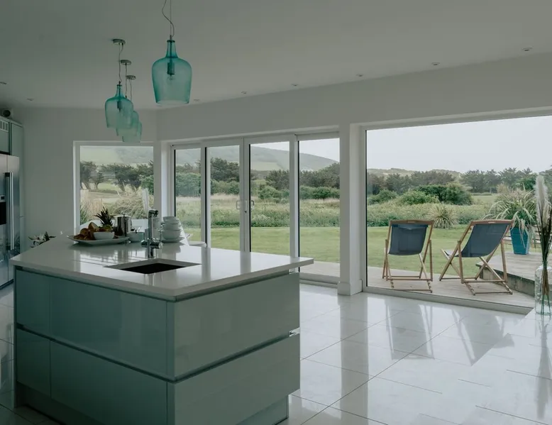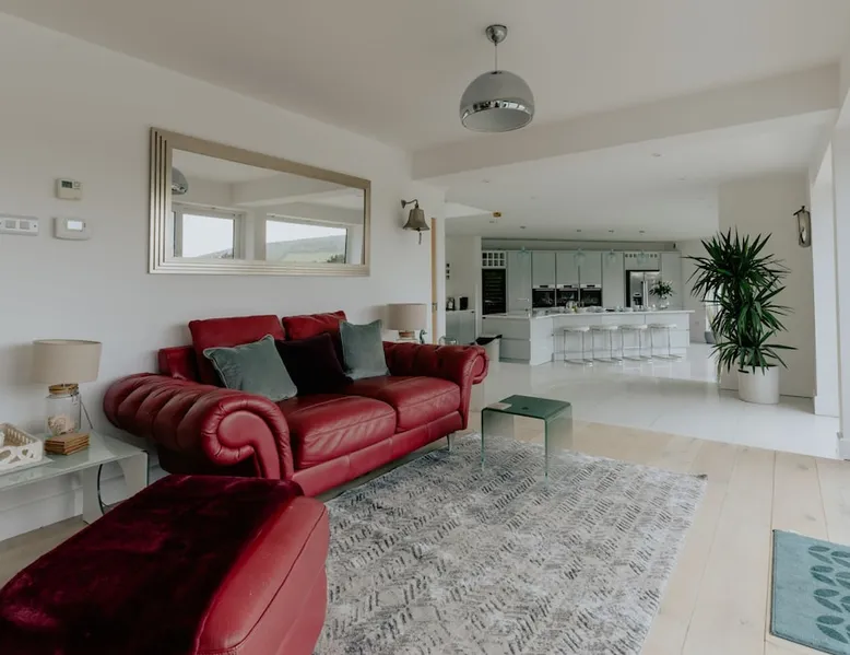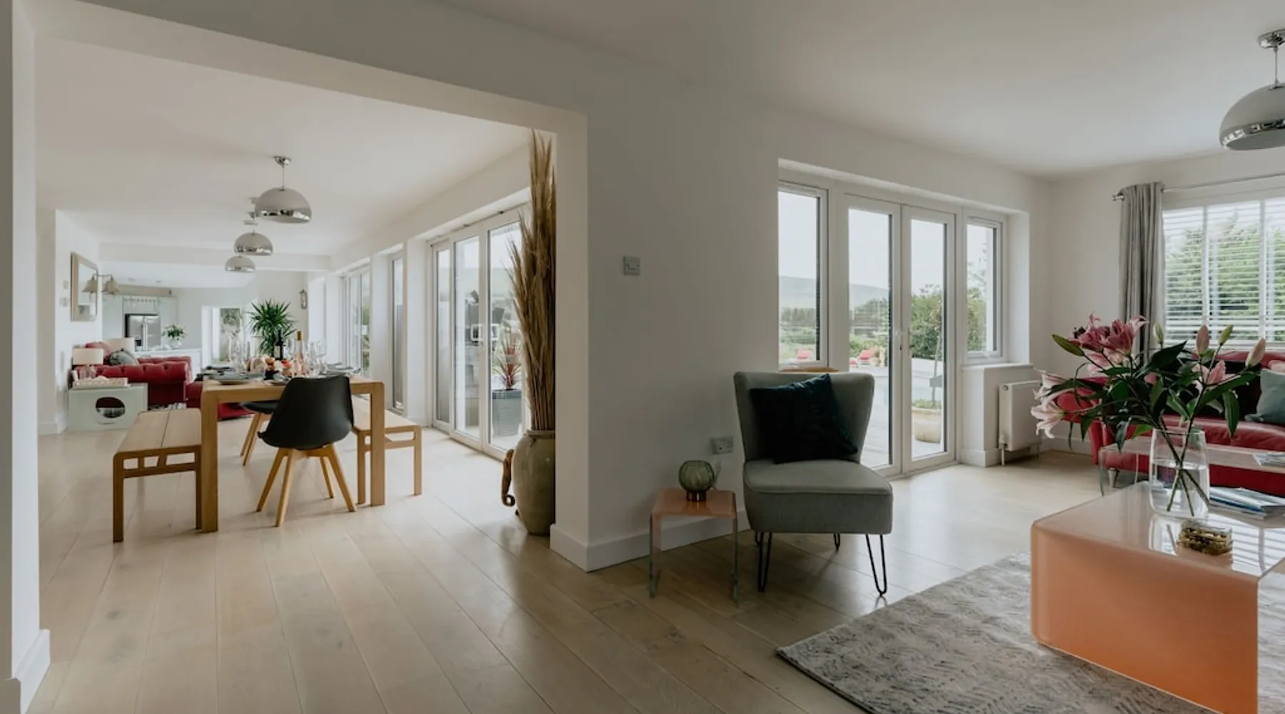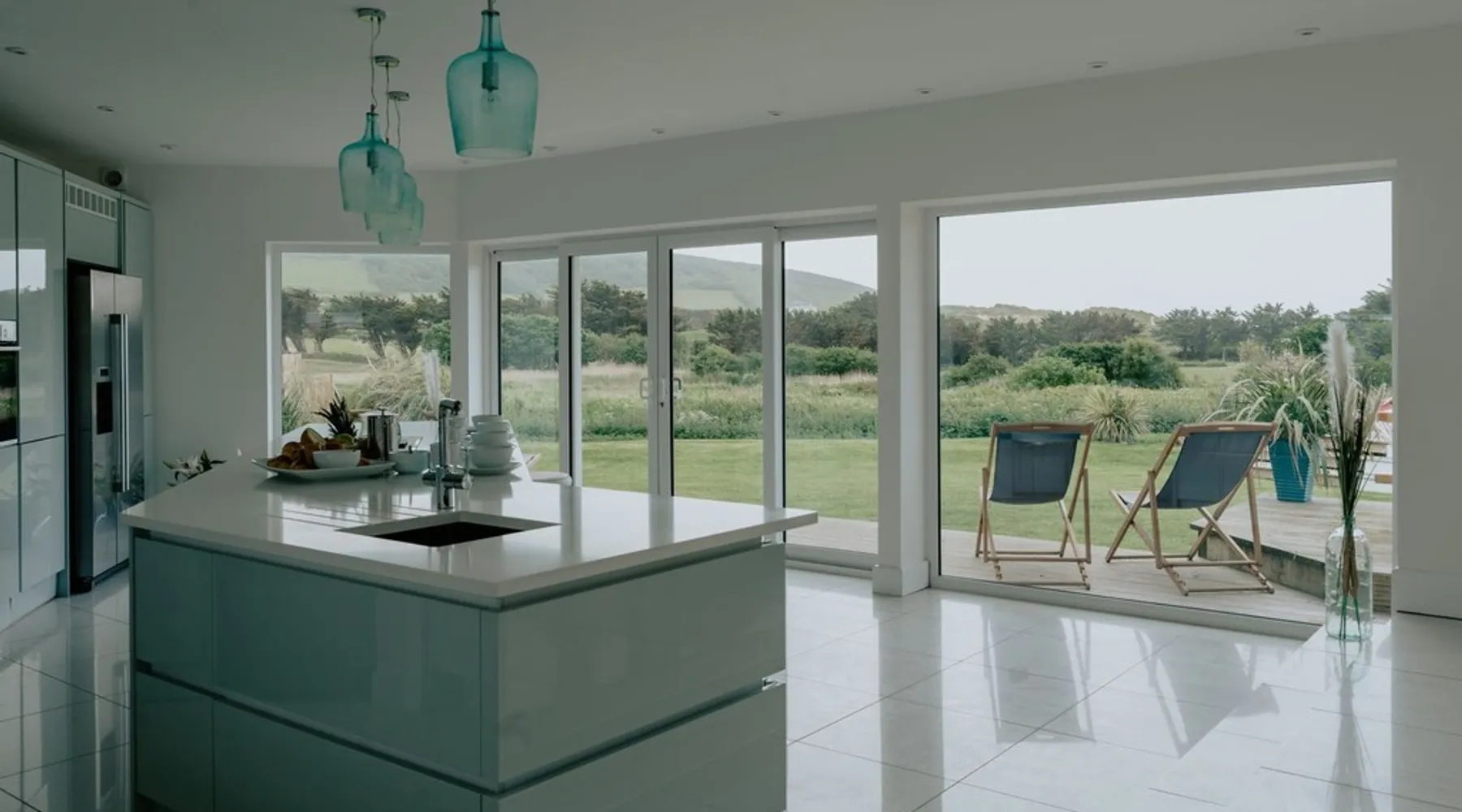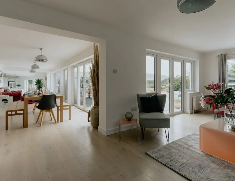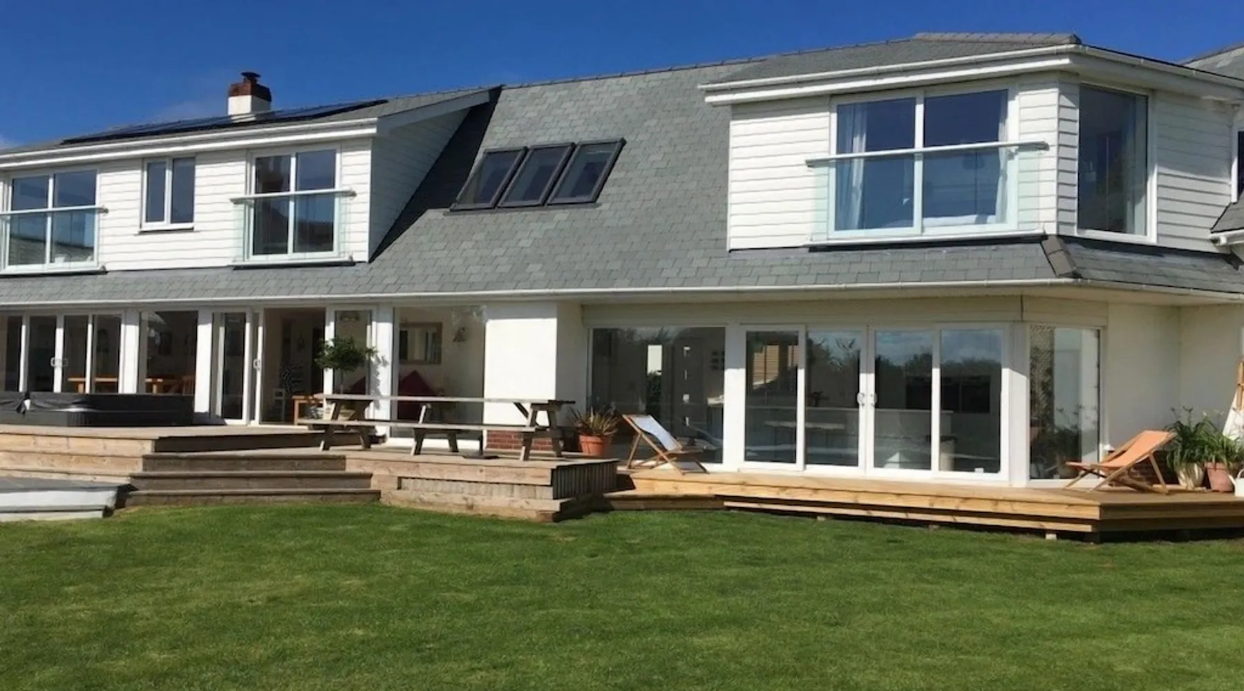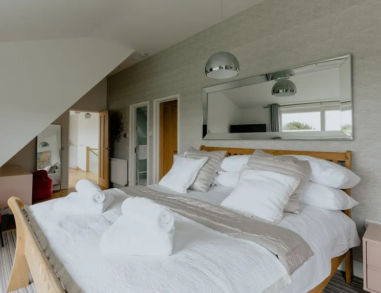 A spectacular home in a spectacular location. Aptly named, this five-bedroom home offers, peace, calm, tranquillity and a touch of luxury. Create special memories with friends and family, celebrate special occasions, or treat yourself to the holiday you deserve. Overlooking the fishing lakes that lead to Croyde beach, Oasis is designed to make the most of the unrivalled views. Moments from the beach and a stroll into Croyde village centre, it makes a fantastic base for exploring all that Croyde has to offer, but if you prefer to stay closer to home it is packed with amenities to keep you entertained. Designed to make the most of the unrivalled views across the sand dunes, the back of the property is almost entirely glass. The downstairs living space is open plan, with two discrete seating areas. The first being of a more traditional layout, and including a Internet enabled TV, plenty of games, entertainment options and comfortable sofas. The second seating area faces the garden, where you can easily while away a couple of hours looking out over the hills, fishing lakes and sand dunes. The dining space easily accommodates every member of your party at the large wooden table, with bench and chair seating. This a great space, for lively family meals and possibly the location of some epic games nights! Designed to make self-catering as stylish as possible. The kitchen is fully equipped for all budding chefs. Three ovens, including a combi microwave, makes catering for a large group easy. The large fridge freezer means there is plenty of room to store supplies. A boiling water tap means you are never going to need to boil a kettle! Bags of storage space and a bountiful supply of crockery and cooking equipment, helps you make the most of meal times. Located on the ground floor of the property are two of the five bedrooms. The ground floor master bedroom has a king bed, and en-suite wet room. This room easily accommodates a cot or z bed if required. The second ground floor bedroom is a double. Bed linen and beach towels are provided and all bedrooms have their own TV. The oak and glass staircase, leads to a double height upstairs landing, with ceiling windows, and a cosy seating nook for star gazing at night, or simply a quiet space to read and relax. The Master Bedroom, with en-suite wet room and toilet and a queen size bed, has commanding views over the dunes and to the sea. Fully glazed to the rear and with a Juliet balcony, it will be very difficult to get up in the morning! Two further family rooms complete the sleeping accommodation, the first, with a king bed, single bed and cot, is en-suite. The second family room comprises of a double bed and single bed. Whilst not en-suite, a large wet room and toilet is located immediately opposite the room, off of the main corridor. Both family rooms benefit from Juliet glass balconies, so no one misses out on the views. The outside space at Oasis, does not disappoint! You can't miss the 10m, heated pool. The pool area is surrounded by a raised patio area for lounging and there is plenty of outside seating available, from sun beds to bench seating. A BBQ is available for outside grilling. A six-person hot tub is perfect for easing aching muscles after a day in the surf, or simply to enhance your relaxation. For the more competitive members of your party there is a full-size table tennis table and the large lawn area has hosted many friendly but competitive events from football to volleyball. If you love to surf or want to try it for the first time there are several beaches suitable for all levels of skill within a short drive of Croyde (and some very keen surfers live next door if you need any advice), you can even borrow some boards! A hot water outside shower is available to help keep the sand outside and pool towels are provided. Oasis is situated at the end of a private road, with parking for four cars.