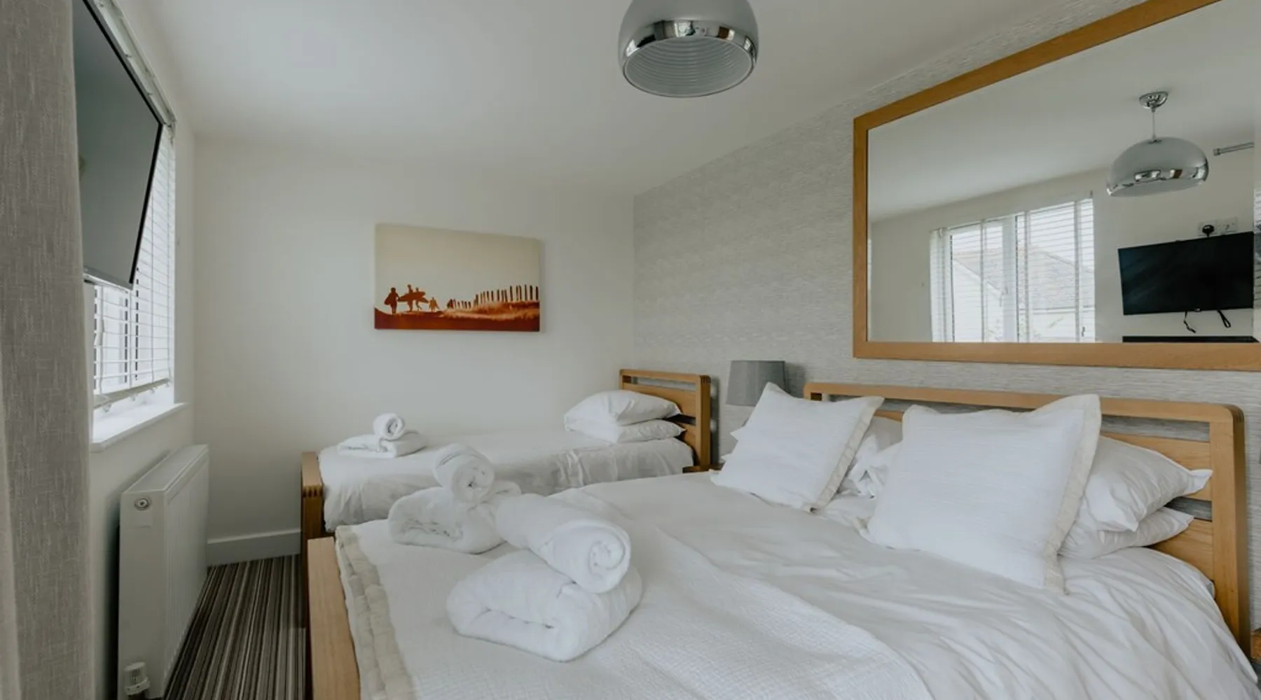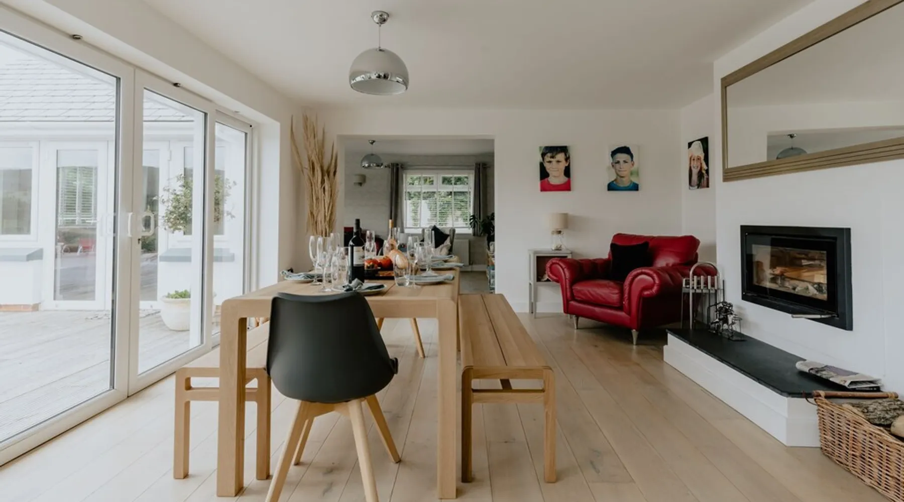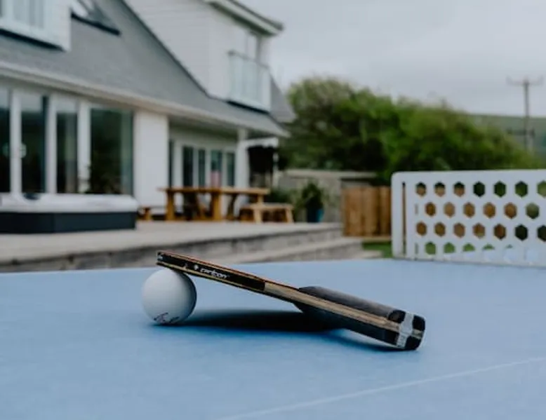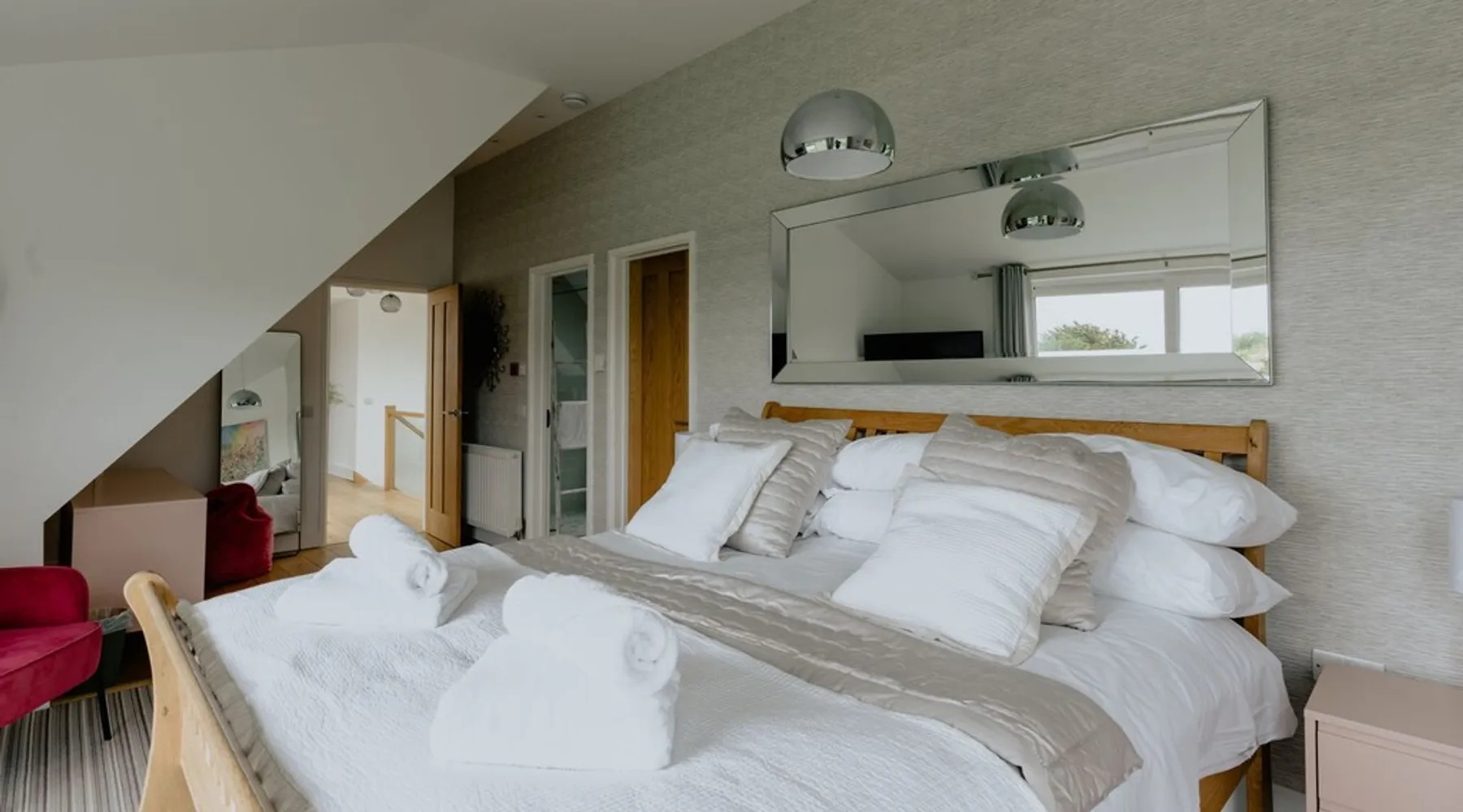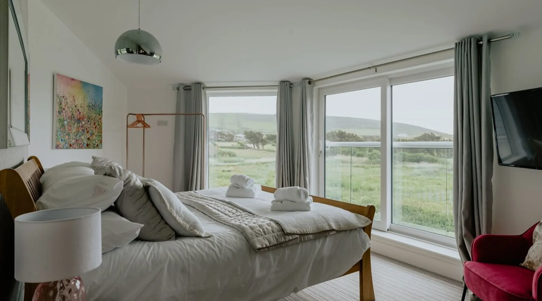 A spectacular home in a spectacular location. Aptly named, this five-bedroom home offers, peace, calm, tranquillity and a touch of luxury. Create special memories with friends and family, celebrate special occasions, or treat yourself to the holiday you deserve. Overlooking the fishing lakes that lead to Croyde beach, Oasis is designed to make the most of the unrivalled views. Moments from the beach and a stroll into Croyde village centre, it makes a fantastic base for exploring all that Croyde has to offer, but if you prefer to stay closer to home it is packed with amenities to keep you entertained. Designed to make the most of the unrivalled views across the sand dunes, the back of the property is almost entirely glass. The downstairs living space is open plan, with two discrete seating areas. The first being of a more traditional layout, and including a Internet enabled TV, plenty of games, entertainment options and comfortable sofas. The second seating area faces the garden, where you can easily while away a couple of hours looking out over the hills, fishing lakes and sand dunes. The dining space easily accommodates every member of your party at the large wooden table, with bench and chair seating. This a great space, for lively family meals and possibly the location of some epic games nights! Designed to make self-catering as stylish as possible. The kitchen is fully equipped for all budding chefs. Three ovens, including a combi microwave, makes catering for a large group easy. The large fridge freezer means there is plenty of room to store supplies. A boiling water tap means you are never going to need to boil a kettle! Bags of storage space and a bountiful supply of crockery and cooking equipment, helps you make the most of meal times. Located on the ground floor of the property are two of the five bedrooms. The ground floor master bedroom has a king bed, and en-suite wet room. This room easily accommodates a cot or z bed if required. The second ground floor bedroom is a double. Bed linen and beach towels are provided and all bedrooms have their own TV. The oak and glass staircase, leads to a double height upstairs landing, with ceiling windows, and a cosy seating nook for star gazing at night, or simply a quiet space to read and relax. The Master Bedroom, with en-suite wet room and toilet and a queen size bed, has commanding views over the dunes and to the sea. Fully glazed to the rear and with a Juliet balcony, it will be very difficult to get up in the morning! Two further family rooms complete the sleeping accommodation, the first, with a king bed, single bed and cot, is en-suite. The second family room comprises of a double bed and single bed. Whilst not en-suite, a large wet room and toilet is located immediately opposite the room, off of the main corridor. Both family rooms benefit from Juliet glass balconies, so no one misses out on the views. The outside space at Oasis, does not disappoint! You can't miss the 10m, heated pool. The pool area is surrounded by a raised patio area for lounging and there is plenty of outside seating available, from sun beds to bench seating. A BBQ is available for outside grilling. A six-person hot tub is perfect for easing aching muscles after a day in the surf, or simply to enhance your relaxation. For the more competitive members of your party there is a full-size table tennis table and the large lawn area has hosted many friendly but competitive events from football to volleyball. If you love to surf or want to try it for the first time there are several beaches suitable for all levels of skill within a short drive of Croyde (and some very keen surfers live next door if you need any advice), you can even borrow some boards! A hot water outside shower is available to help keep the sand outside and pool towels are provided. Oasis is situated at the end of a private road, with parking for four cars.