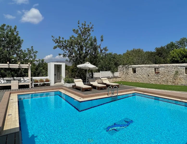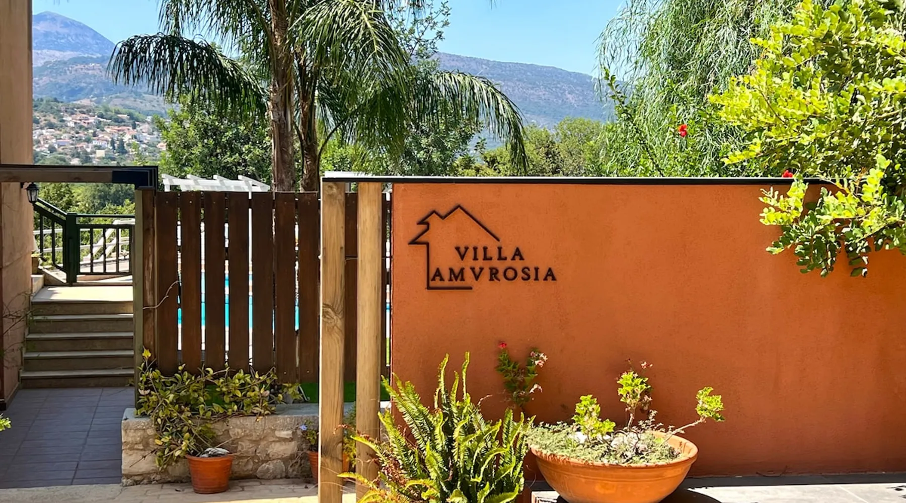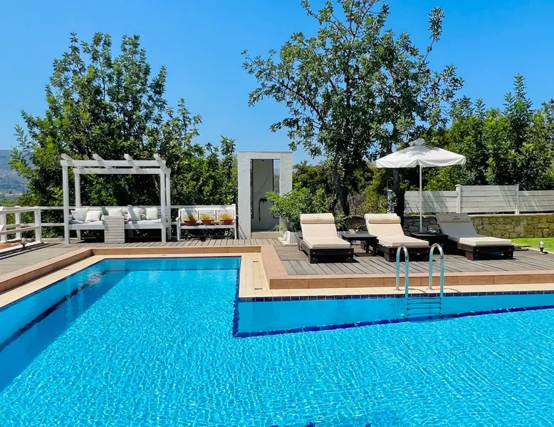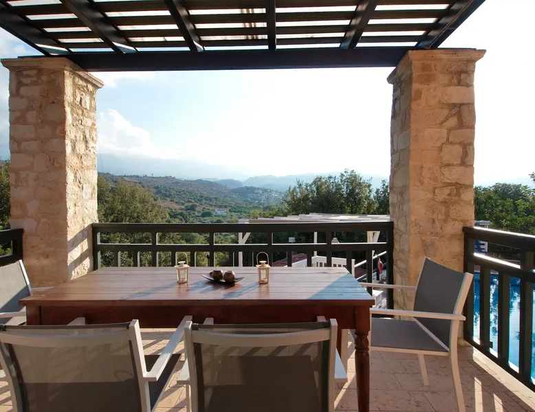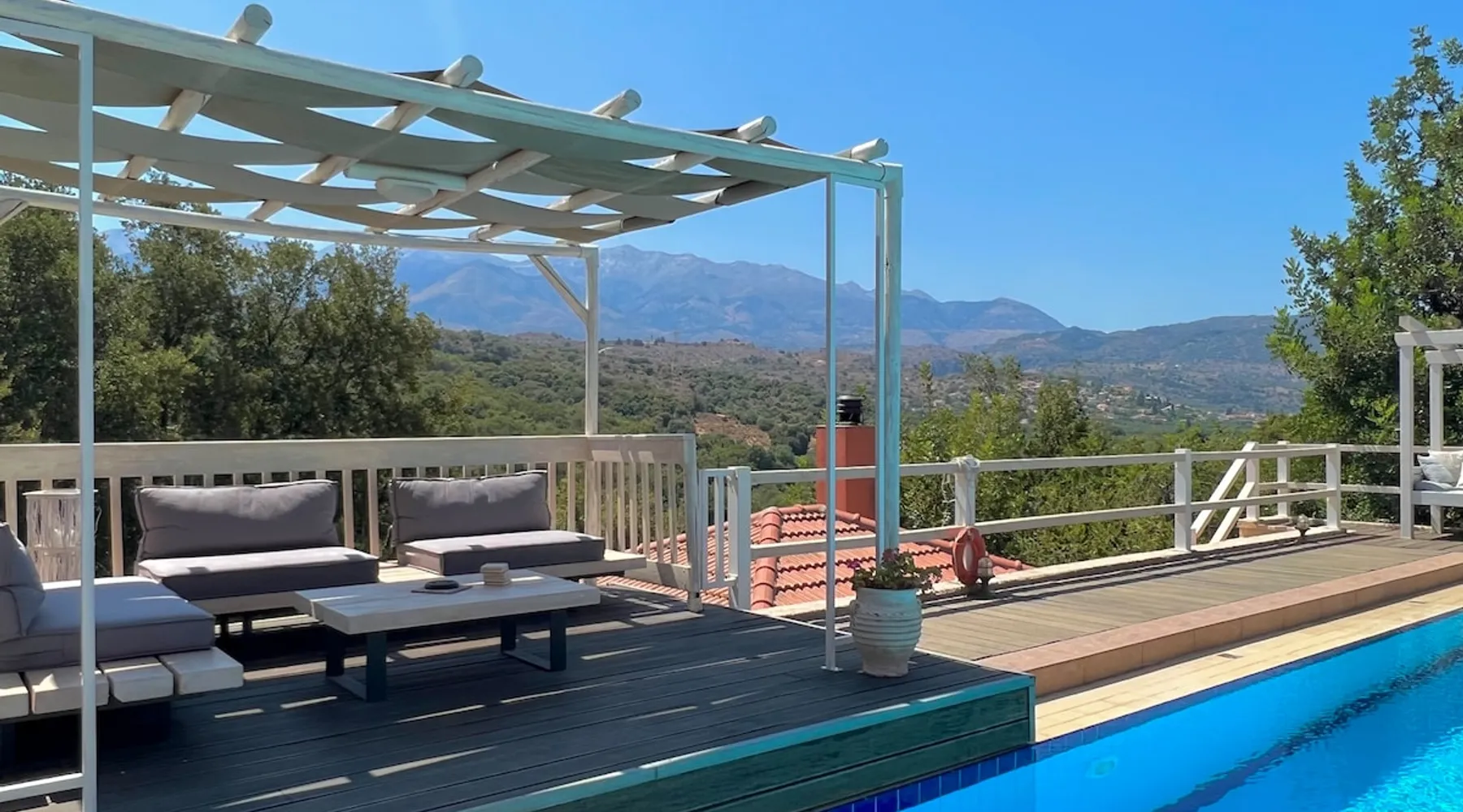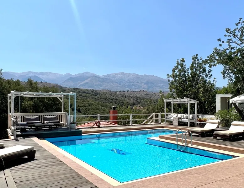 "Private Villa with Outside Pool and heated* indoor Pool, Stroll to Village" A sophisticated and charming Villa with the extravagant addition of an indoor pool, and with matchless outside space. A gorgeous L shaped pool is set into the beautifully furnished deck which, thanks to its hillside setting, is built at treetop level with views of the village of Stylos perched on the lower slopes of the dramatic White Mountains. The space Villa Amvrosia, Armeni, Crete A sophisticated and charming Villa with the extravagant addition of an indoor *heated jacuzzi pool on the lower level, the true worth of Villa Amvrosia is in its matchless outside space. A gorgeous L shaped pool is set into the beautifully furnished deck which, thanks to its hillside setting, is built at treetop level with views of the village of Stylos perched on the lower slopes of the dramatic White Mountains. A second, lower deck is set in a small copse and furnished with table tennis, hammock and a swing seat beside a spacious fully equipped barbecue kitchen and dining area. The villa's landscaped gardens have been chiseled out of the stony Cretan hillside and there’s even a pretty aviary holding a host of small birds at the entrance. Location Villa Amvrosia sits on a hillside on the edge of the small and charming village of Armeni where there is a choice of tavernas, a coffee shop, minimarket and butcher/deli. There are deliveries of fresh, locally baked bread to the small cafenion of Michael's in the centre. Just 4.3 kms away, the low key seaside resort of Kalyves has lovely shallow shelving sandy beaches and a good choice of tavernas by the waters edge. Beyond Kalyves is the next seaside village of Almyrida which again has shallow waters and sandy beaches plus numerous tavernas and cafes. Chania’s Venetian Harbour is easily reached, approx 20kms away. Outside Villa Amvrosia Swimming pool - 9.10m x 7.9m L shaped swimming pool with sloping entry. Depth, 0.97m to 1.60m Sunbathing deck - sunbeds, double sun bathing bed. Covered 'chill out' area - 2 sofas and table. Garden - landscaped gardens and lawns chiseled out of the stony Cretan hillside. Barbecue House - BBQ, wood oven, fridge, sink with tap, large round table and chairs, cushioned bench seating, and radio. Lower deck - table tennis, hammock, swing chair Ground floor covered dining terrace - balcony with dining table and chairs with pool and mountain views. Ground floor Covered Terrace 2 - table and chairs. (Also mentioned below - Indoor *Heated Jacuzzi Pool - step entry shallow pool with jacuzzi jets. 3.40m x 3.40m, depth 1m) Inside Villa Amvrosia Lower Ground Floor Single bedroom - 1 single bed and wardrobe. Air con Unit. Shower room - shower, hand basin, W.C. Storeroom- Washing machine. Den - desk and chairs, bench seating, books, games, door to lower deck. *Heated Jacuzzi Pool - step entry shallow pool with jacuzzi jets. 3.40m x 3.40m, depth 1m. Ground floor Villa Amvrosia Open plan living room Sitting area – L shaped comfy sofa, gall fronted fireplace, plasma TV with satellite, DVD player, French doors to dining balcony. Air Con Unit. Kitchen Area - Painted wood fitted cupboards, double sink, electric oven with ceramic hob, microwave, dishwasher and fridge freezer. Small table and chairs. Window above the sink to the garden, stable door to small covered terrace. Dining Area - Wooden table and seating for 6. Cloakroom - WC., hand basin. Covered balcony - dining table and chairs with mountain view First Floor - Villa Amvrosia Double bedroom, ensuite shower room - 1 double bed, dressing area with fitted wardrobe, windows to pool and mountain view. En suite shower, washbasin and WC. Air con unit Twin bedroom – 2 single beds, fitted wardrobes and double doors to balcony with views of olive tree terracing. Air con Unit. Family bathroom - corner bath with shower over, hand basin, WC Parking - Ample parking area next to the villa. NB* The indoor pool is heated during the cooler months of April, May & October only. Essential Information: Sleeps (Max) 5 Bedrooms 3 Shower Rooms 3 Maid Service Included Pool Private 8m x 5m A/C Included Floor Area m² 120 Booking Information: Check-In Any day (after 16:00) Check-Out Any day (before 10:00) Minimum stay 5 nights Local Facilities: Beach 4.5km Tavernas 800m Mini Market 800m Distances: Chania Airport 30 km Heraklion Airport 125 km Villa Equipment: DVD Local TV Satellite TV Dish Washer Washing Machine Hair Dryer Toaster Kettle Sun Lounger Microwave WiFi Connection Safe Table Tennis BBQ Juicer Mosquito Window Blind Filter Coffee Machine Iron & Board Pool Towels Espresso pot Fridge Freezer Hob Cooking Utensils Guest access The villa and pool is for your private use only as well as the garden. Bed linen & towels are provided as well as pool towels. The cleaner will come in during your stay & change them, depending on how many days you are staying. All of this is included in the price. Other things to note Housekeeping Your Villa will be prepared for you on arrival with fresh bath and hand towels and all beds made up. For stays of 7 nights or more - house towels will be changed every 3 - 4 days. For stays of 14 nights or more - bed linen will be changed every 7 days. Pool/beach towels - one per person for the duration of your stay. If you need a baby cot or high chair, please request when booking so we can have it in the villa for you ready. Optional chargeable services: - Second High Chair - Second Cot Note that this is a professionally run rental villa which as been licensed by the Greek National Tourist Organisation, EOT, which is required by the Greek law. This license allows the property owners to legally rent their accommodation to holiday makers, so that they comply to a set of standards and specific conditions for the safety & comfort of it's paying customers. Registration Details 1042K91003008401