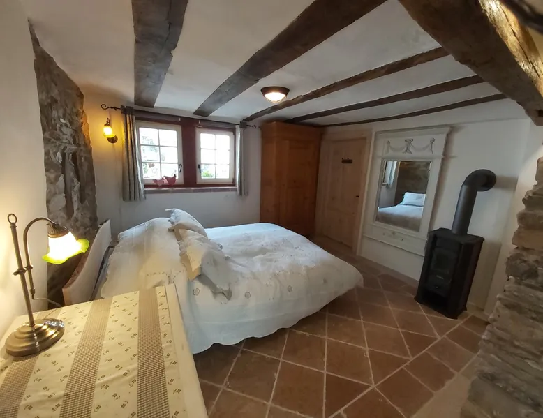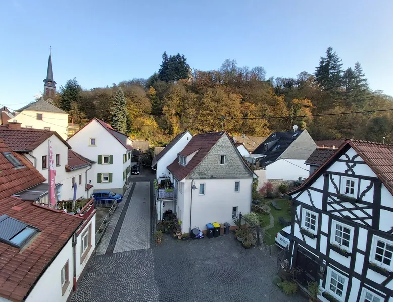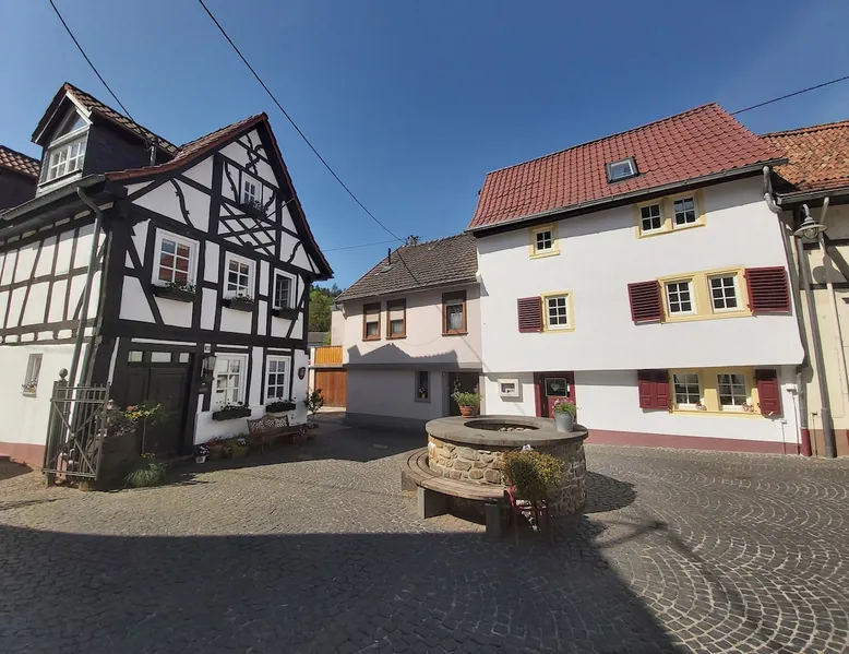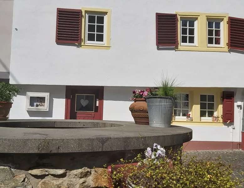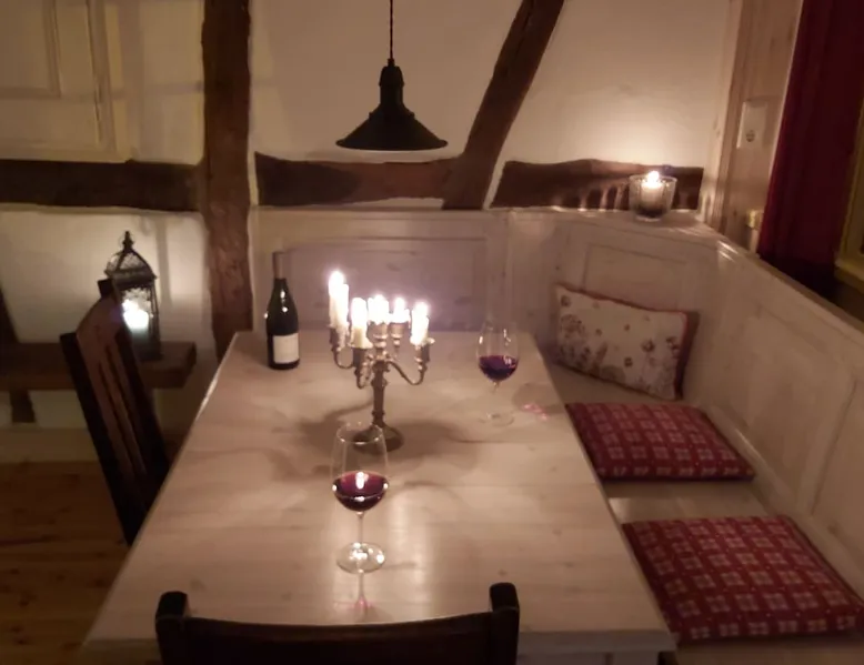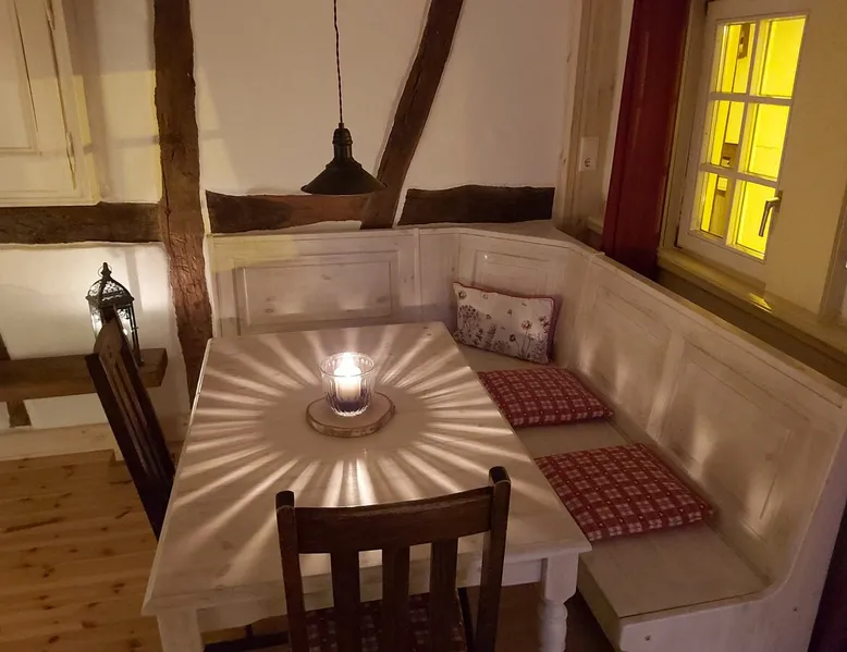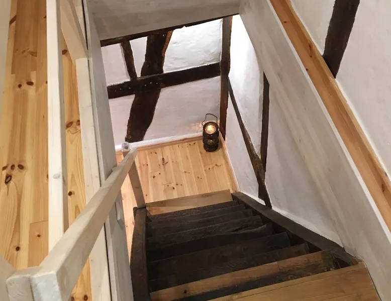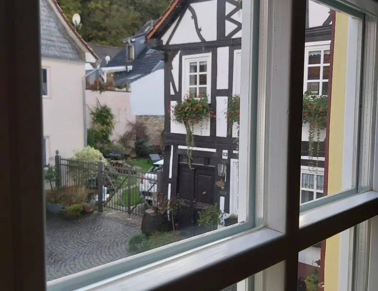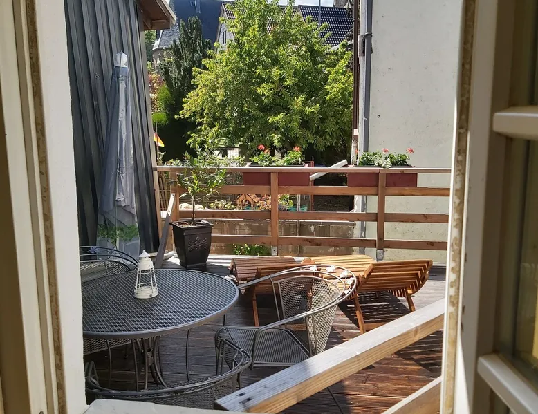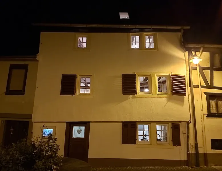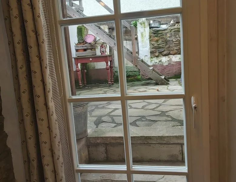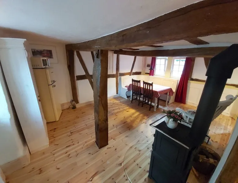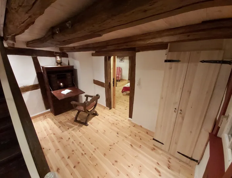 Treat yourself to a visit to our half-timbered house Anno 1690, renovated in 2019, in the very quiet old town of Stromberg, right by the Schlossbrunnen fountain below the 3 castles. The kitchen on the 2nd floor is excitingly located in the former battlement of the city wall. The medieval building still has the typical steep oak stairs and the ceiling height is outside the norm. Cozy stay in the house and as a starting point for hikers & bikers....for relaxation and adventure... The space First floor: Entrance area with access to the courtyard and sun terrace on the historic vaulted cellar. NEW!!! Another bedroom with a French double bed behind the 1.5-meter-thick city wall. NEW!!! Toilet on the first floor. 2nd floor: Kitchen, dining and living area with fireplace: The good room 3rd floor: Bedroom with separate dressing area, hallway with secretary. In addition, the marble bathroom with sitting and shower tub. 3rd floor: Attic studio can be used as a living room as well as a bedroom. Guest access You have the entire living area and the sun terrace all to yourselves. Other things to note Beds are available for 6 people; 2 bedrooms with double beds and in the living room 2 sofa beds as single beds.