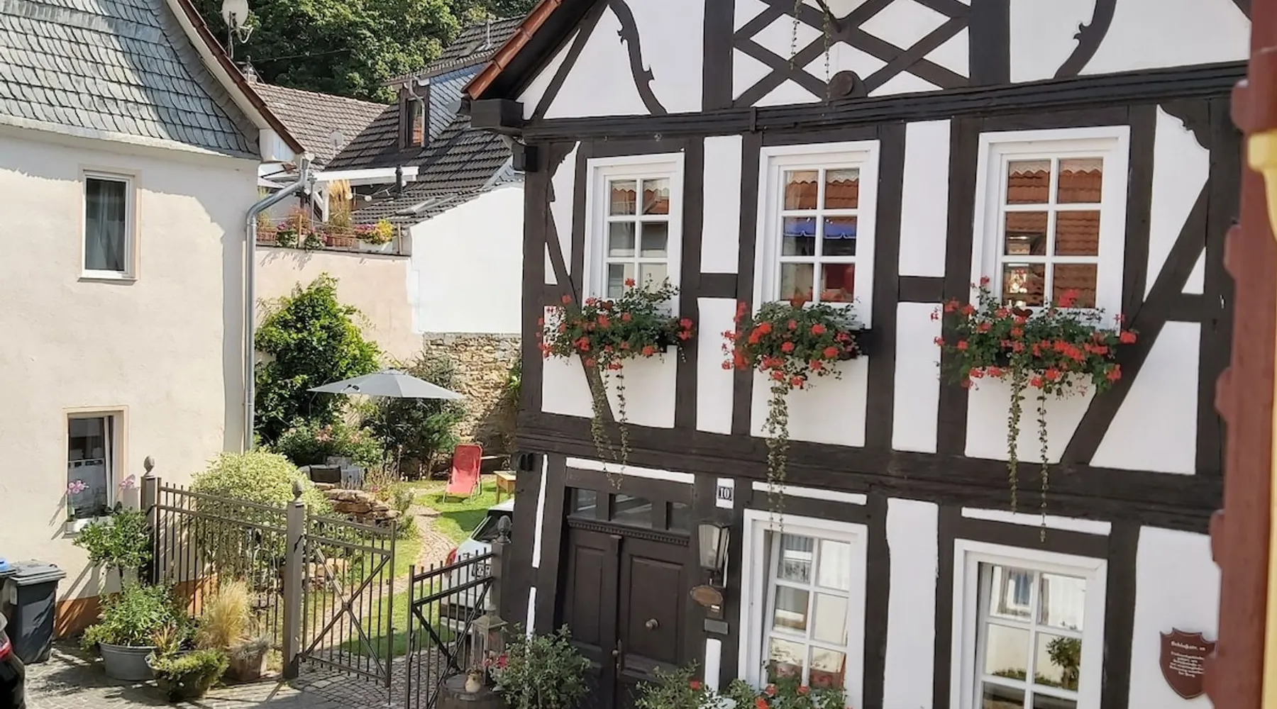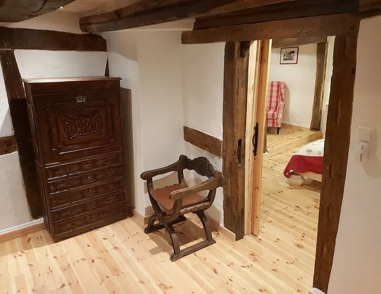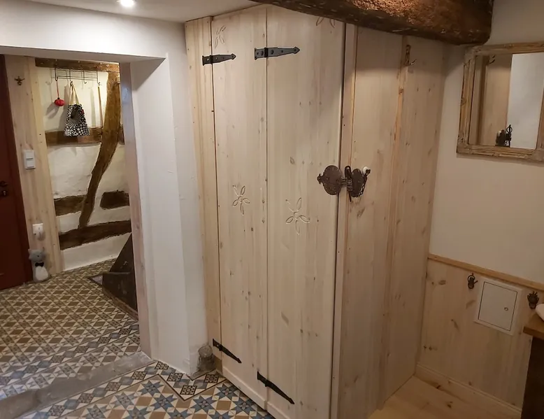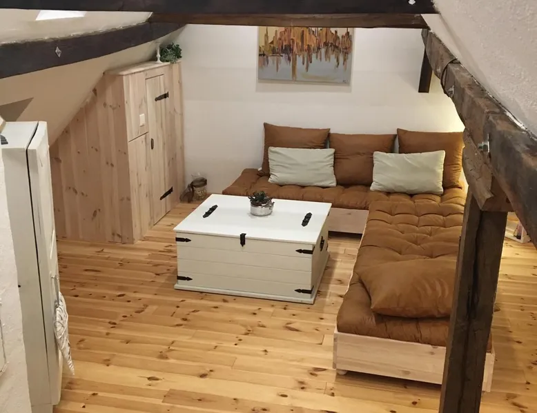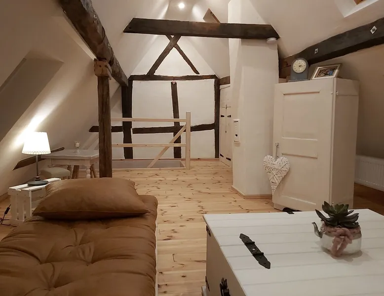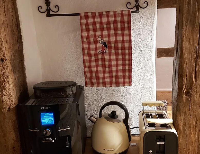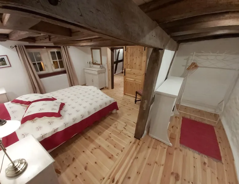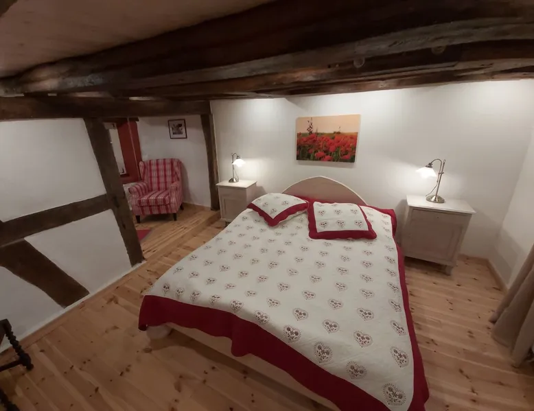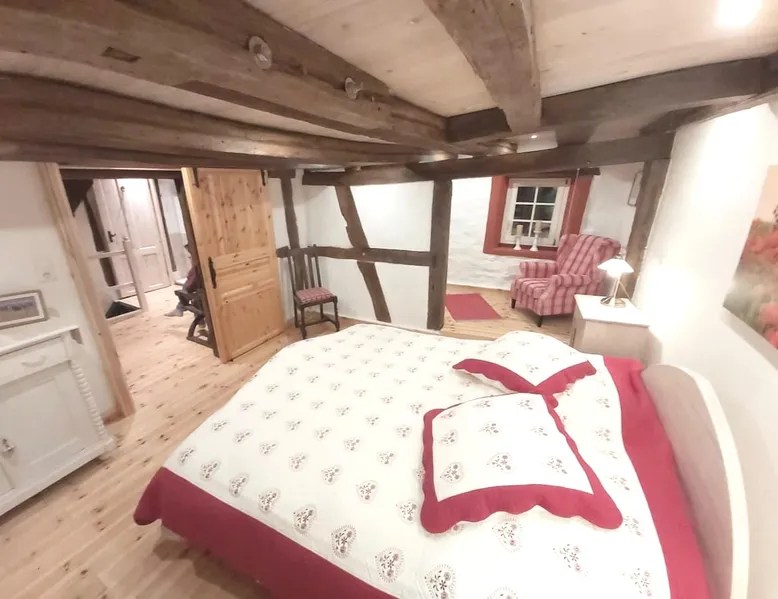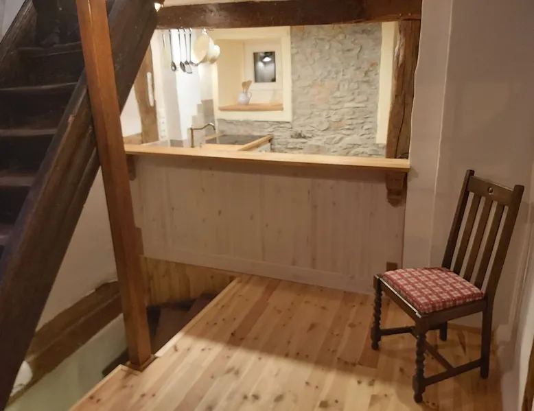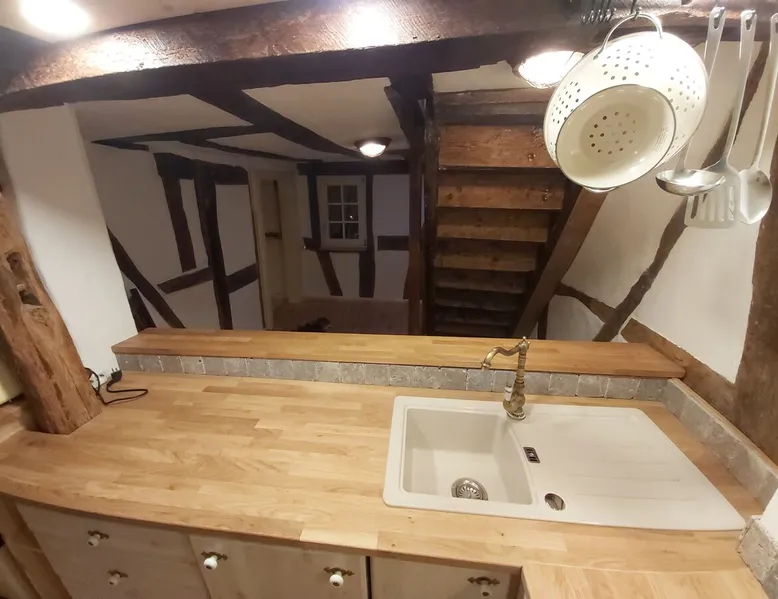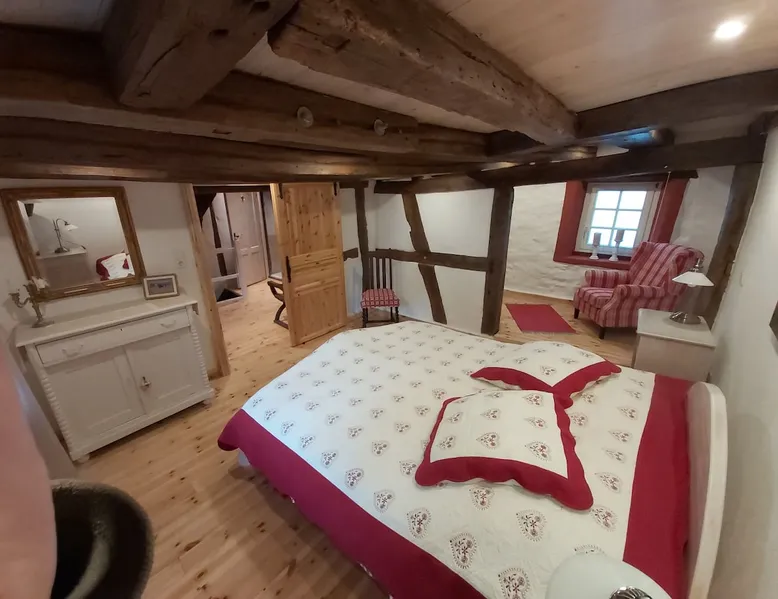 Treat yourself to a visit to our half-timbered house Anno 1690, renovated in 2019, in the very quiet old town of Stromberg, right by the Schlossbrunnen fountain below the 3 castles. The kitchen on the 2nd floor is excitingly located in the former battlement of the city wall. The medieval building still has the typical steep oak stairs and the ceiling height is outside the norm. Cozy stay in the house and as a starting point for hikers & bikers....for relaxation and adventure... The space First floor: Entrance area with access to the courtyard and sun terrace on the historic vaulted cellar. NEW!!! Another bedroom with a French double bed behind the 1.5-meter-thick city wall. NEW!!! Toilet on the first floor. 2nd floor: Kitchen, dining and living area with fireplace: The good room 3rd floor: Bedroom with separate dressing area, hallway with secretary. In addition, the marble bathroom with sitting and shower tub. 3rd floor: Attic studio can be used as a living room as well as a bedroom. Guest access You have the entire living area and the sun terrace all to yourselves. Other things to note Beds are available for 6 people; 2 bedrooms with double beds and in the living room 2 sofa beds as single beds.