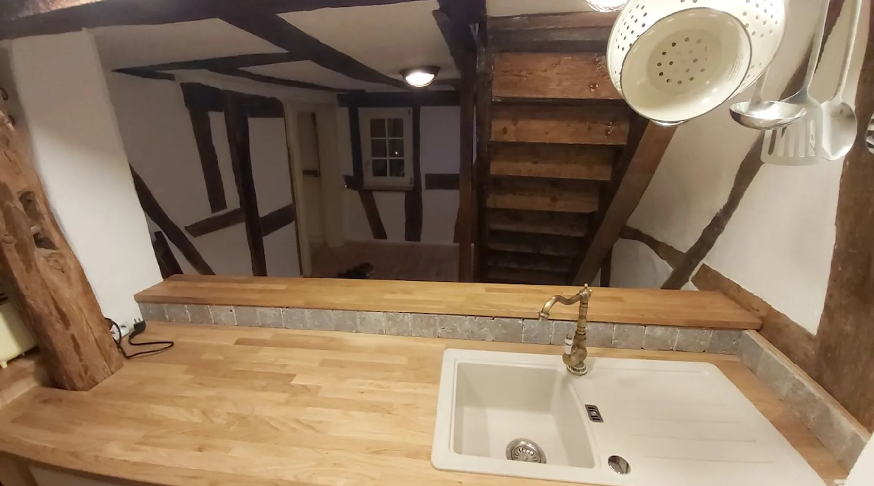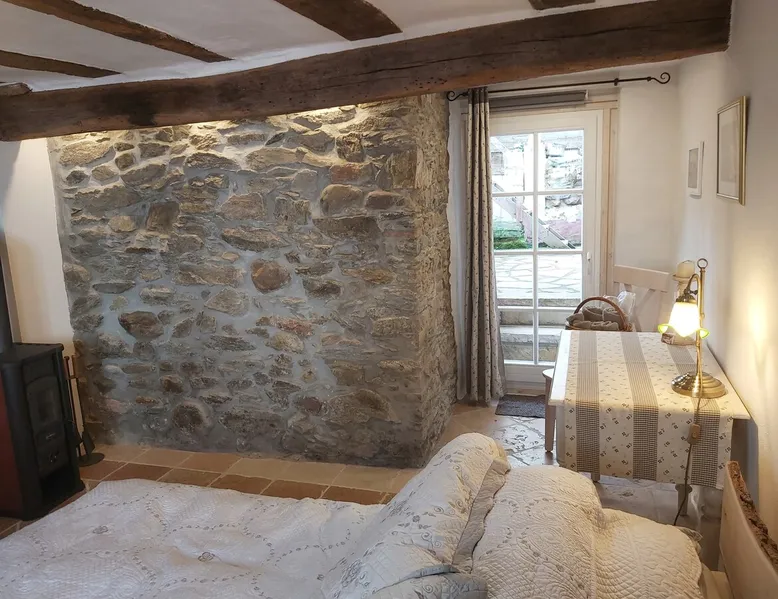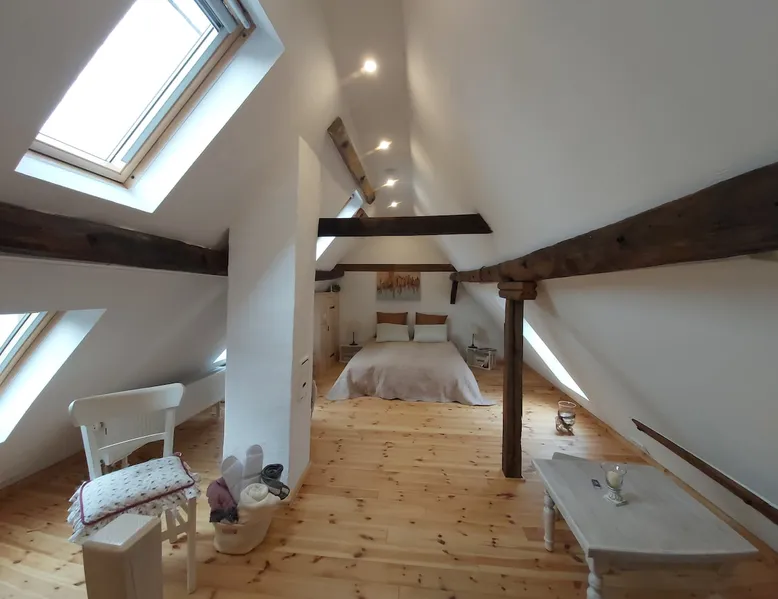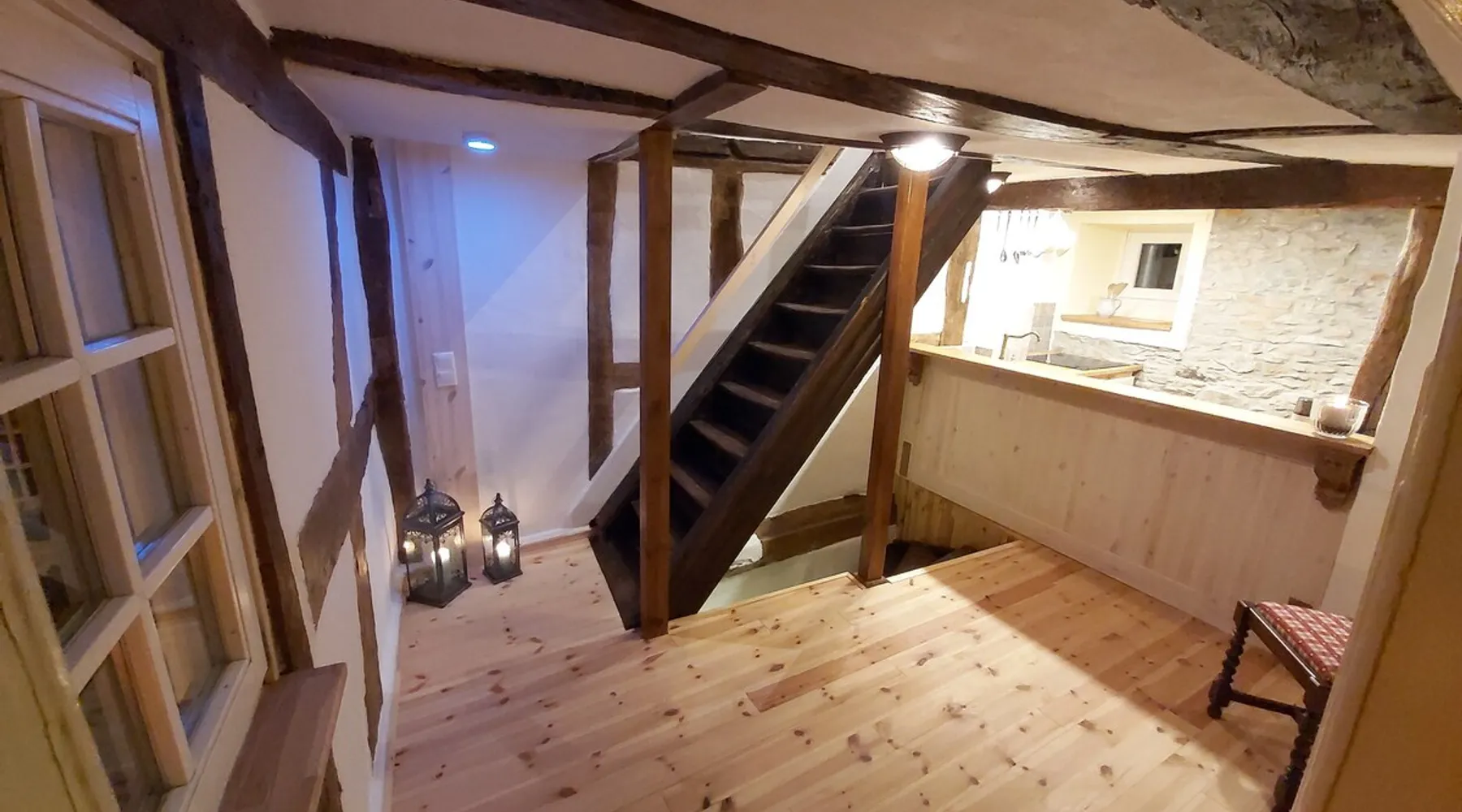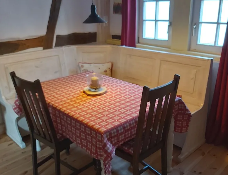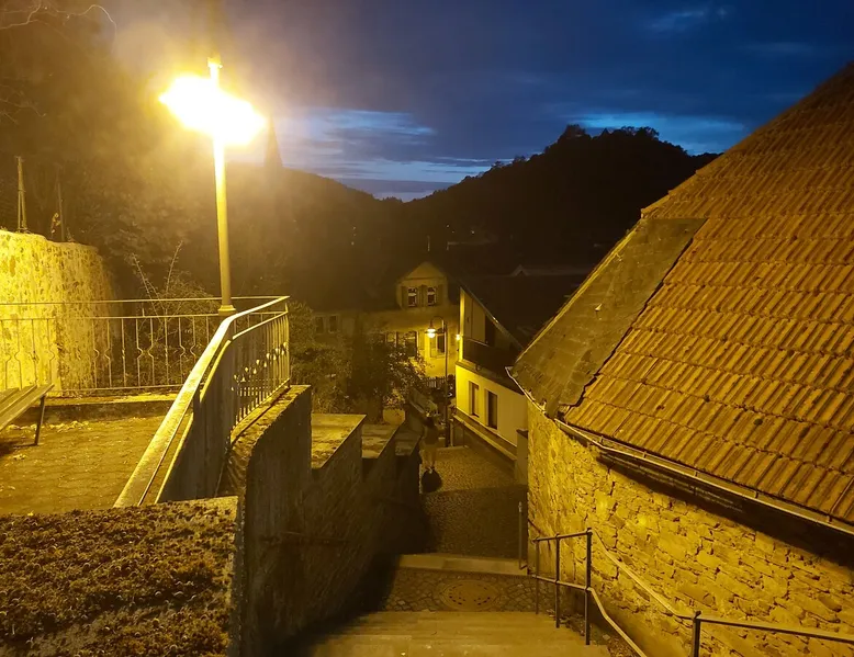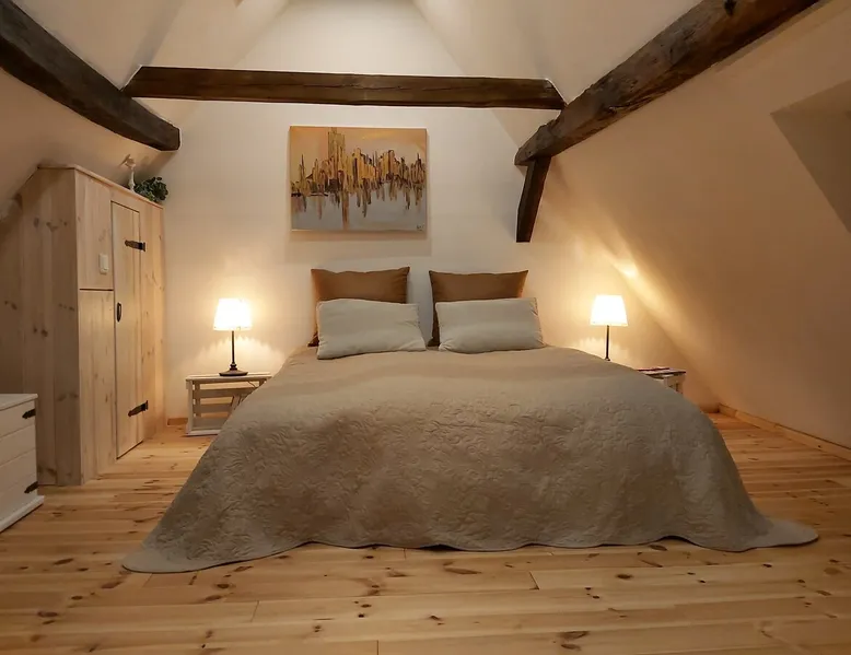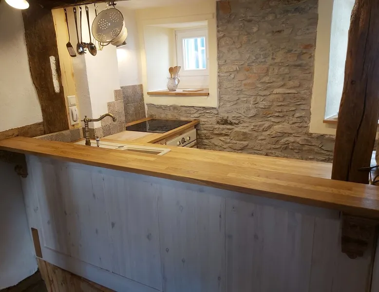 Treat yourself to a visit to our half-timbered house Anno 1690, renovated in 2019, in the very quiet old town of Stromberg, right by the Schlossbrunnen fountain below the 3 castles. The kitchen on the 2nd floor is excitingly located in the former battlement of the city wall. The medieval building still has the typical steep oak stairs and the ceiling height is outside the norm. Cozy stay in the house and as a starting point for hikers & bikers....for relaxation and adventure... The space First floor: Entrance area with access to the courtyard and sun terrace on the historic vaulted cellar. NEW!!! Another bedroom with a French double bed behind the 1.5-meter-thick city wall. NEW!!! Toilet on the first floor. 2nd floor: Kitchen, dining and living area with fireplace: The good room 3rd floor: Bedroom with separate dressing area, hallway with secretary. In addition, the marble bathroom with sitting and shower tub. 3rd floor: Attic studio can be used as a living room as well as a bedroom. Guest access You have the entire living area and the sun terrace all to yourselves. Other things to note Beds are available for 6 people; 2 bedrooms with double beds and in the living room 2 sofa beds as single beds.