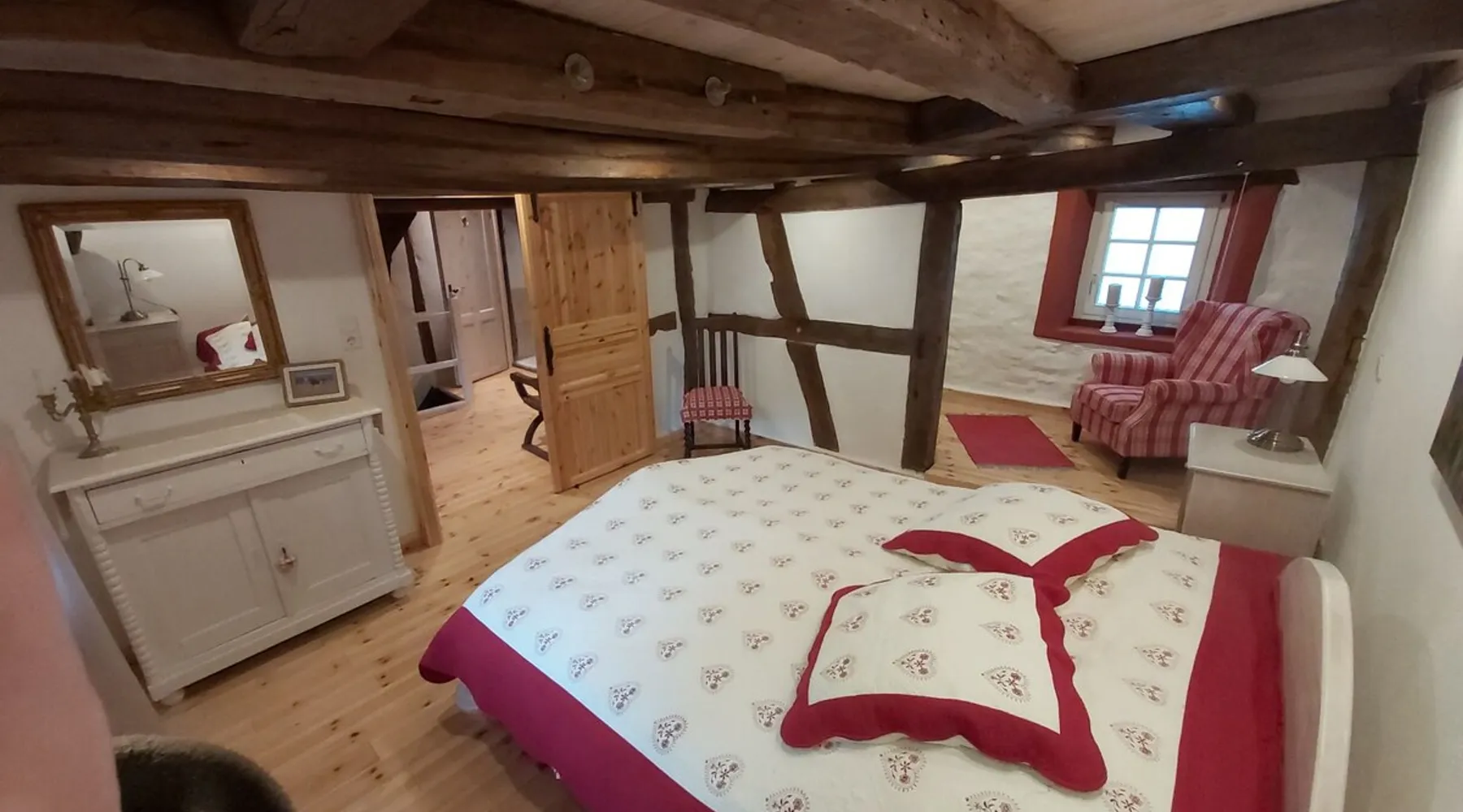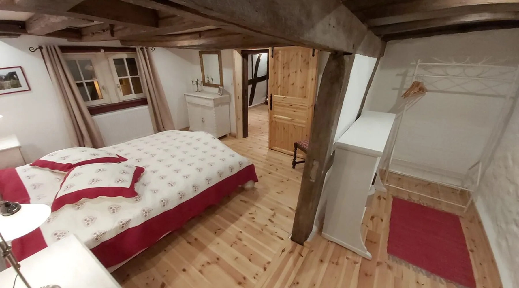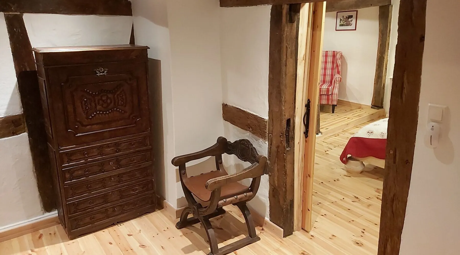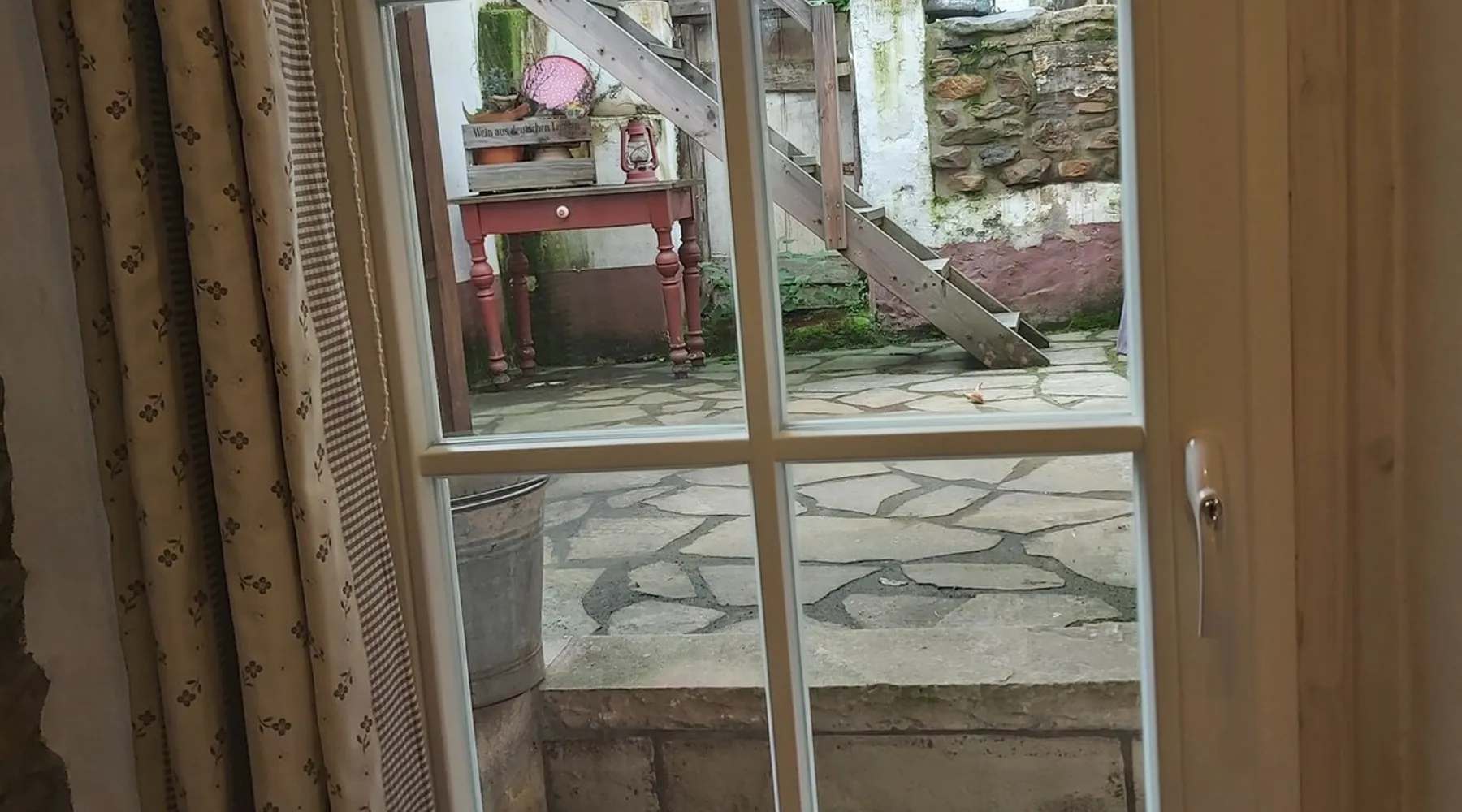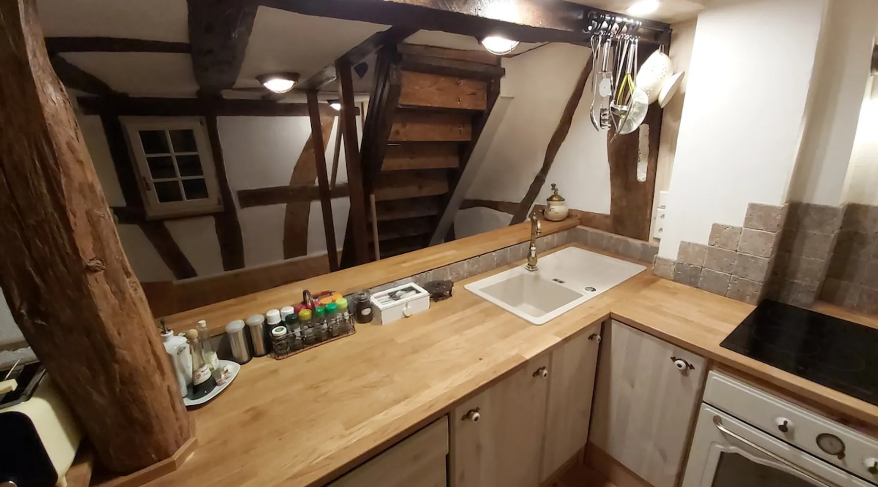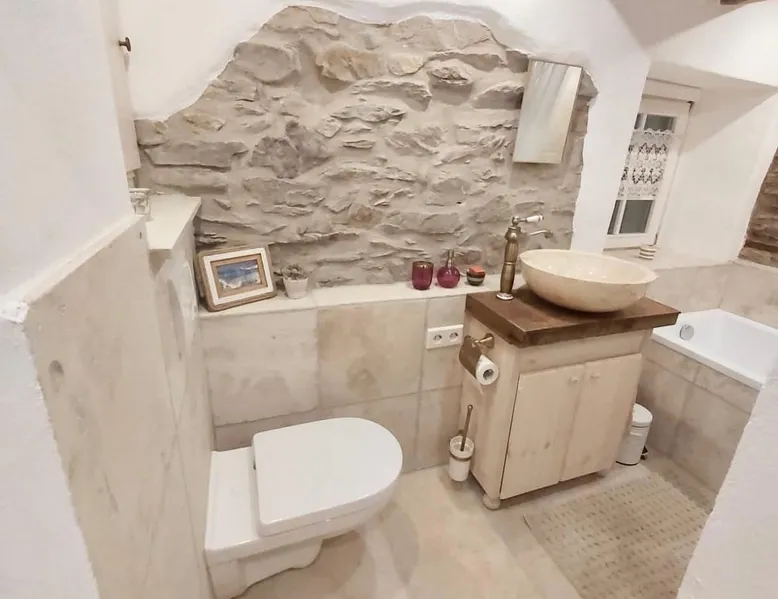 Treat yourself to a visit to our half-timbered house Anno 1690, renovated in 2019, in the very quiet old town of Stromberg, right by the Schlossbrunnen fountain below the 3 castles. The kitchen on the 2nd floor is excitingly located in the former battlement of the city wall. The medieval building still has the typical steep oak stairs and the ceiling height is outside the norm. Cozy stay in the house and as a starting point for hikers & bikers....for relaxation and adventure... The space First floor: Entrance area with access to the courtyard and sun terrace on the historic vaulted cellar. NEW!!! Another bedroom with a French double bed behind the 1.5-meter-thick city wall. NEW!!! Toilet on the first floor. 2nd floor: Kitchen, dining and living area with fireplace: The good room 3rd floor: Bedroom with separate dressing area, hallway with secretary. In addition, the marble bathroom with sitting and shower tub. 3rd floor: Attic studio can be used as a living room as well as a bedroom. Guest access You have the entire living area and the sun terrace all to yourselves. Other things to note Beds are available for 6 people; 2 bedrooms with double beds and in the living room 2 sofa beds as single beds.